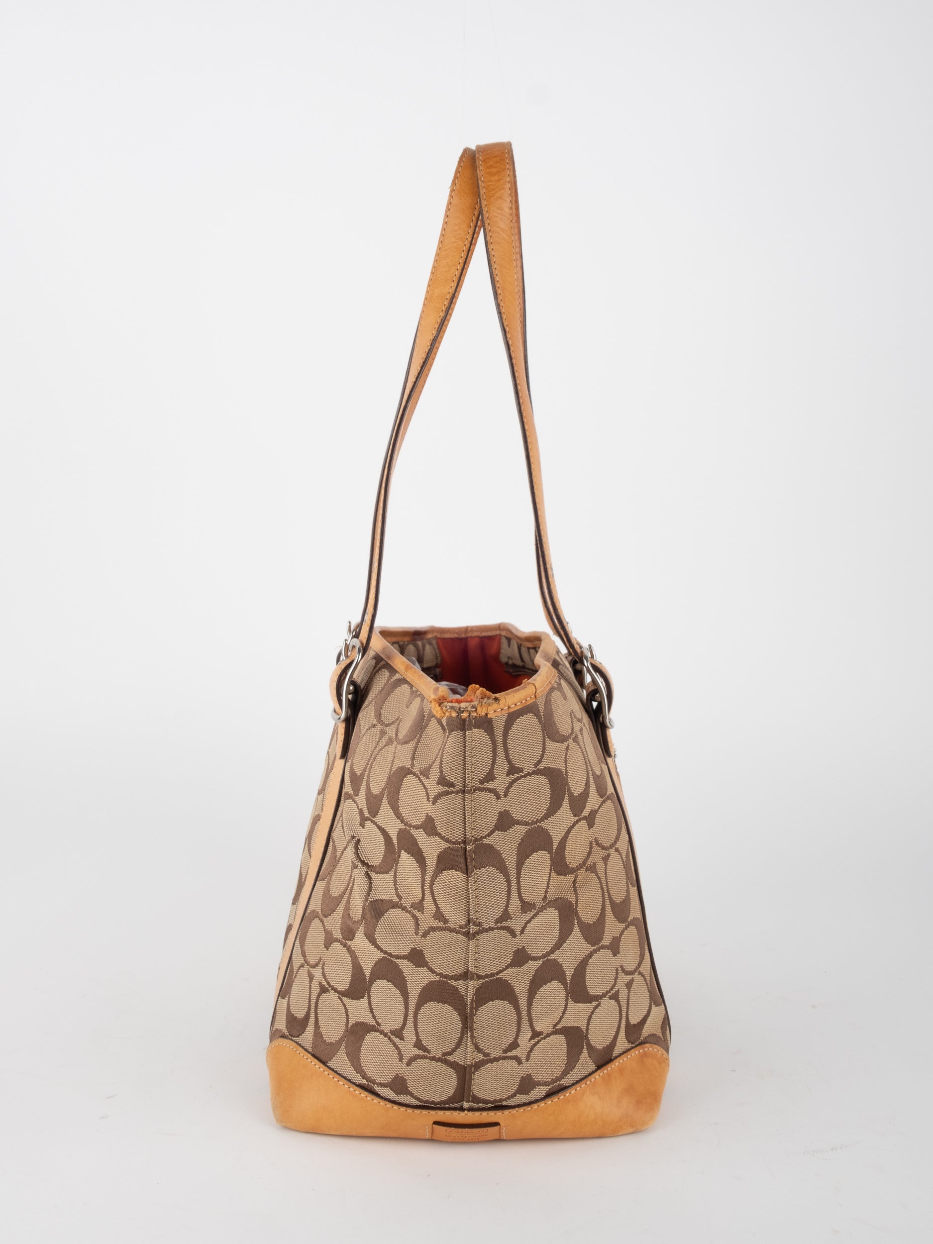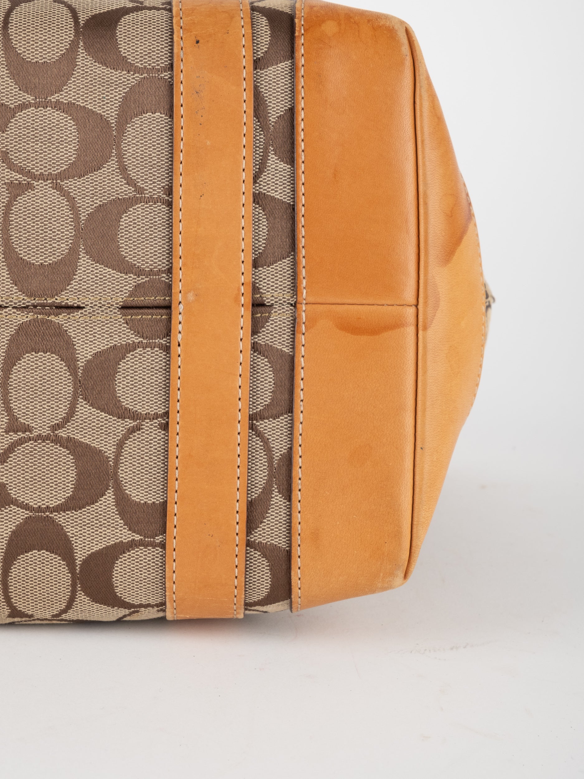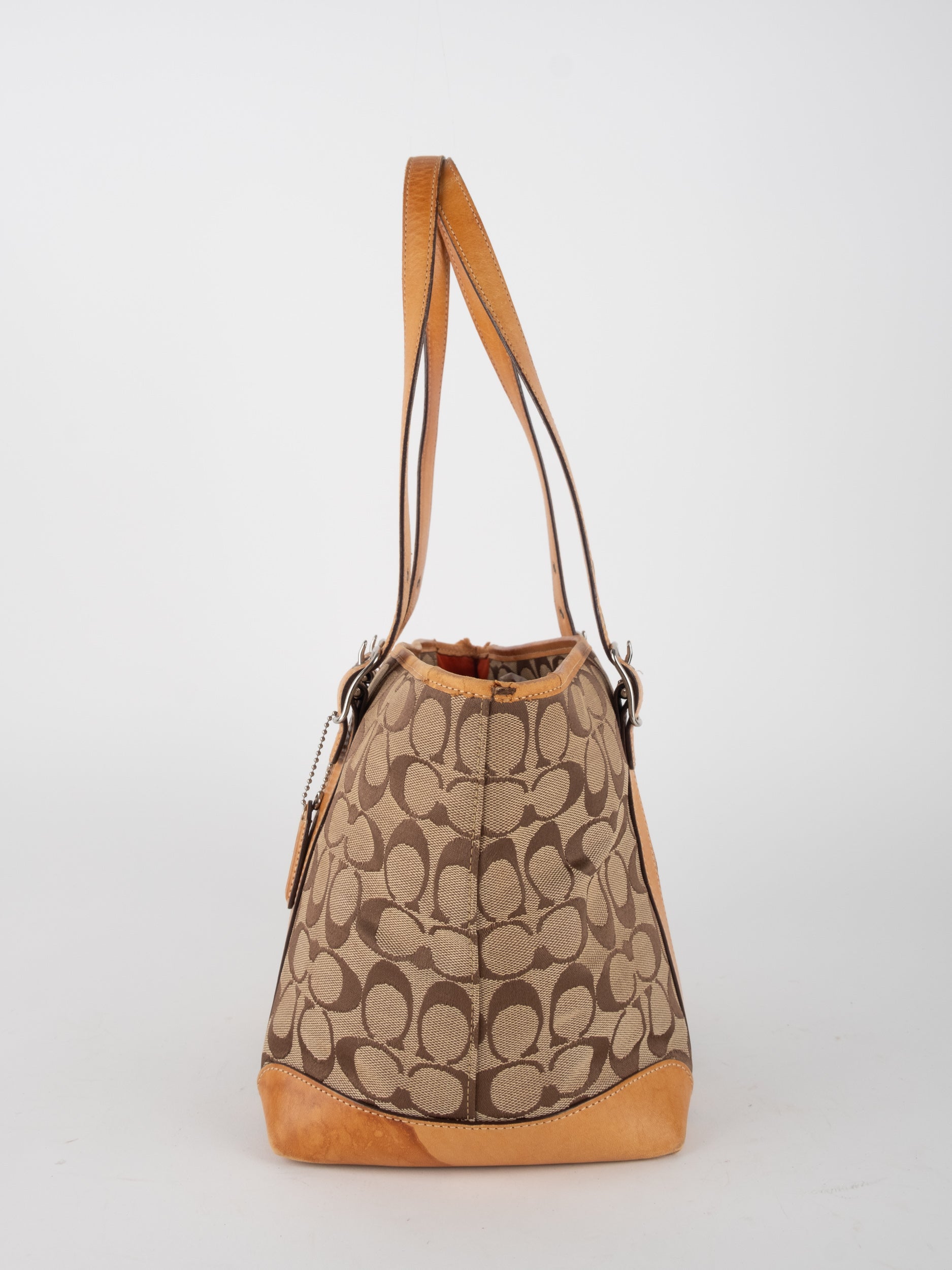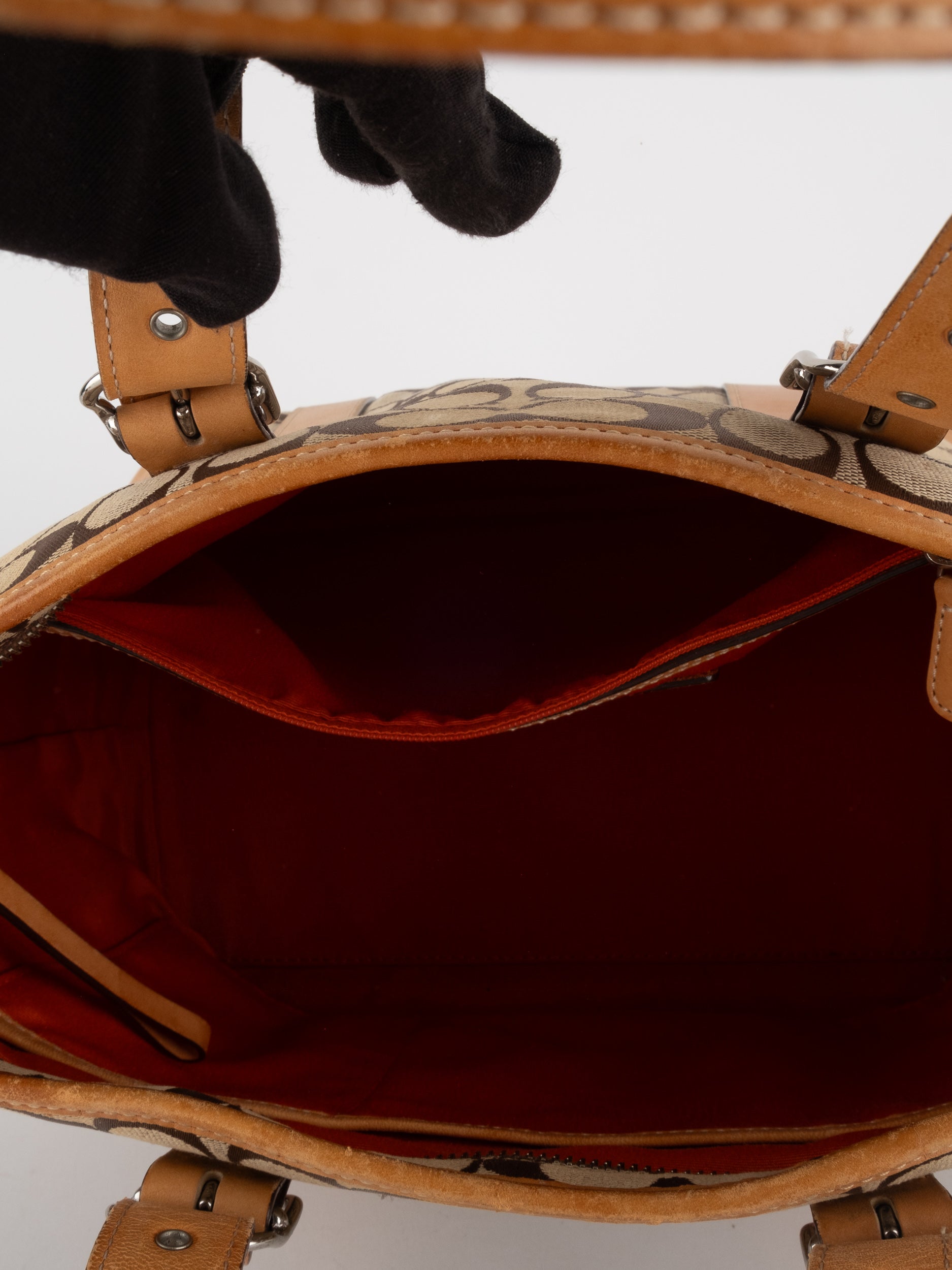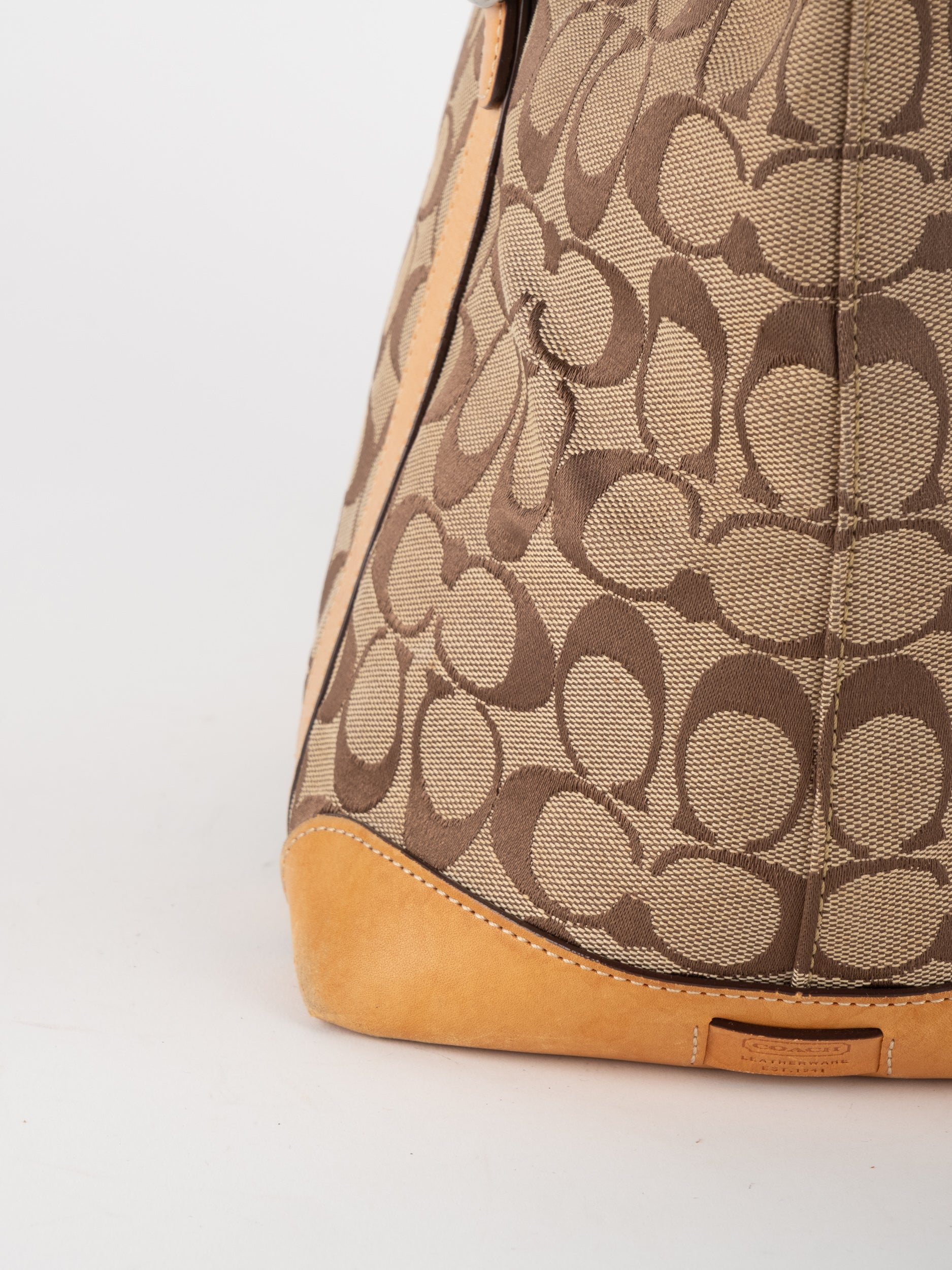 קואץ' COACH וינטג' יד שנייה בדוגמת Signature בגווני בז’ עם רצועות עור בגוון קוניאק חם. ote קלאסי עם אמירה ברורה ומראה אמריקאי על־זמני.