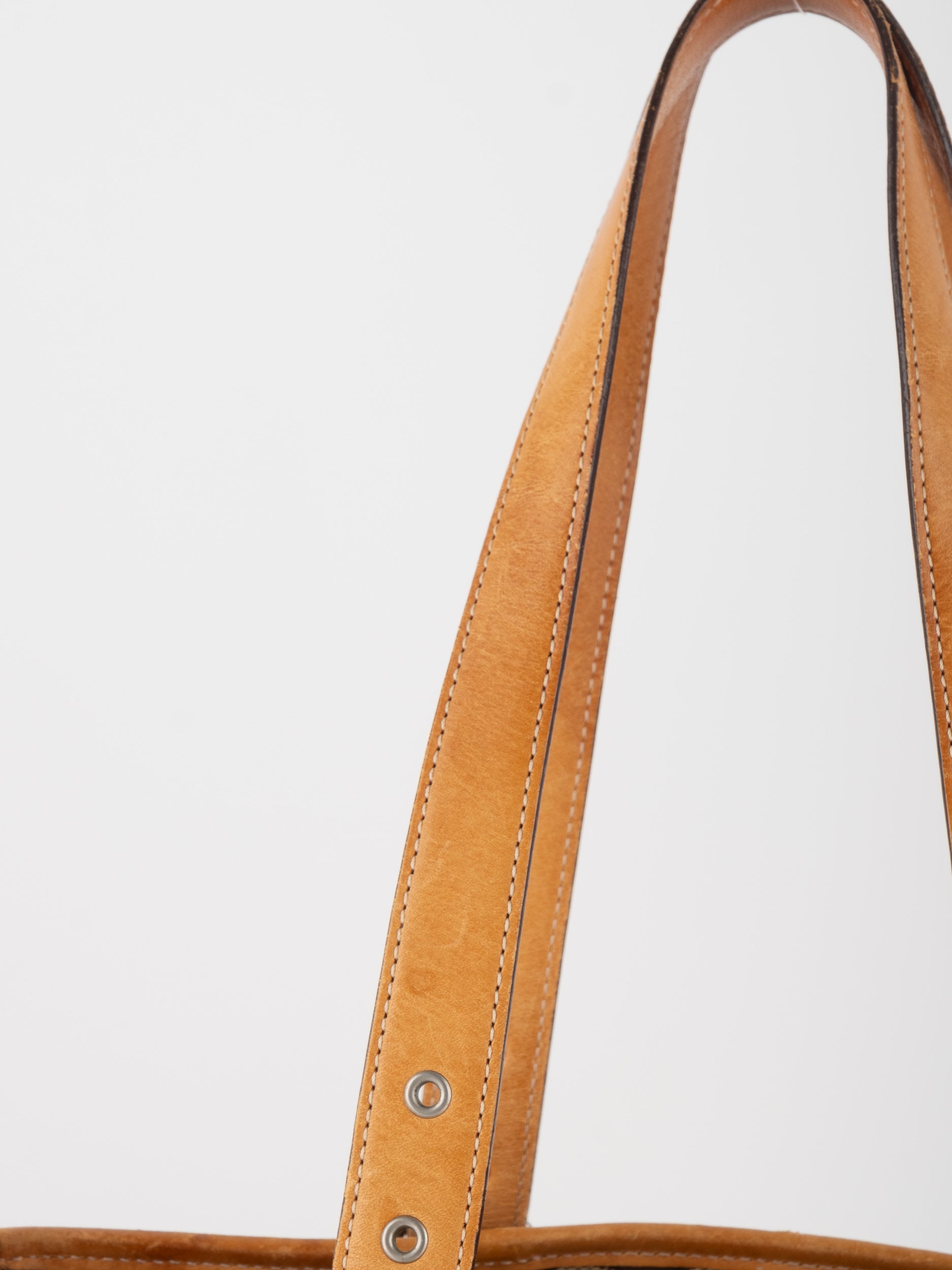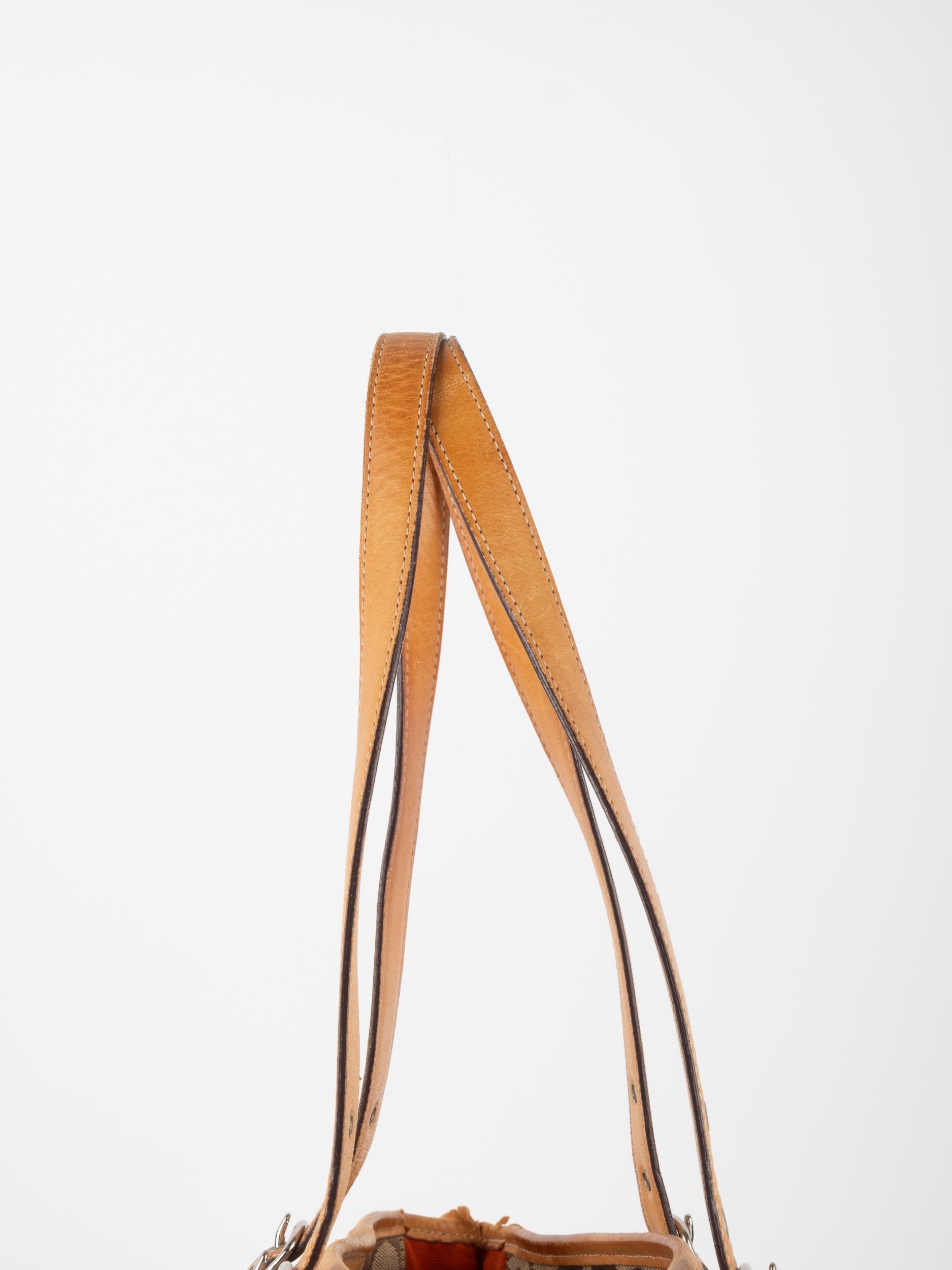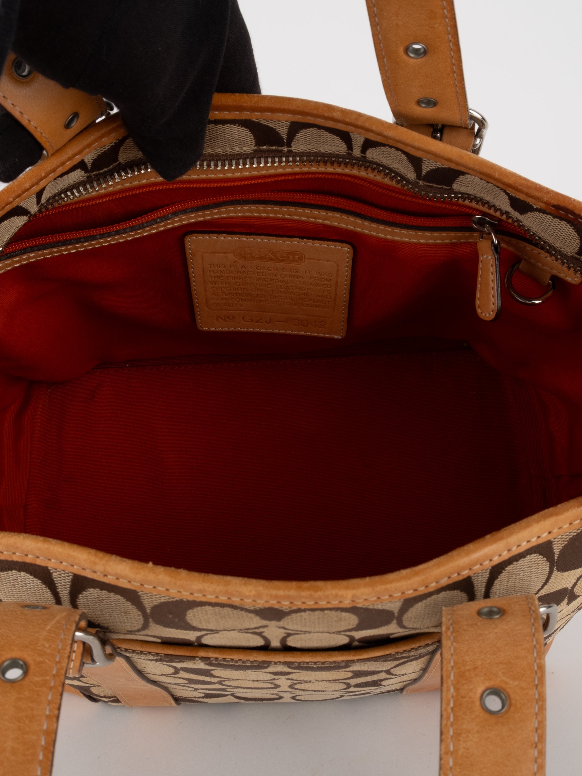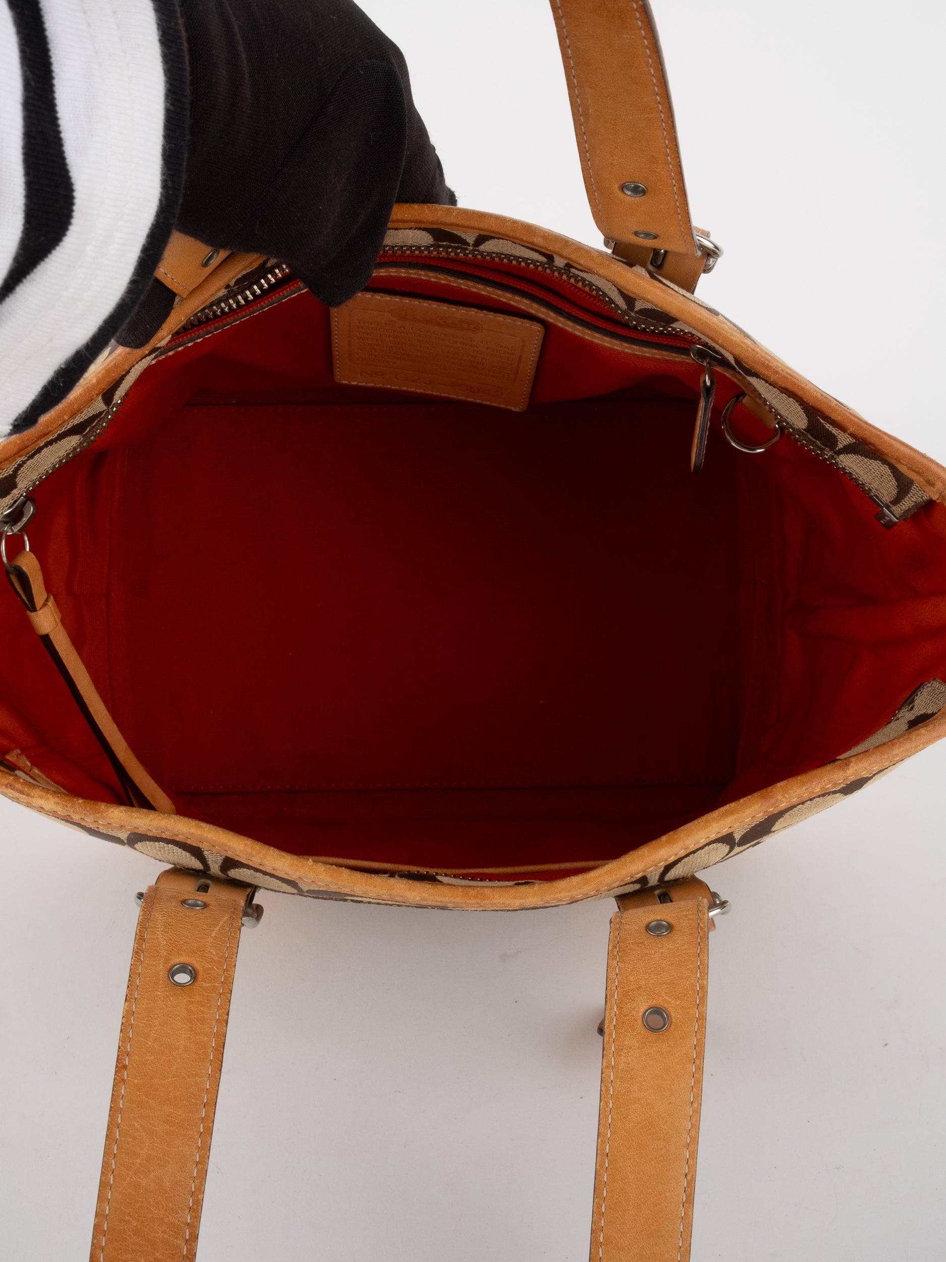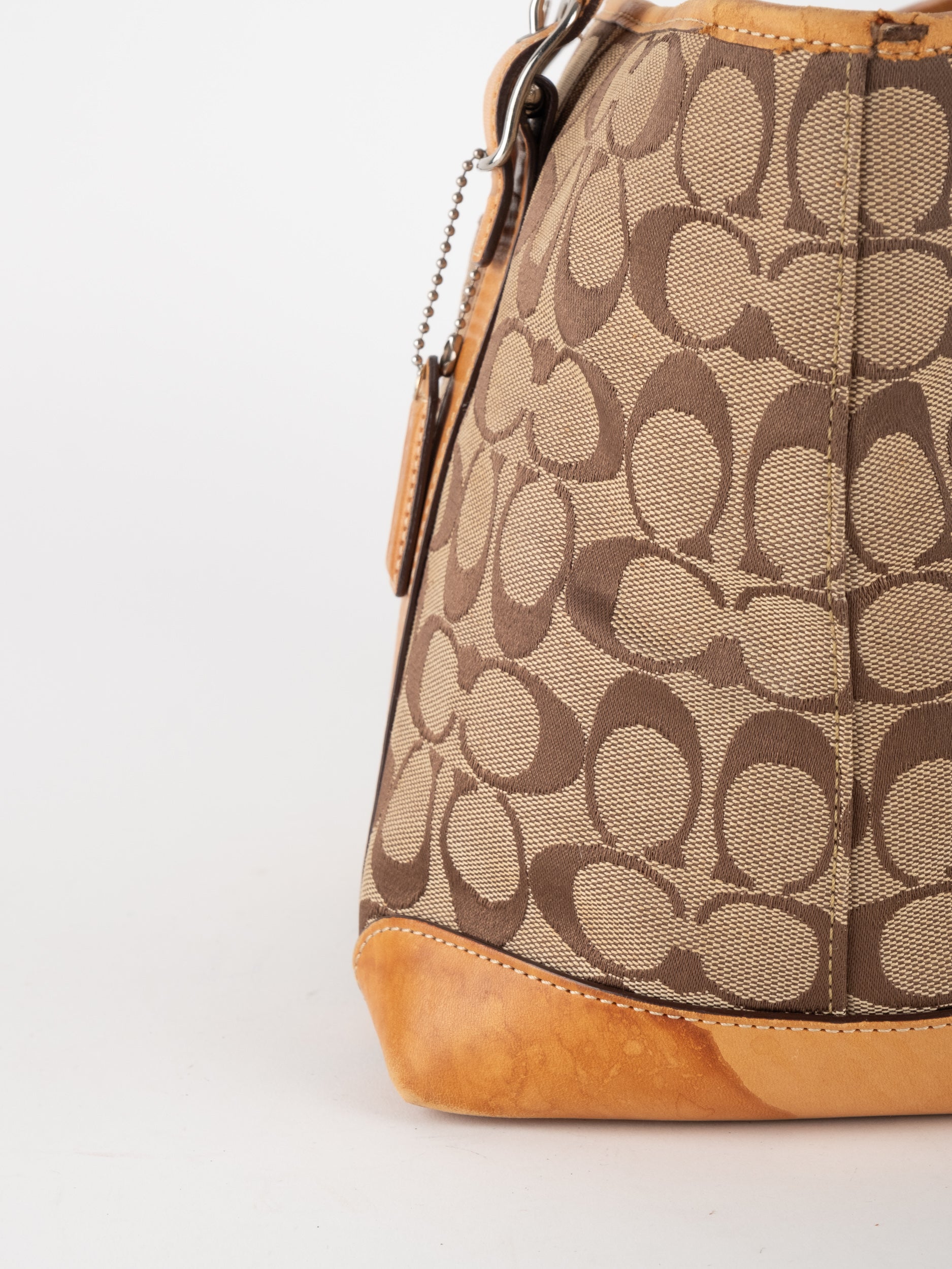 קואץ' COACH וינטג' יד שנייה בדוגמת Signature בגווני בז’ עם רצועות עור בגוון קוניאק חם. ote קלאסי עם אמירה ברורה ומראה אמריקאי על־זמני.