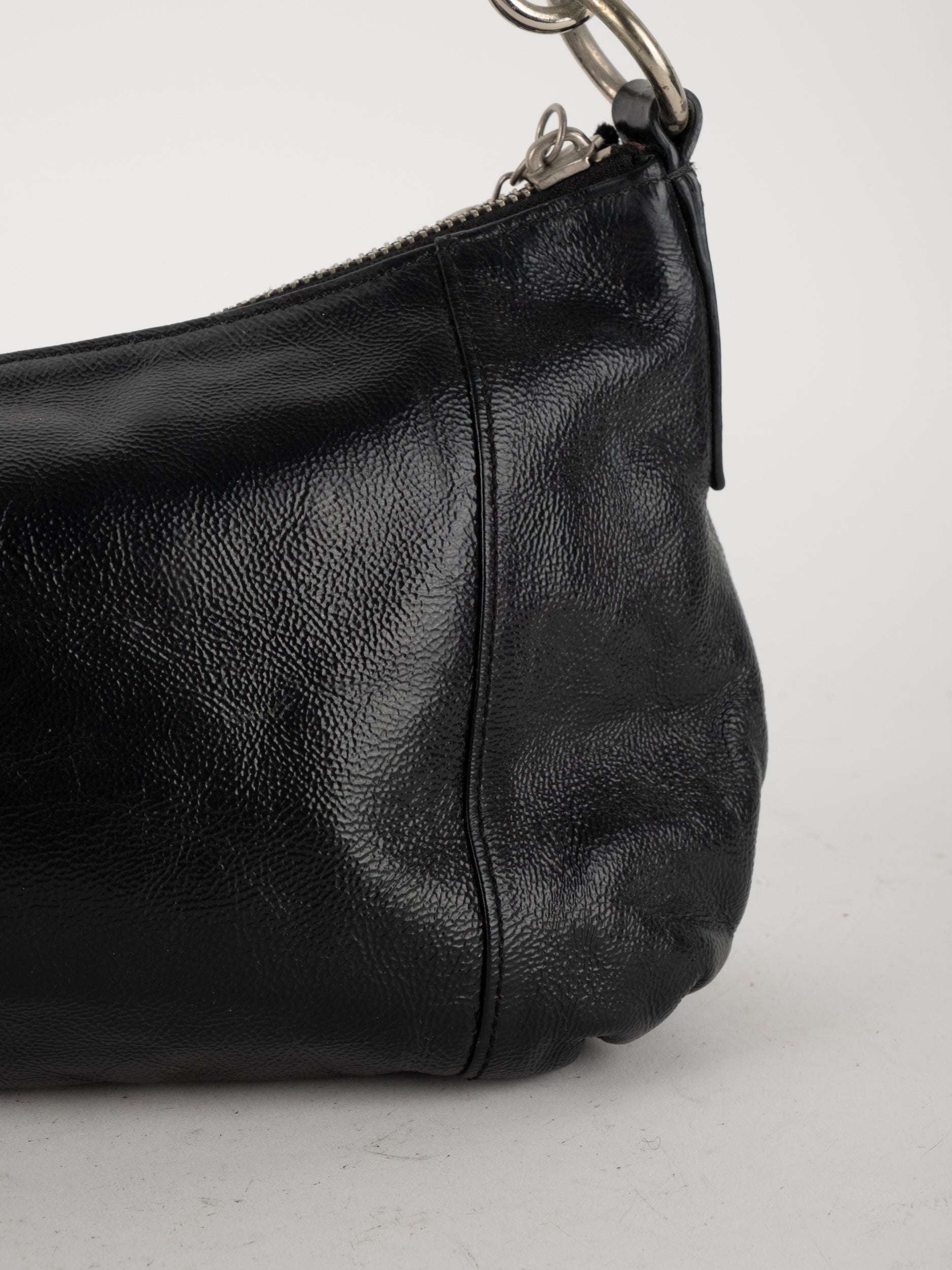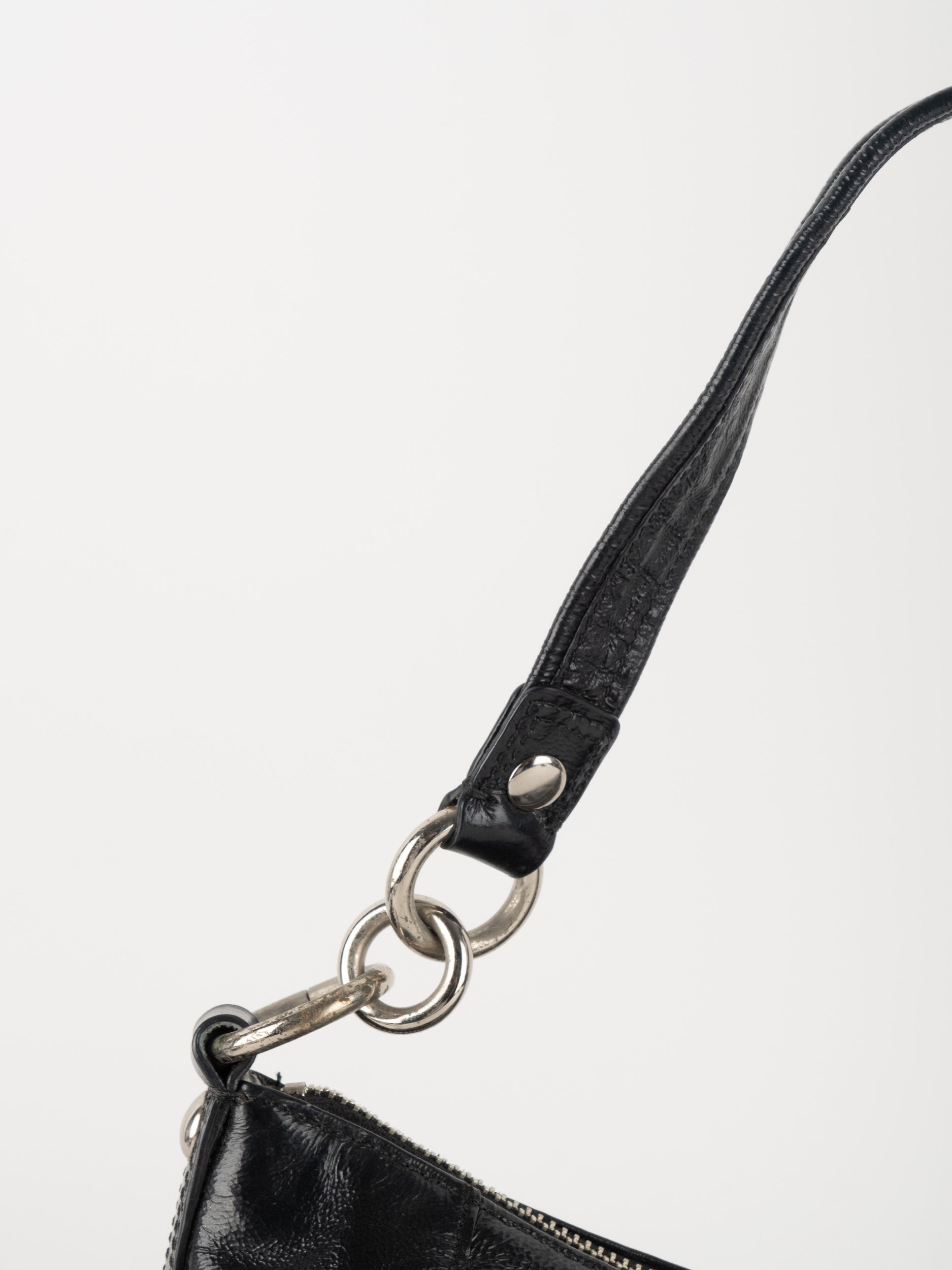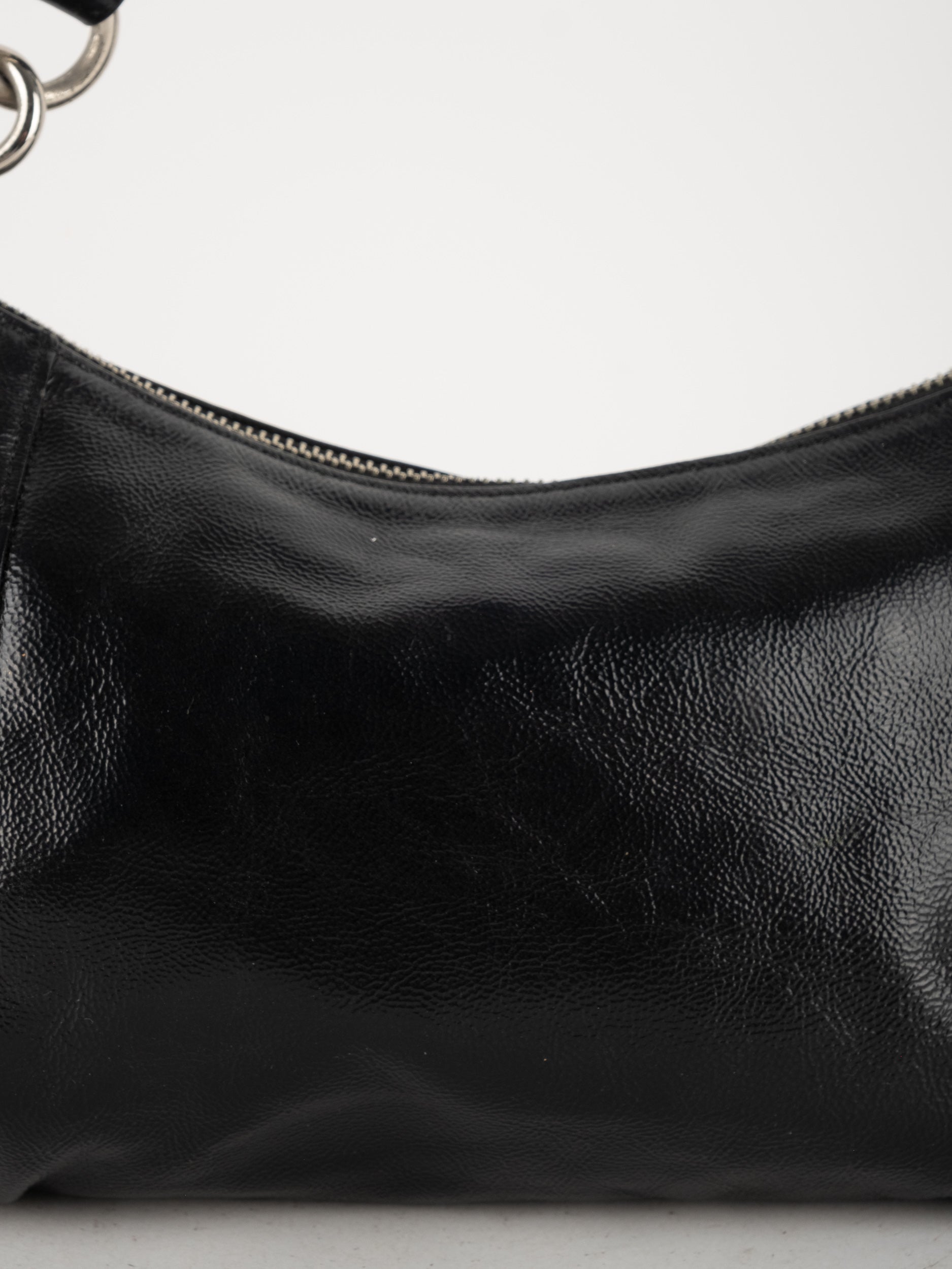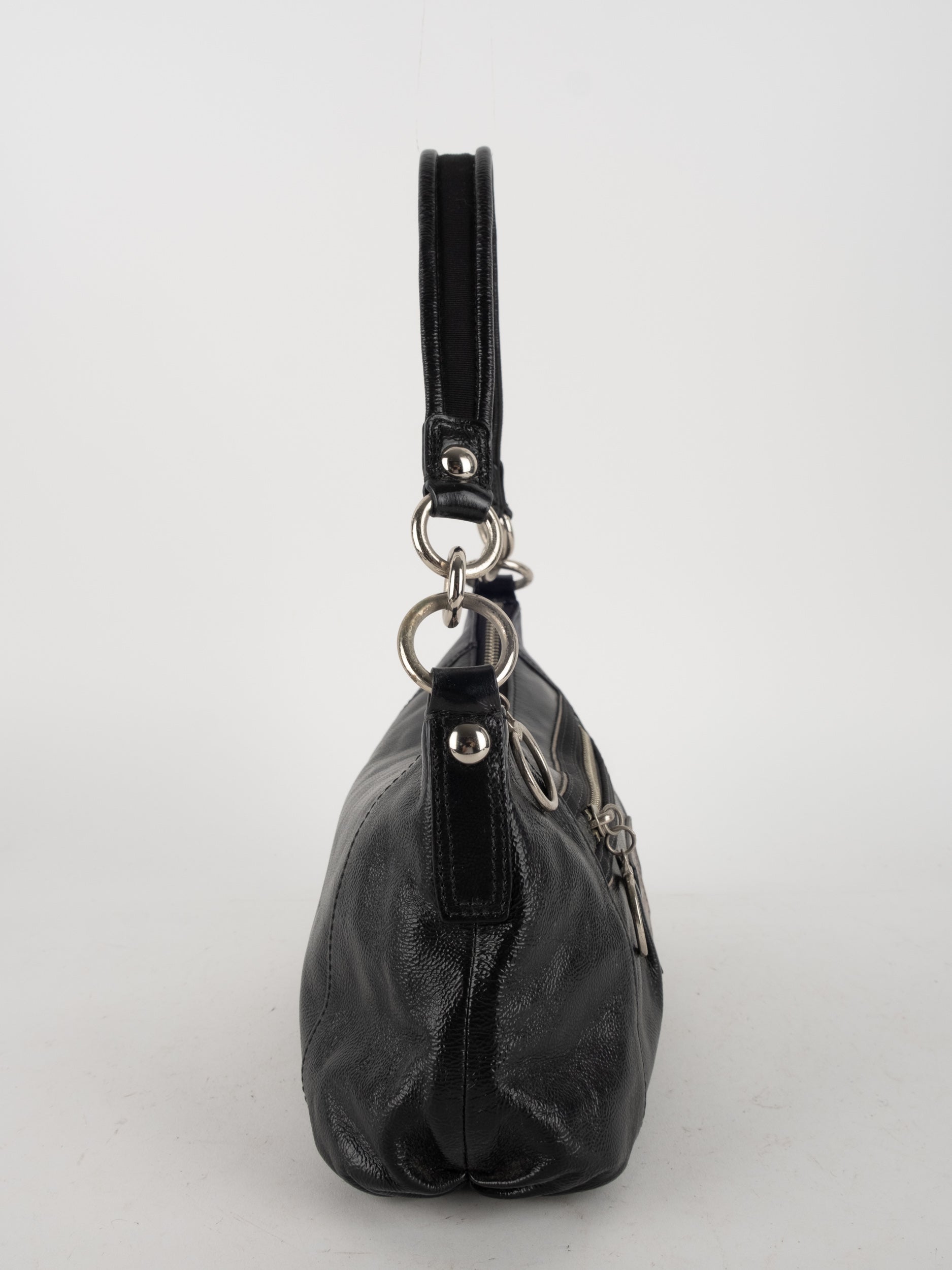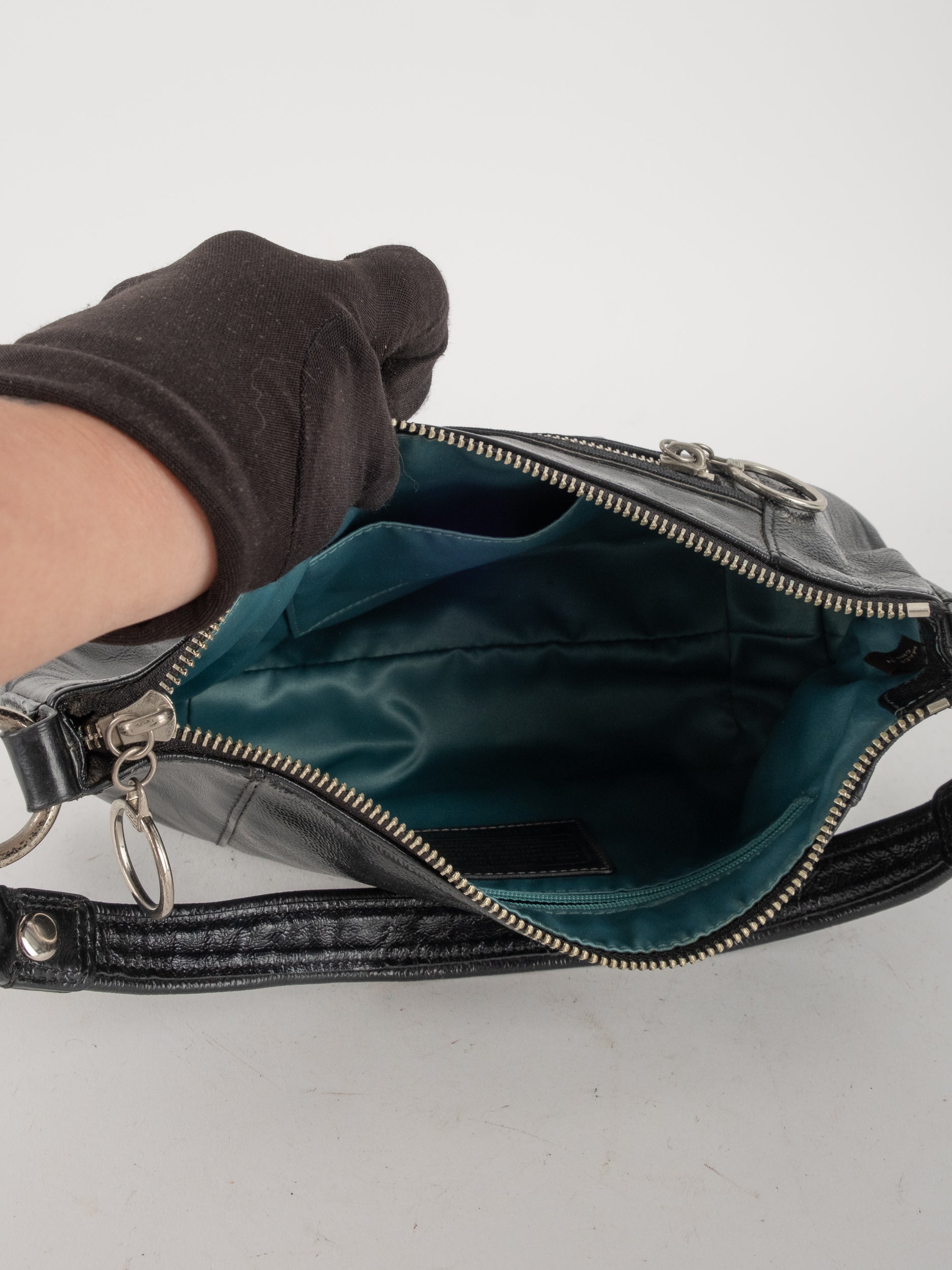התיק עשוי עור במרקם טבעי בגוון שחור עם ידית כתף אחת לנשיאה נוחה. בחזית התיק כיס חיצוני עם רוכסן ופרטי מתכת דקורטיביים, ותא מרכזי עם סגירה עליונה באמצעות רוכסן. המבנה קומפקטי אך שימושי לנשיאת חפצים יומיומיים.