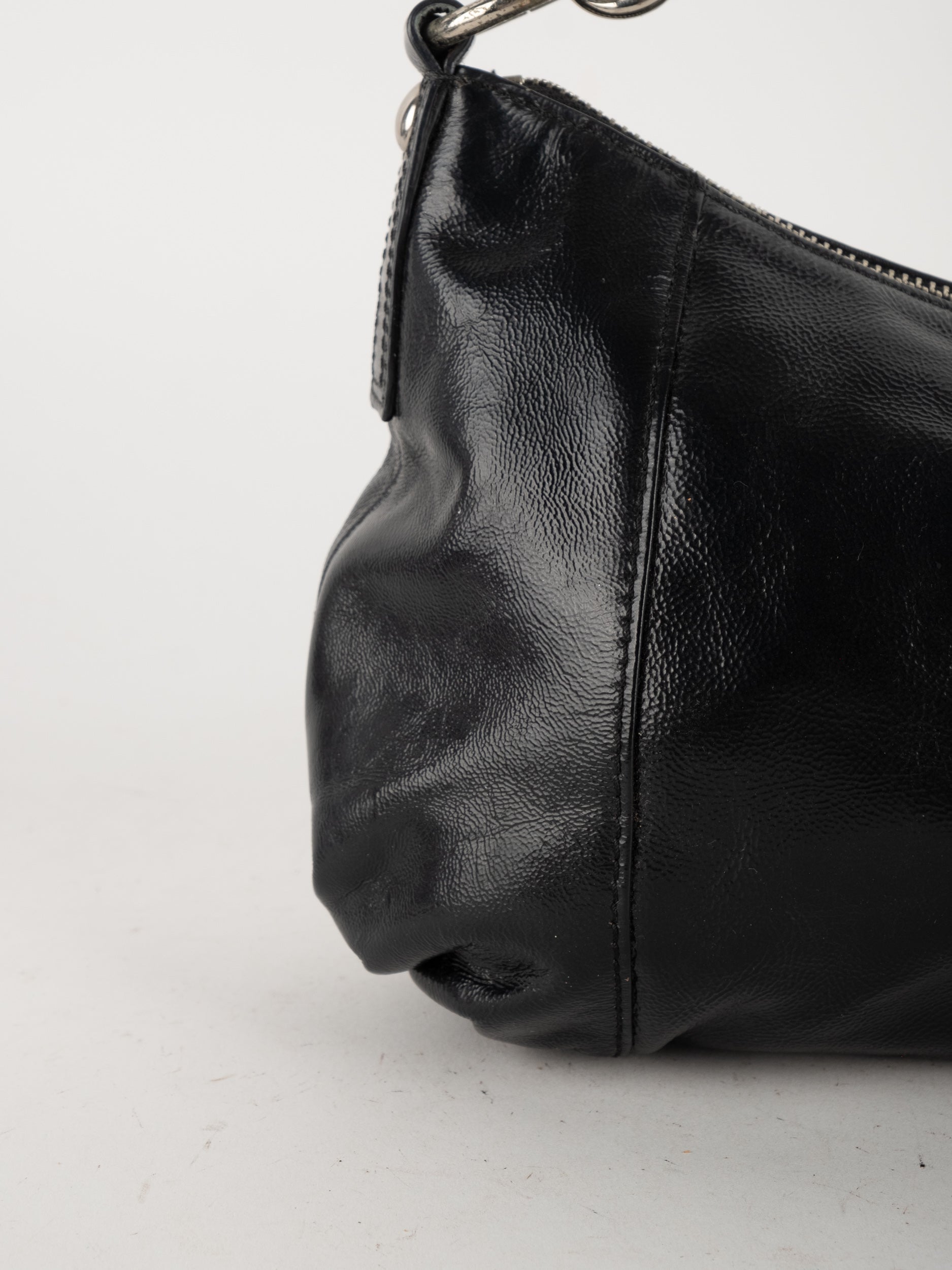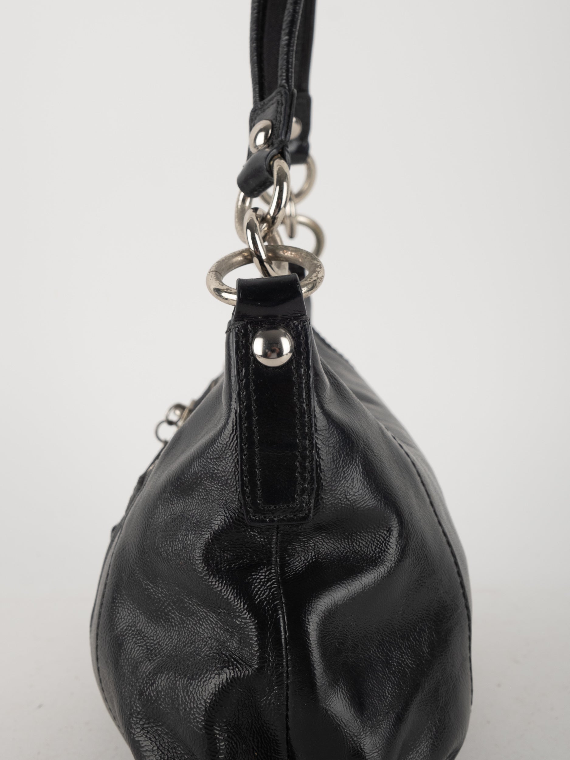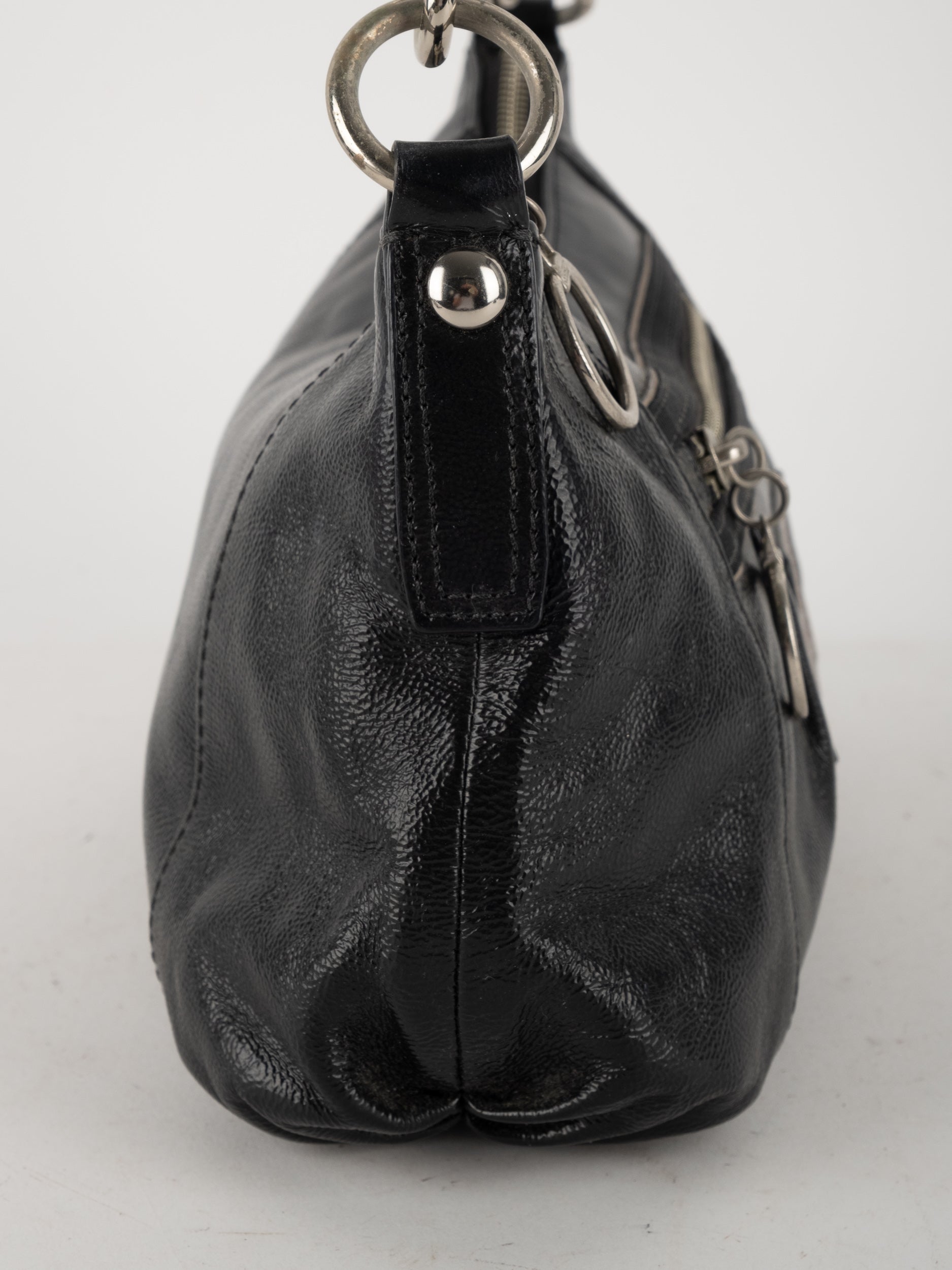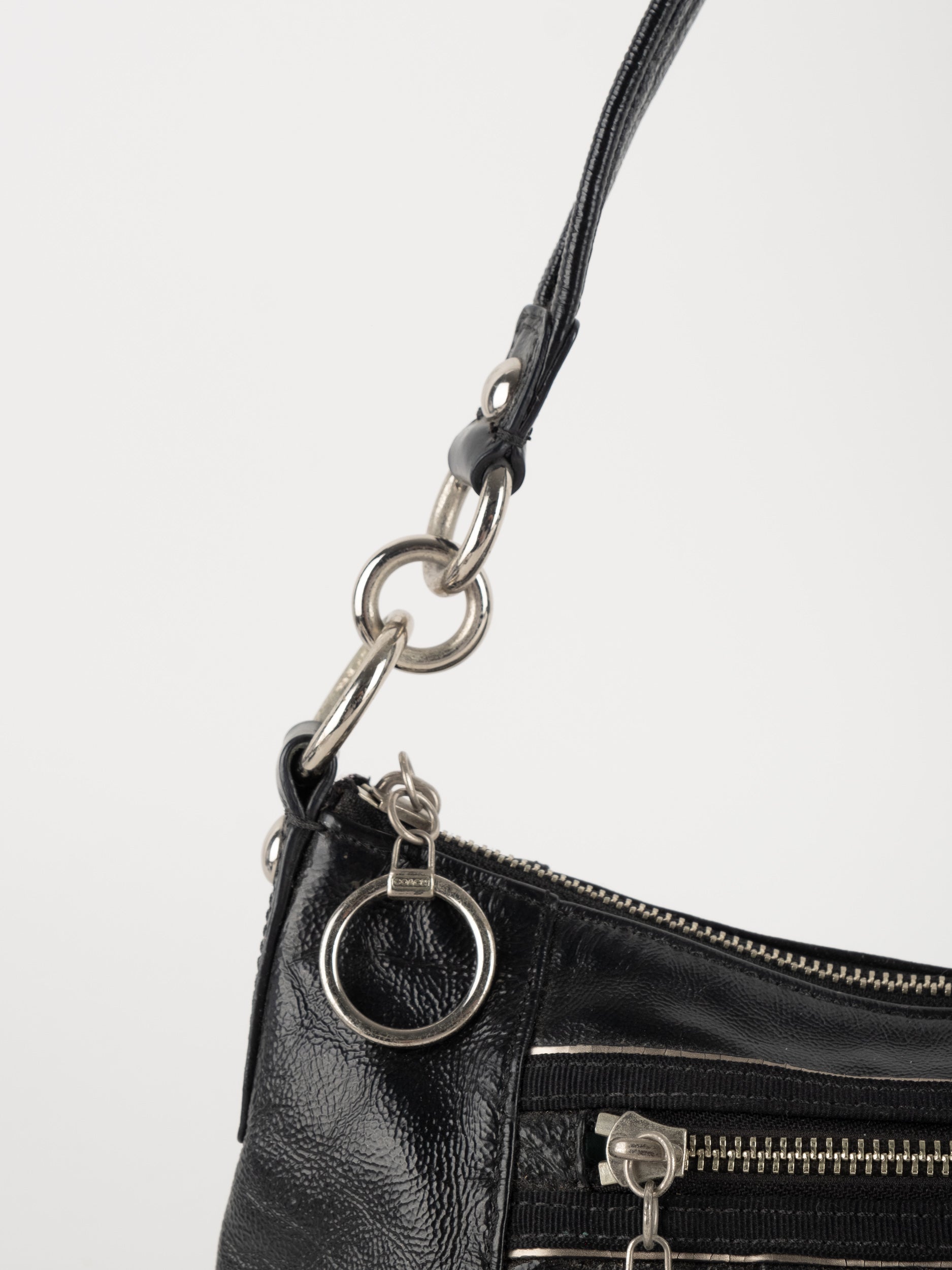 התיק עשוי עור במרקם טבעי בגוון שחור עם ידית כתף אחת לנשיאה נוחה. בחזית התיק כיס חיצוני עם רוכסן ופרטי מתכת דקורטיביים, ותא מרכזי עם סגירה עליונה באמצעות רוכסן. המבנה קומפקטי אך שימושי לנשיאת חפצים יומיומיים.