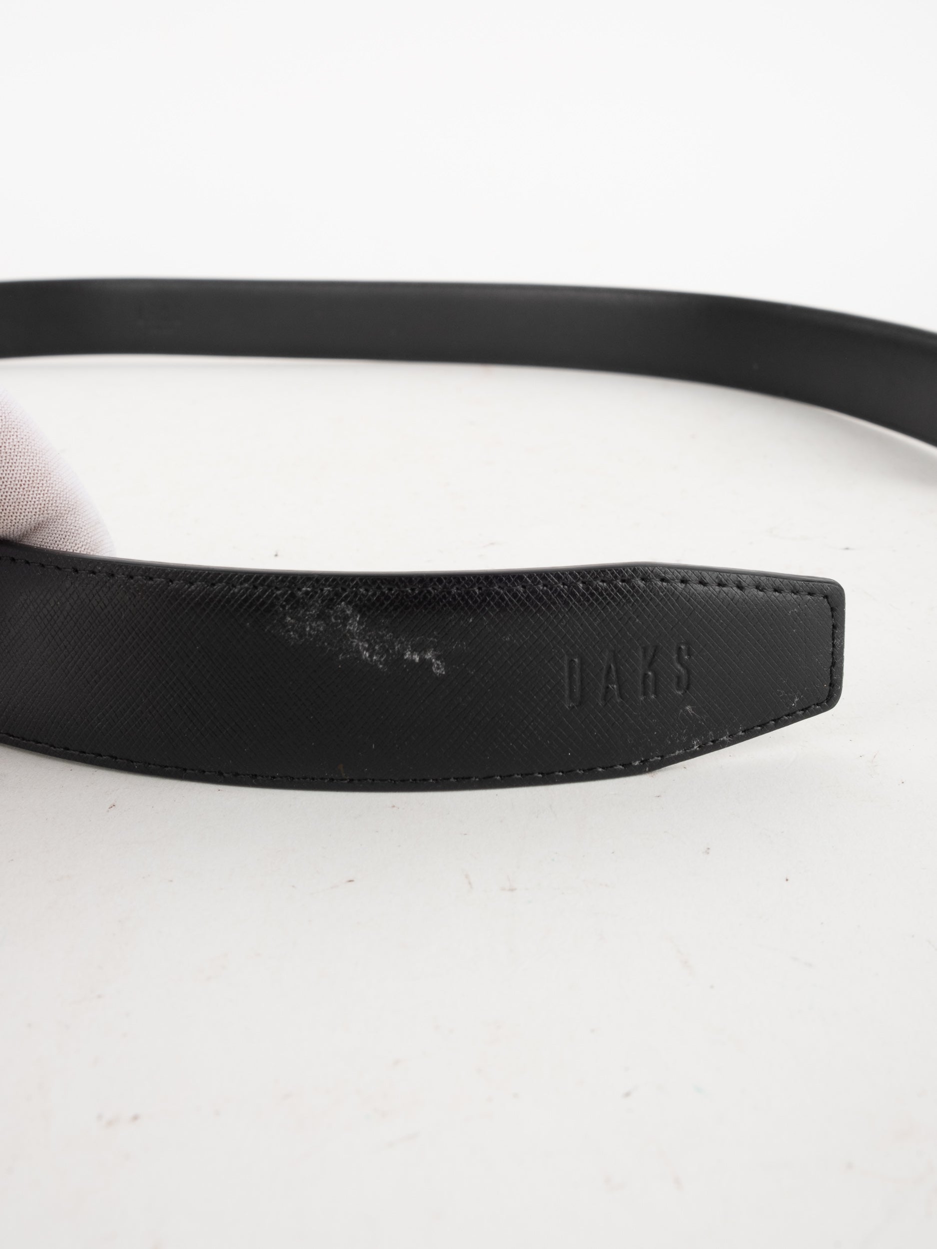 החגורה עשויה עור בגוון שחור במרקם חלק, עם אבזם מתכתי כסוף הכולל לוגו DAKS בעיצוב מינימליסטי. הסגירה נוחה ויציבה, עם מנגנון מודרני ולא מחורר.