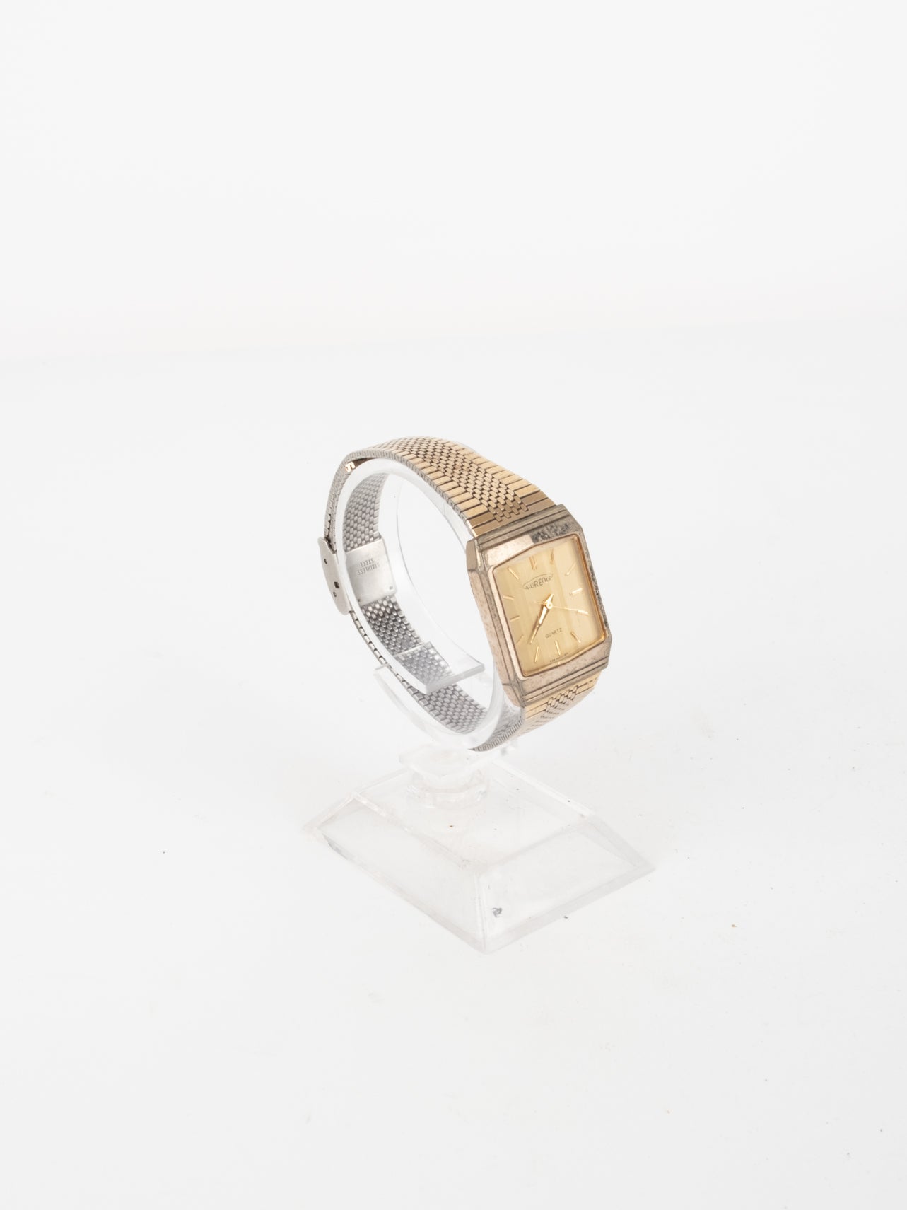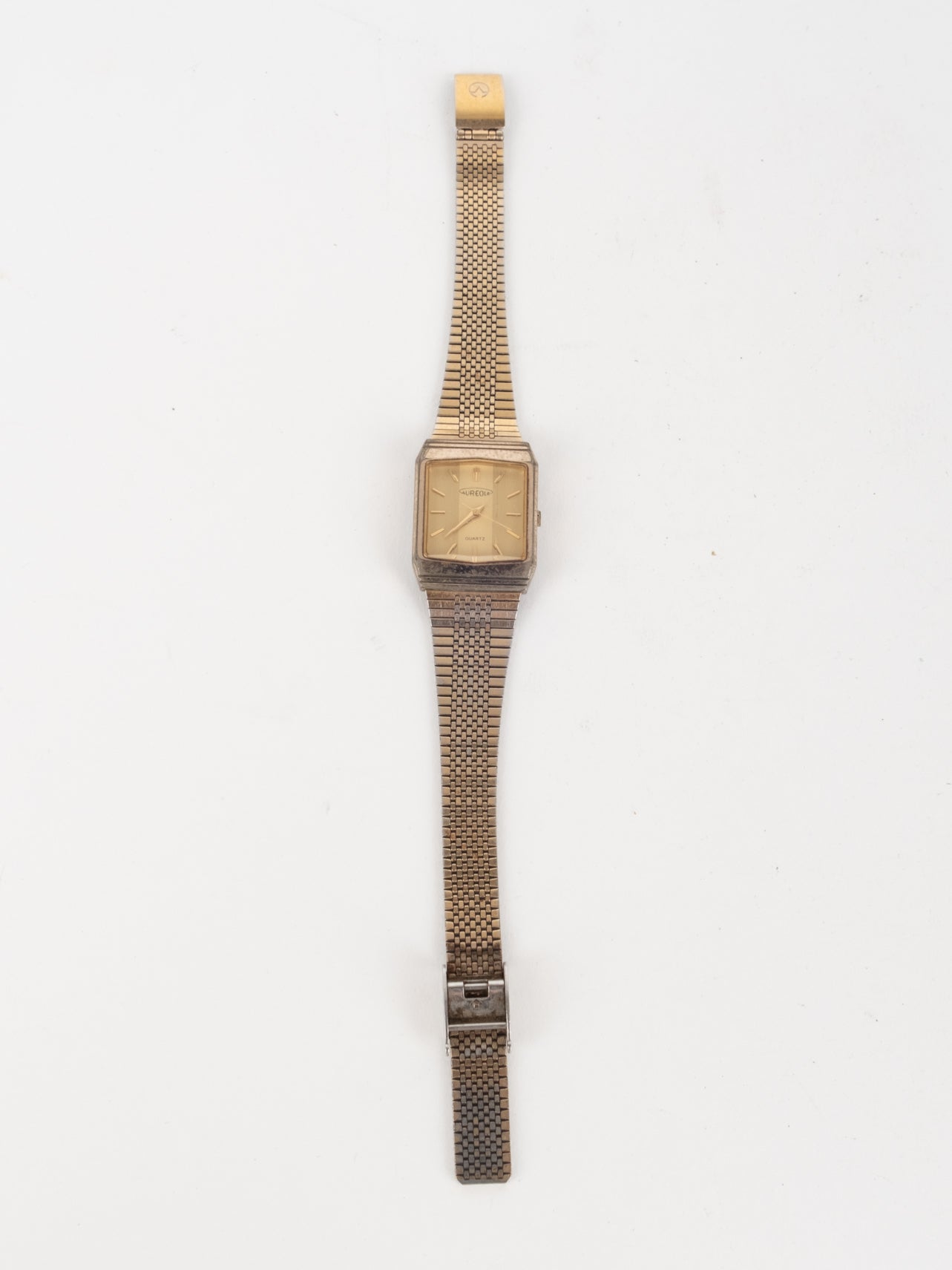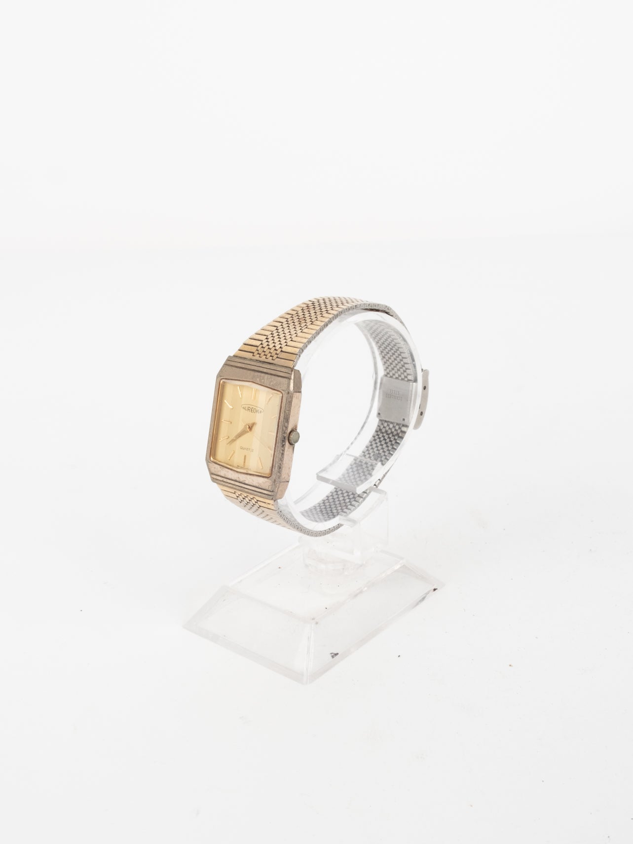 שעון קלאסי בצבע זהב בעל פני שעון בצורה מרובעת עם רקע בצבע זהה ומחוגים. שעון זה נסגר באמצעות סוגר ממותג.