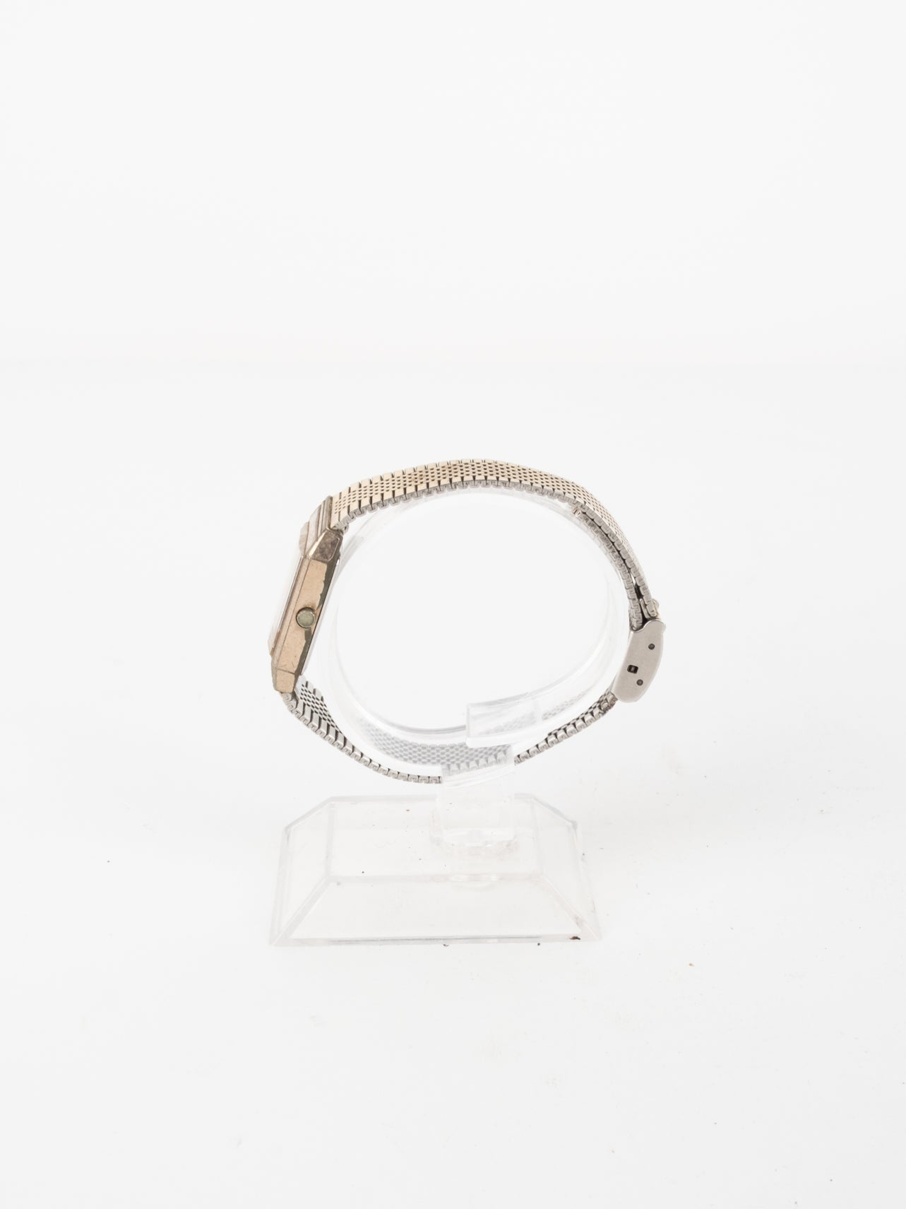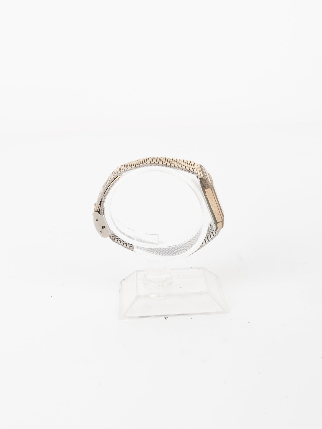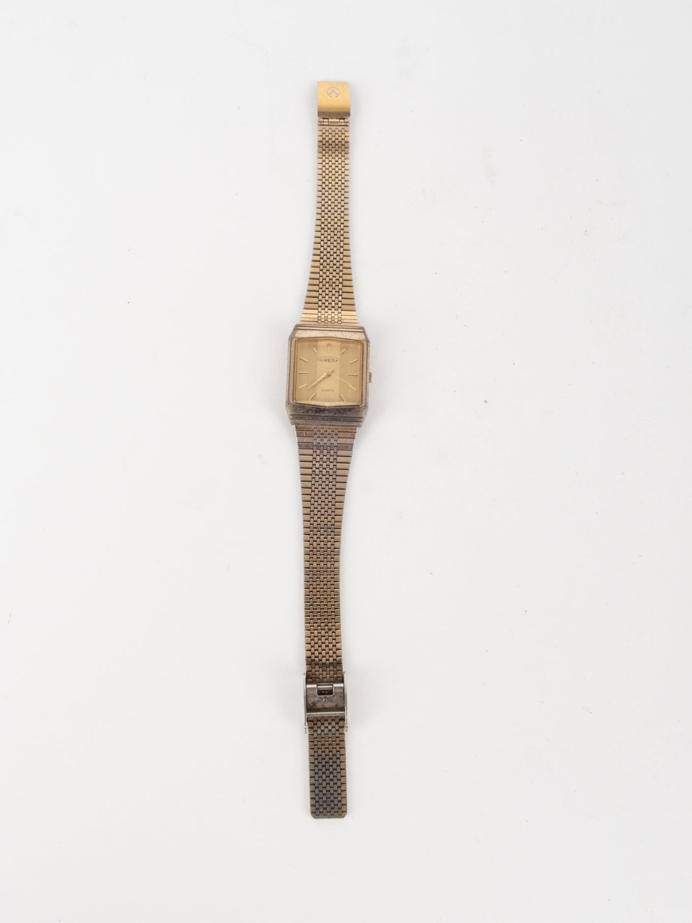 שעון קלאסי בצבע זהב בעל פני שעון בצורה מרובעת עם רקע בצבע זהה ומחוגים. שעון זה נסגר באמצעות סוגר ממותג.