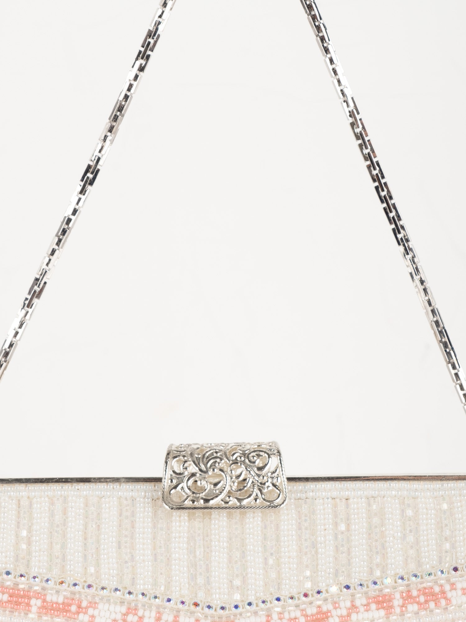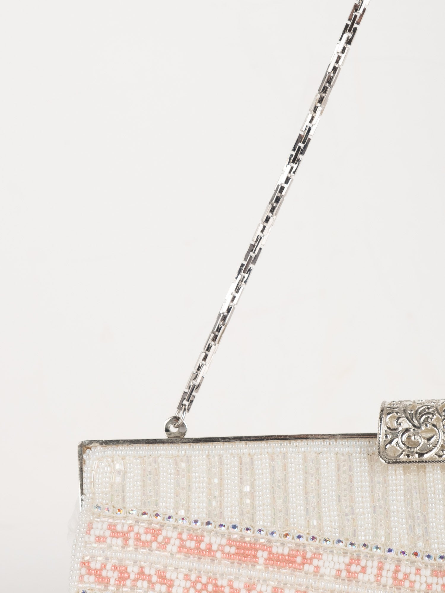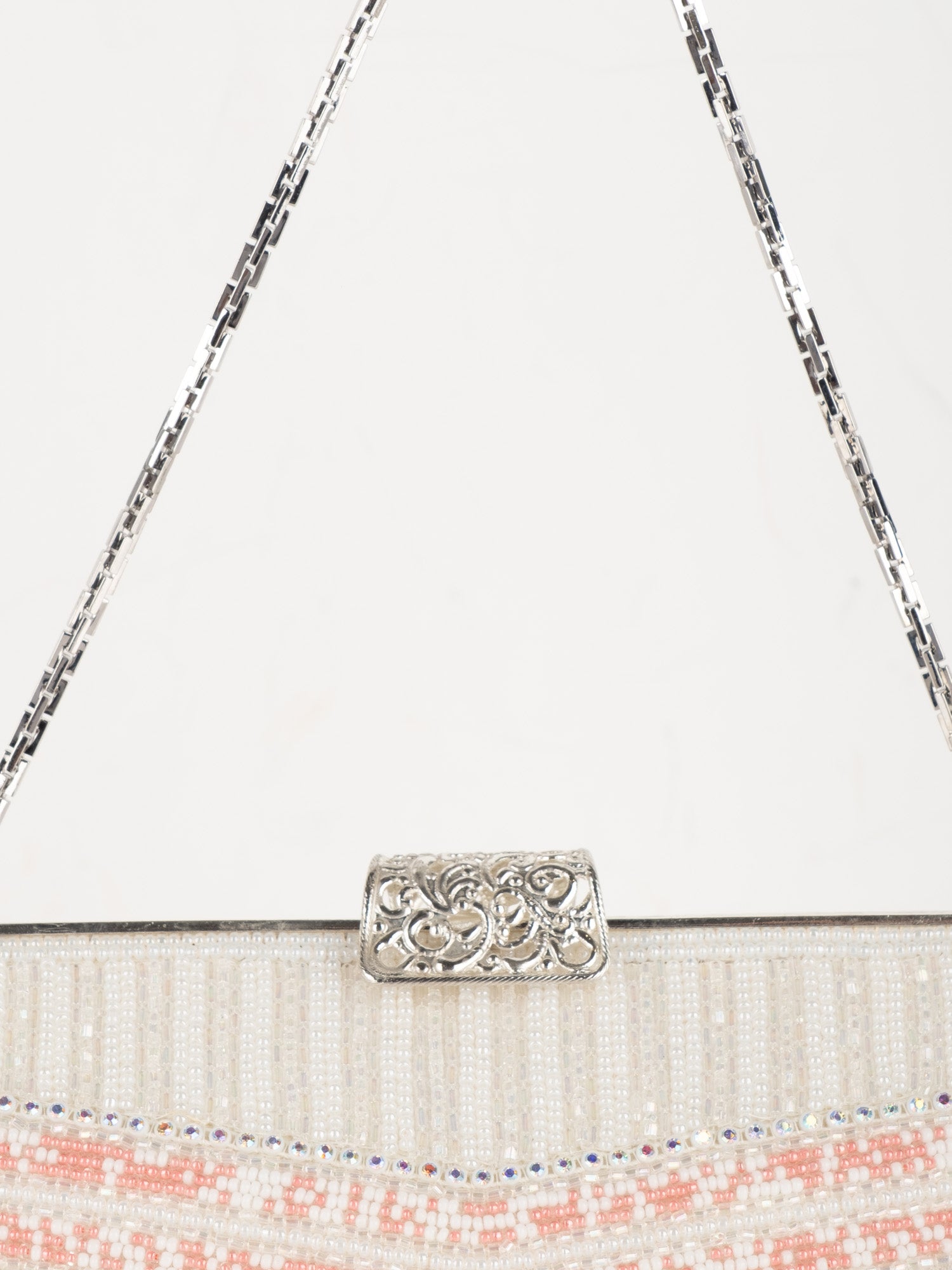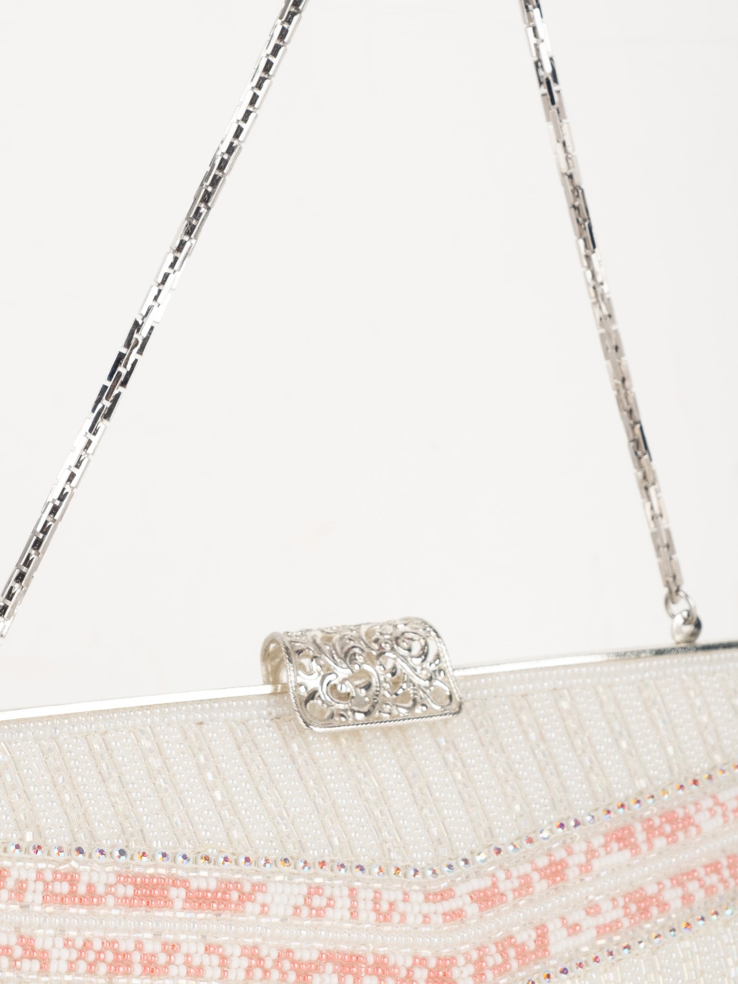 עבודת חרוזים לבנה, עיטורי ורוד בחלק העליון, סגירת קליפס כסופה, ידית שרשרת דקה.