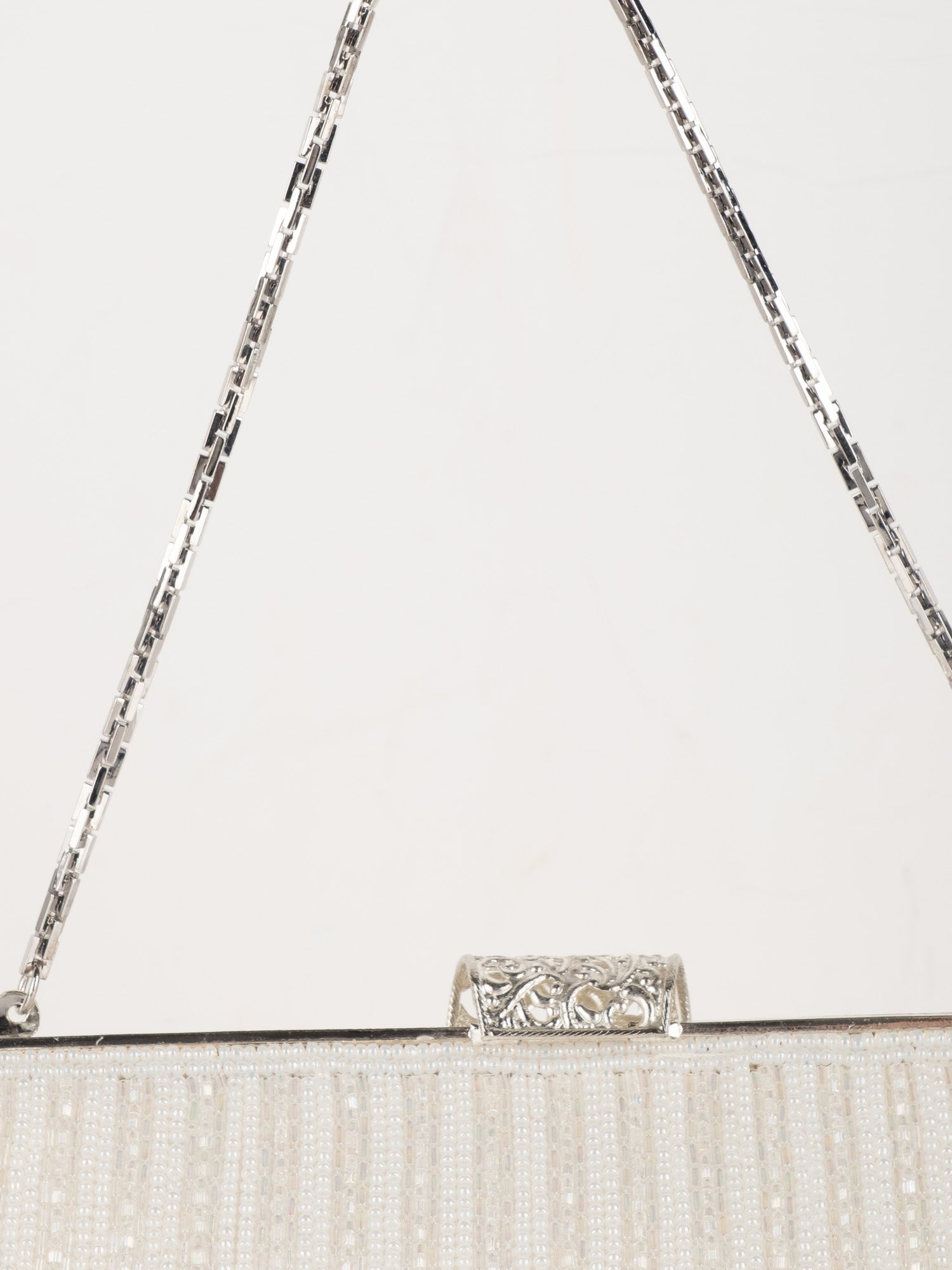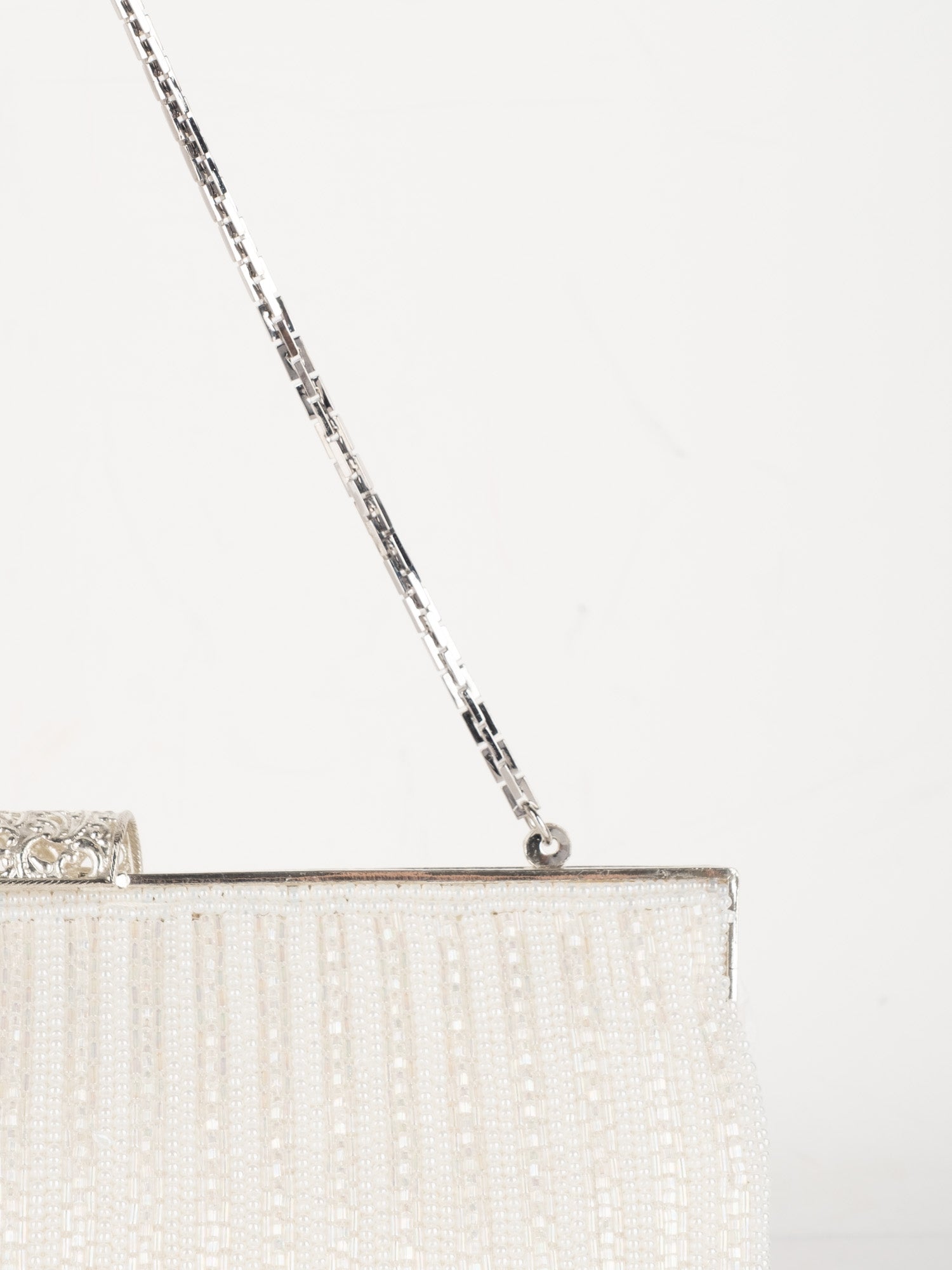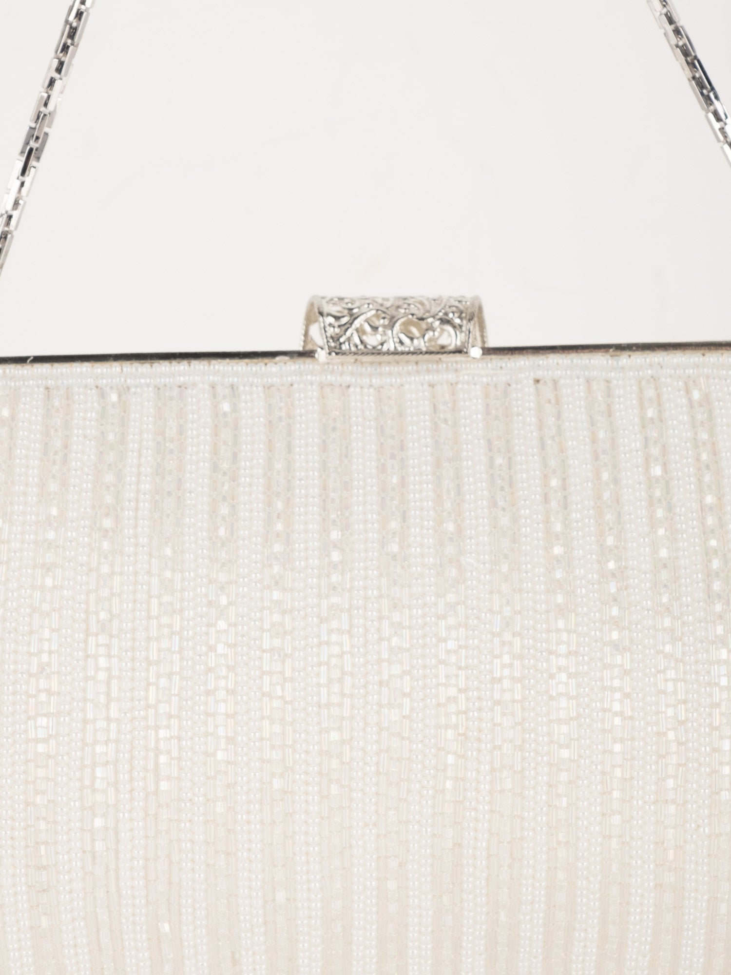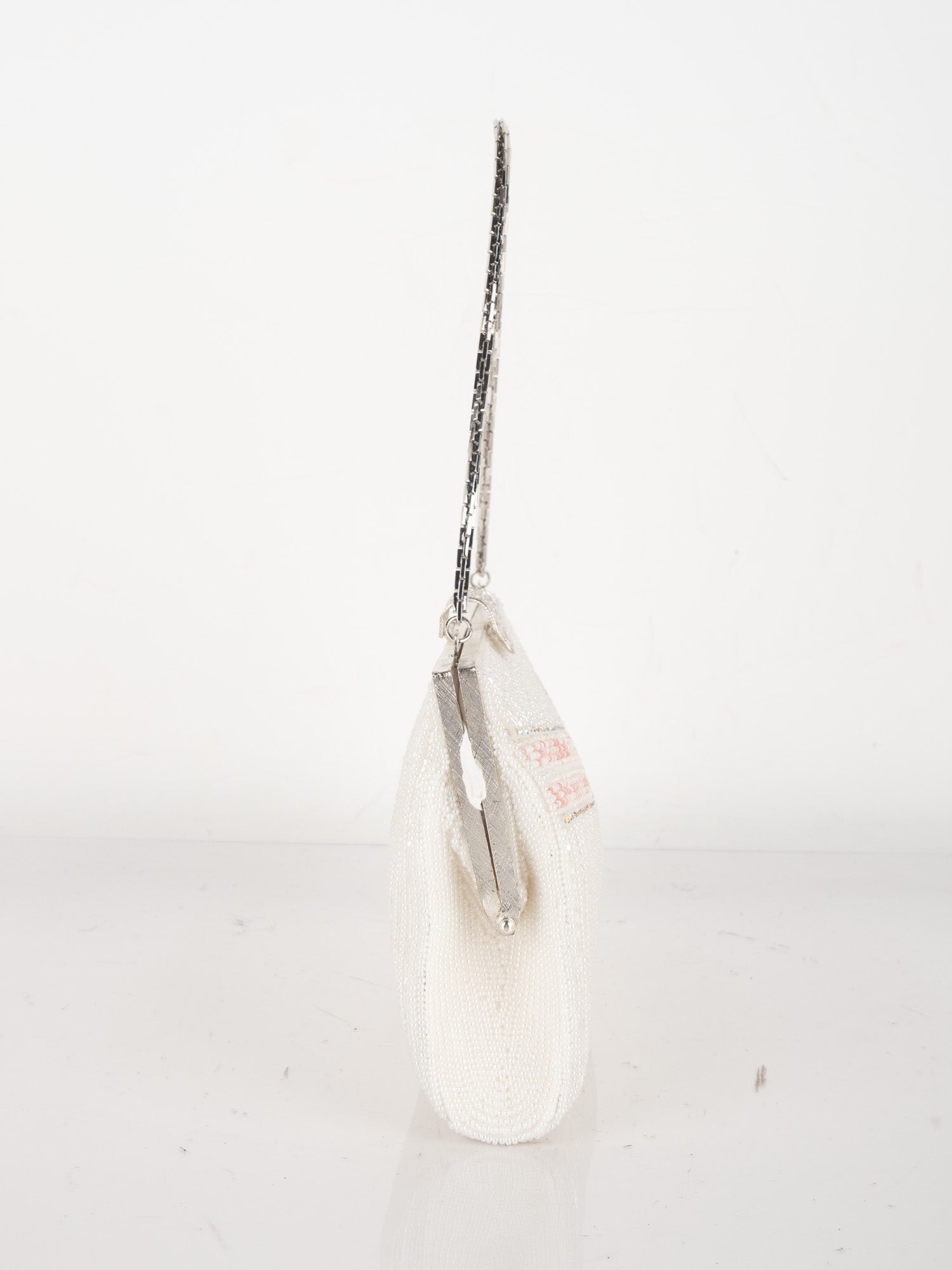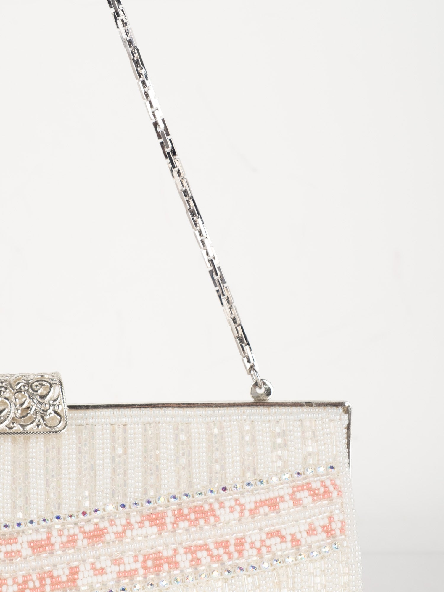עבודת חרוזים לבנה, עיטורי ורוד בחלק העליון, סגירת קליפס כסופה, ידית שרשרת דקה.