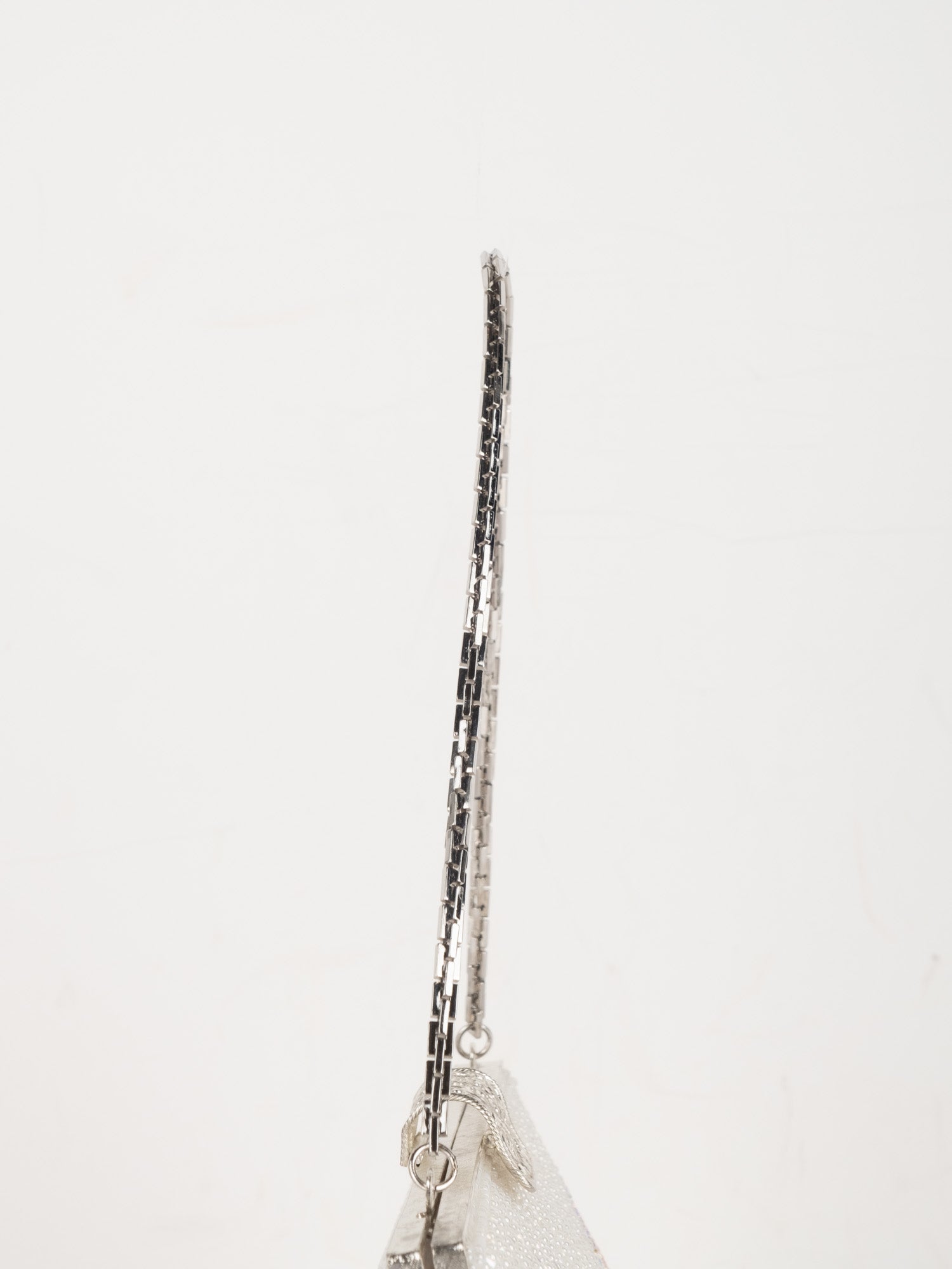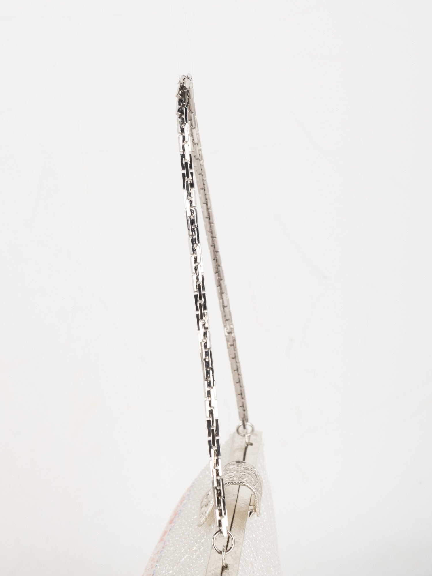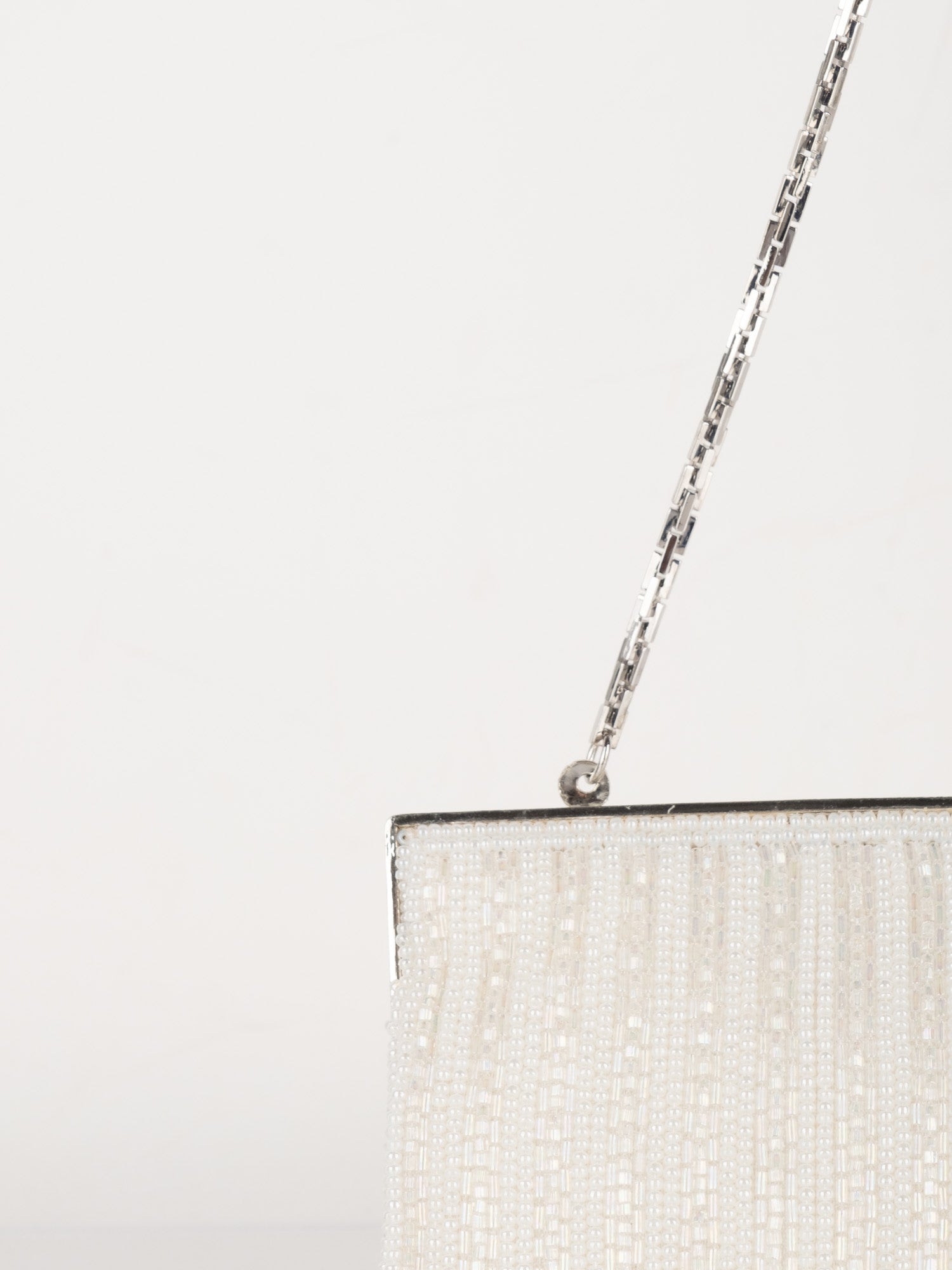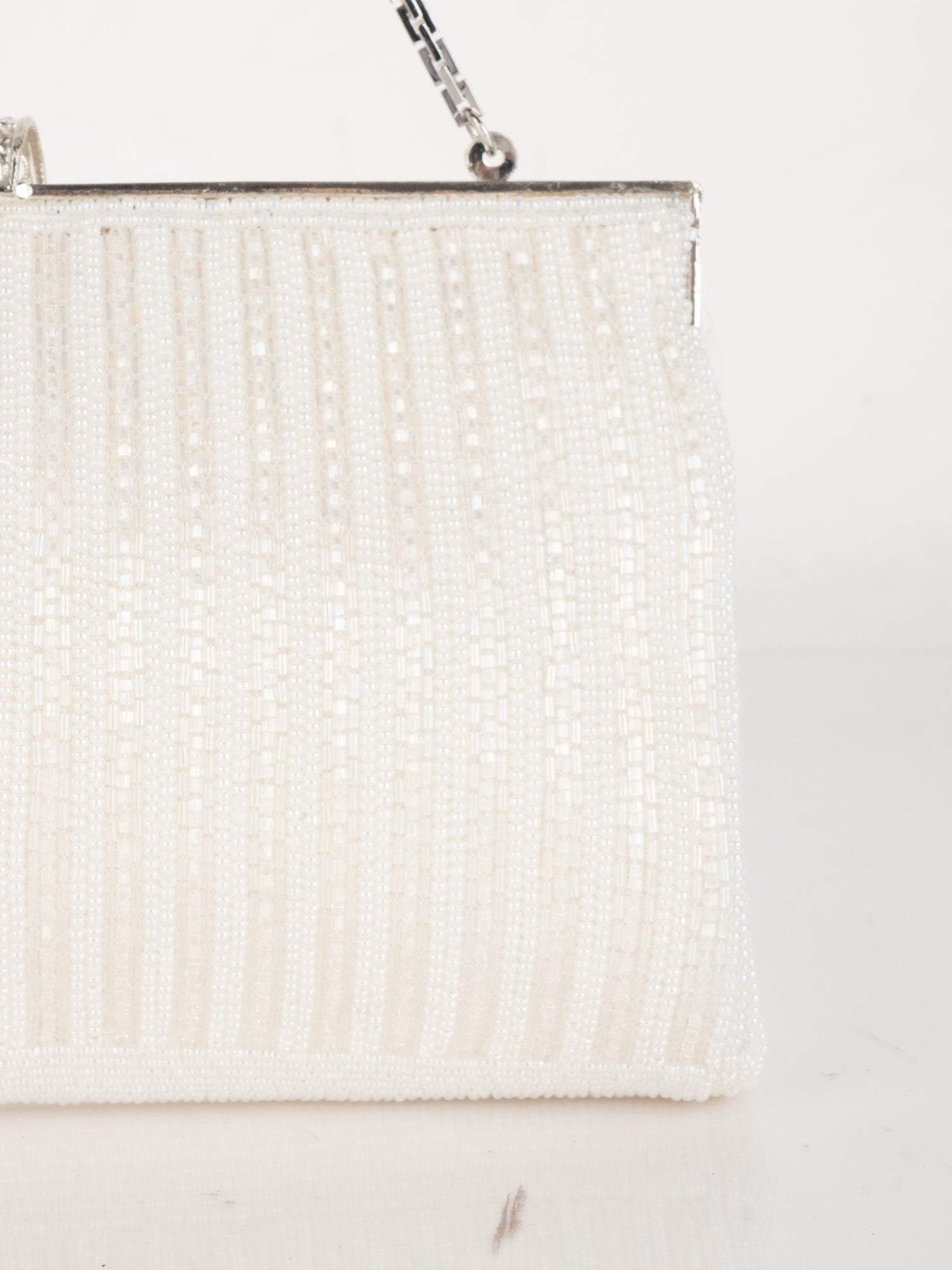 עבודת חרוזים לבנה, עיטורי ורוד בחלק העליון, סגירת קליפס כסופה, ידית שרשרת דקה.