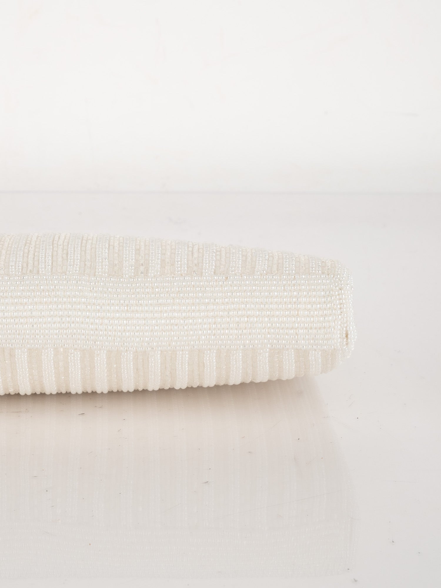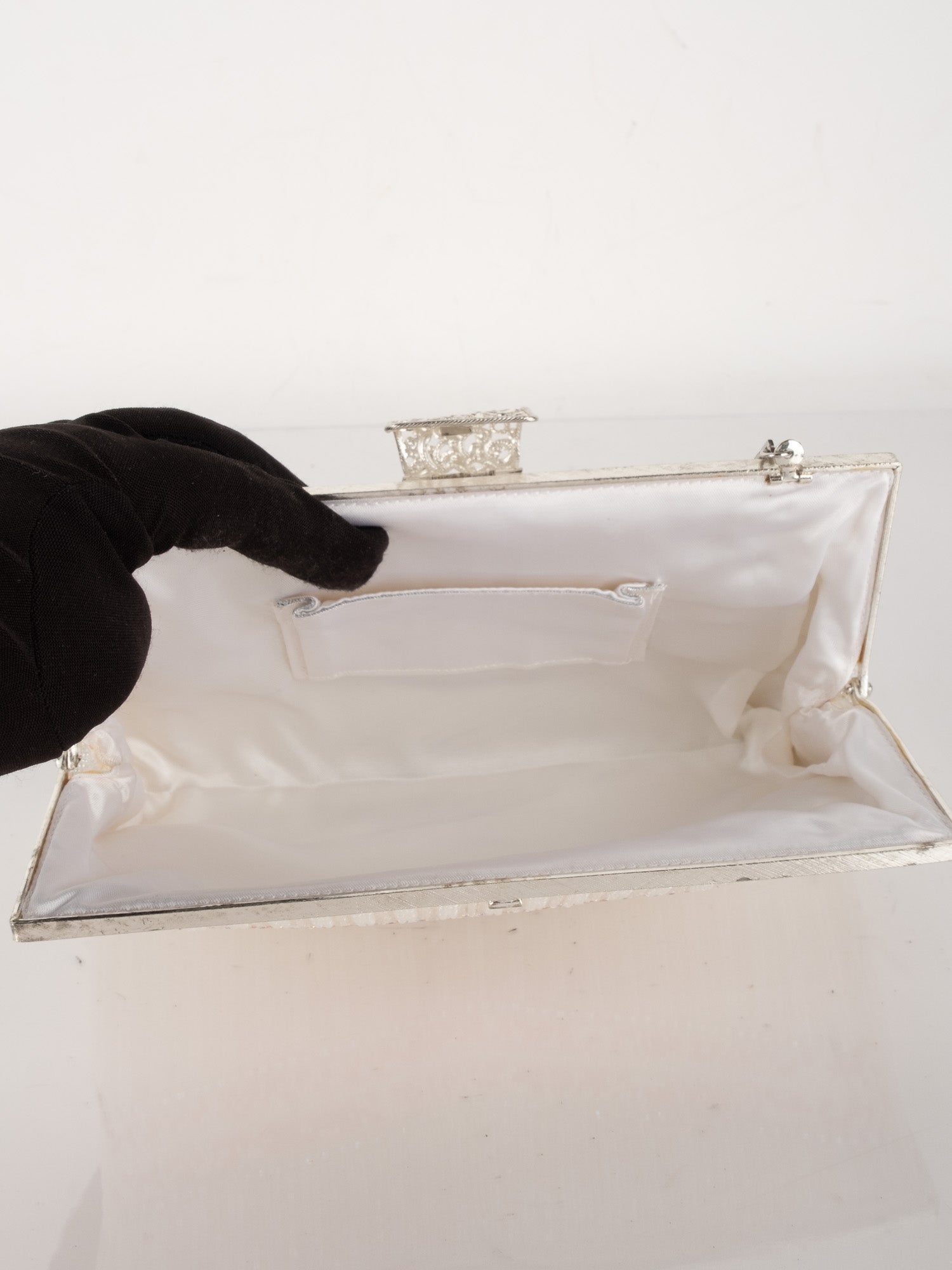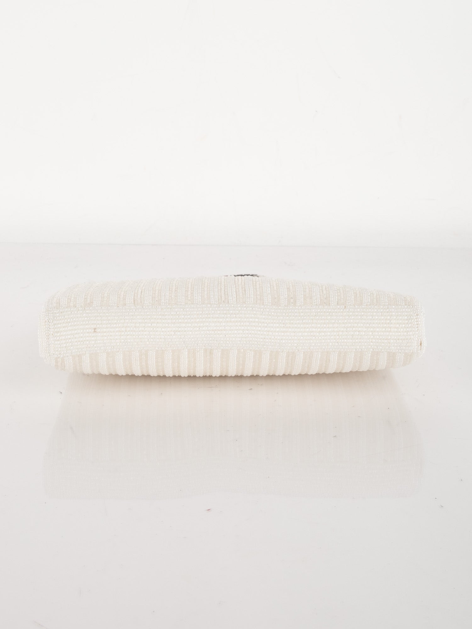 תיק ערב וינטג' יד שנייה בעבודת חרוזים לבנים עם עיטור ורוד עדין וסגירת קליפס כסופה. עיצוב רך, נשי וקלאסי שמוסיף אלגנטיות לכל הופעה.