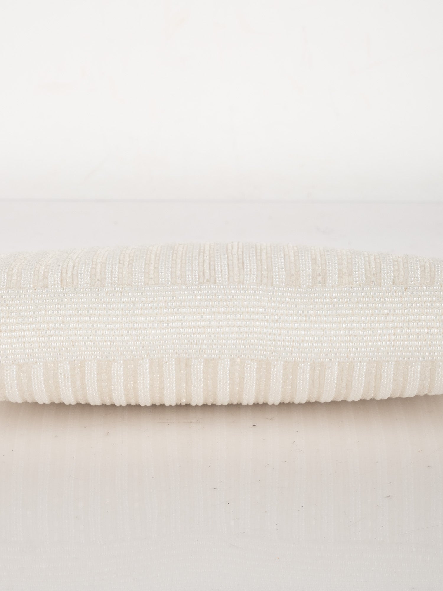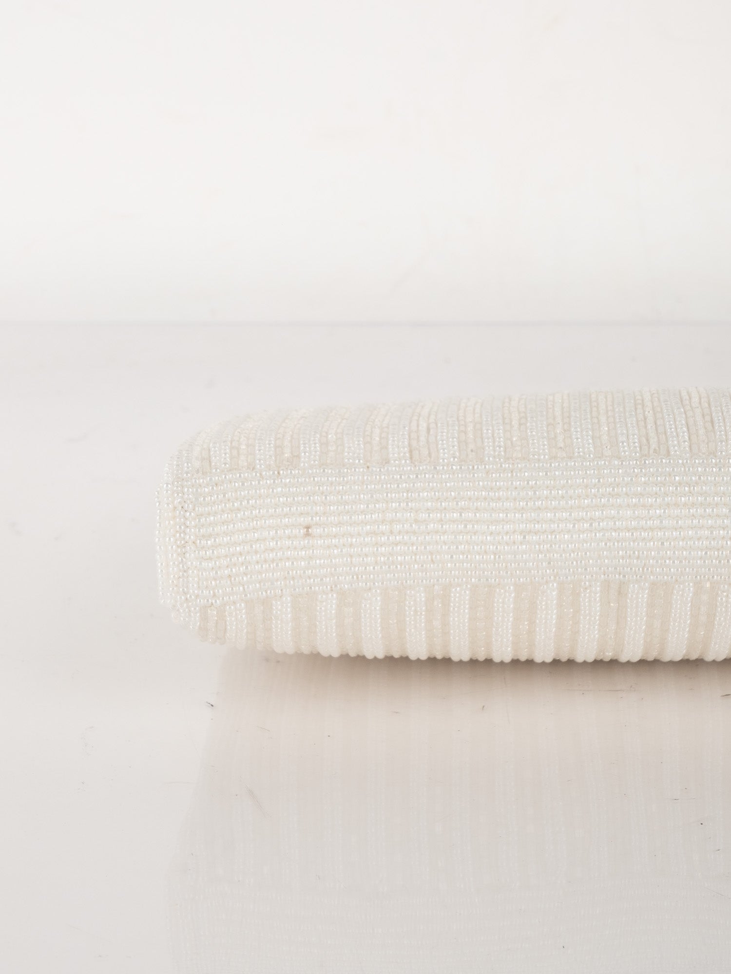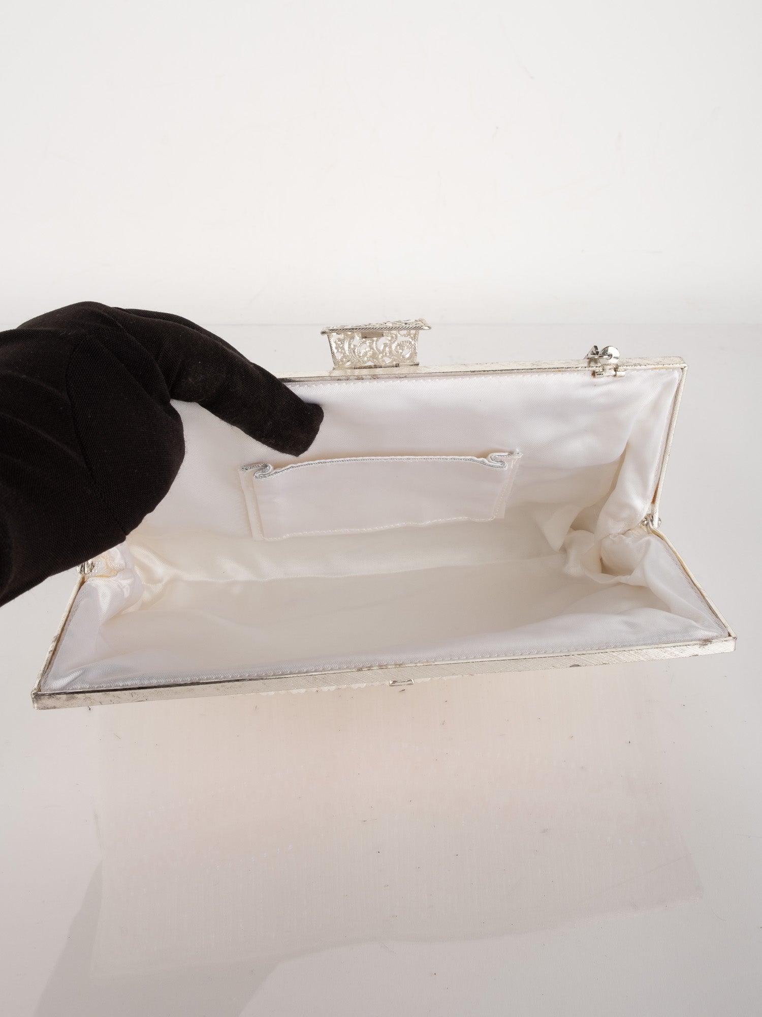 תיק ערב וינטג' יד שנייה בעבודת חרוזים לבנים עם עיטור ורוד עדין וסגירת קליפס כסופה. עיצוב רך, נשי וקלאסי שמוסיף אלגנטיות לכל הופעה.