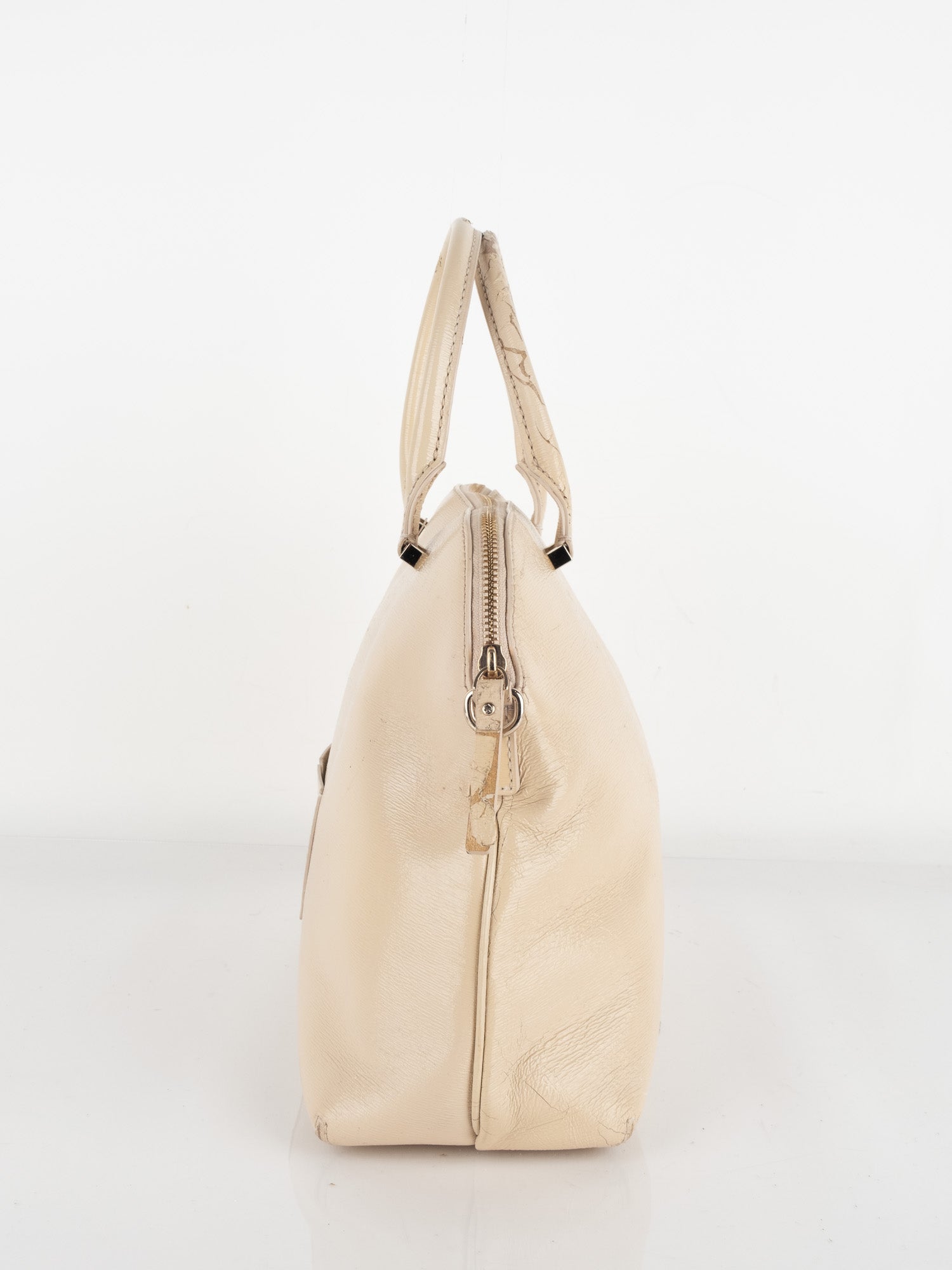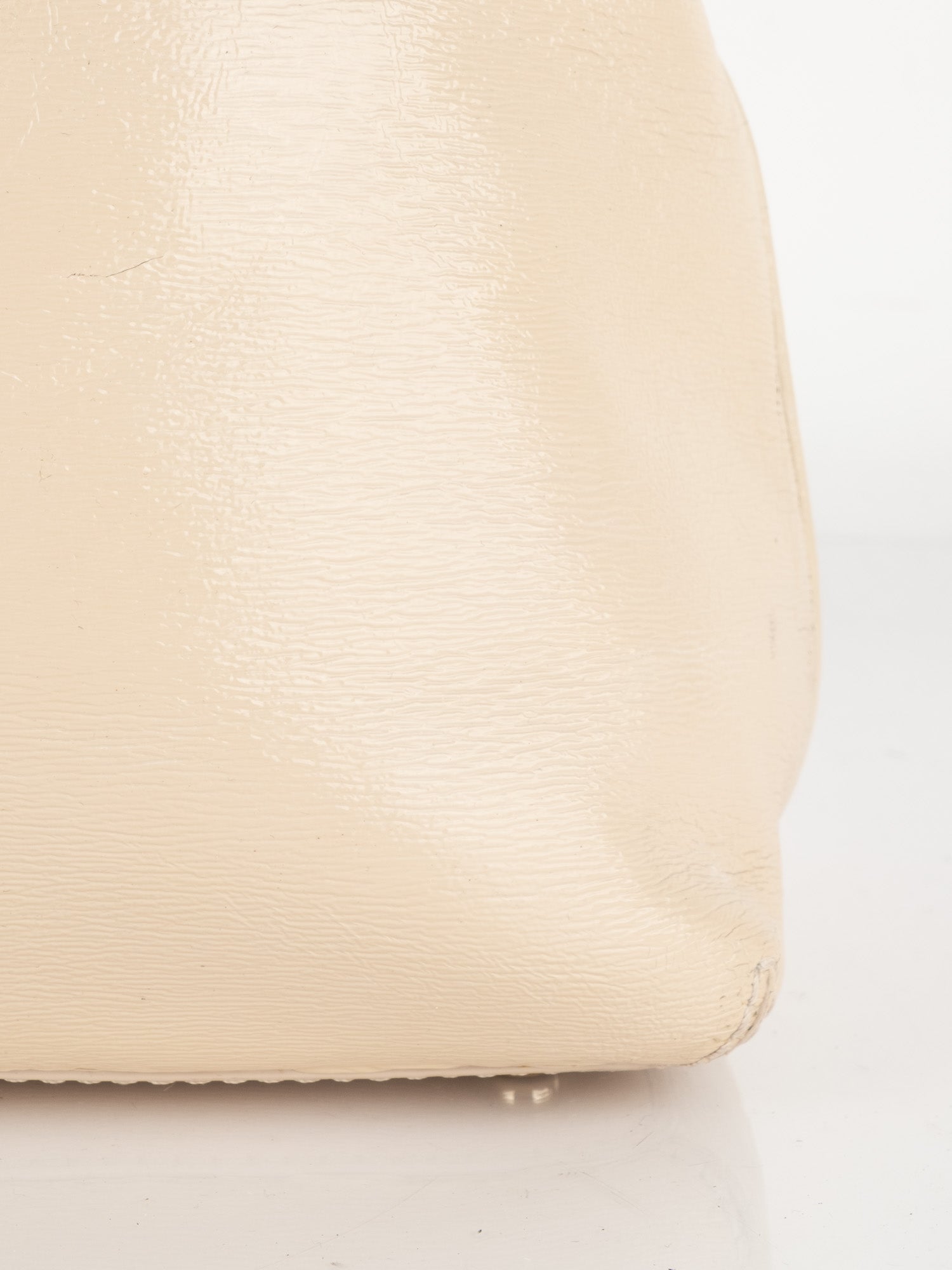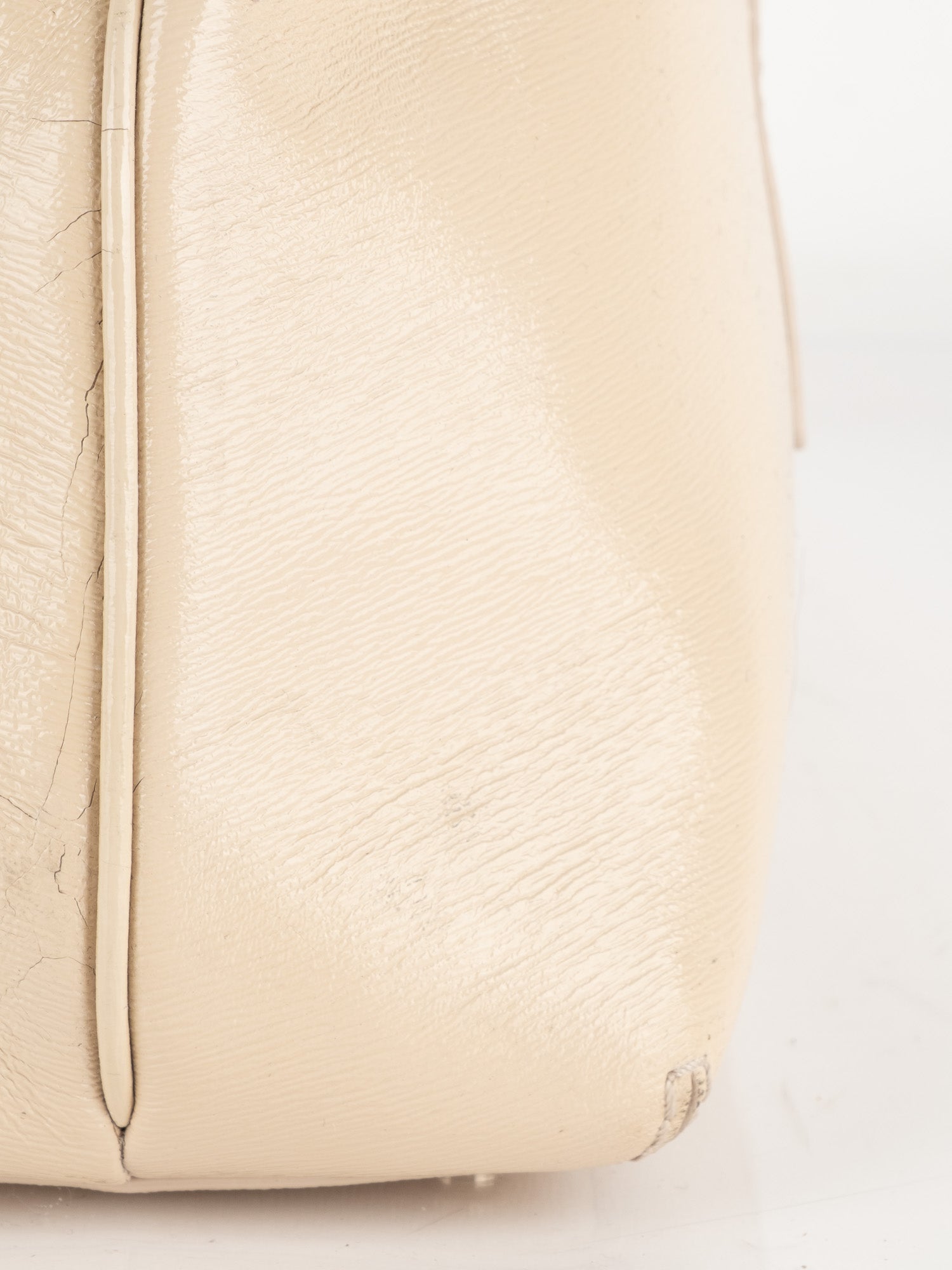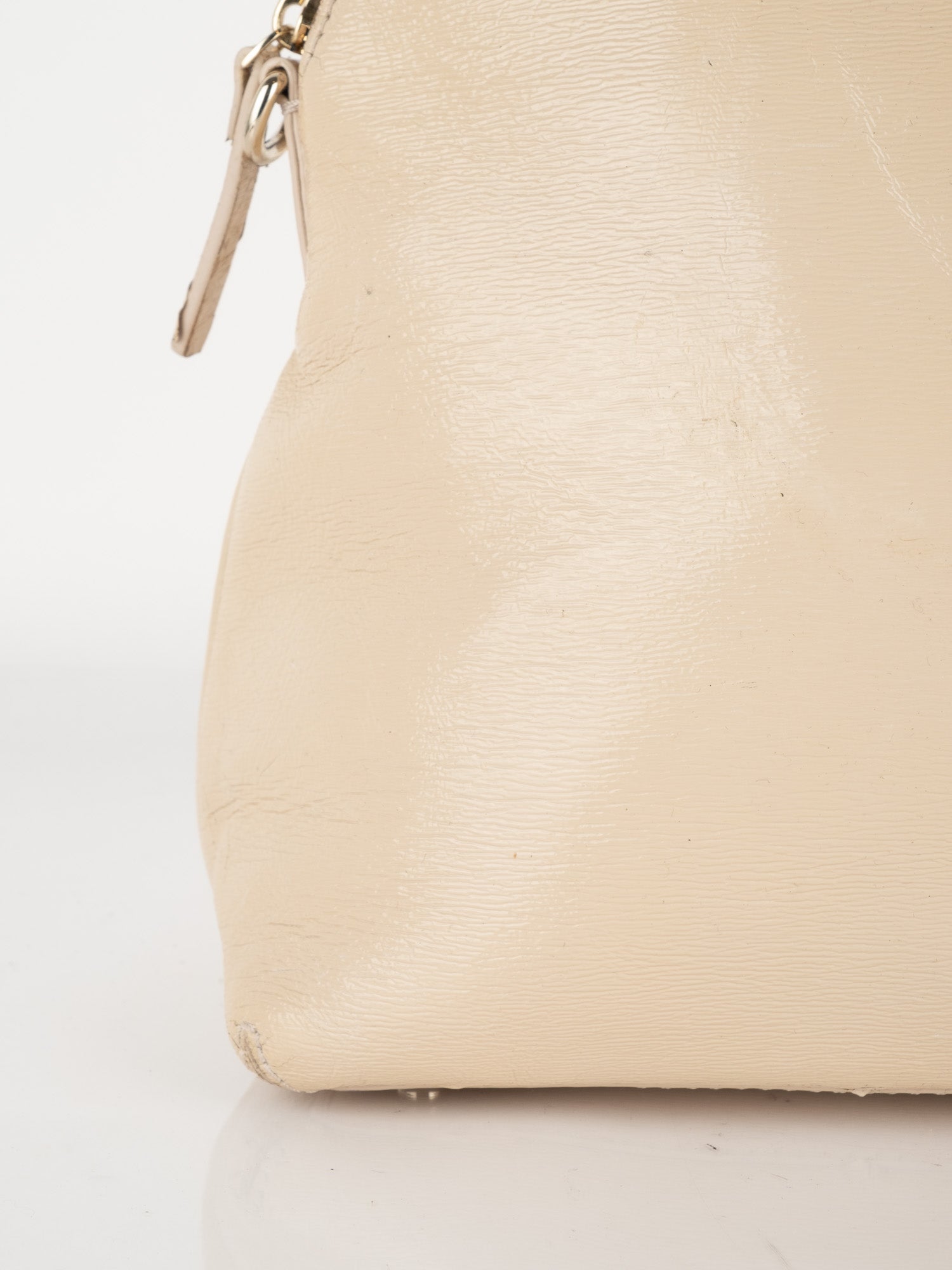 התיק עשוי עור לכה מבריק בגוון שנהב עם רצועות יד קצרות ורצועה נוספת מתכווננת לנשיאה על הכתף. תא מרכזי רחב עם בטנה ממותגת, סגירת רוכסן עליונה ותא פנימי קטן.