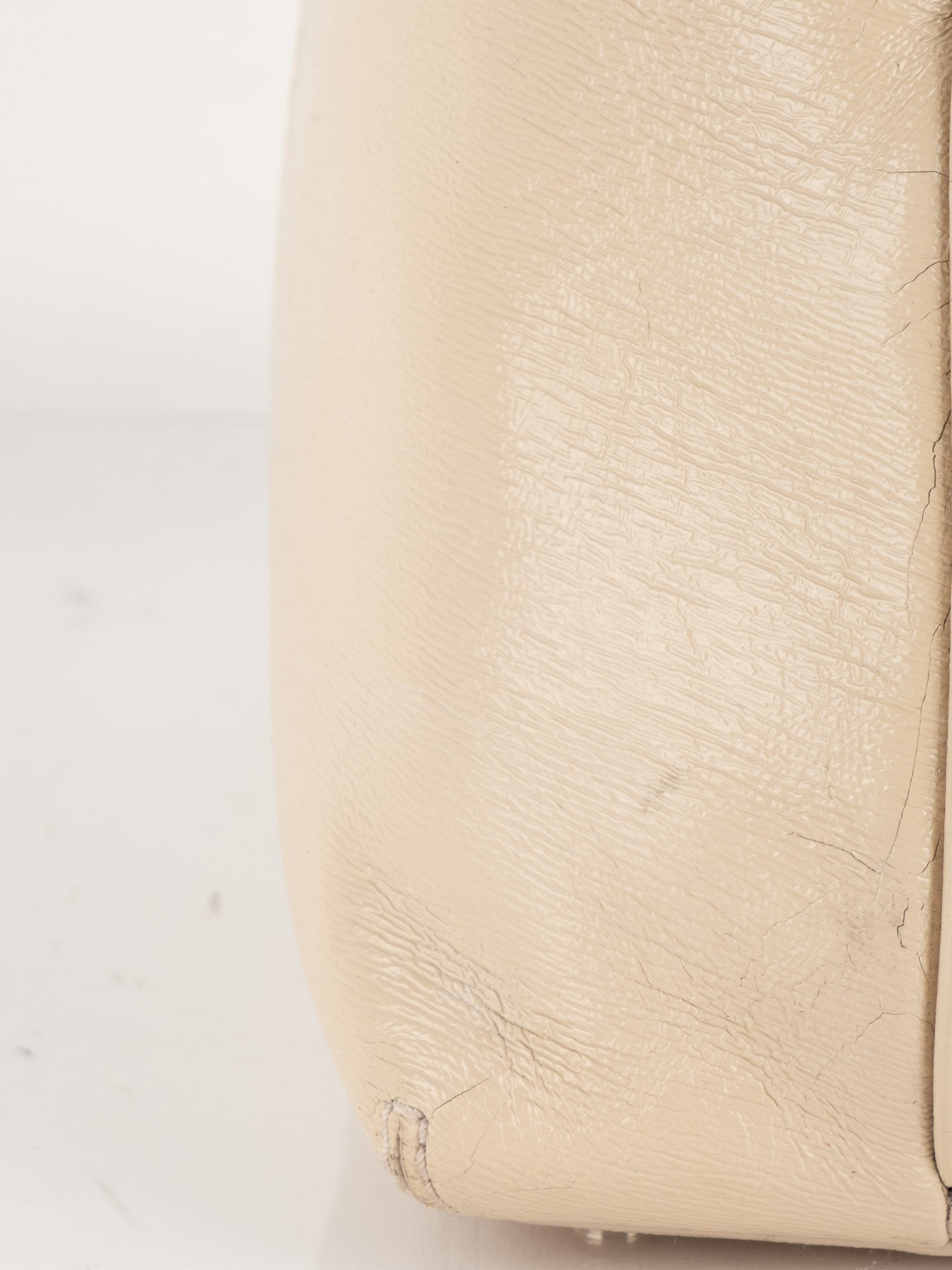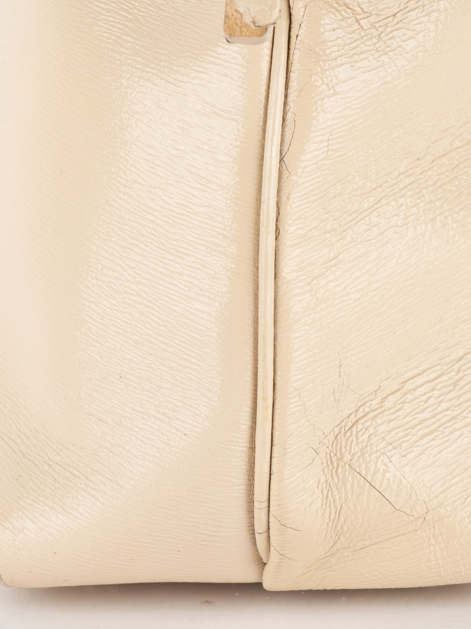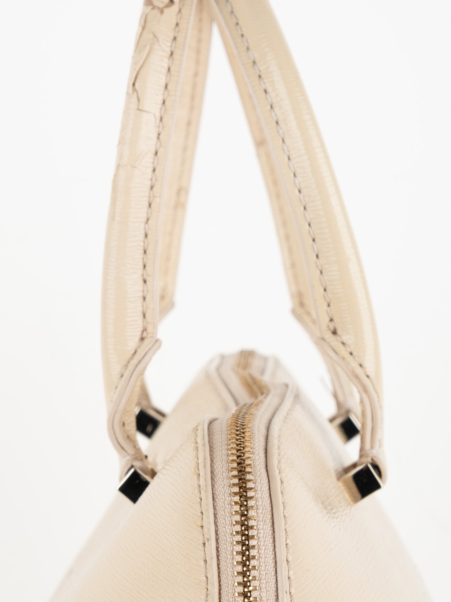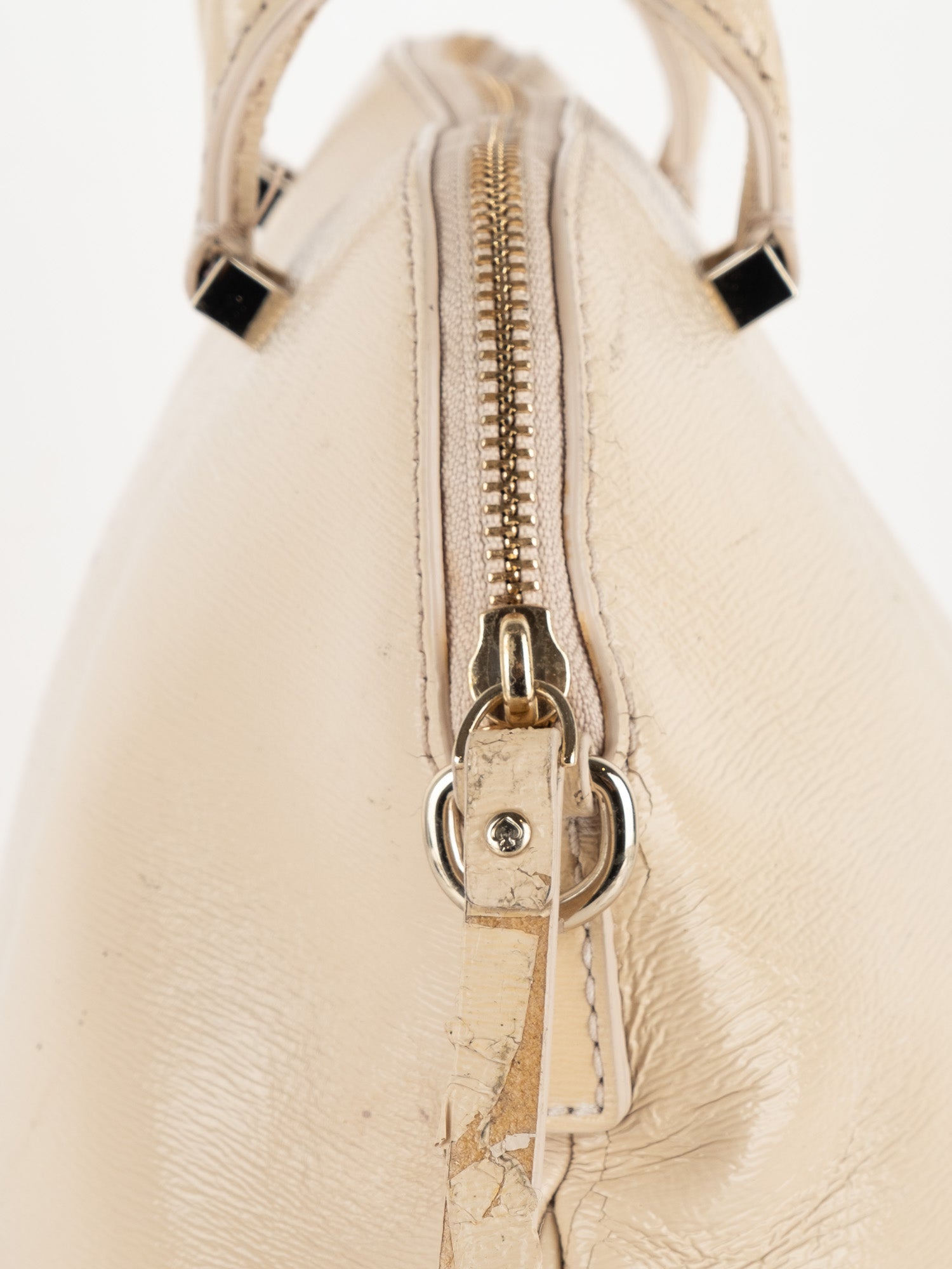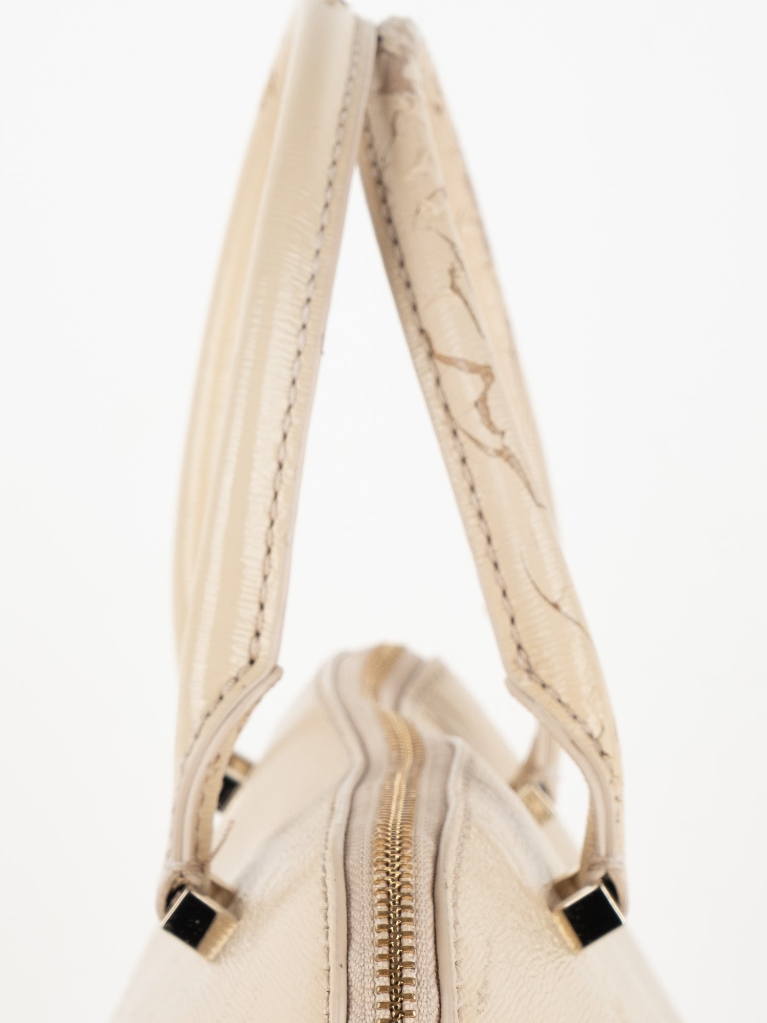 התיק עשוי עור לכה מבריק בגוון שנהב עם רצועות יד קצרות ורצועה נוספת מתכווננת לנשיאה על הכתף. תא מרכזי רחב עם בטנה ממותגת, סגירת רוכסן עליונה ותא פנימי קטן.
