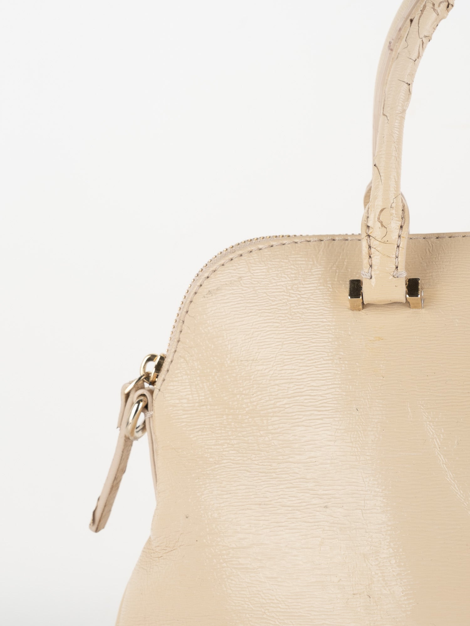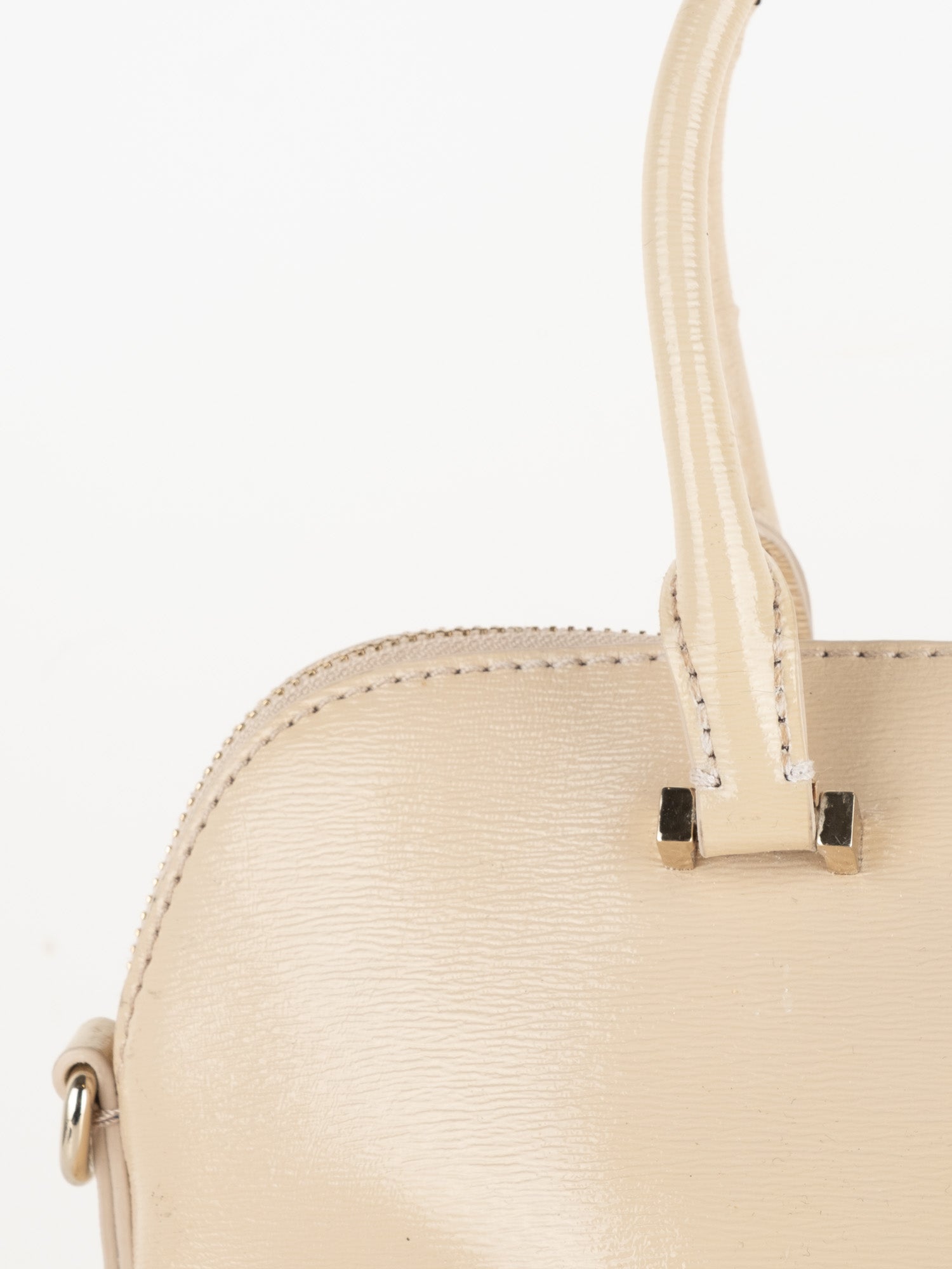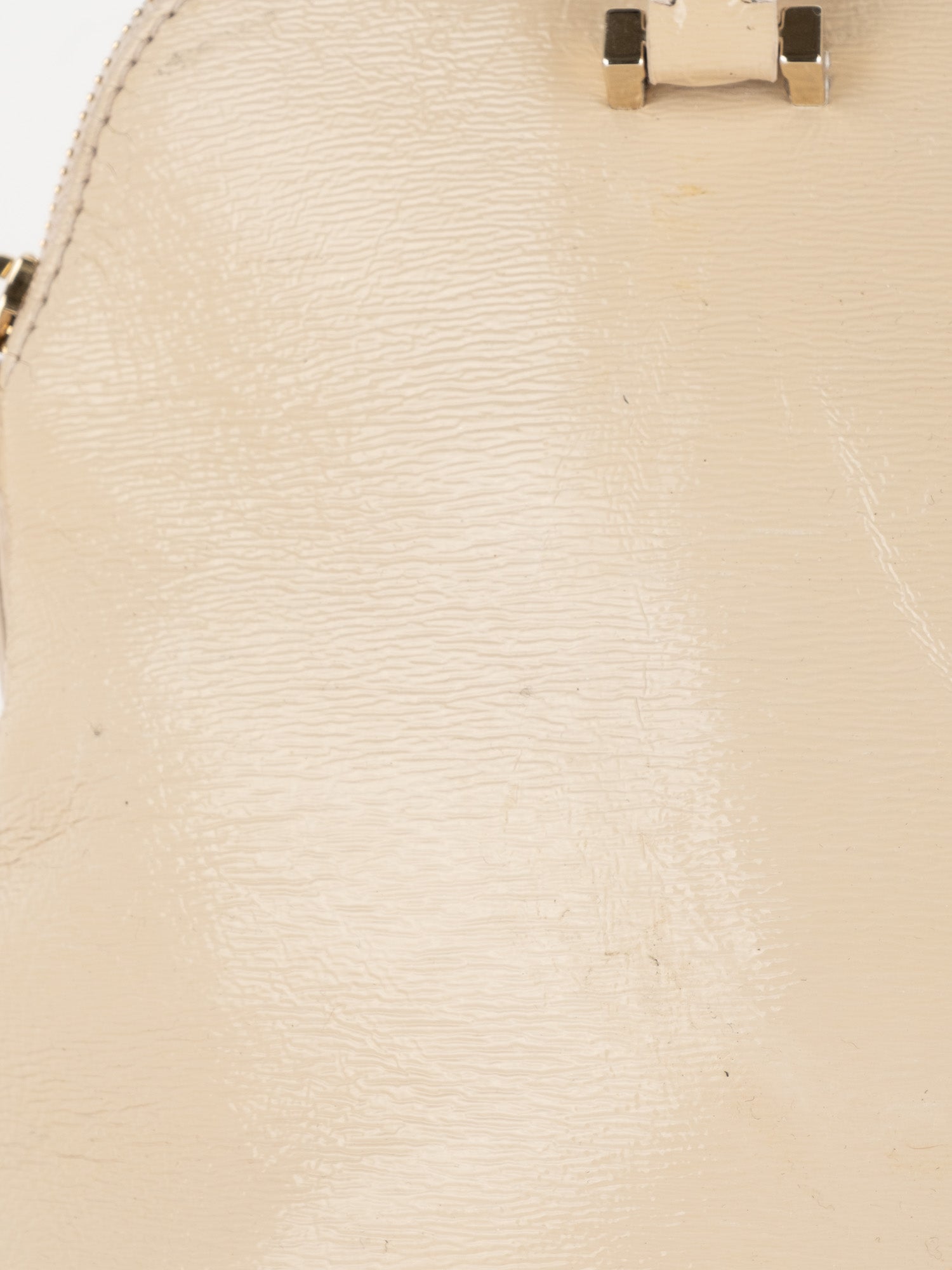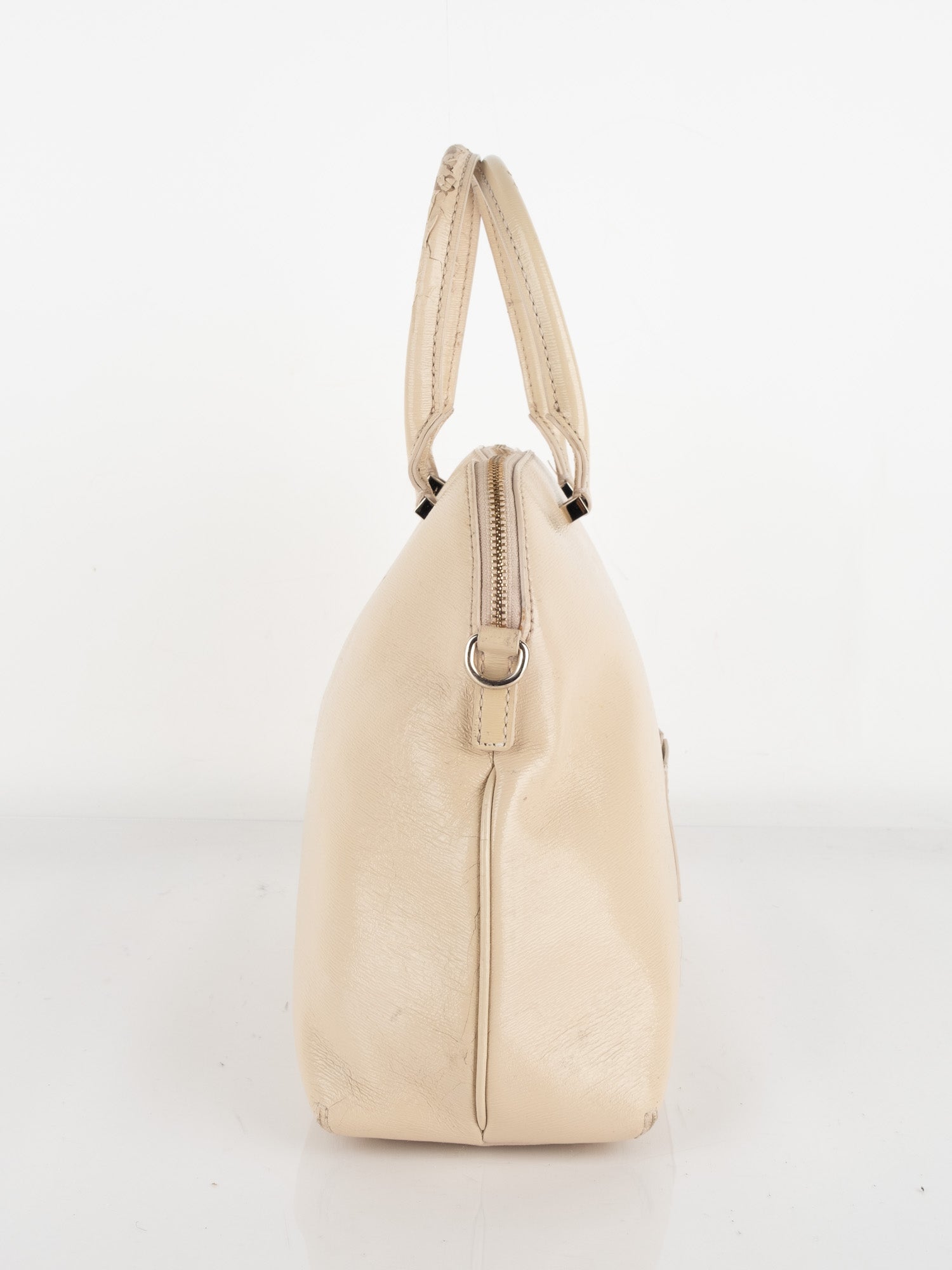 התיק עשוי עור לכה מבריק בגוון שנהב עם רצועות יד קצרות ורצועה נוספת מתכווננת לנשיאה על הכתף. תא מרכזי רחב עם בטנה ממותגת, סגירת רוכסן עליונה ותא פנימי קטן.