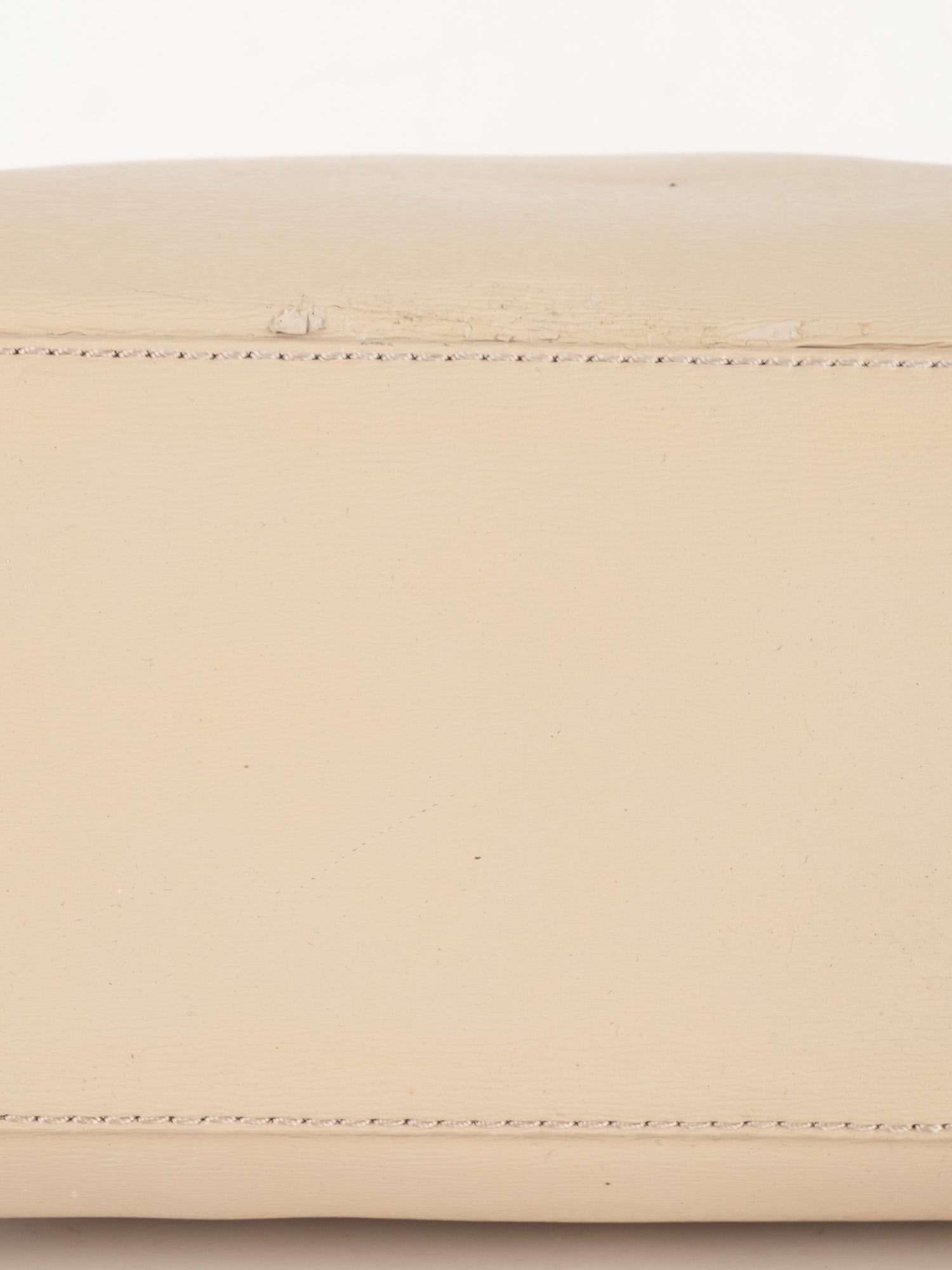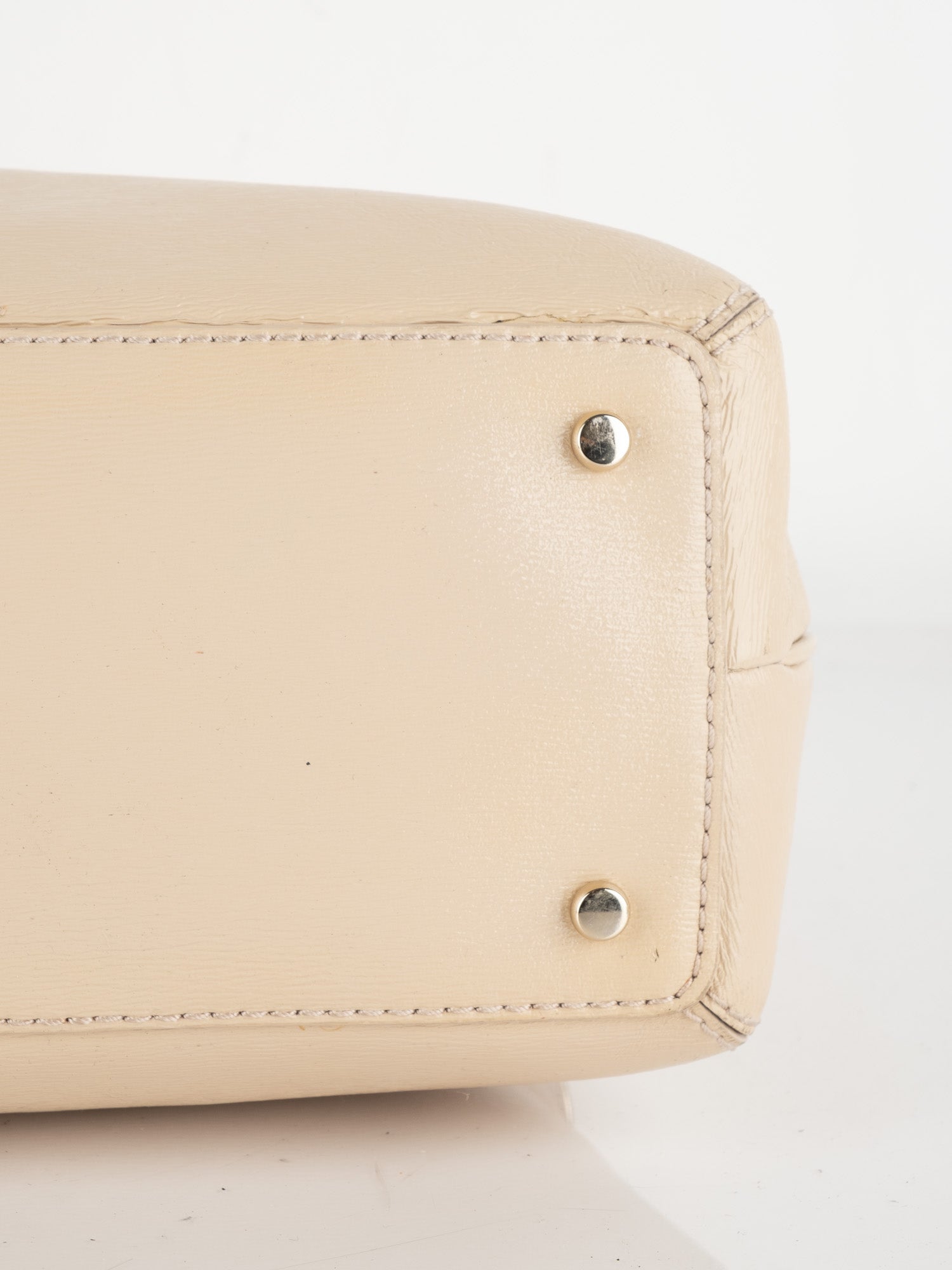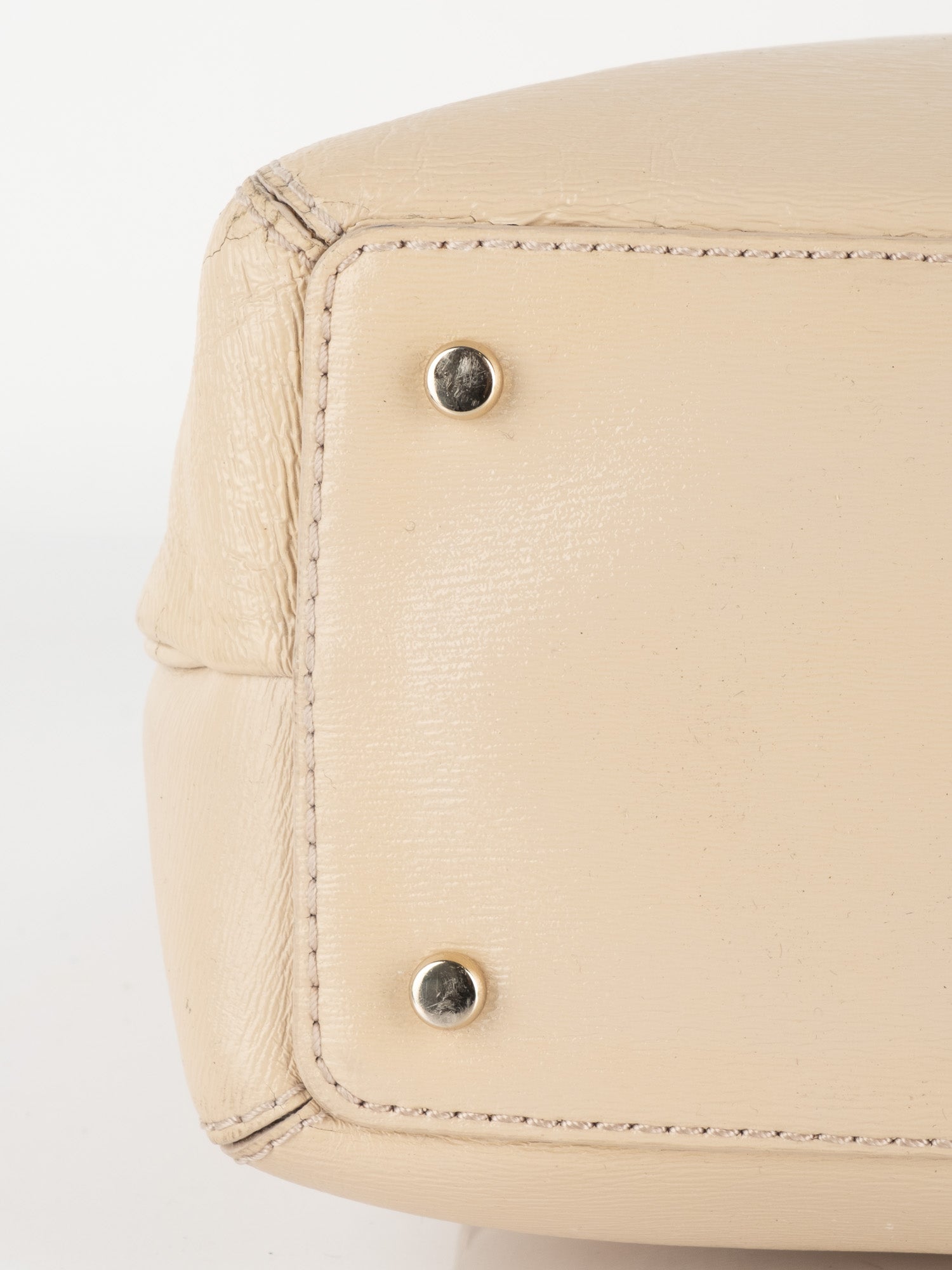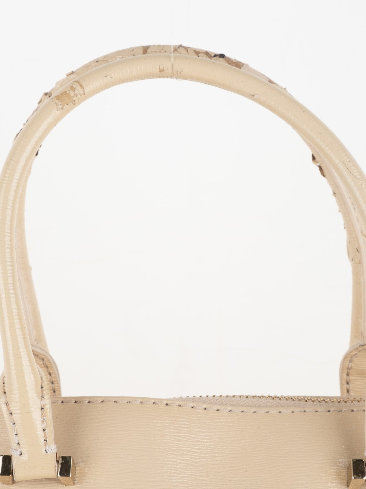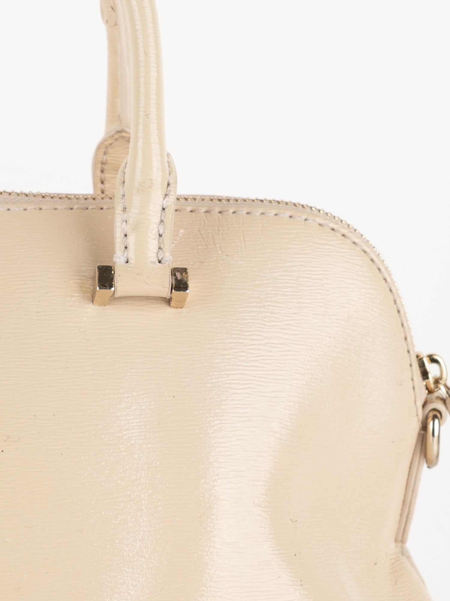 התיק עשוי עור לכה מבריק בגוון שנהב עם רצועות יד קצרות ורצועה נוספת מתכווננת לנשיאה על הכתף. תא מרכזי רחב עם בטנה ממותגת, סגירת רוכסן עליונה ותא פנימי קטן.
