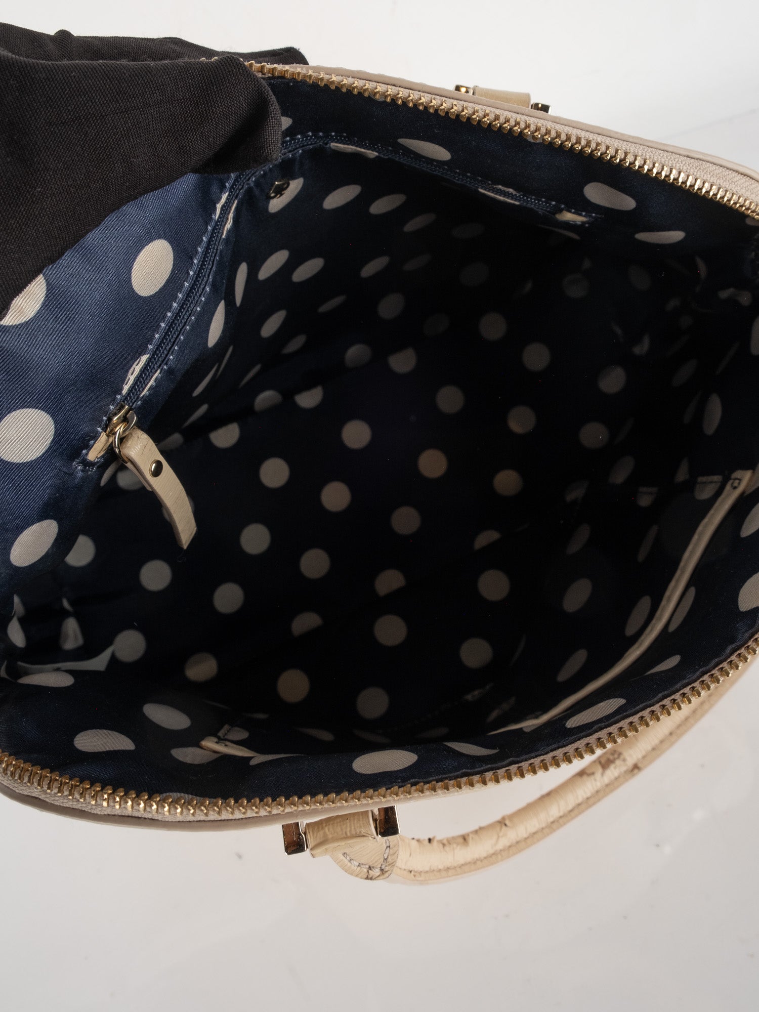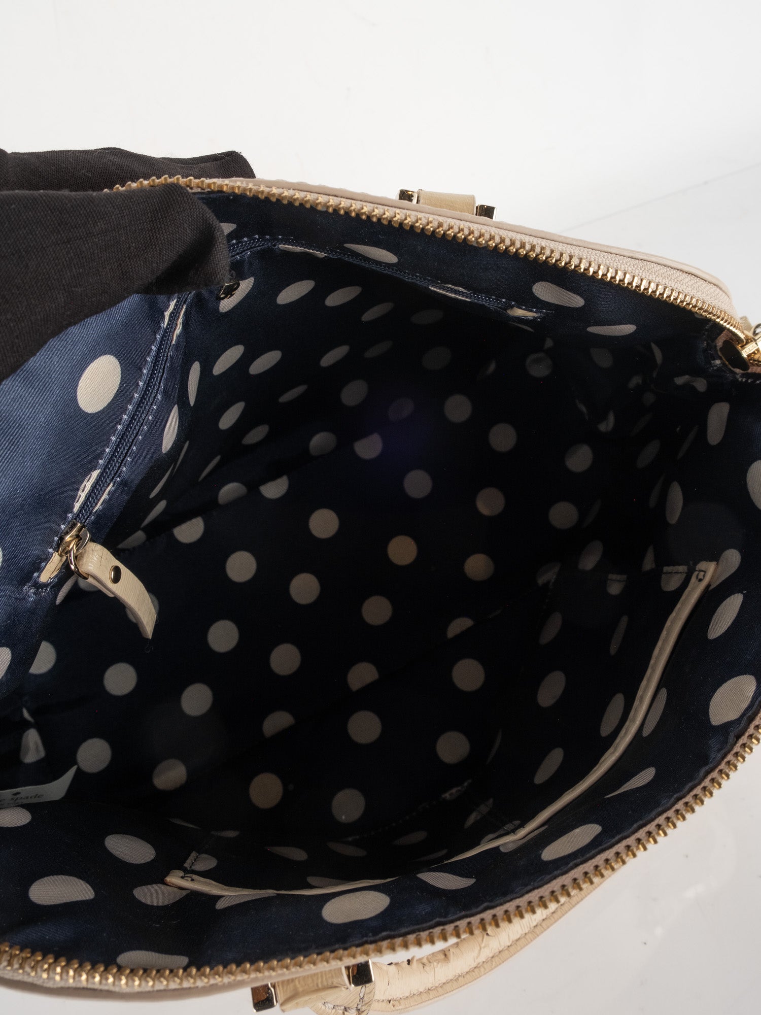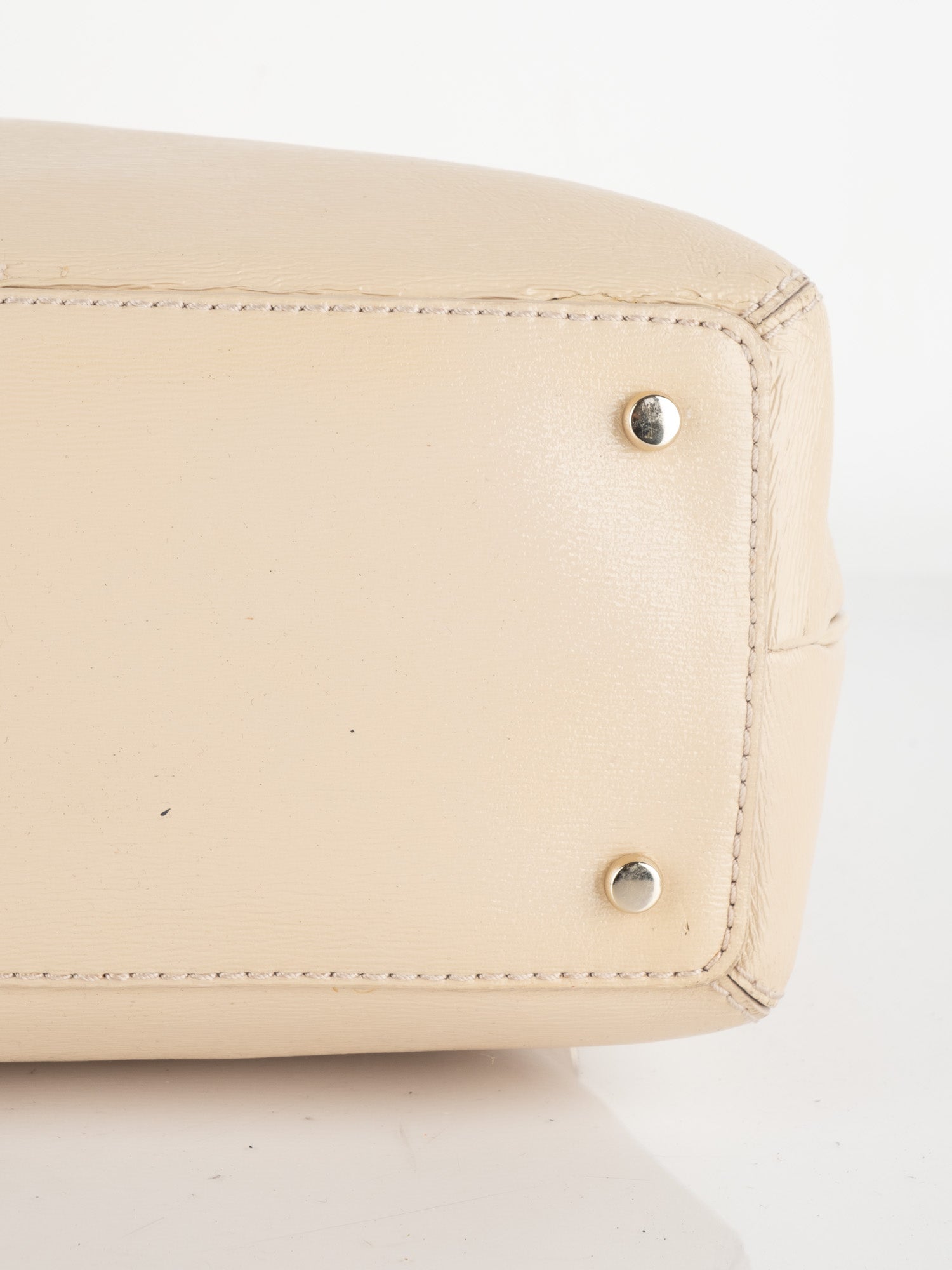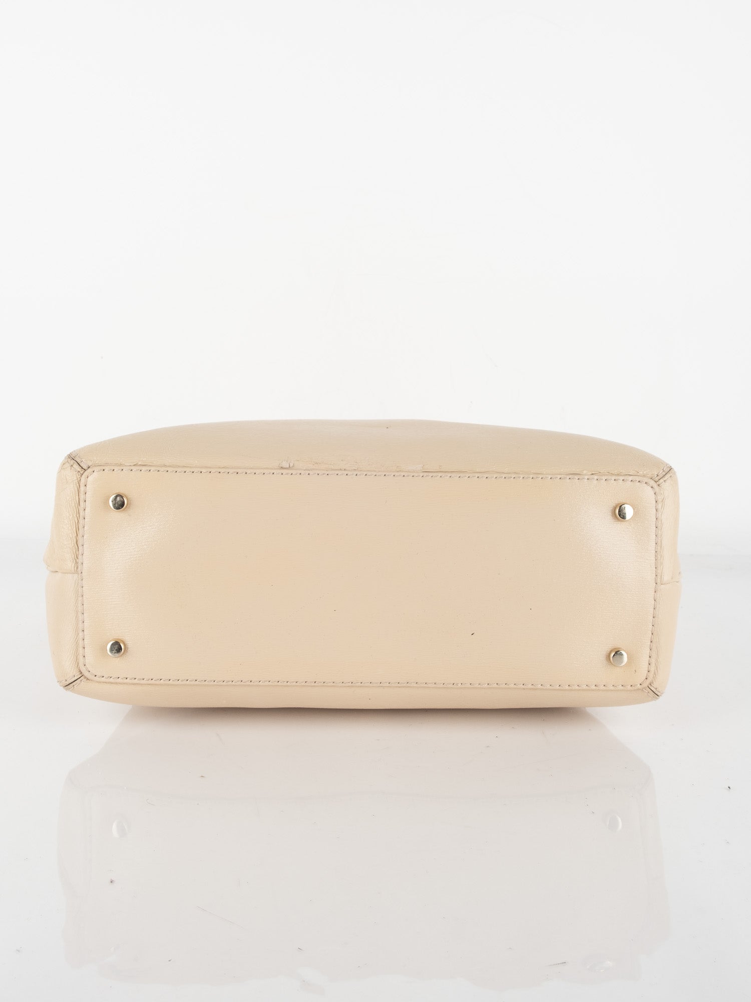 התיק עשוי עור לכה מבריק בגוון שנהב עם רצועות יד קצרות ורצועה נוספת מתכווננת לנשיאה על הכתף. תא מרכזי רחב עם בטנה ממותגת, סגירת רוכסן עליונה ותא פנימי קטן.