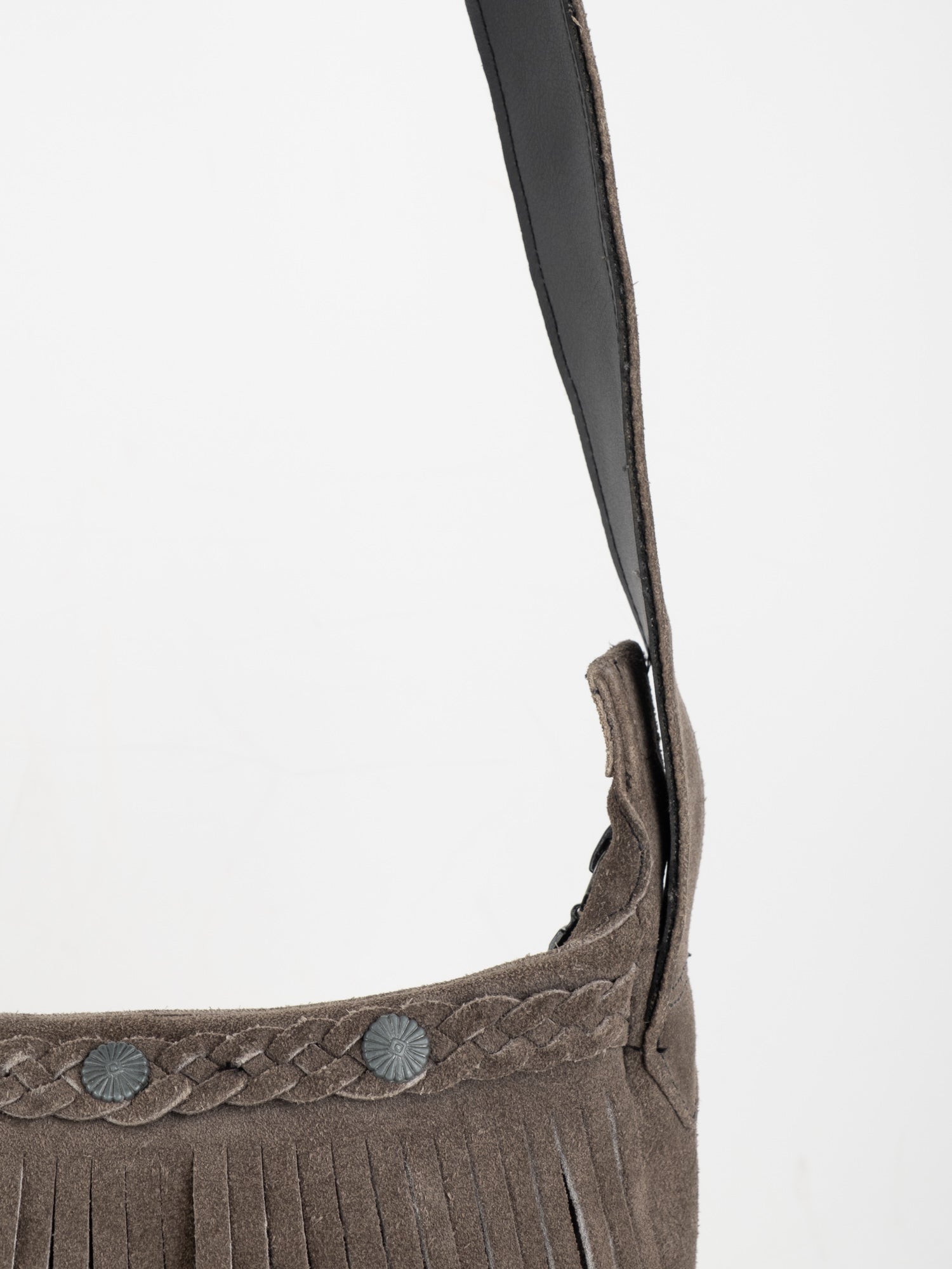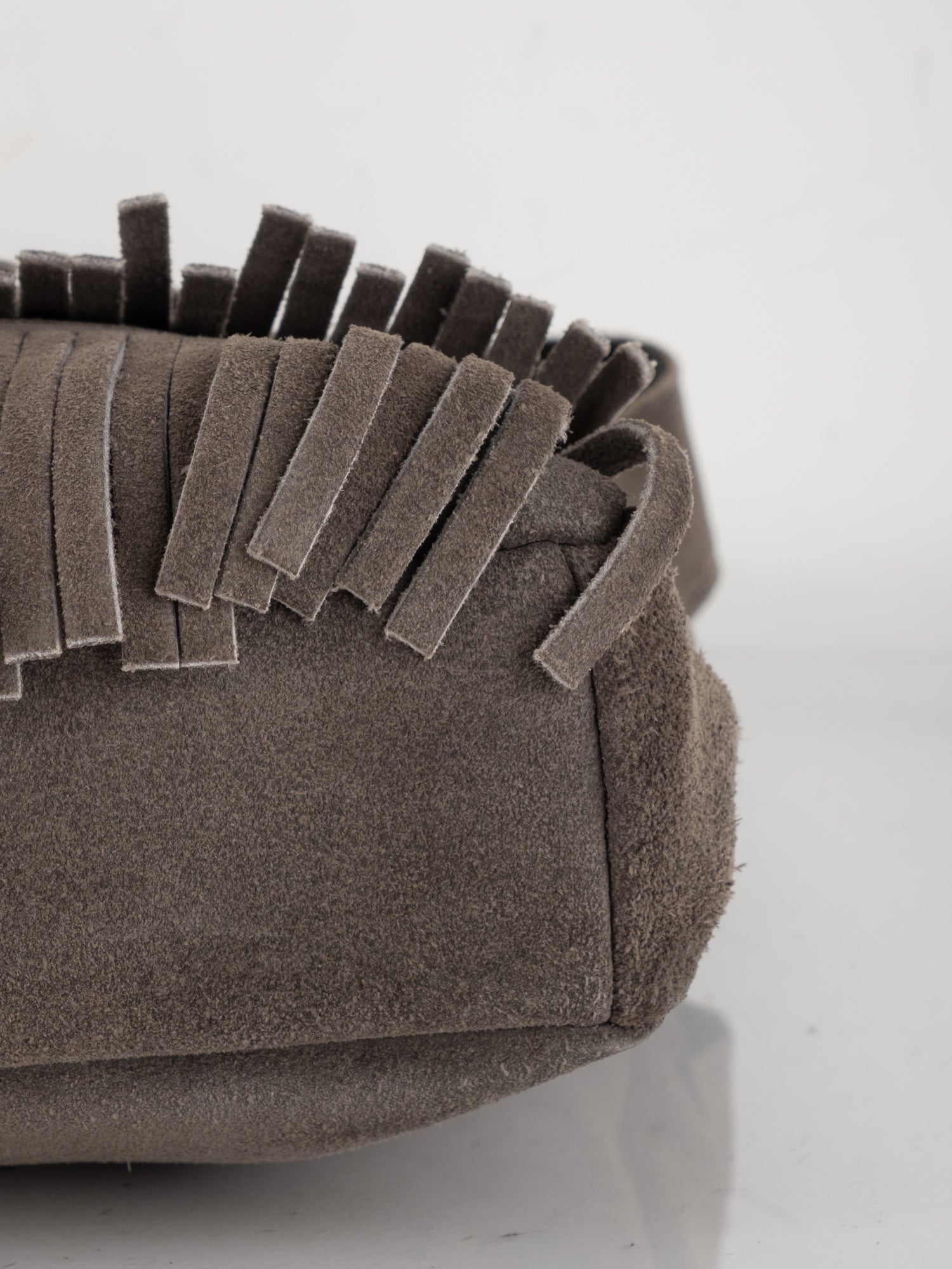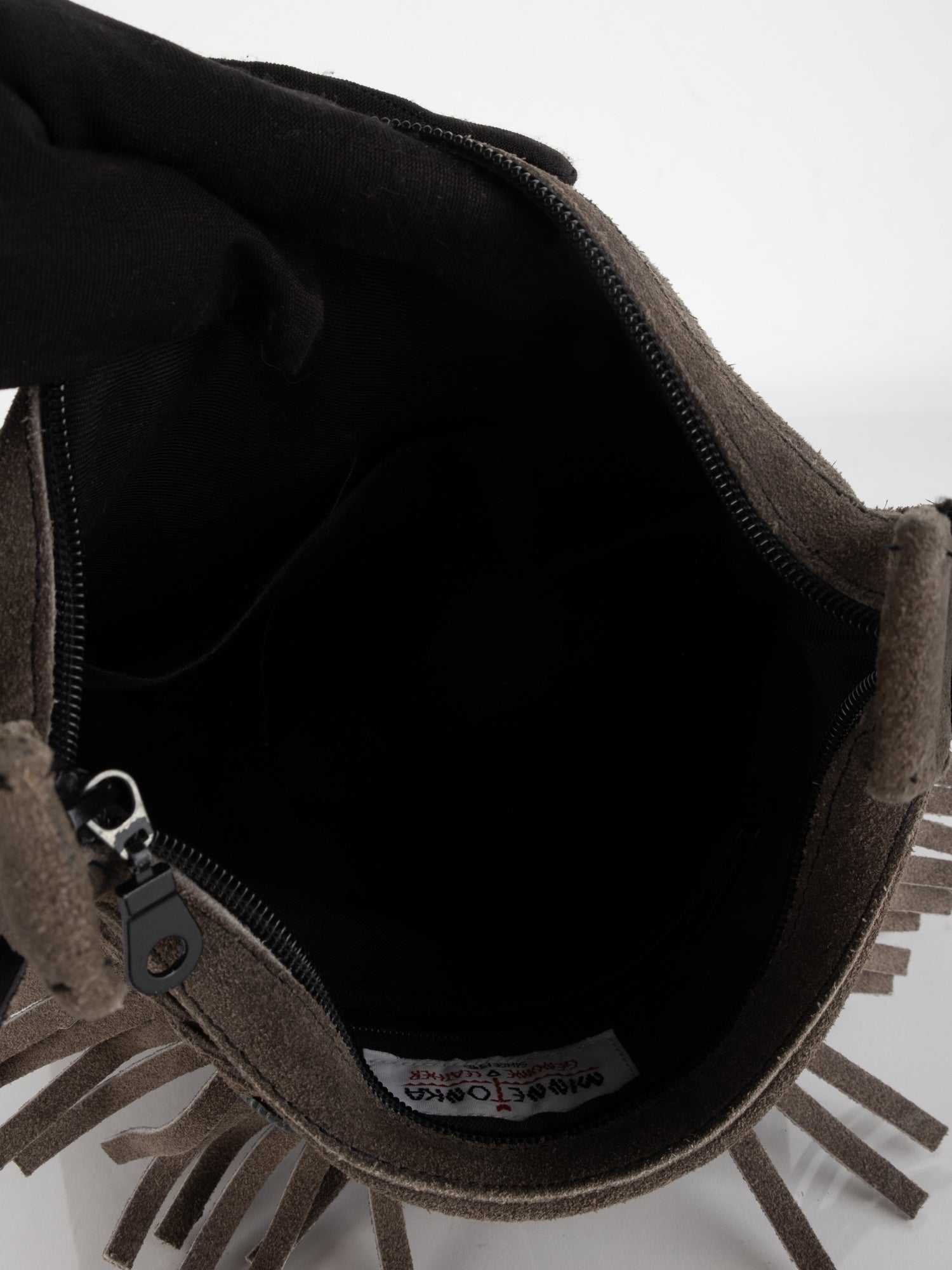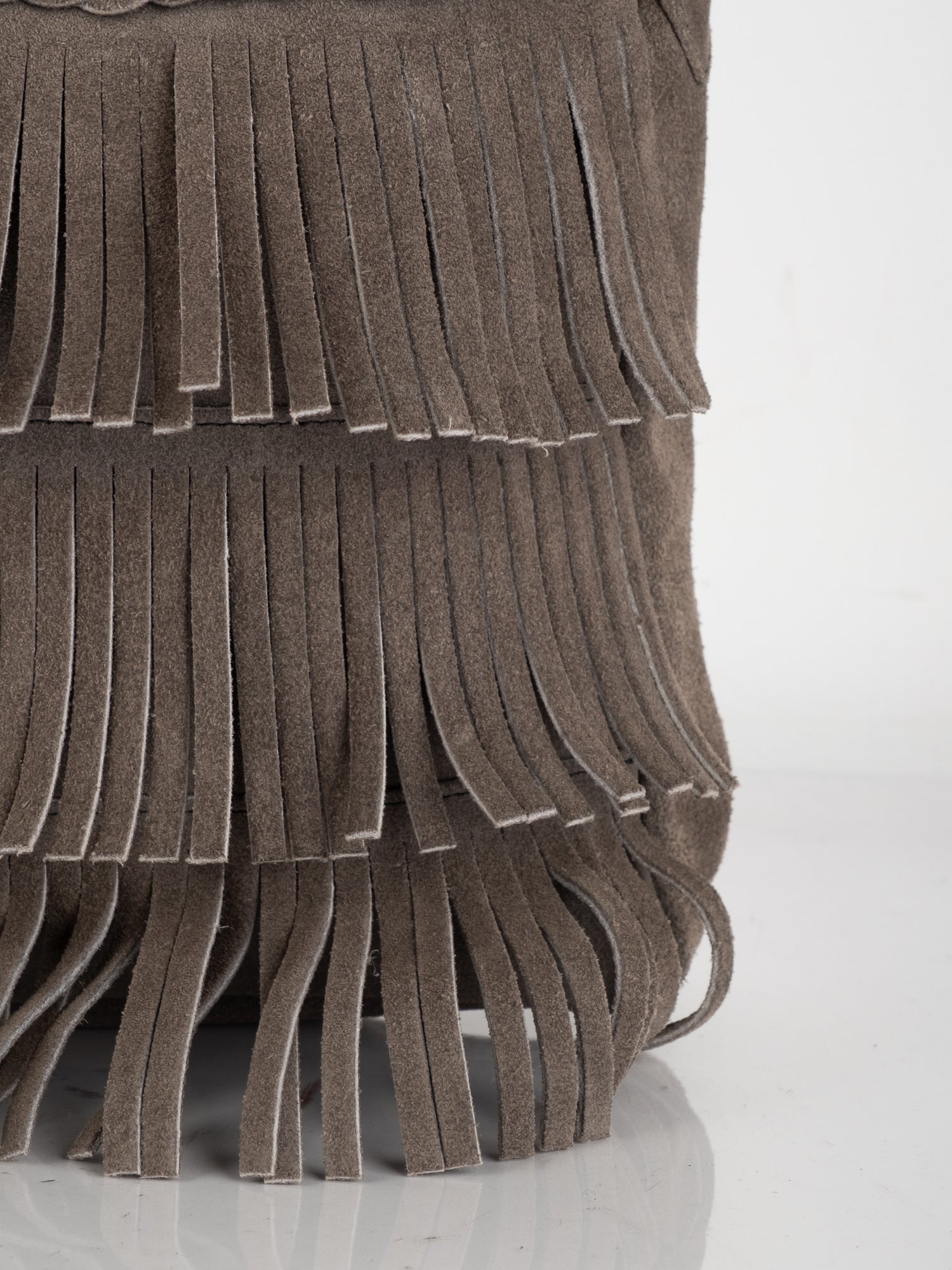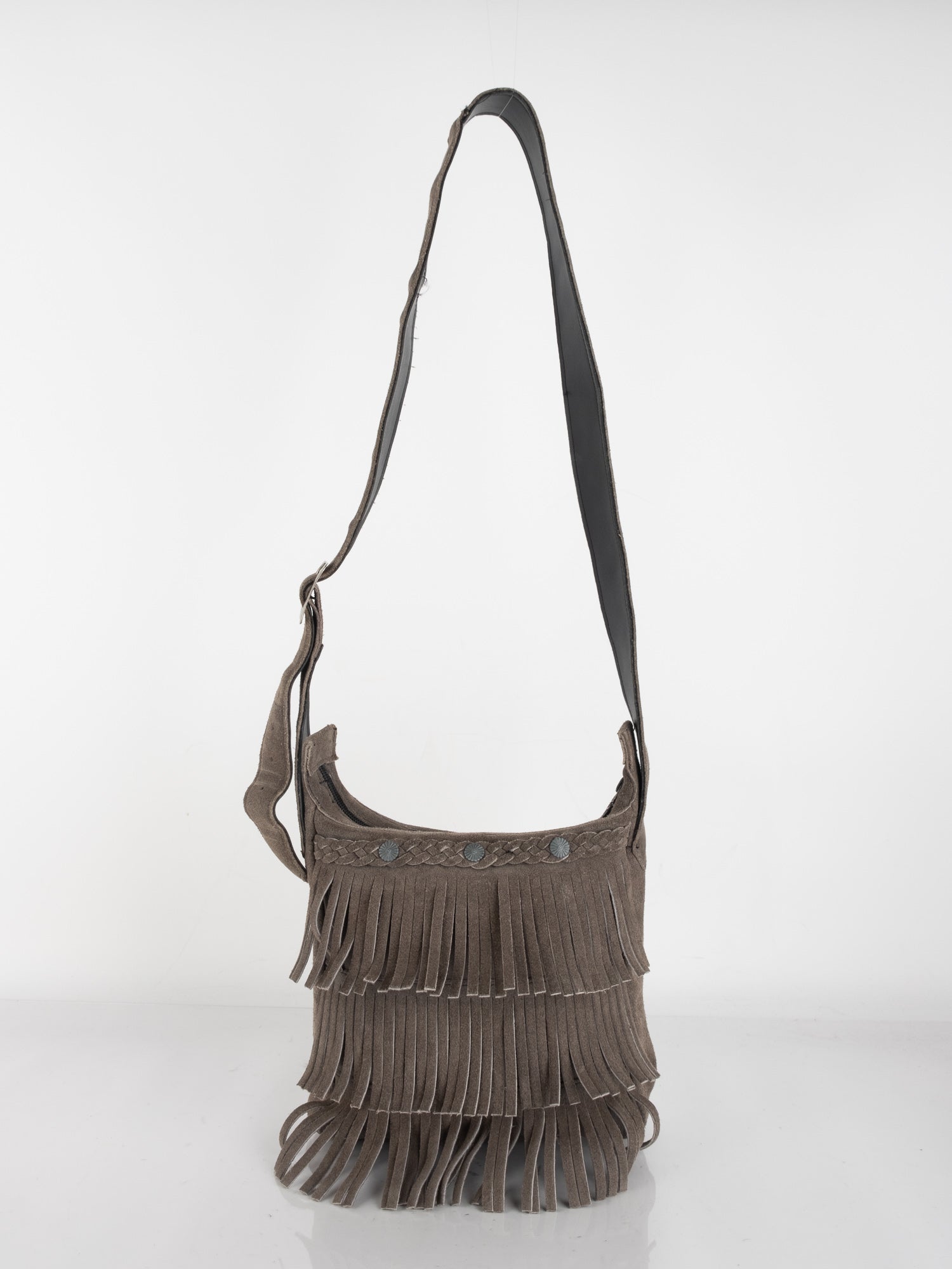 התיק עשוי זמש טבעי עם שכבות פרנזים קדמיות, רצועת כתף ארוכה ורוכסן עליון.