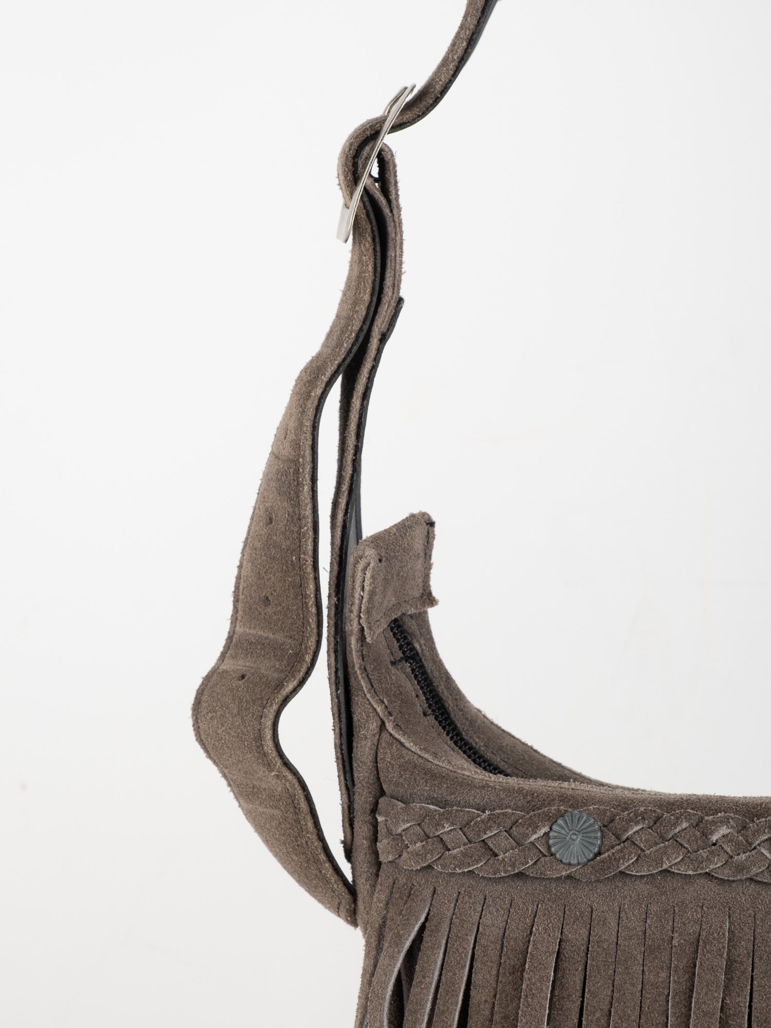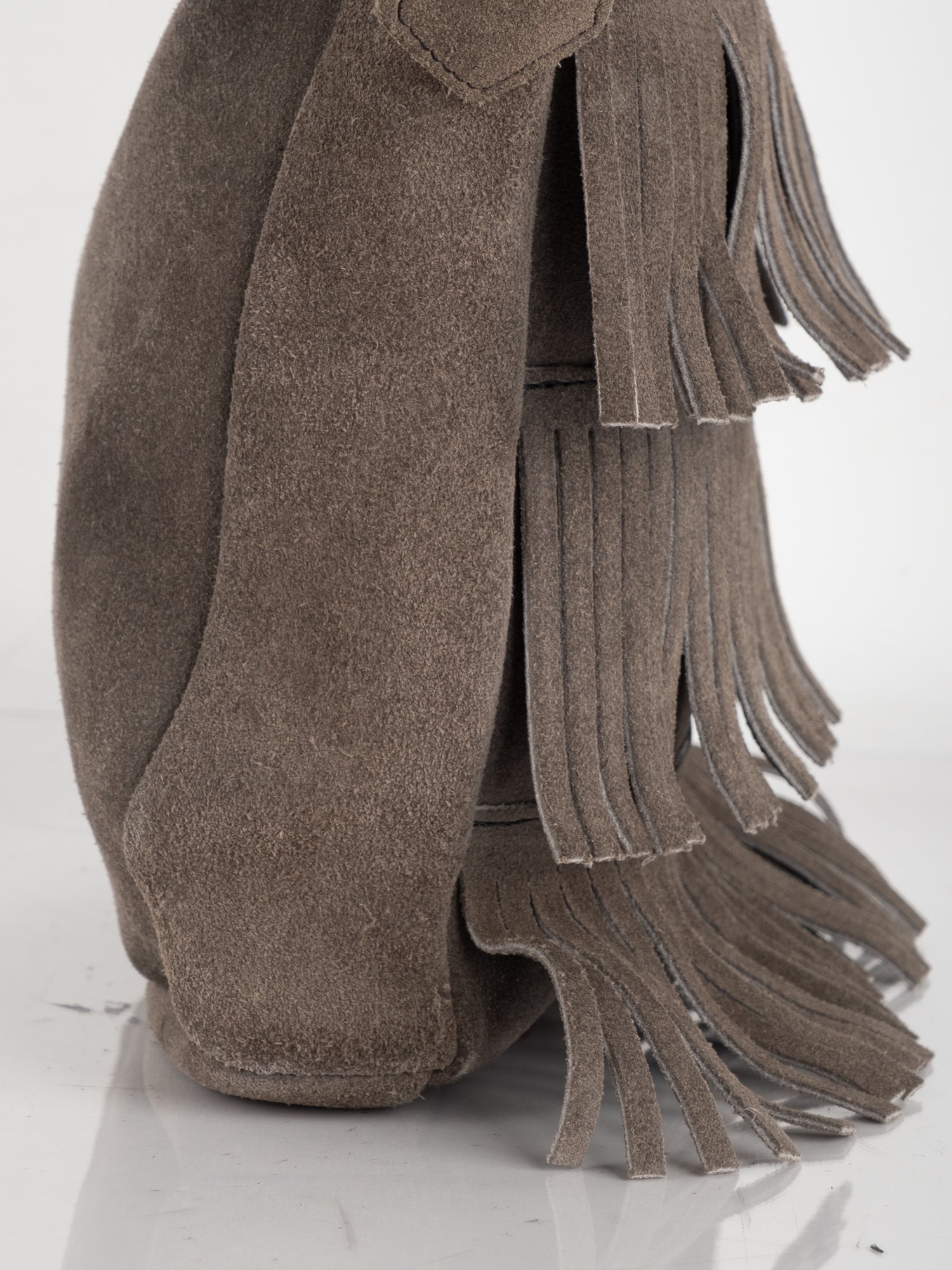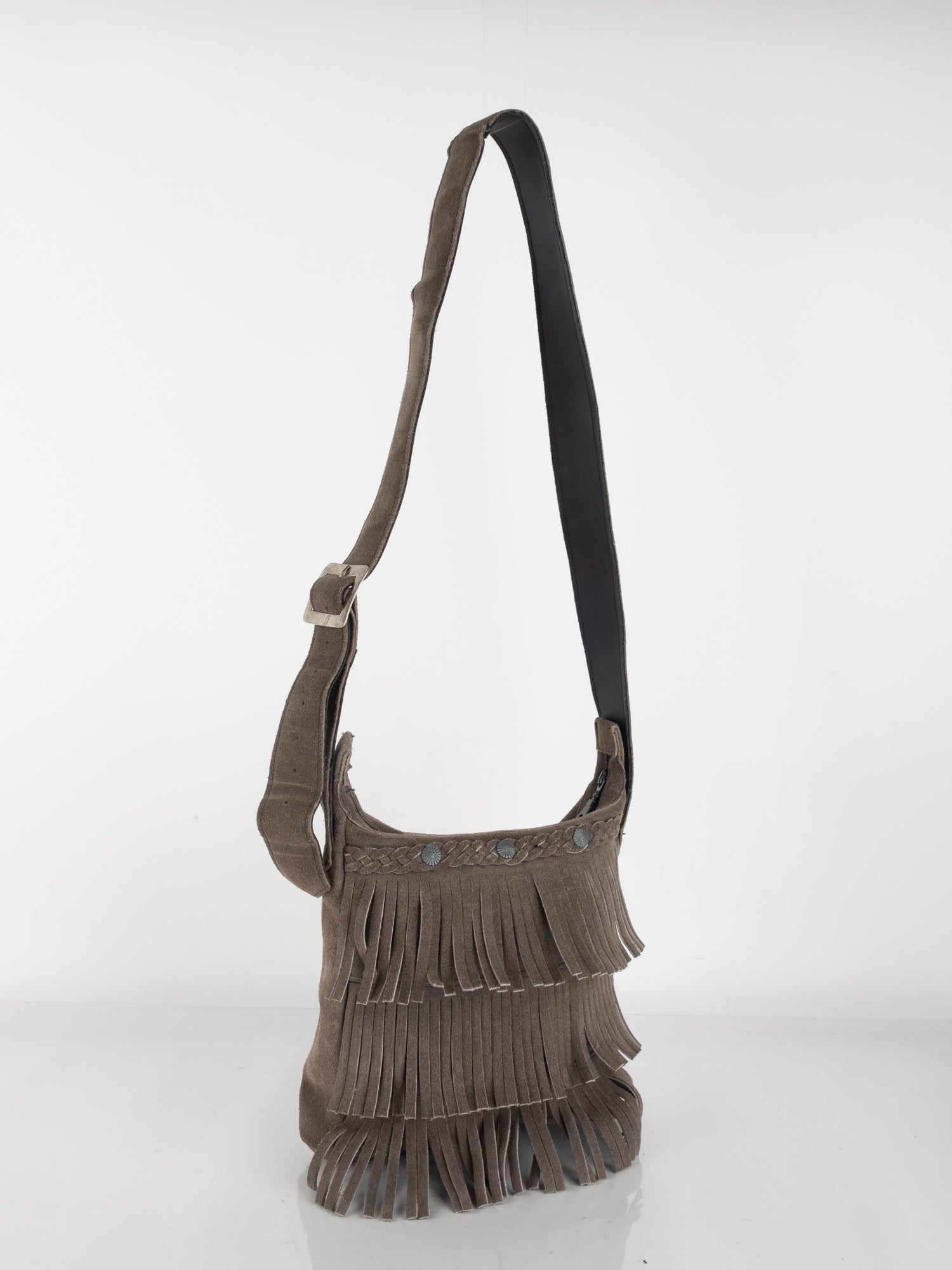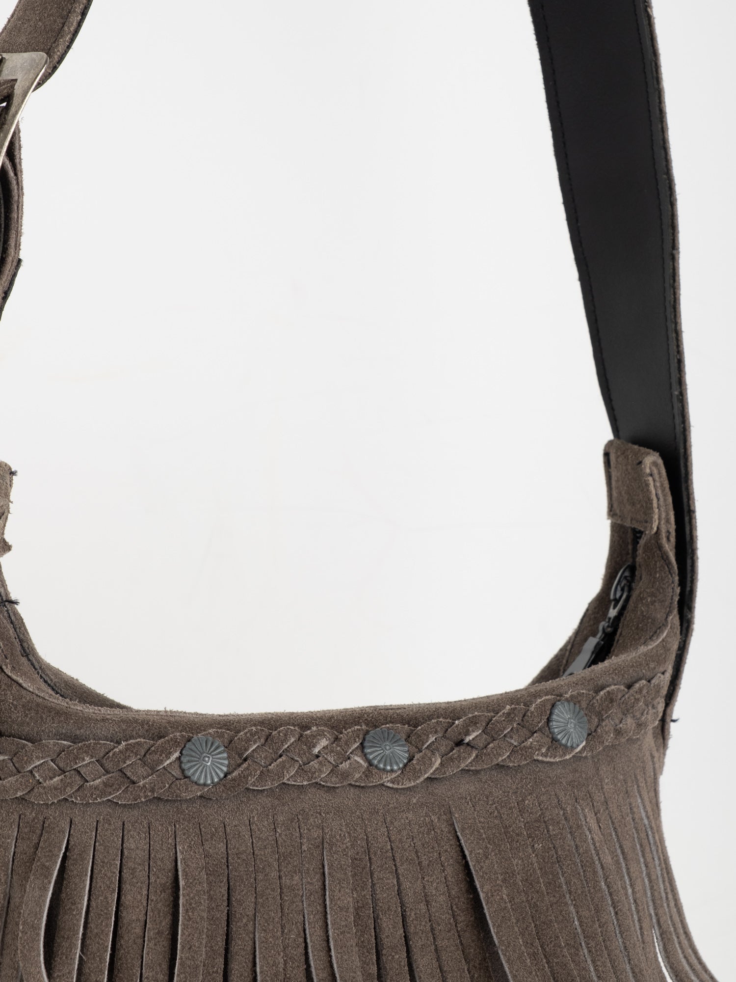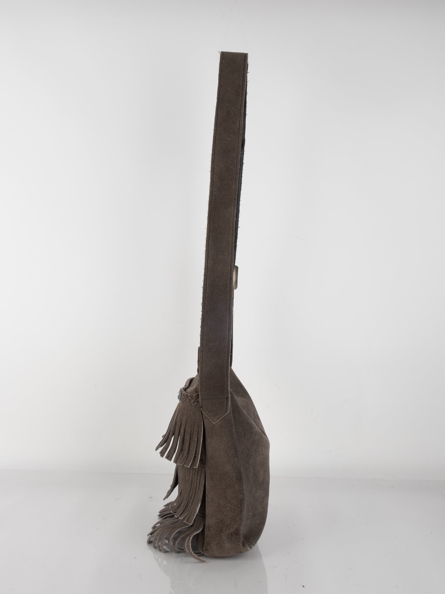התיק עשוי זמש טבעי עם שכבות פרנזים קדמיות, רצועת כתף ארוכה ורוכסן עליון.