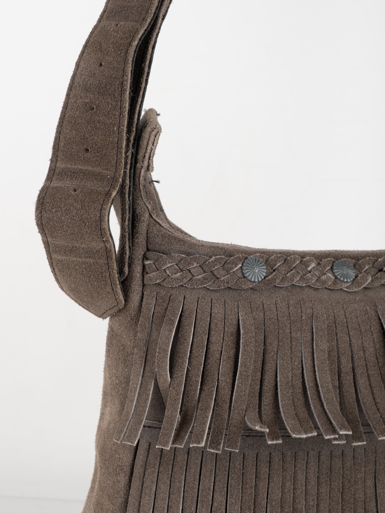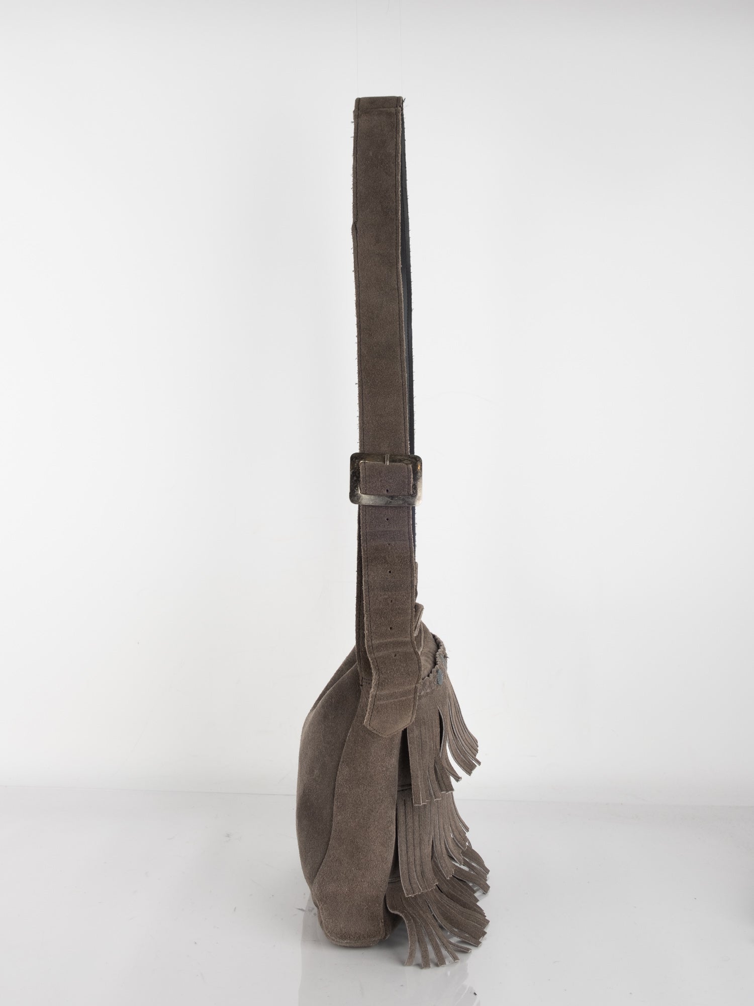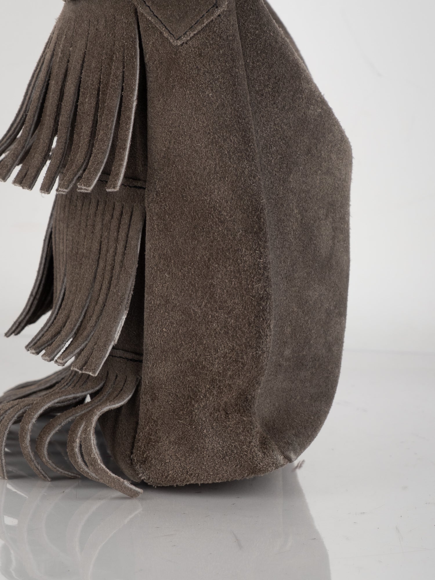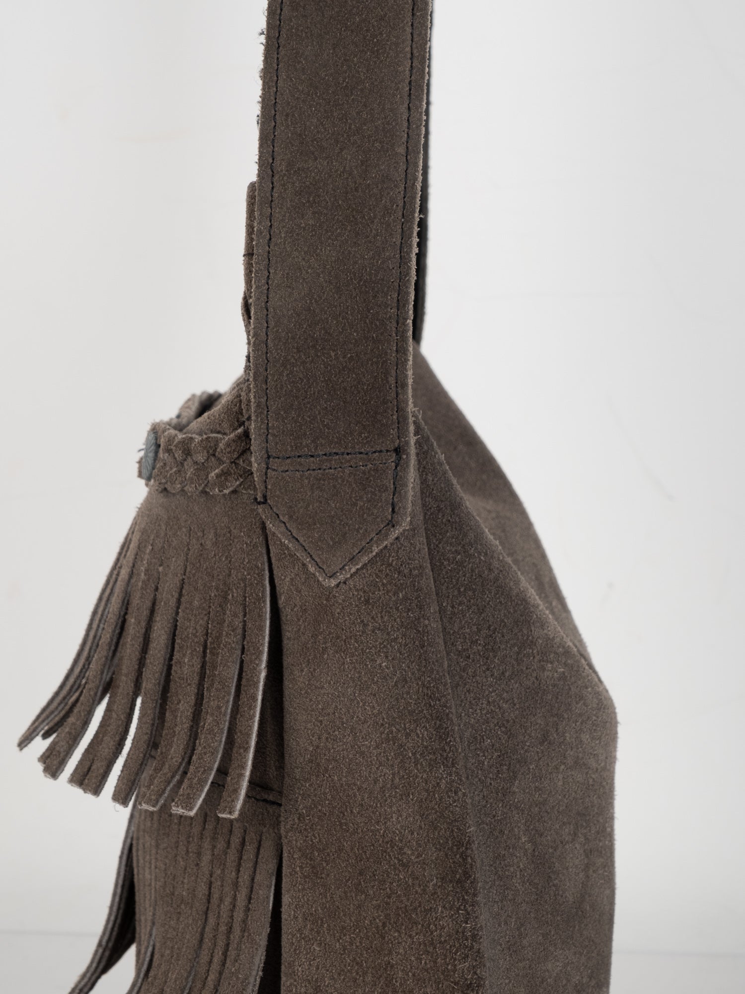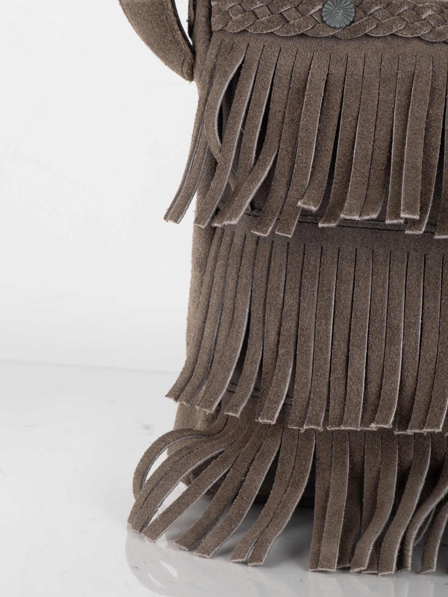 התיק עשוי זמש טבעי עם שכבות פרנזים קדמיות, רצועת כתף ארוכה ורוכסן עליון.