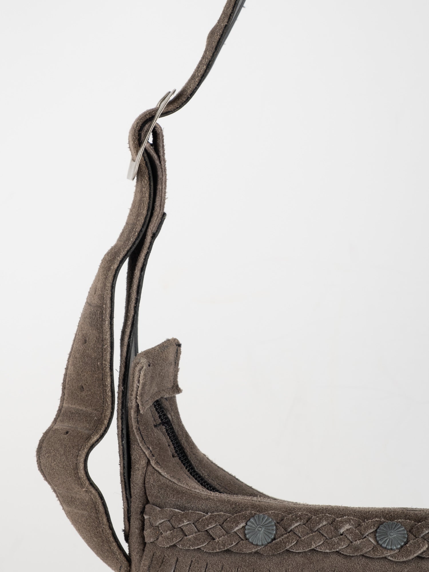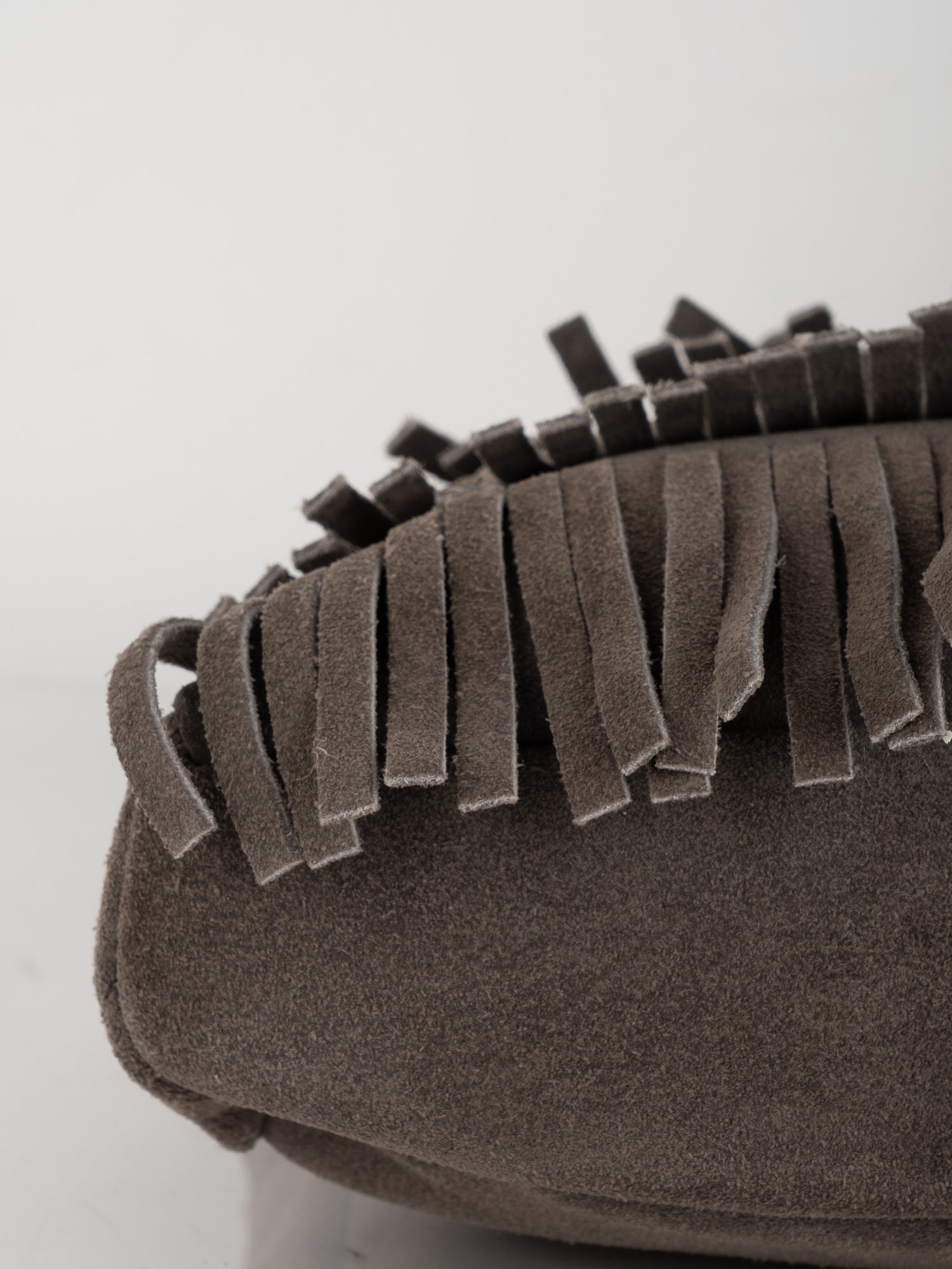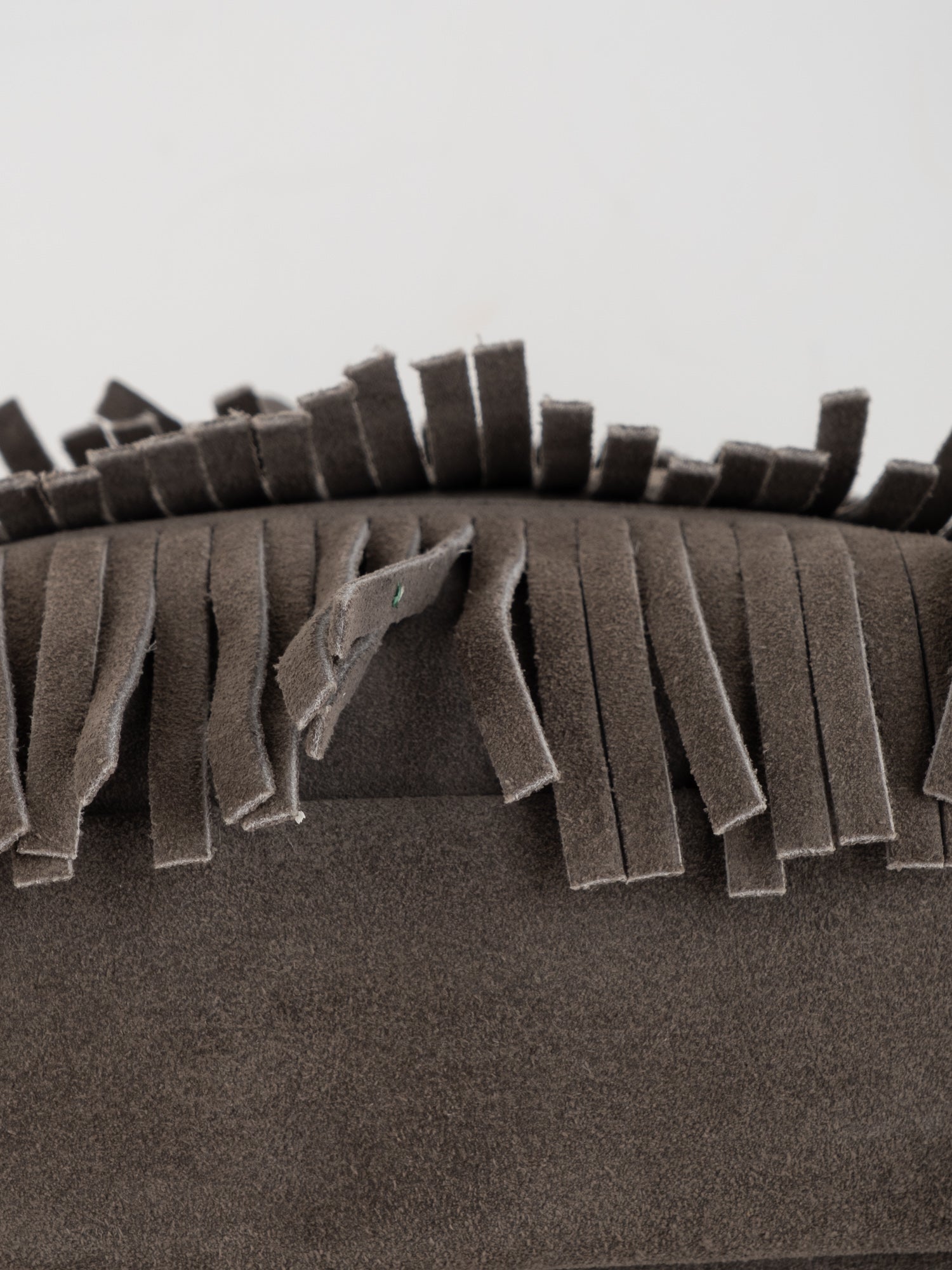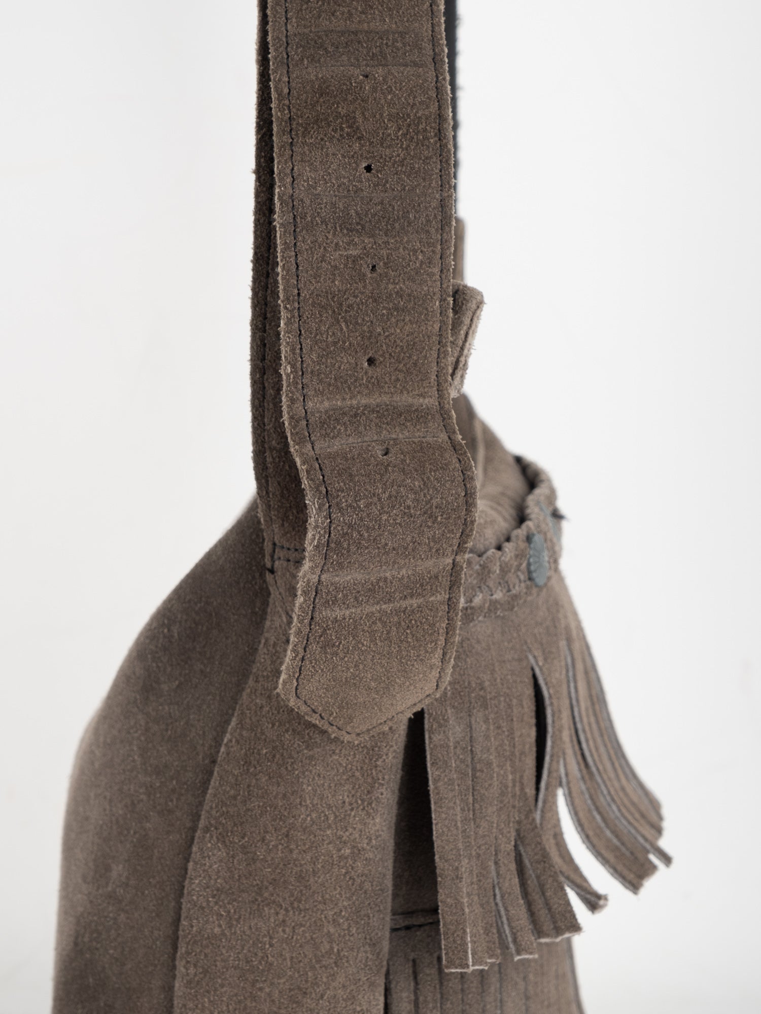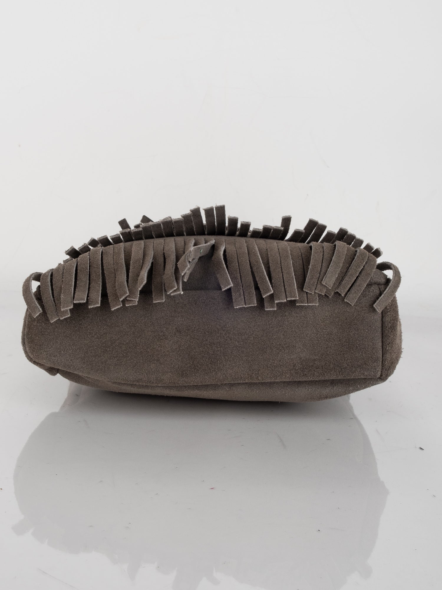 התיק עשוי זמש טבעי עם שכבות פרנזים קדמיות, רצועת כתף ארוכה ורוכסן עליון.