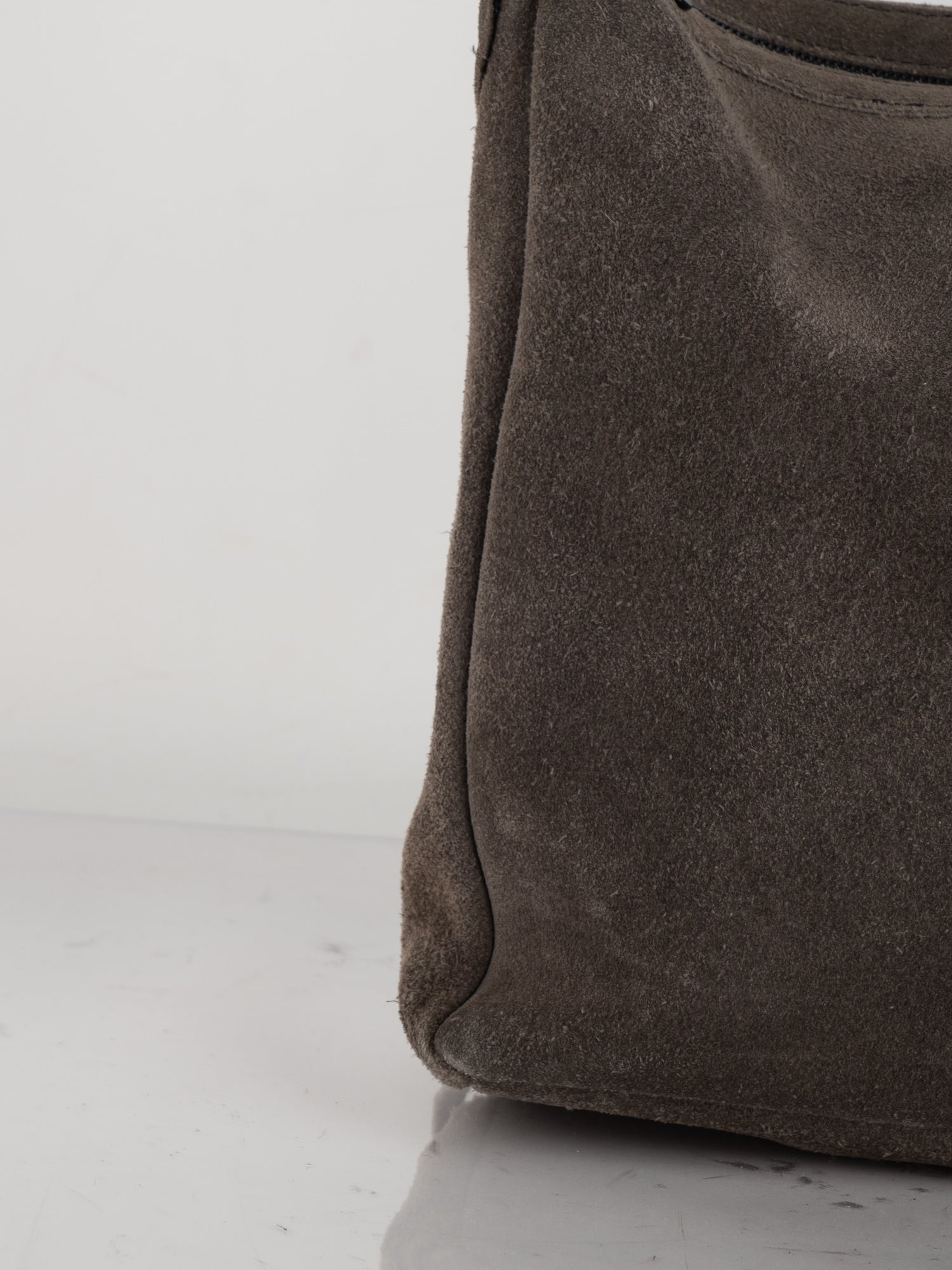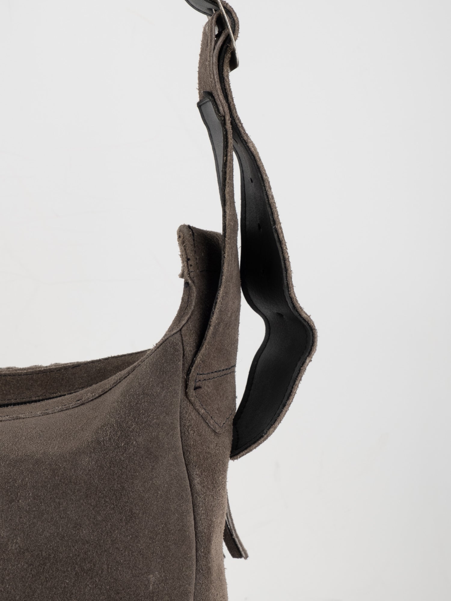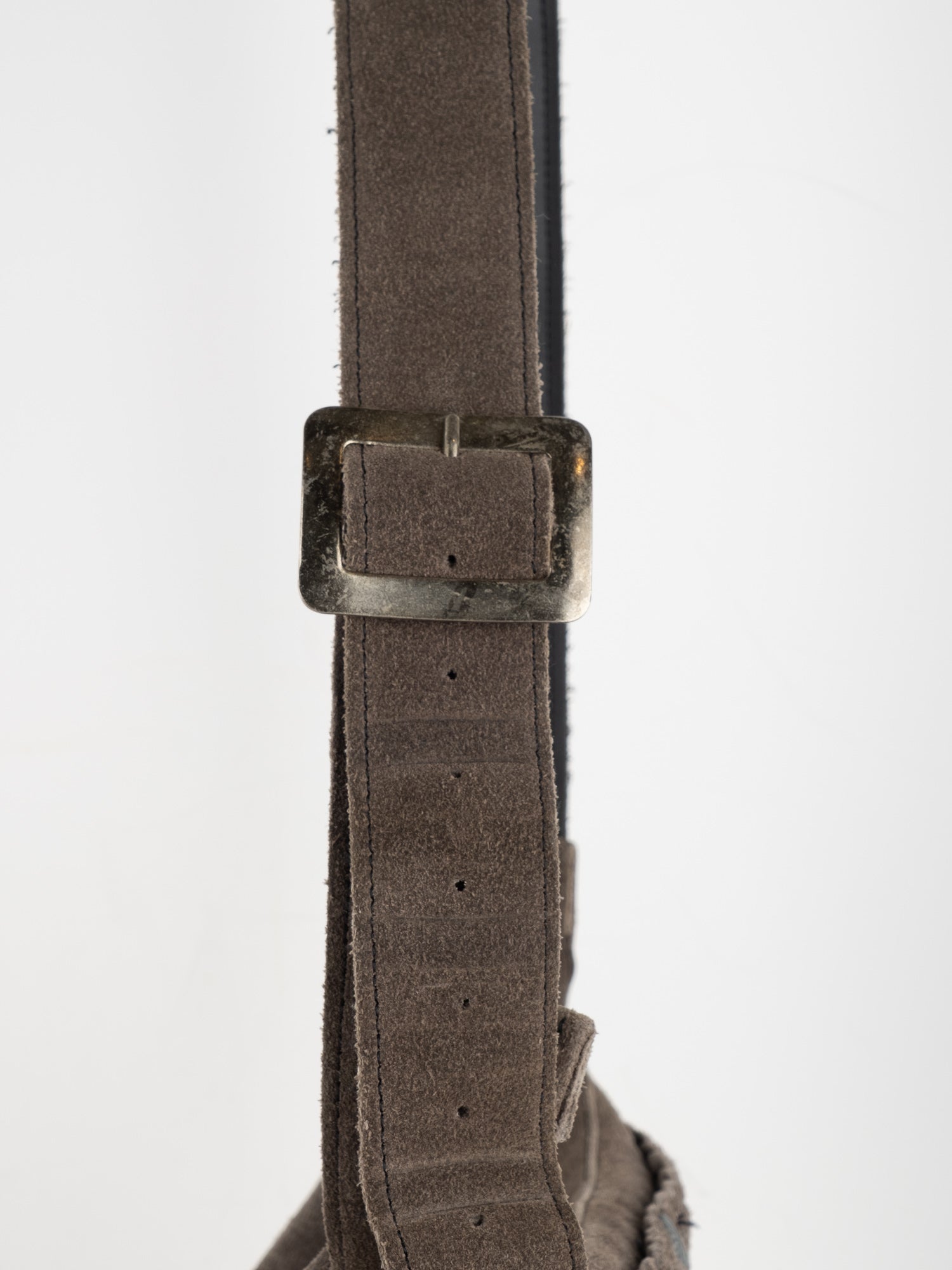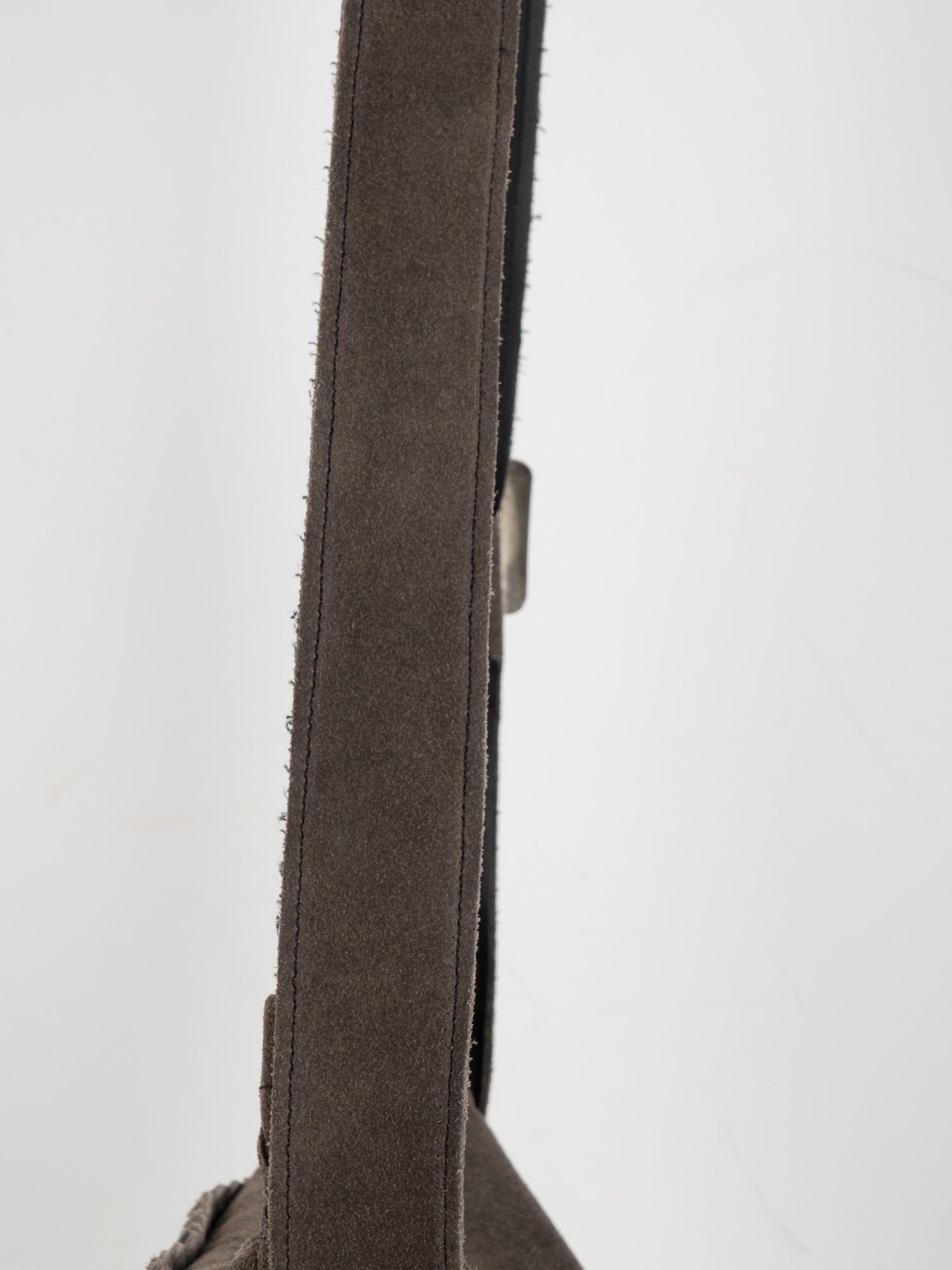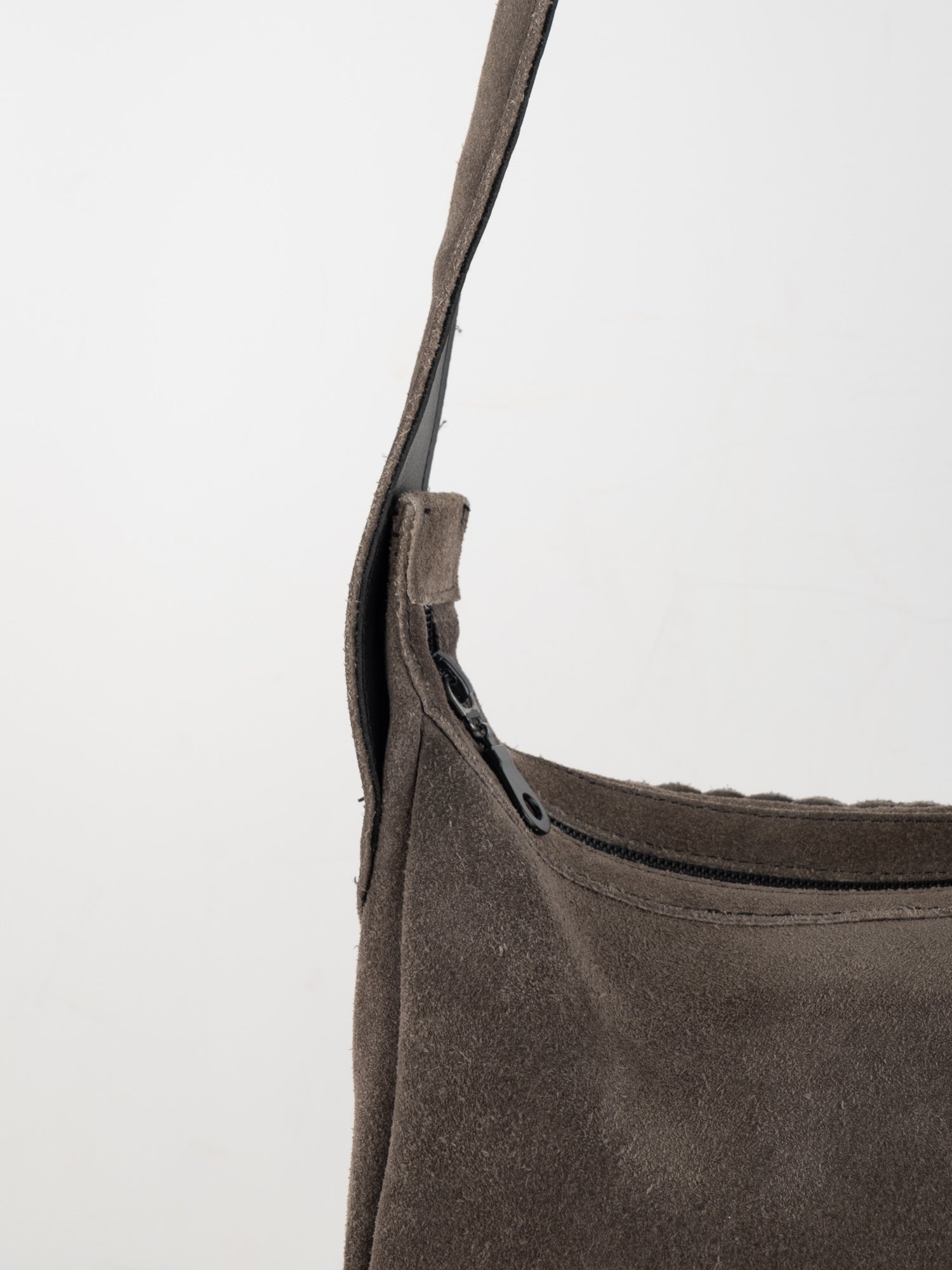 התיק עשוי זמש טבעי עם שכבות פרנזים קדמיות, רצועת כתף ארוכה ורוכסן עליון.