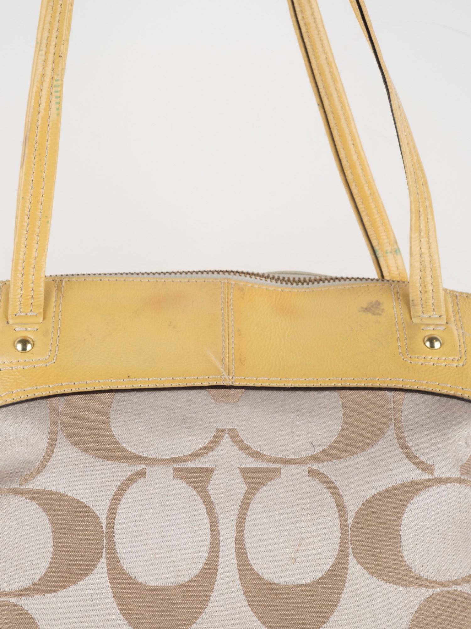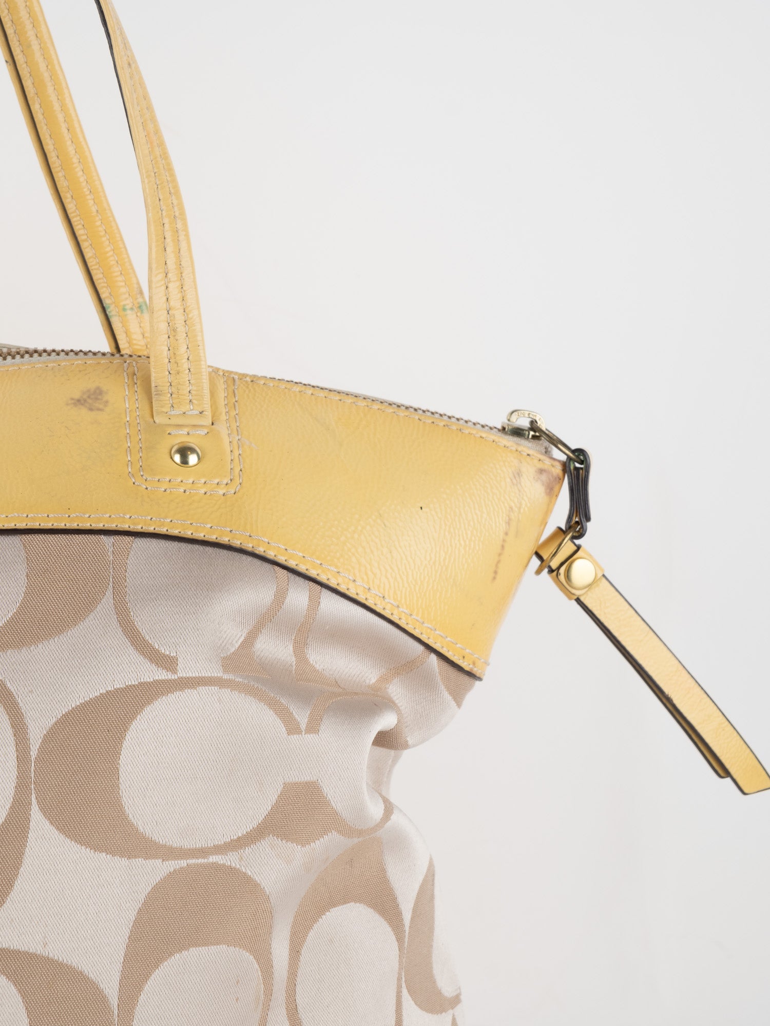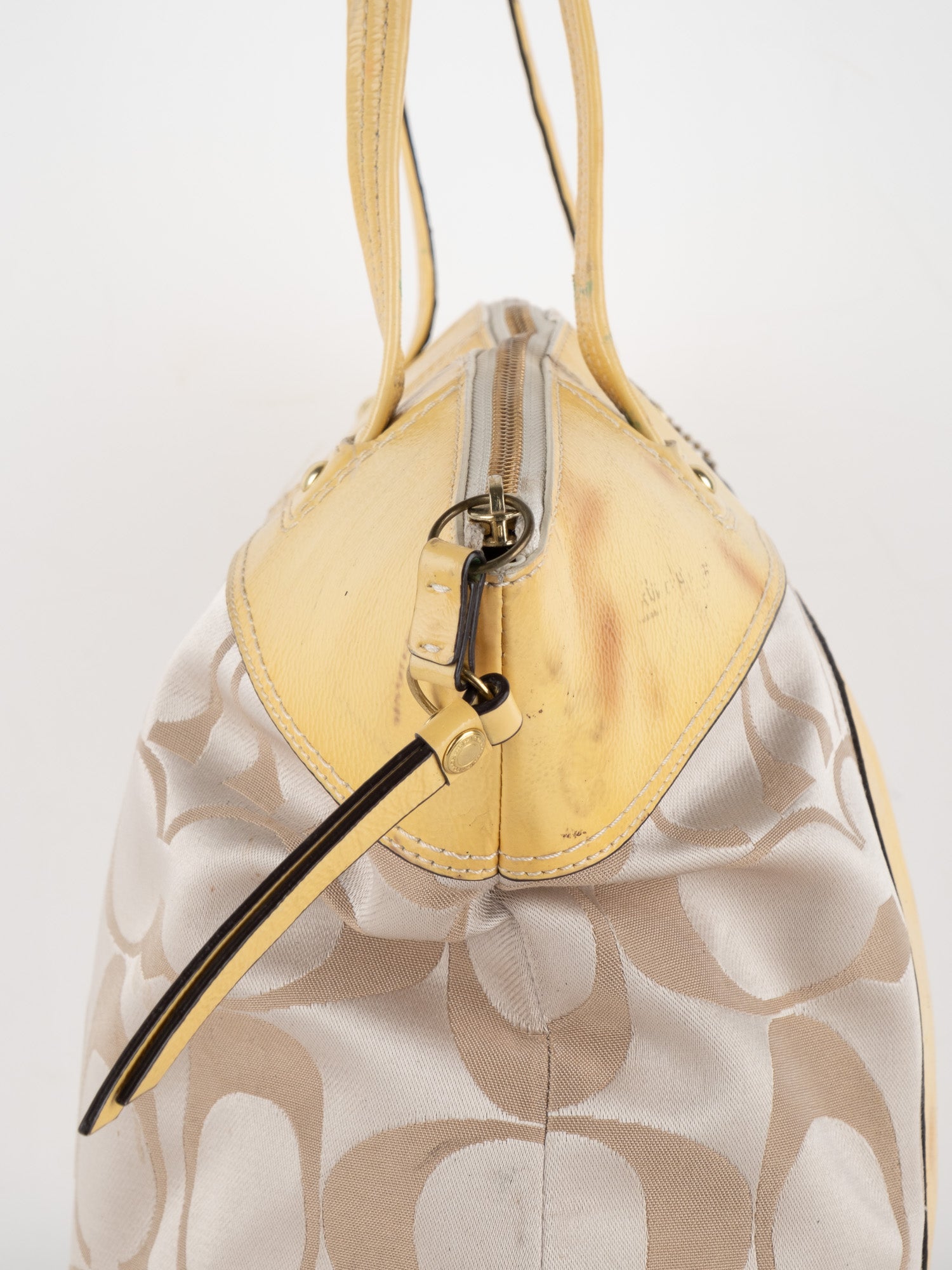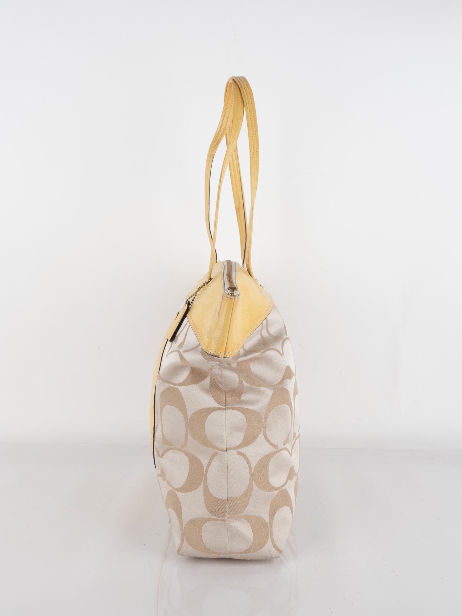 התיק עשוי קנבס איכותי עם הדפס לוגו מונוגרם בגוון בז׳, בשילוב חלקי עור צהוב בחזית ובידיות. סגירת רוכסן עליונה, בטנה פנימית מרופדת ותאים קטנים לארגון מושלם. ידיות נשיאה כפולות נוחות ואבזמי מתכת מוזהבים משלימים את המראה.