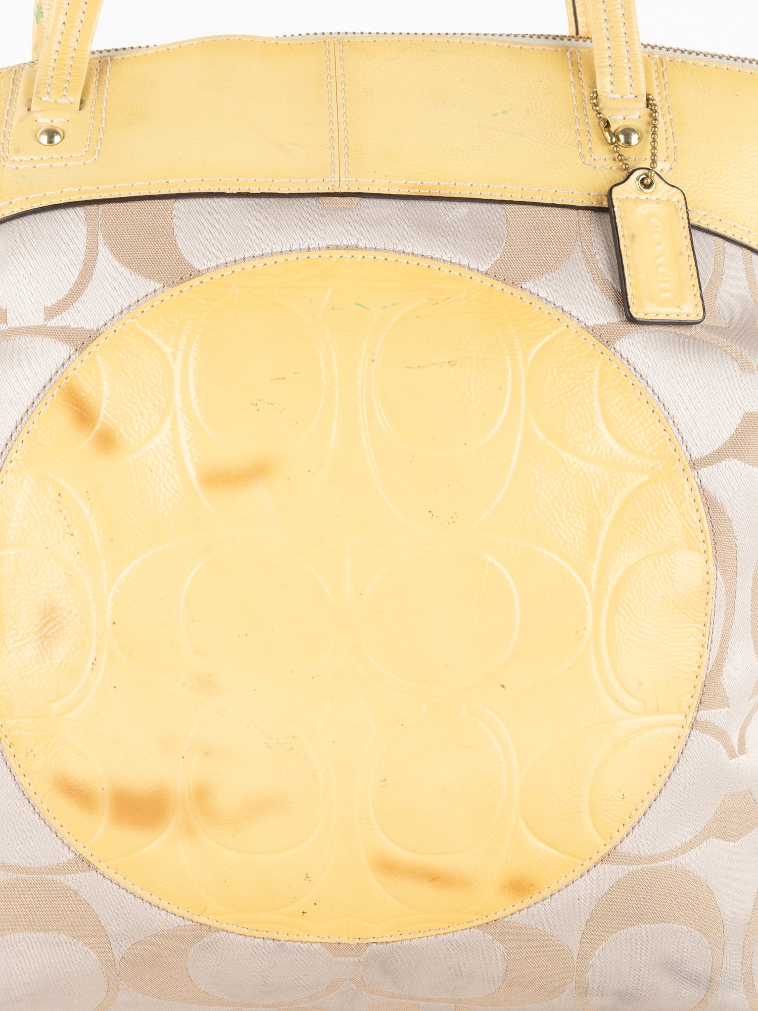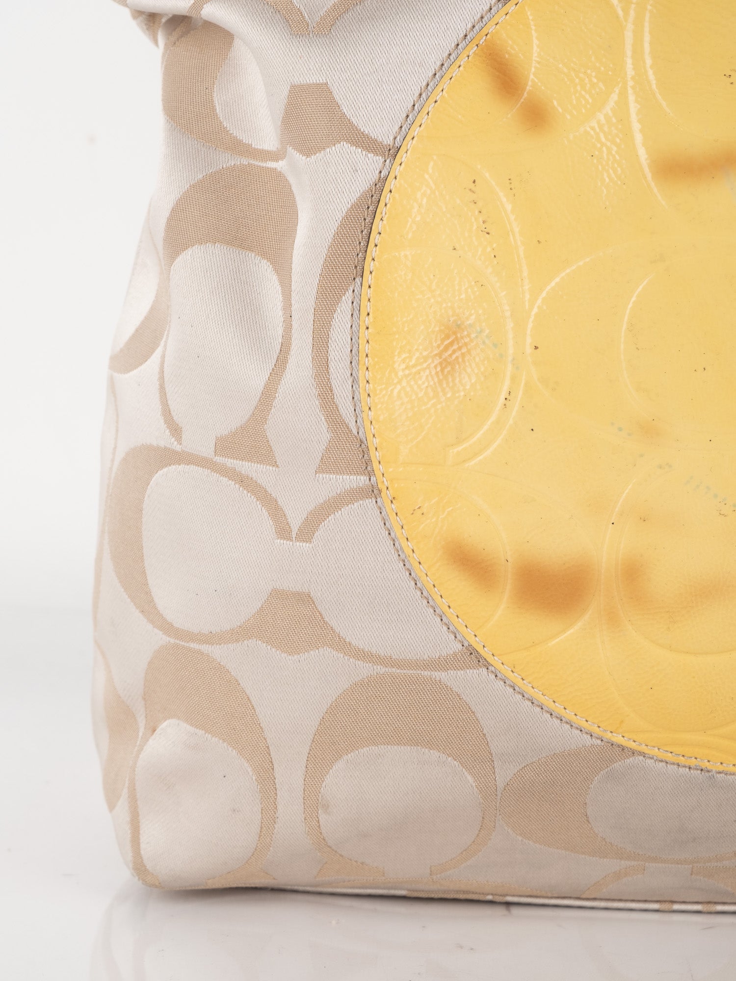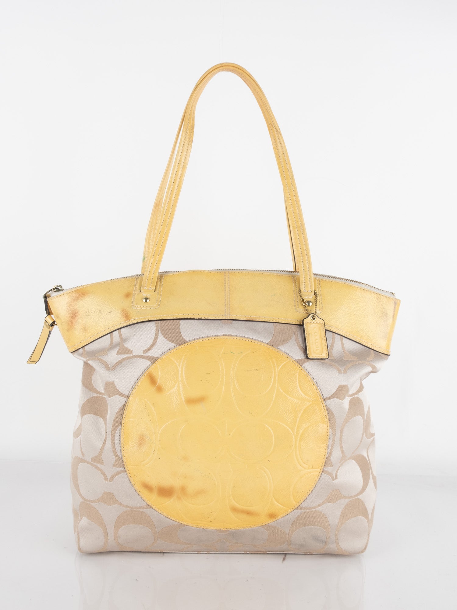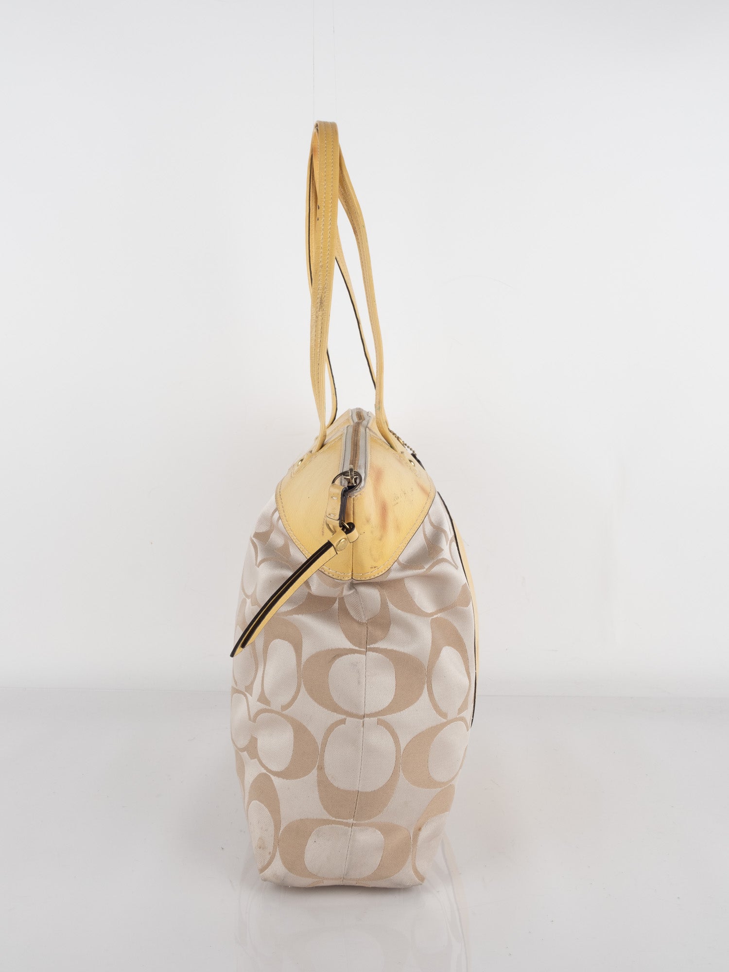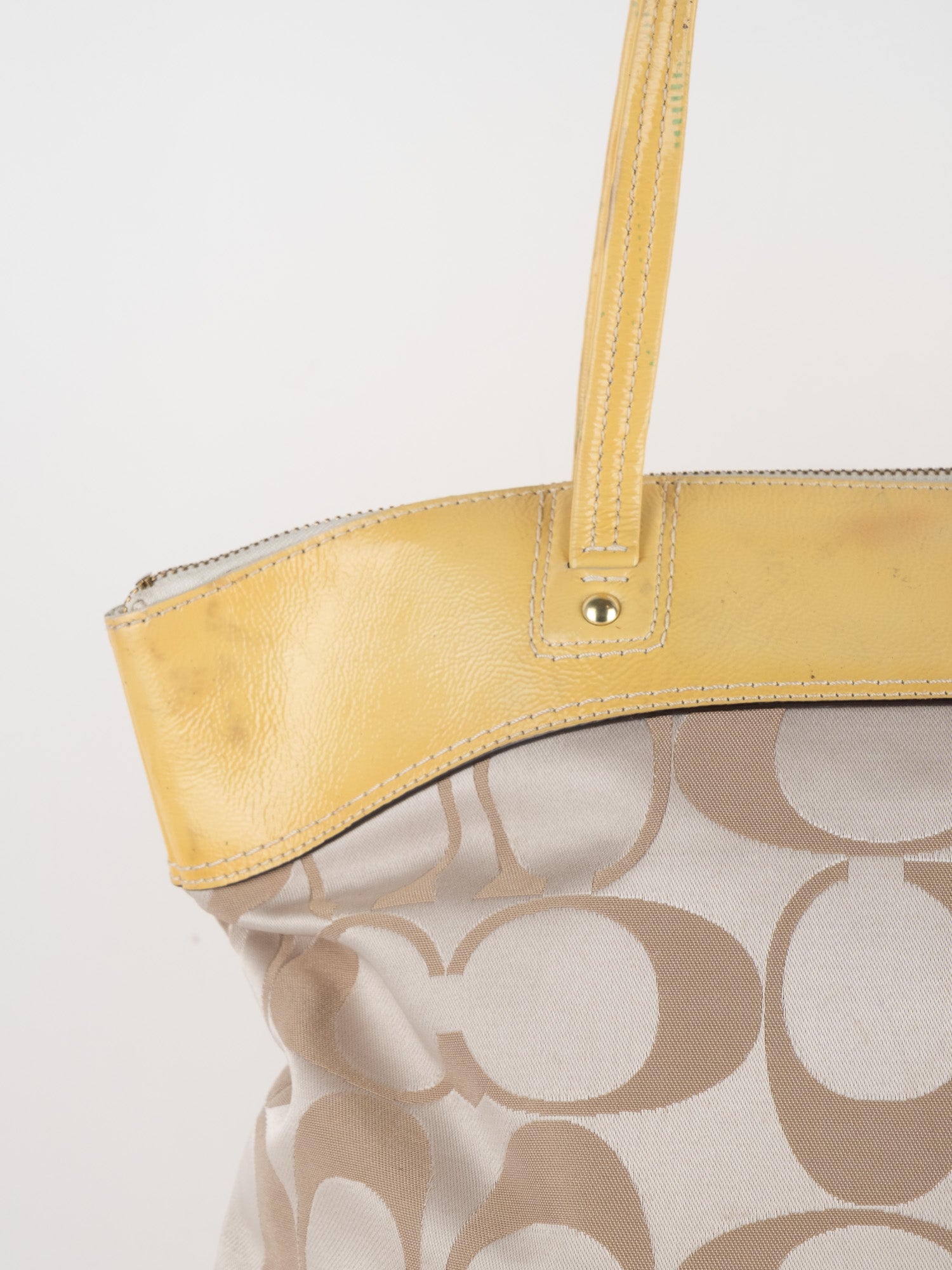 התיק עשוי קנבס איכותי עם הדפס לוגו מונוגרם בגוון בז׳, בשילוב חלקי עור צהוב בחזית ובידיות. סגירת רוכסן עליונה, בטנה פנימית מרופדת ותאים קטנים לארגון מושלם. ידיות נשיאה כפולות נוחות ואבזמי מתכת מוזהבים משלימים את המראה.