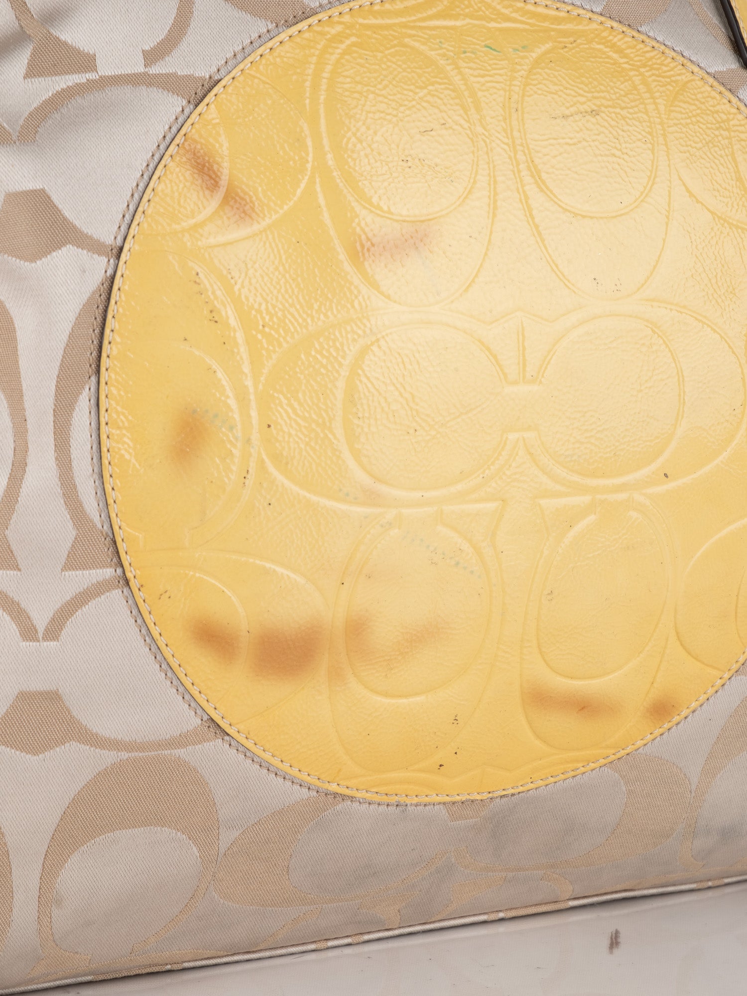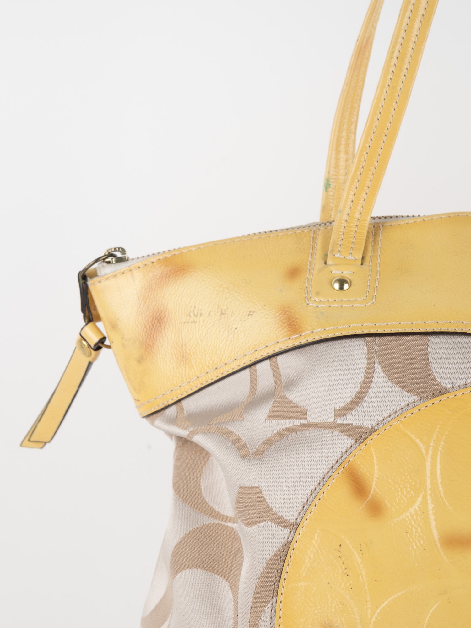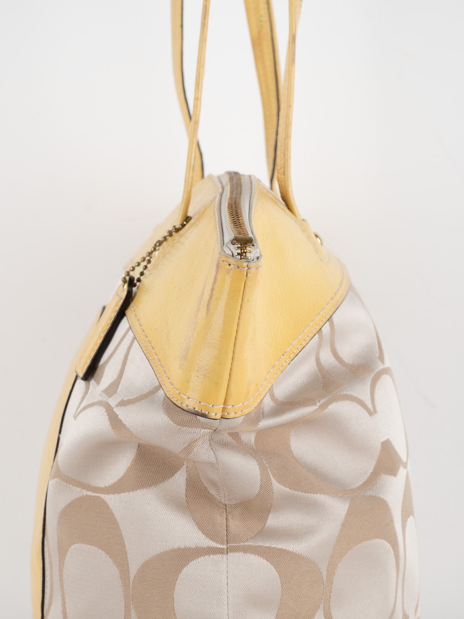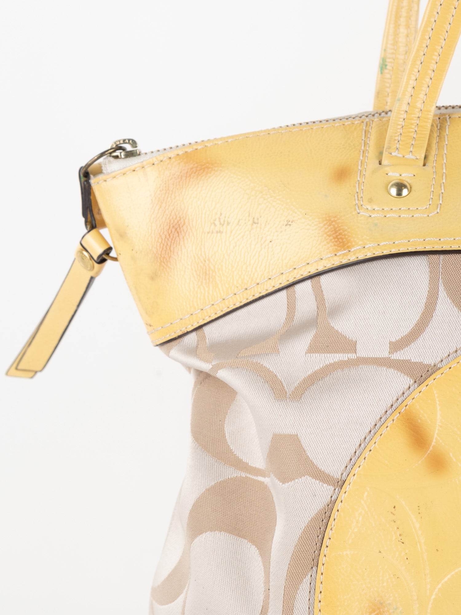 התיק עשוי קנבס איכותי עם הדפס לוגו מונוגרם בגוון בז׳, בשילוב חלקי עור צהוב בחזית ובידיות. סגירת רוכסן עליונה, בטנה פנימית מרופדת ותאים קטנים לארגון מושלם. ידיות נשיאה כפולות נוחות ואבזמי מתכת מוזהבים משלימים את המראה.