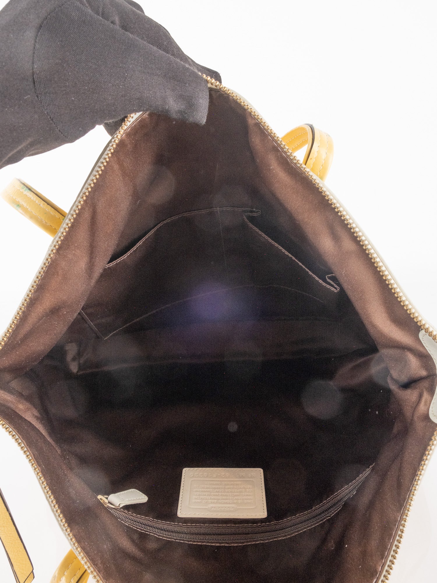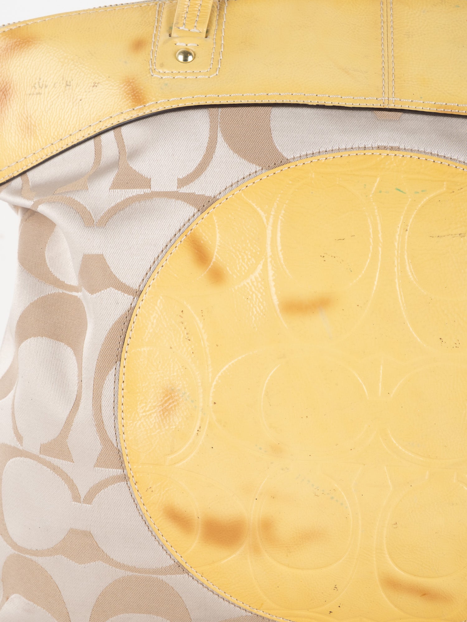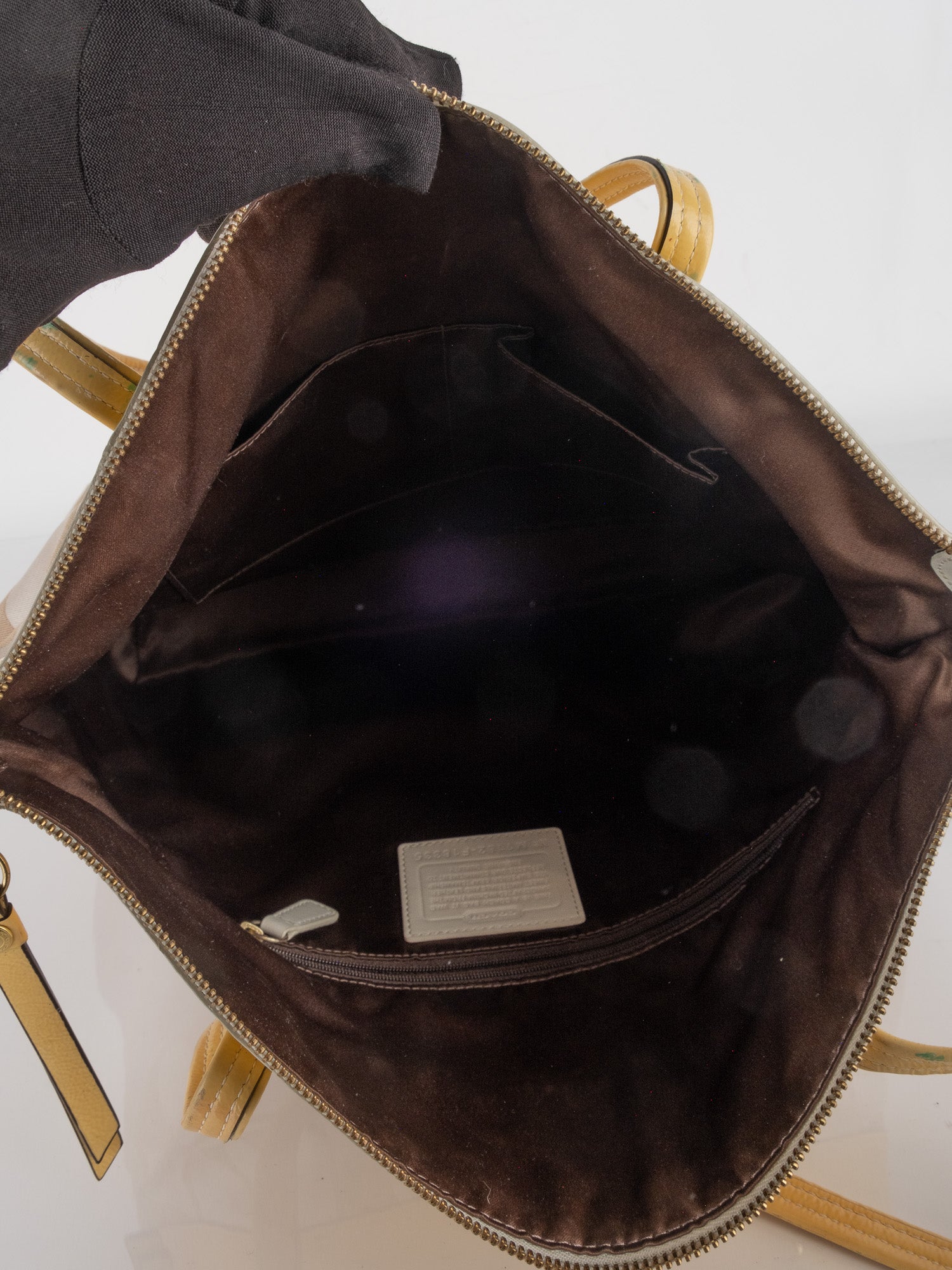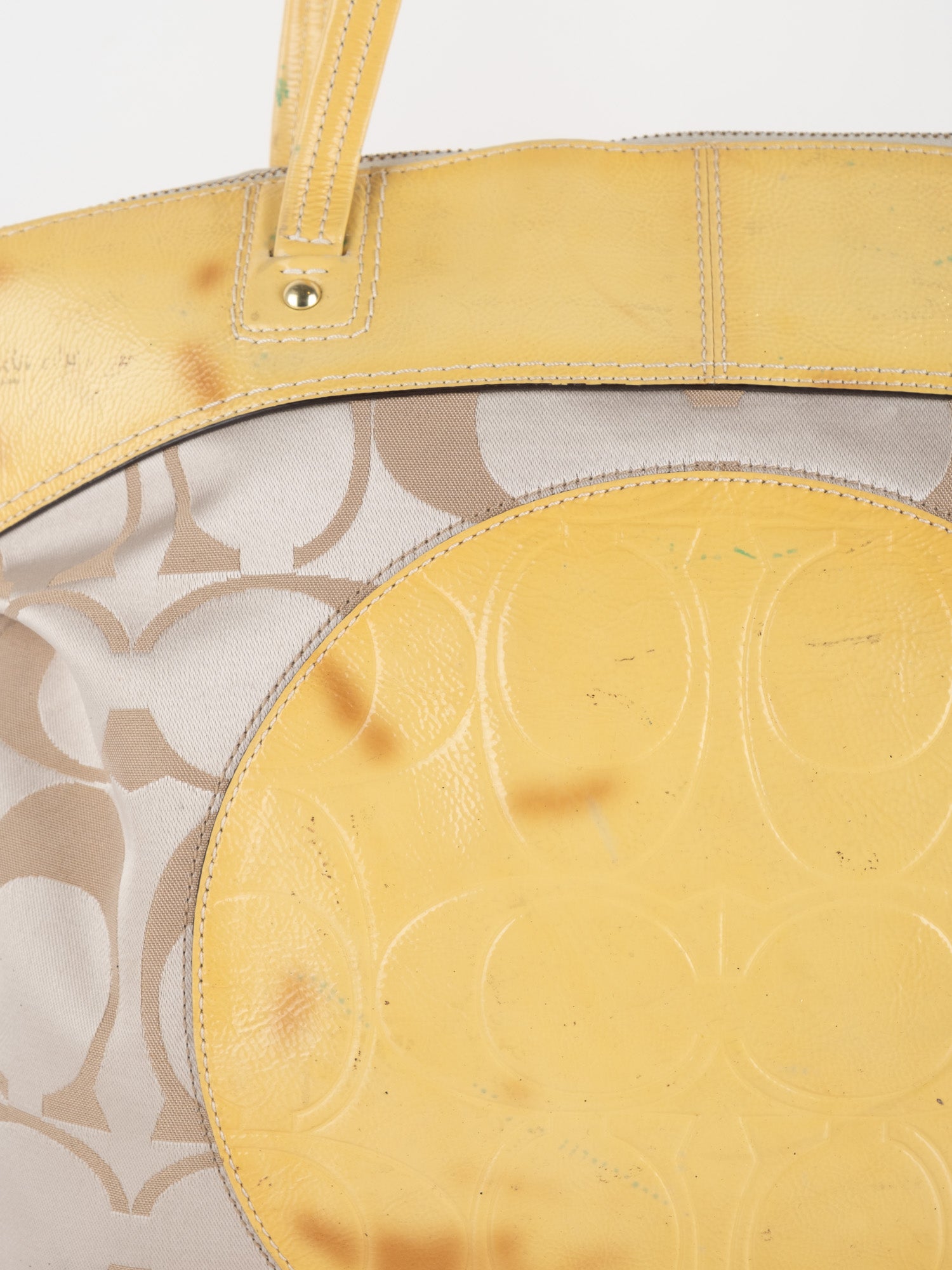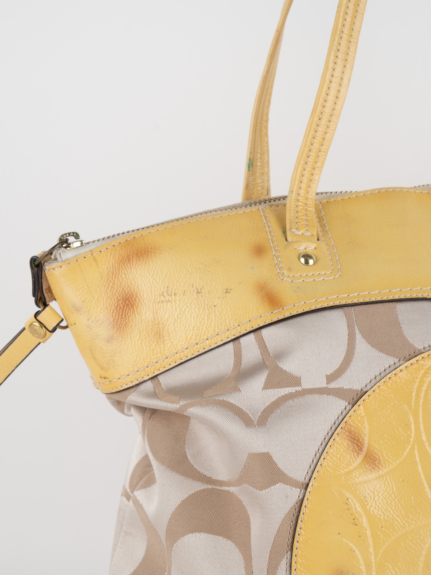התיק עשוי קנבס איכותי עם הדפס לוגו מונוגרם בגוון בז׳, בשילוב חלקי עור צהוב בחזית ובידיות. סגירת רוכסן עליונה, בטנה פנימית מרופדת ותאים קטנים לארגון מושלם. ידיות נשיאה כפולות נוחות ואבזמי מתכת מוזהבים משלימים את המראה.