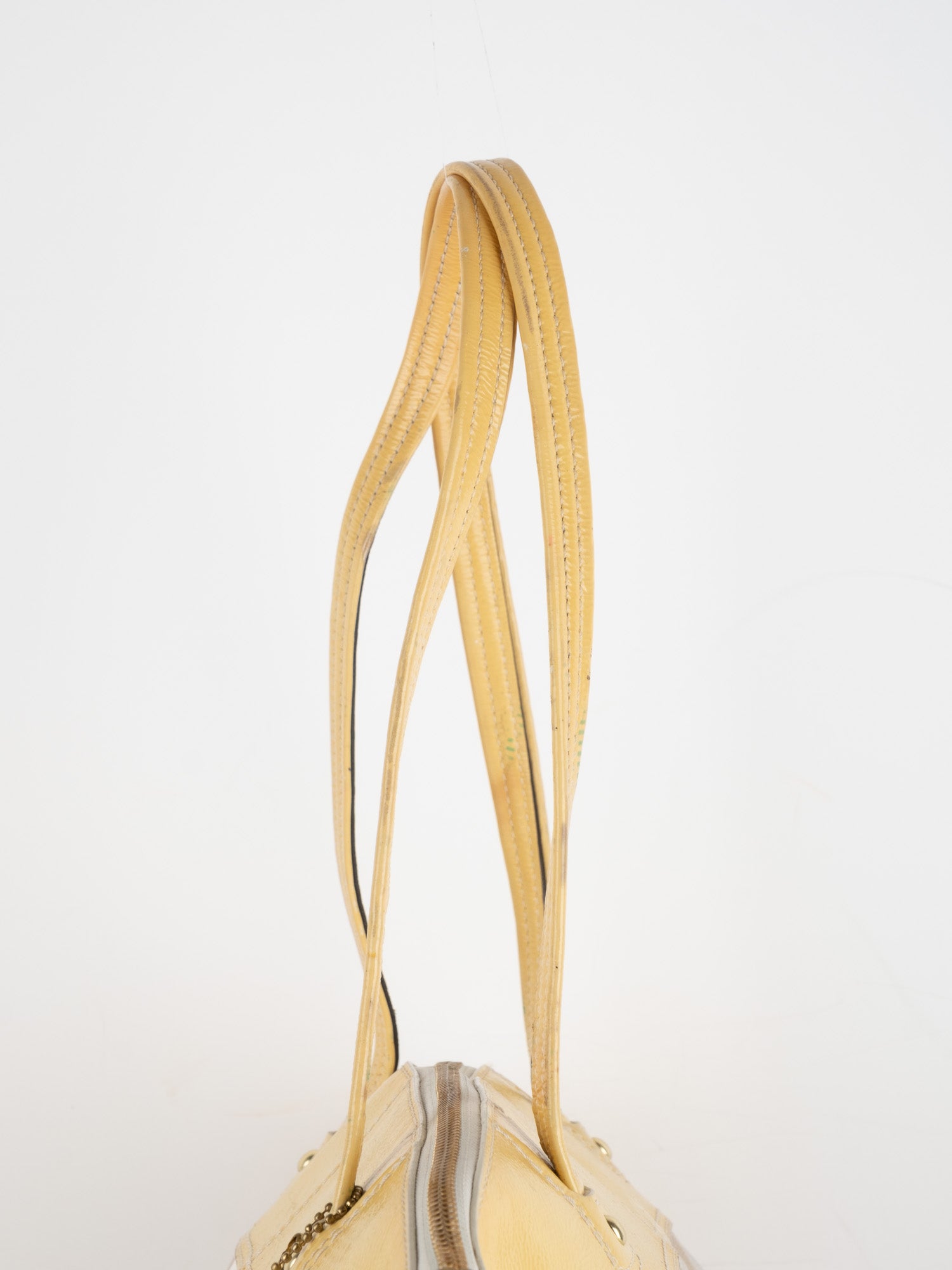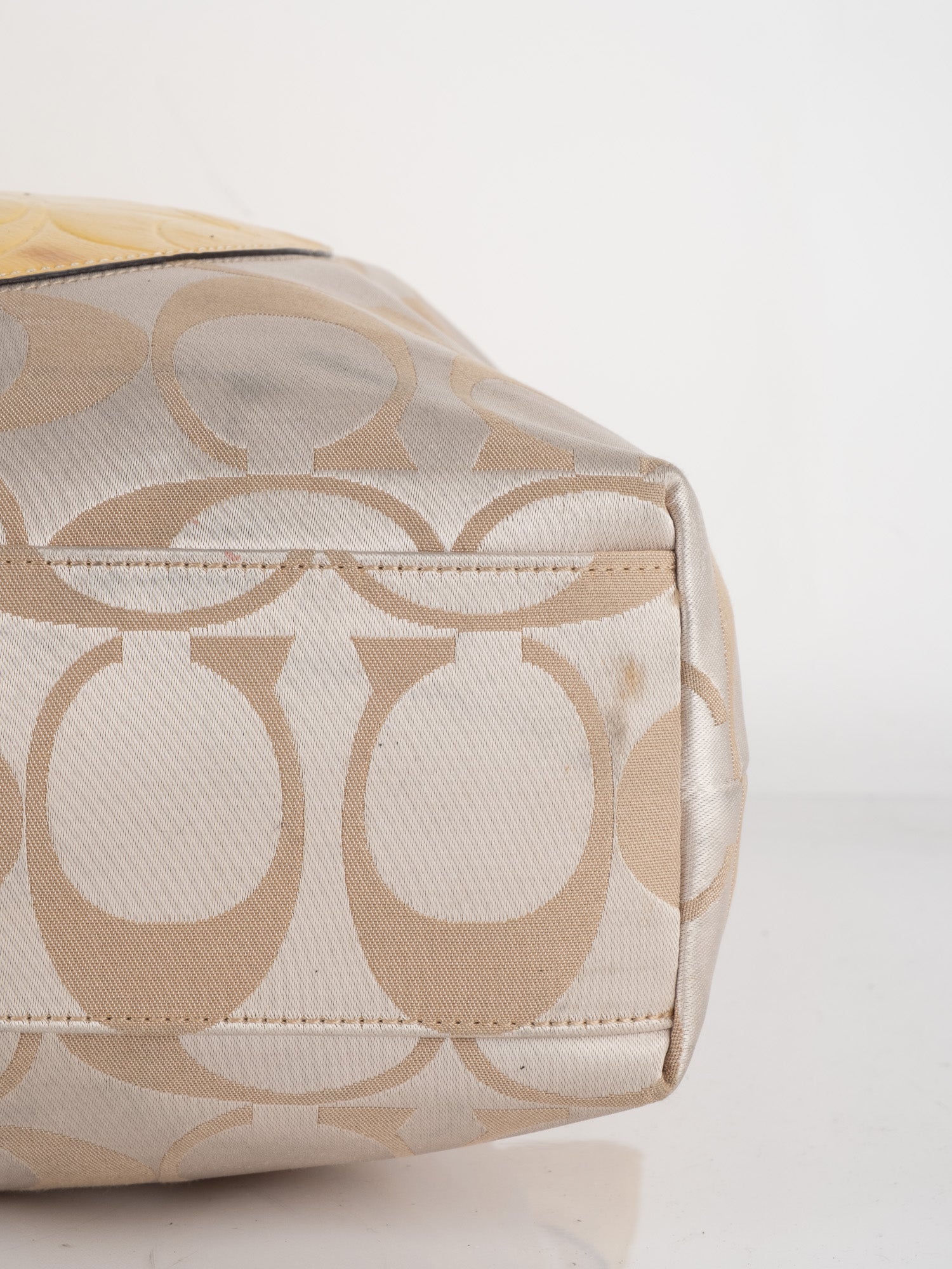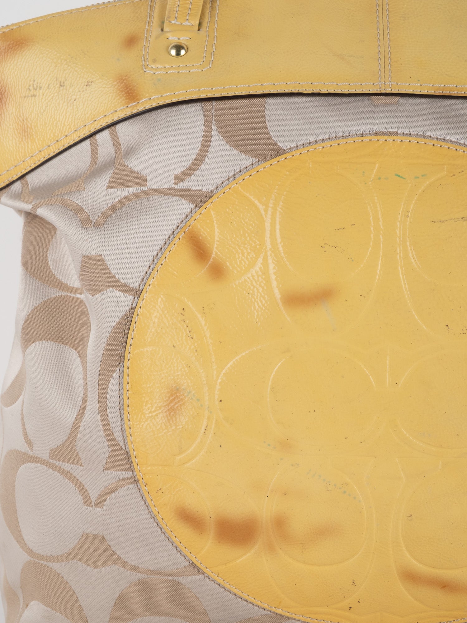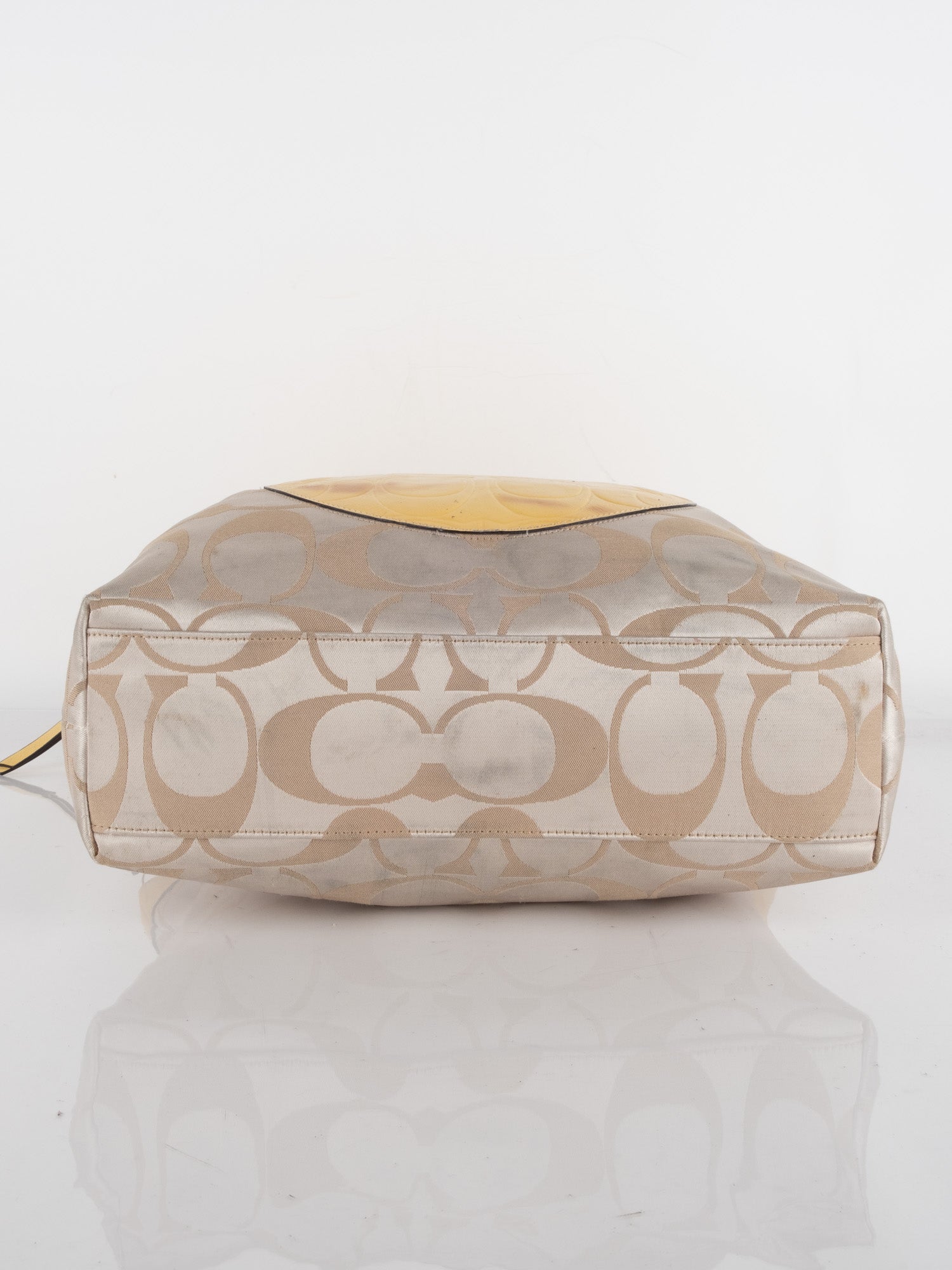 התיק עשוי קנבס איכותי עם הדפס לוגו מונוגרם בגוון בז׳, בשילוב חלקי עור צהוב בחזית ובידיות. סגירת רוכסן עליונה, בטנה פנימית מרופדת ותאים קטנים לארגון מושלם. ידיות נשיאה כפולות נוחות ואבזמי מתכת מוזהבים משלימים את המראה.