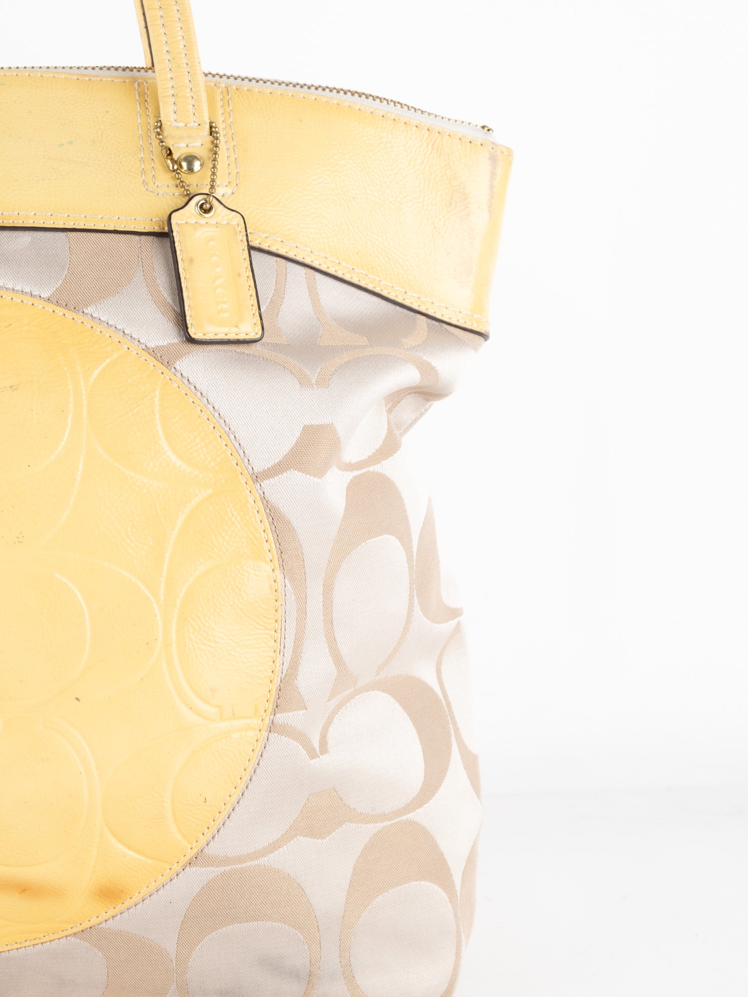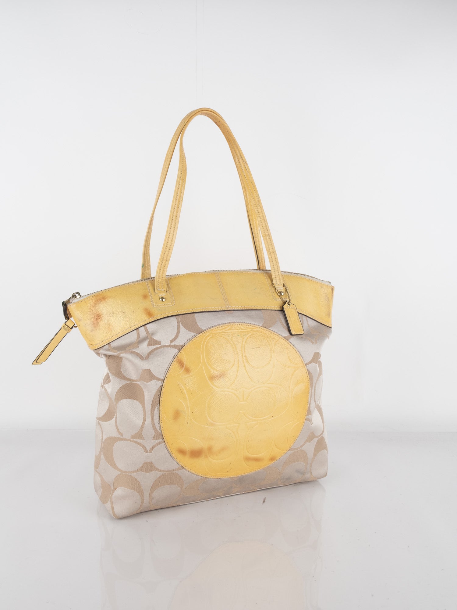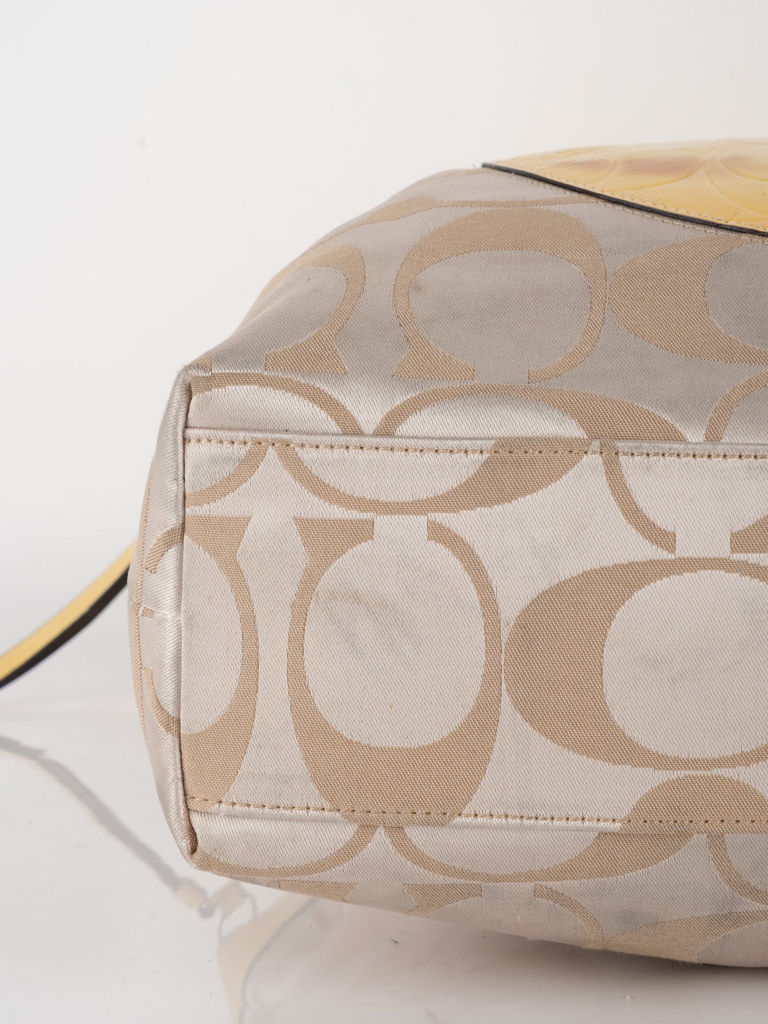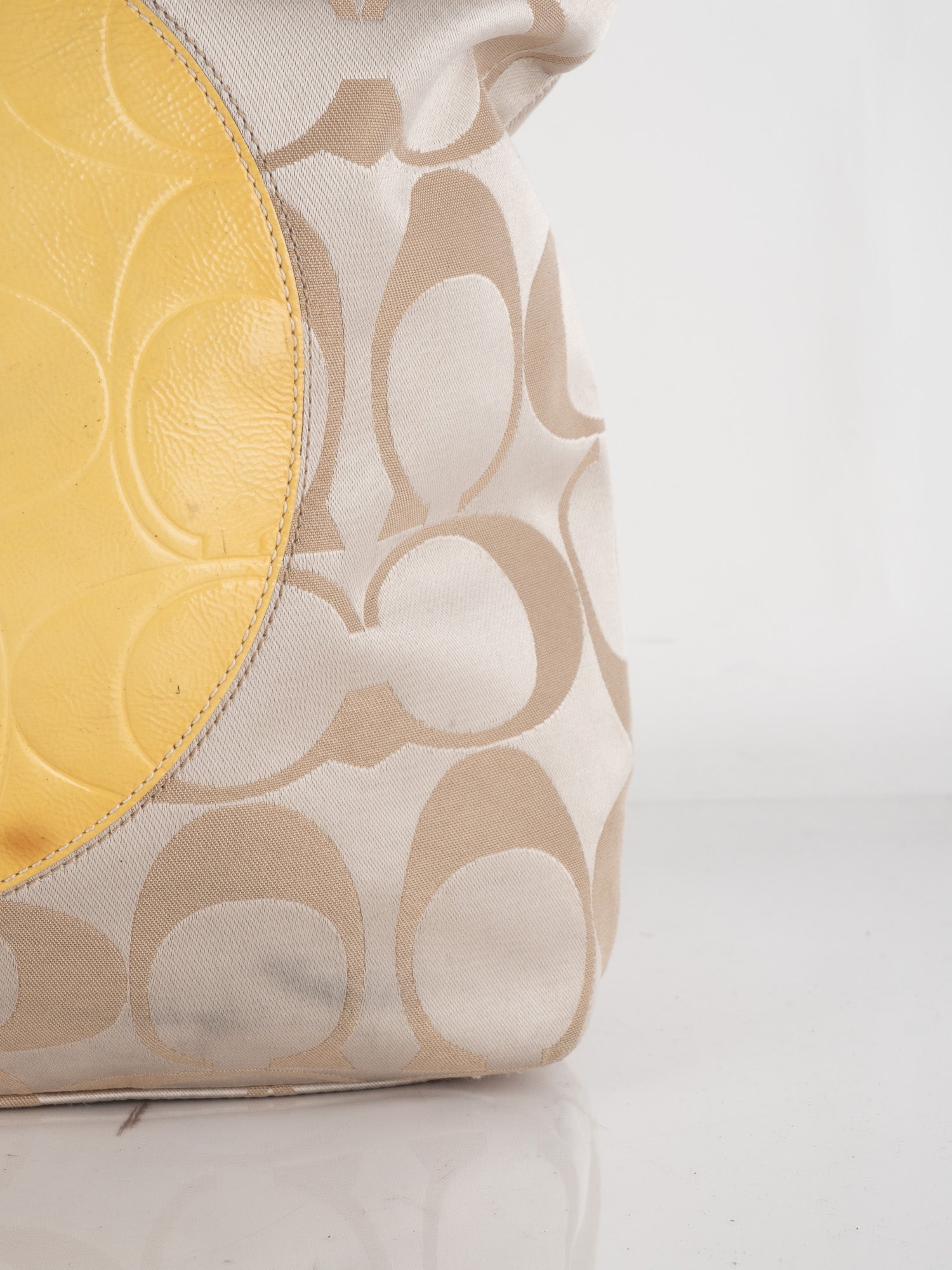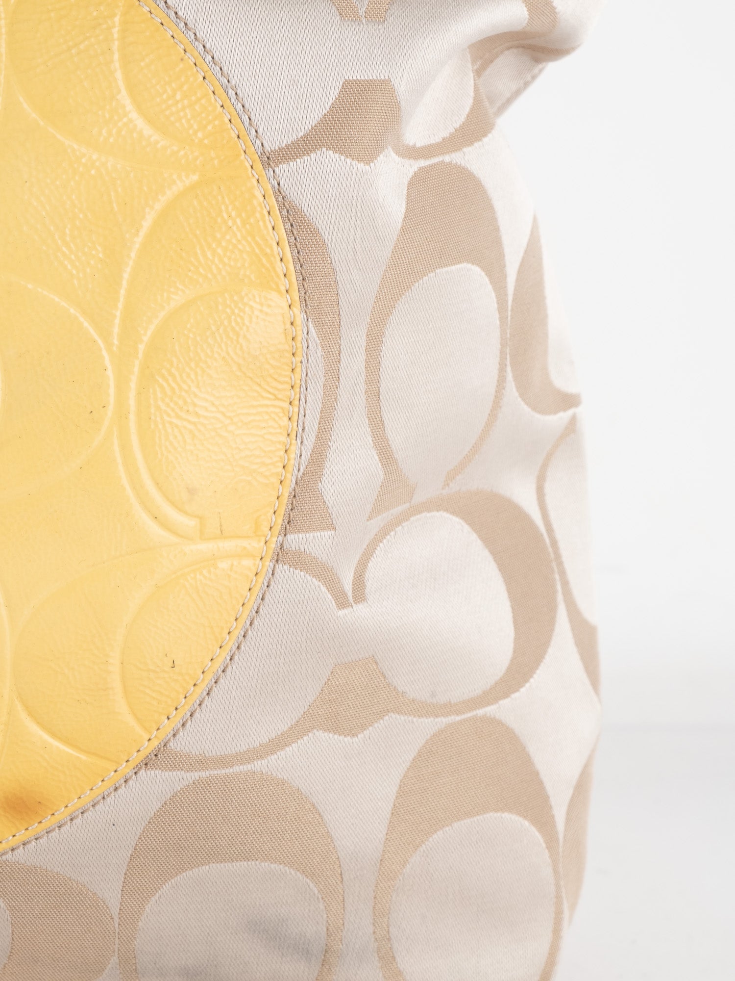 View Similar Productsתיק כתף וינטג׳ יד שנייה של קואוץ׳ (Coach) בעיצוב ייחודי ושובה לב, עשוי קנבס בהדפס המונוגרם הקלאסי של המותג, בשילוב עור בגוון צהוב זהוב המעניק לתיק מראה רענן ואלגנטי. אלמנט העור העגול בחזית מוסיף עומק, מקוריות ותחושת וינטג׳ אמיתית.