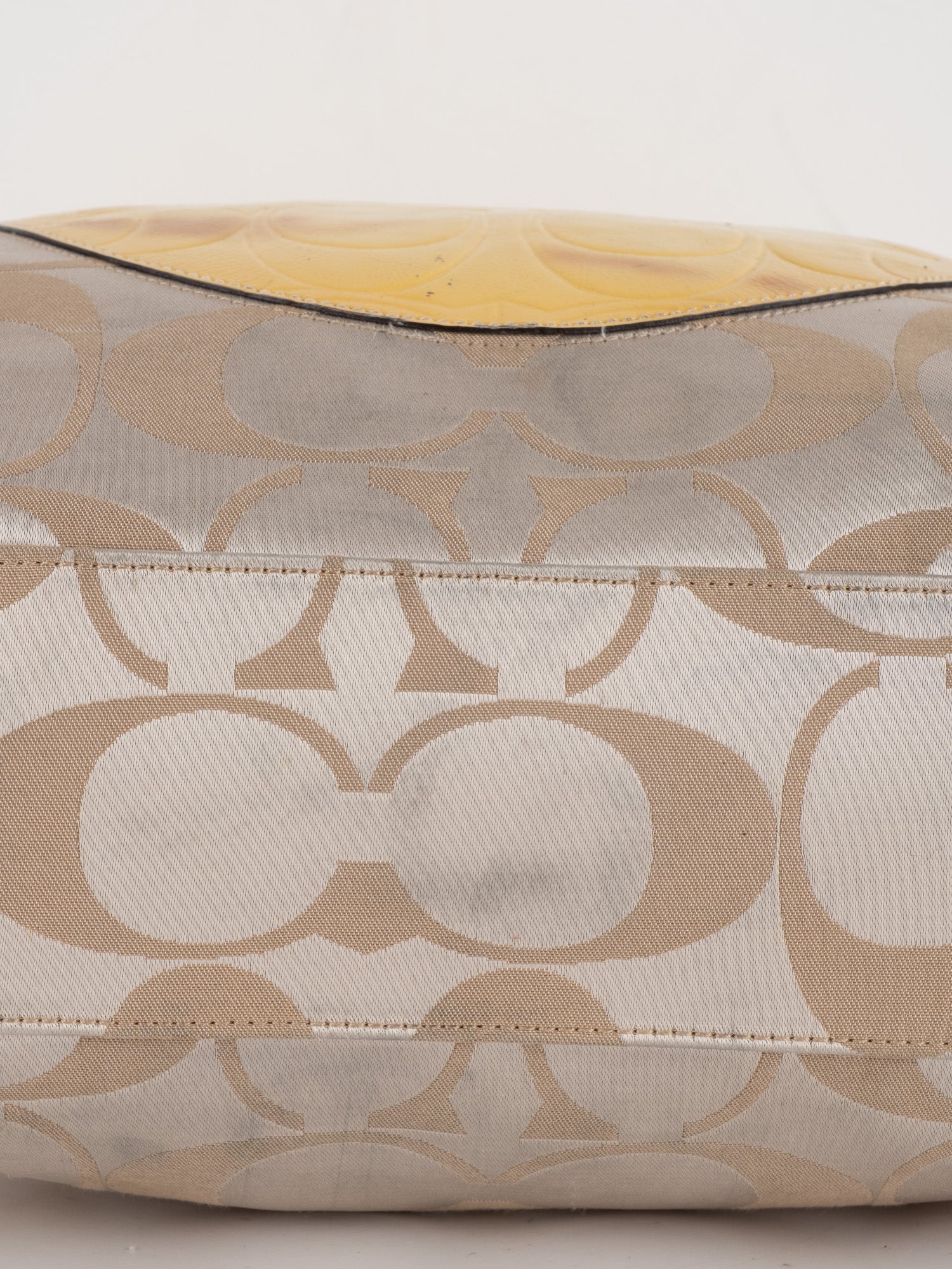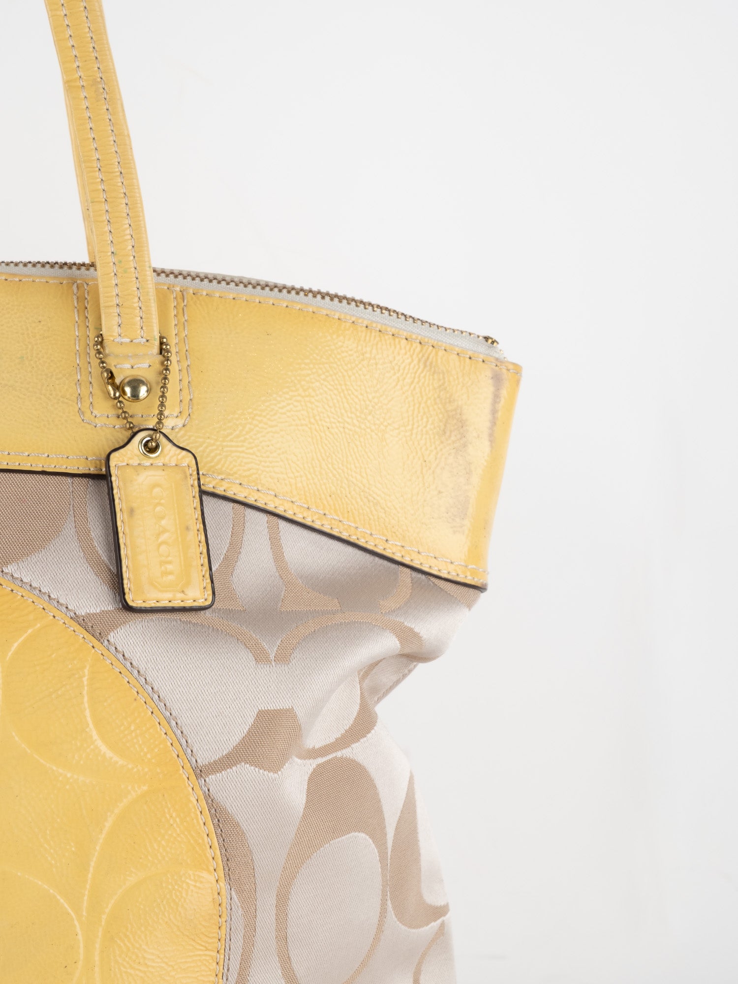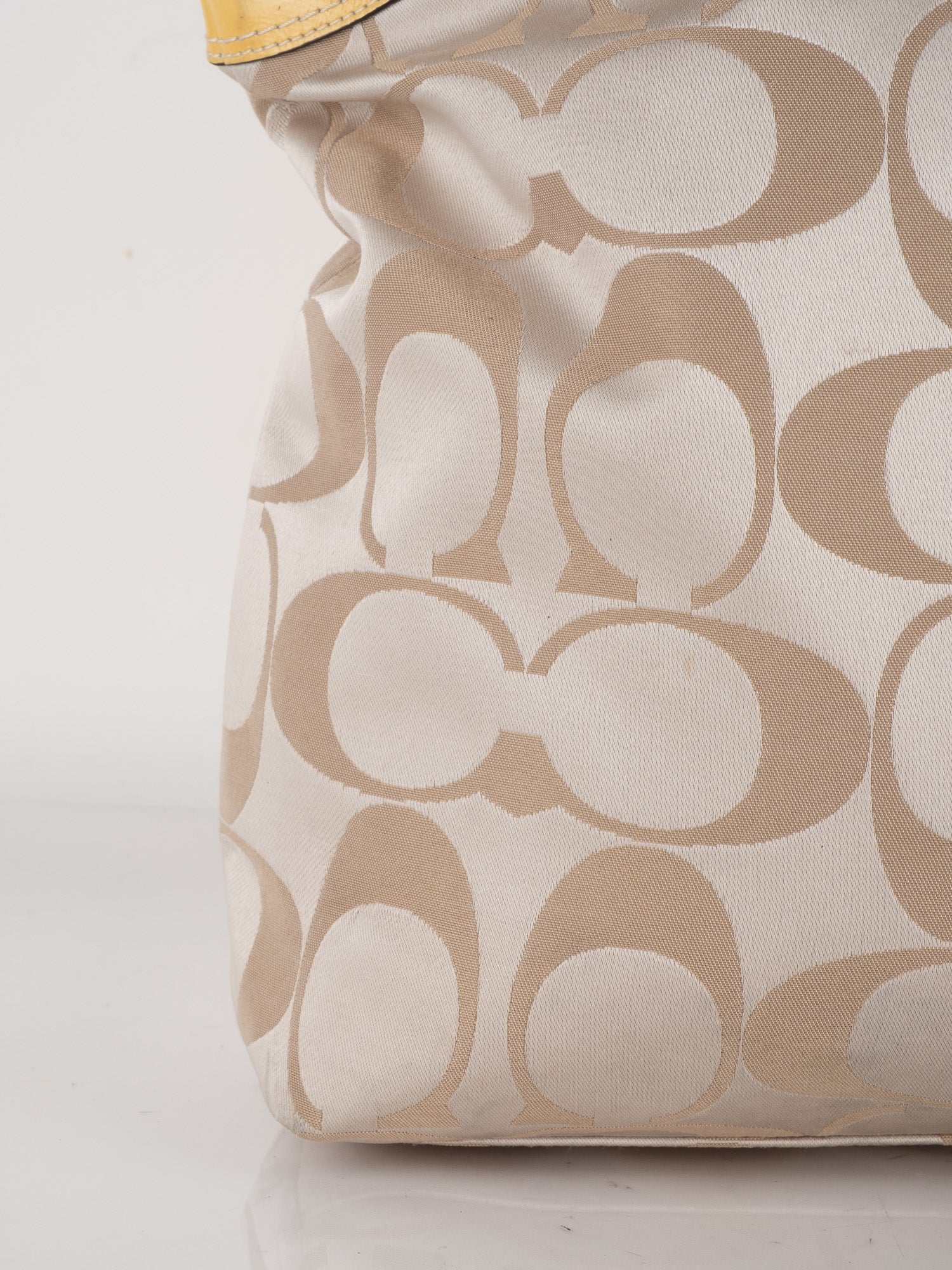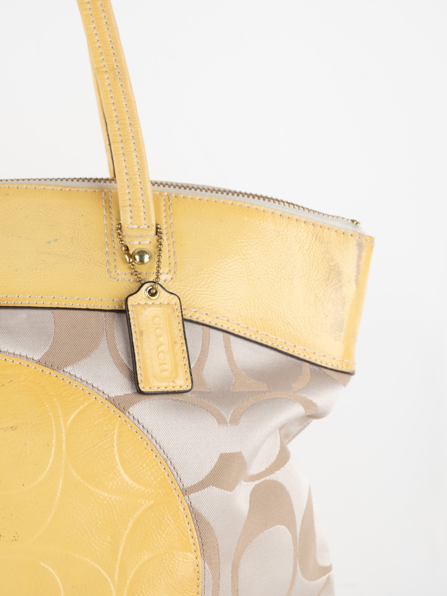 View Similar Productsתיק כתף וינטג׳ יד שנייה של קואוץ׳ (Coach) בעיצוב ייחודי ושובה לב, עשוי קנבס בהדפס המונוגרם הקלאסי של המותג, בשילוב עור בגוון צהוב זהוב המעניק לתיק מראה רענן ואלגנטי. אלמנט העור העגול בחזית מוסיף עומק, מקוריות ותחושת וינטג׳ אמיתית.