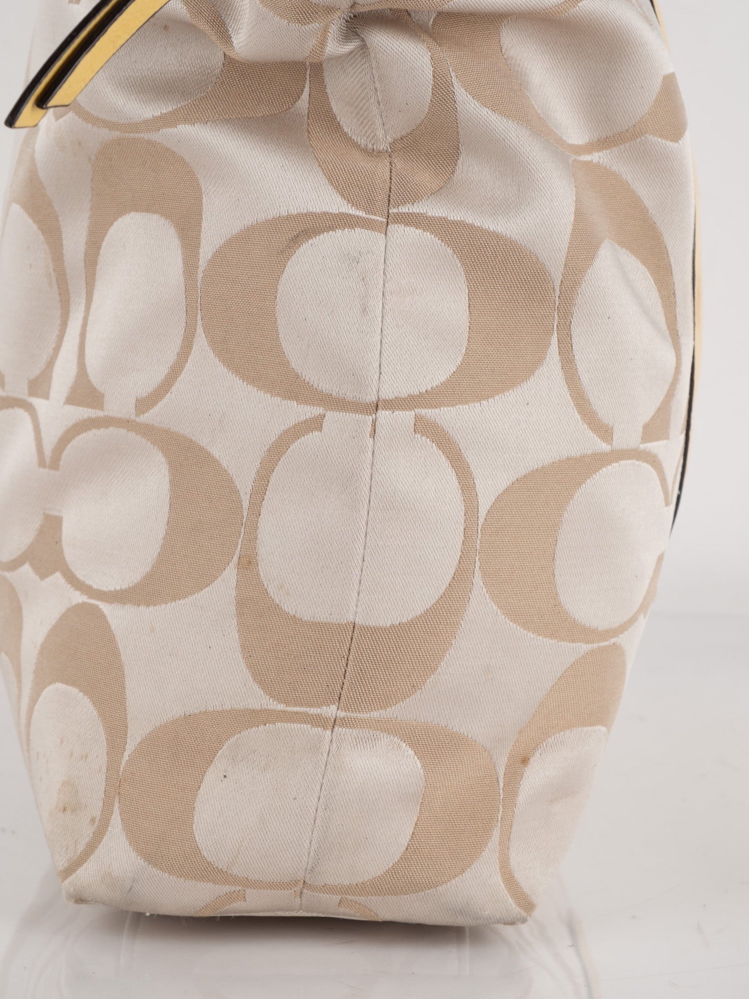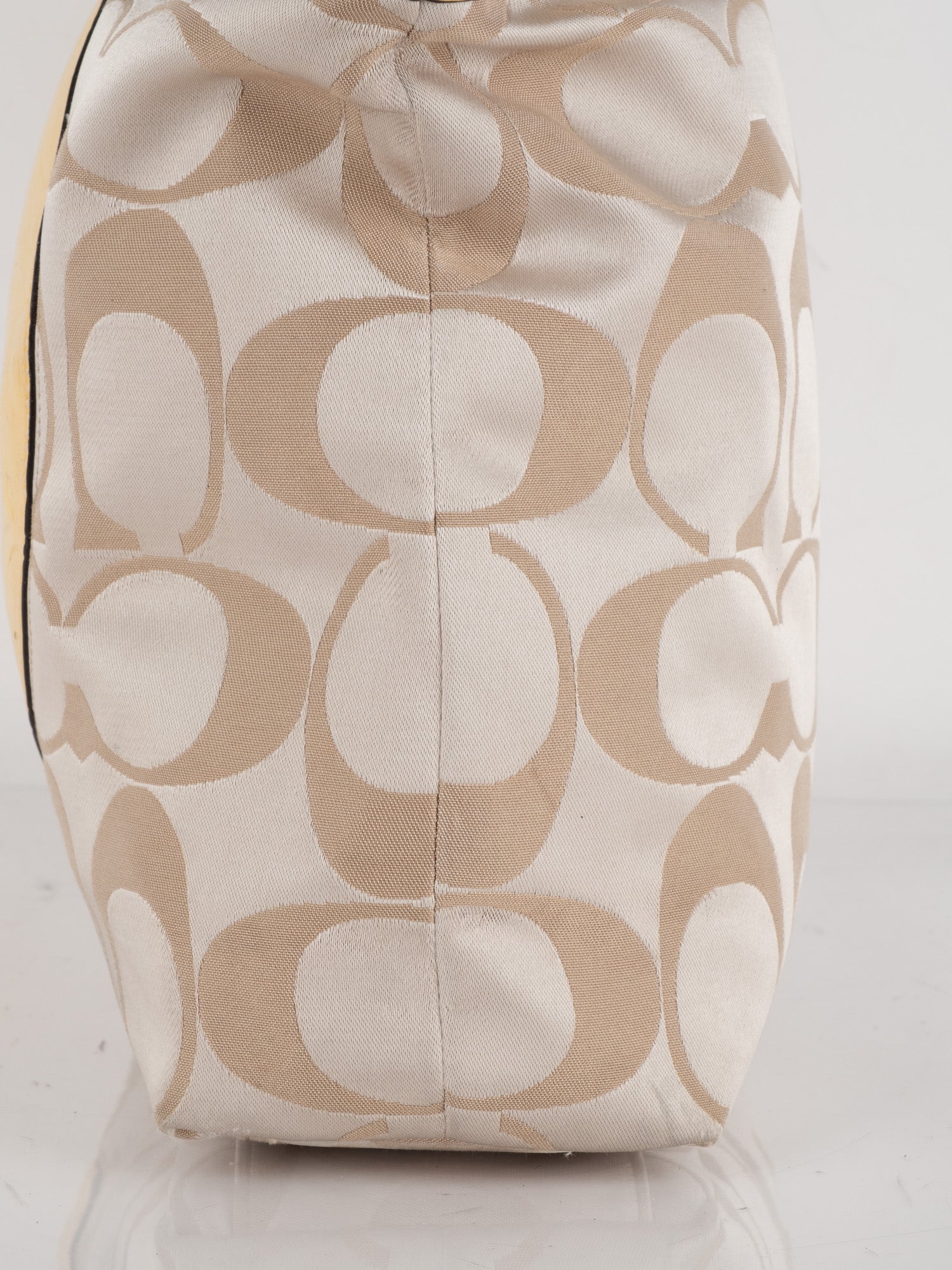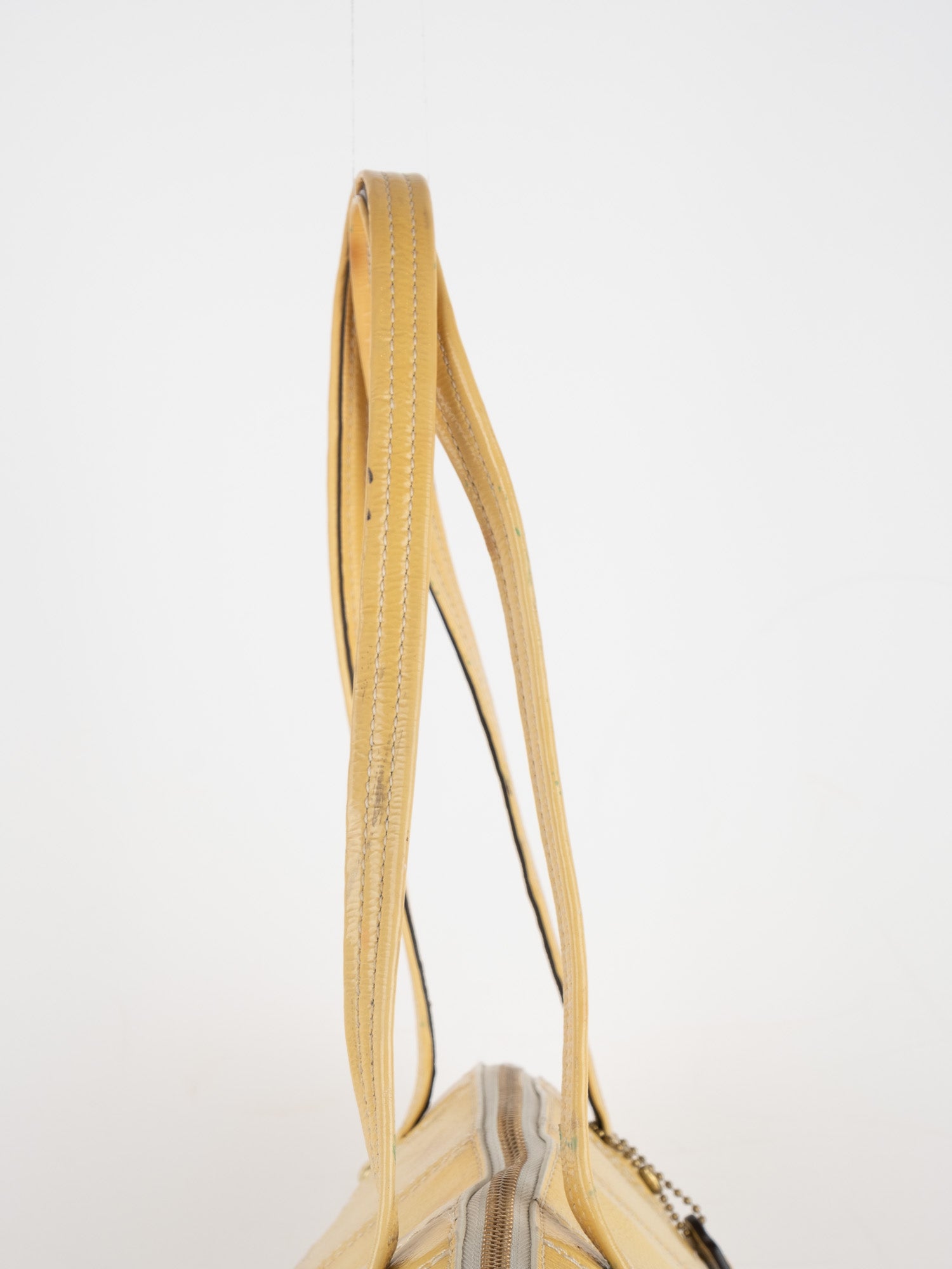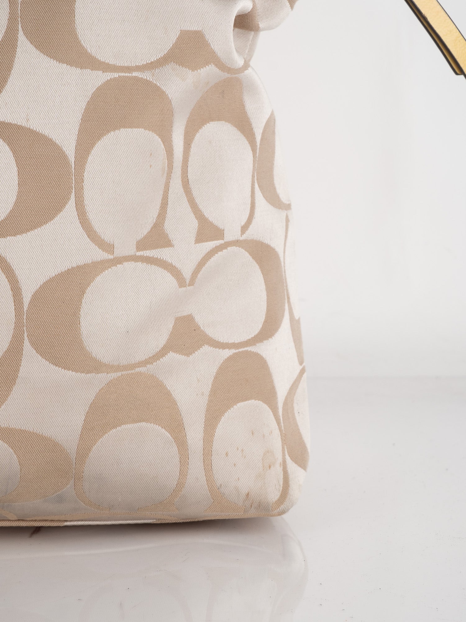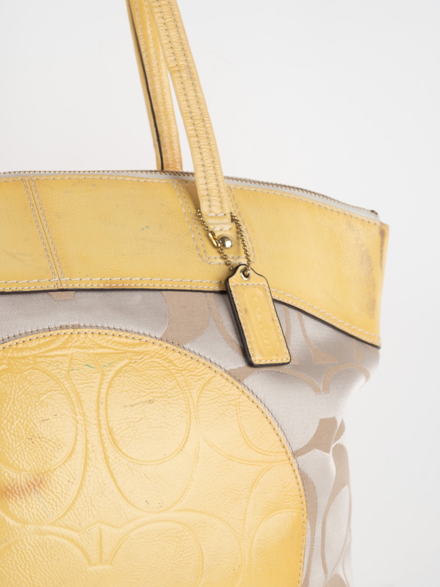 View Similar Productsתיק כתף וינטג׳ יד שנייה של קואוץ׳ (Coach) בעיצוב ייחודי ושובה לב, עשוי קנבס בהדפס המונוגרם הקלאסי של המותג, בשילוב עור בגוון צהוב זהוב המעניק לתיק מראה רענן ואלגנטי. אלמנט העור העגול בחזית מוסיף עומק, מקוריות ותחושת וינטג׳ אמיתית.