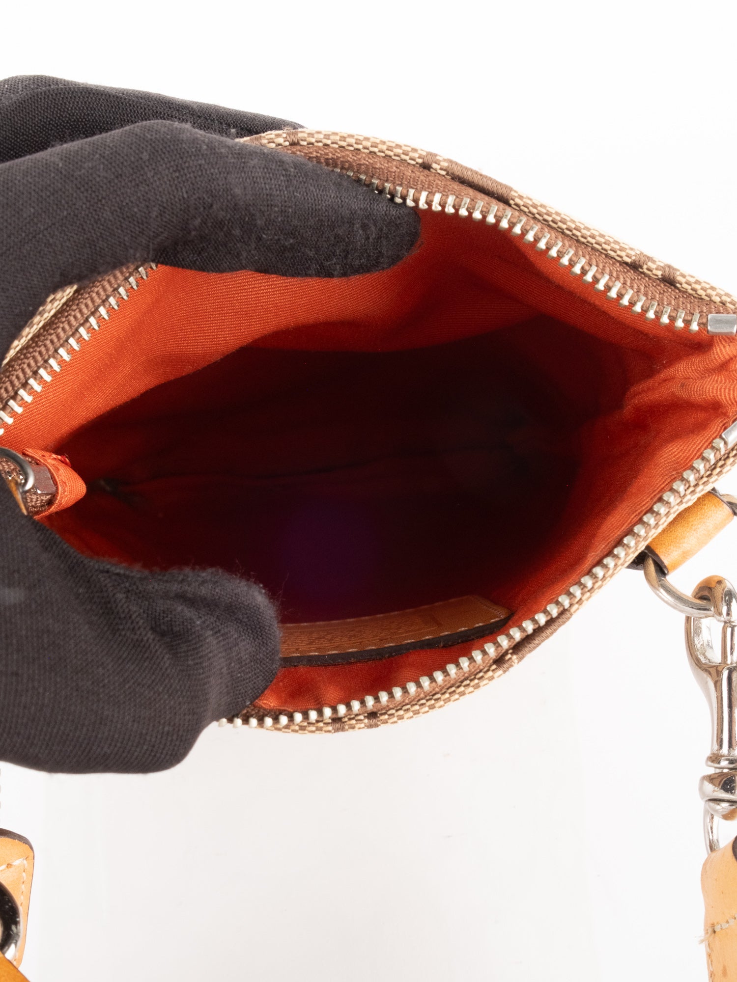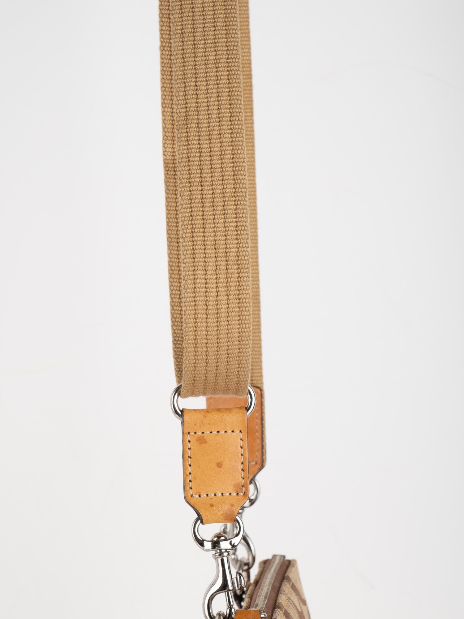 עשוי בד Signature עמיד, עיטורי עור חום בהיר, רצועת בד ארוכה ומתכווננת, סגירת רוכסן עליונה ותא מרכזי עם כיס פנימי.