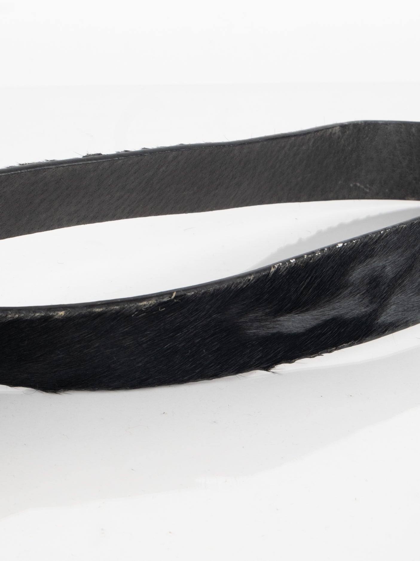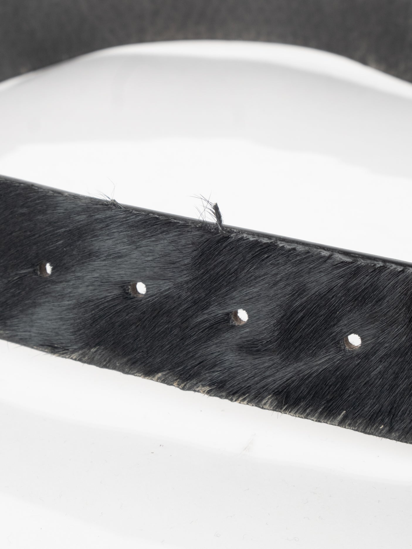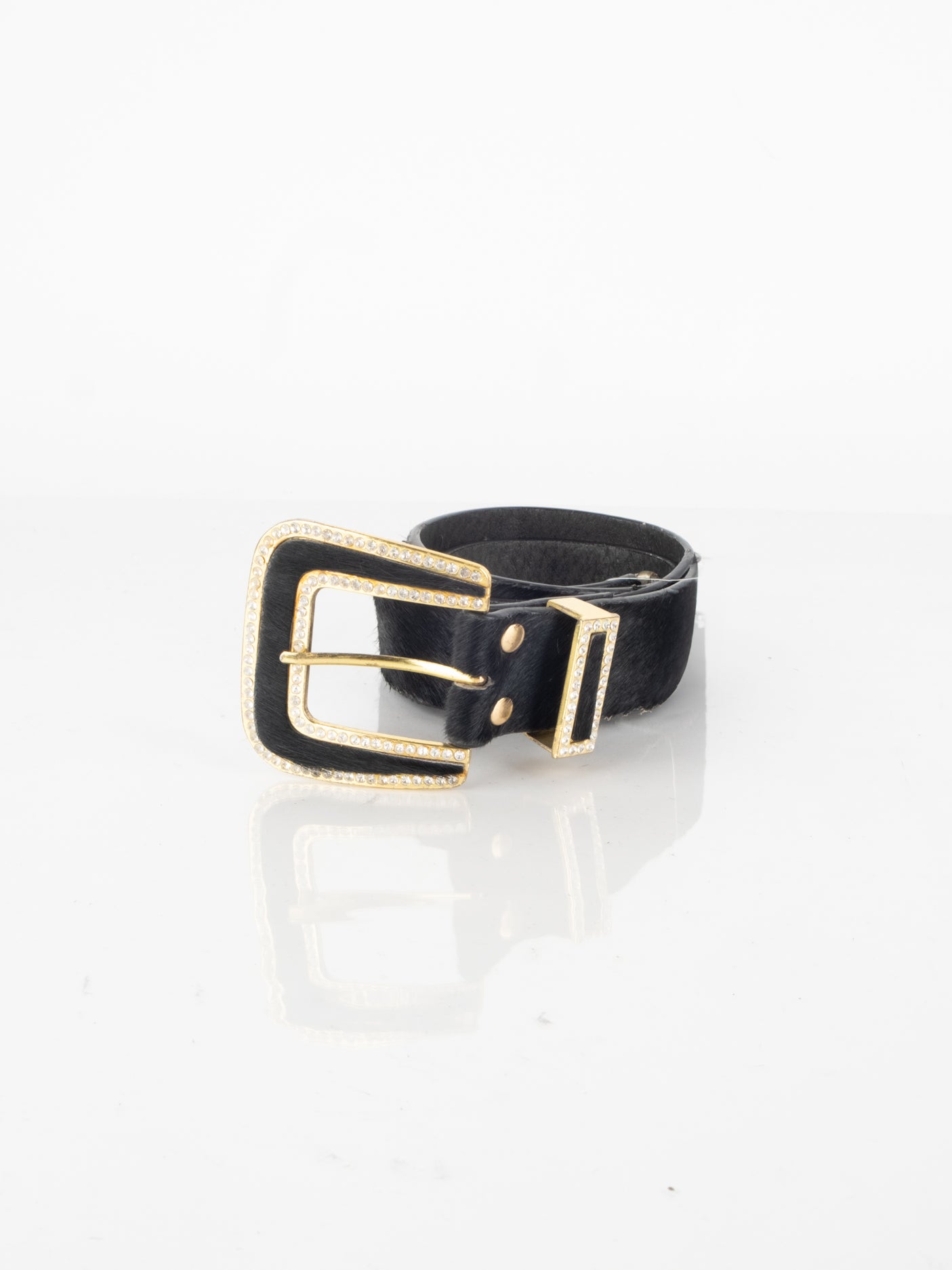 חגורה העשויה מעור בשילוב של פרווה בצבע שחור, דיטיילים מוזהבים ואבנים.
