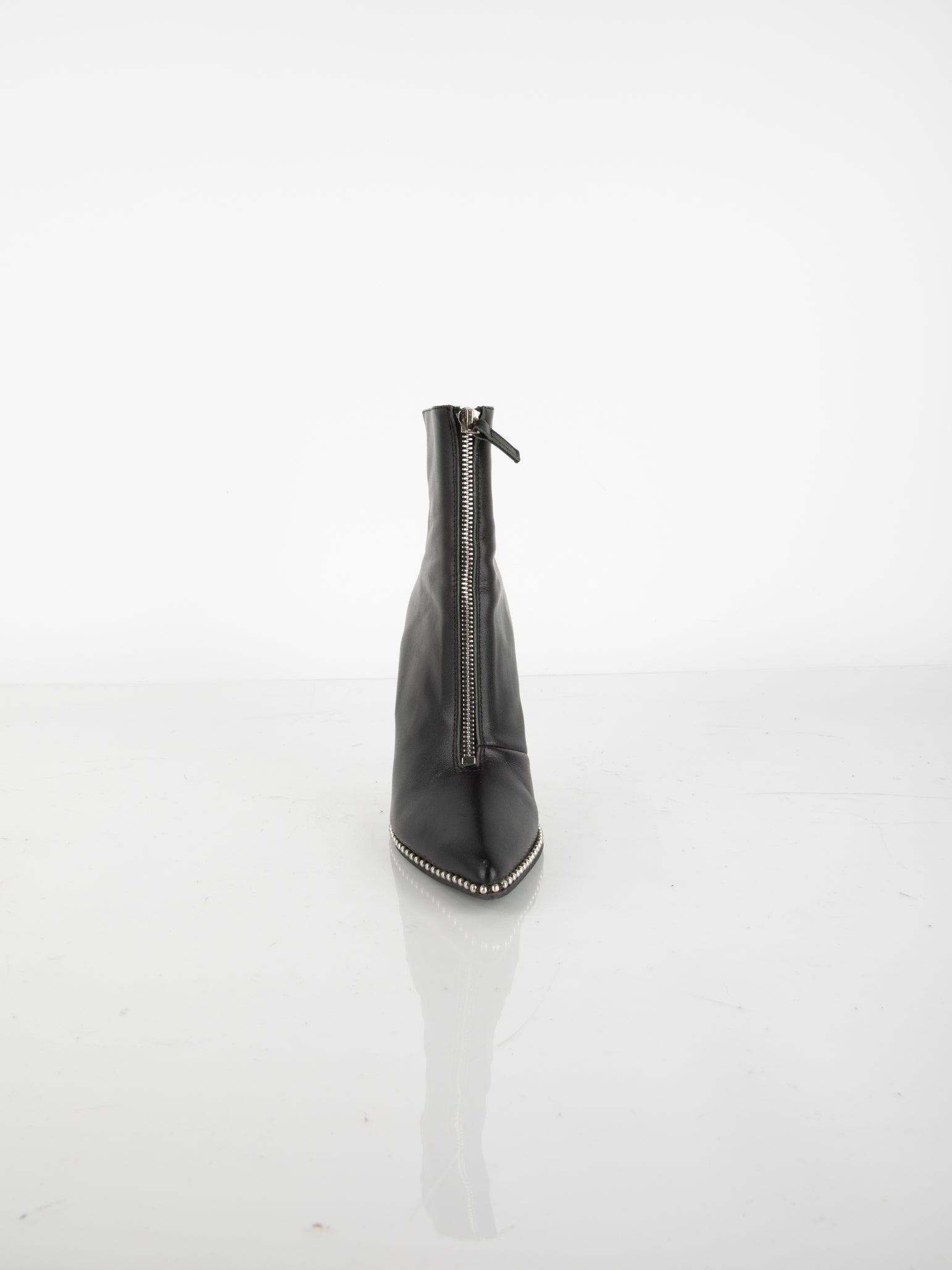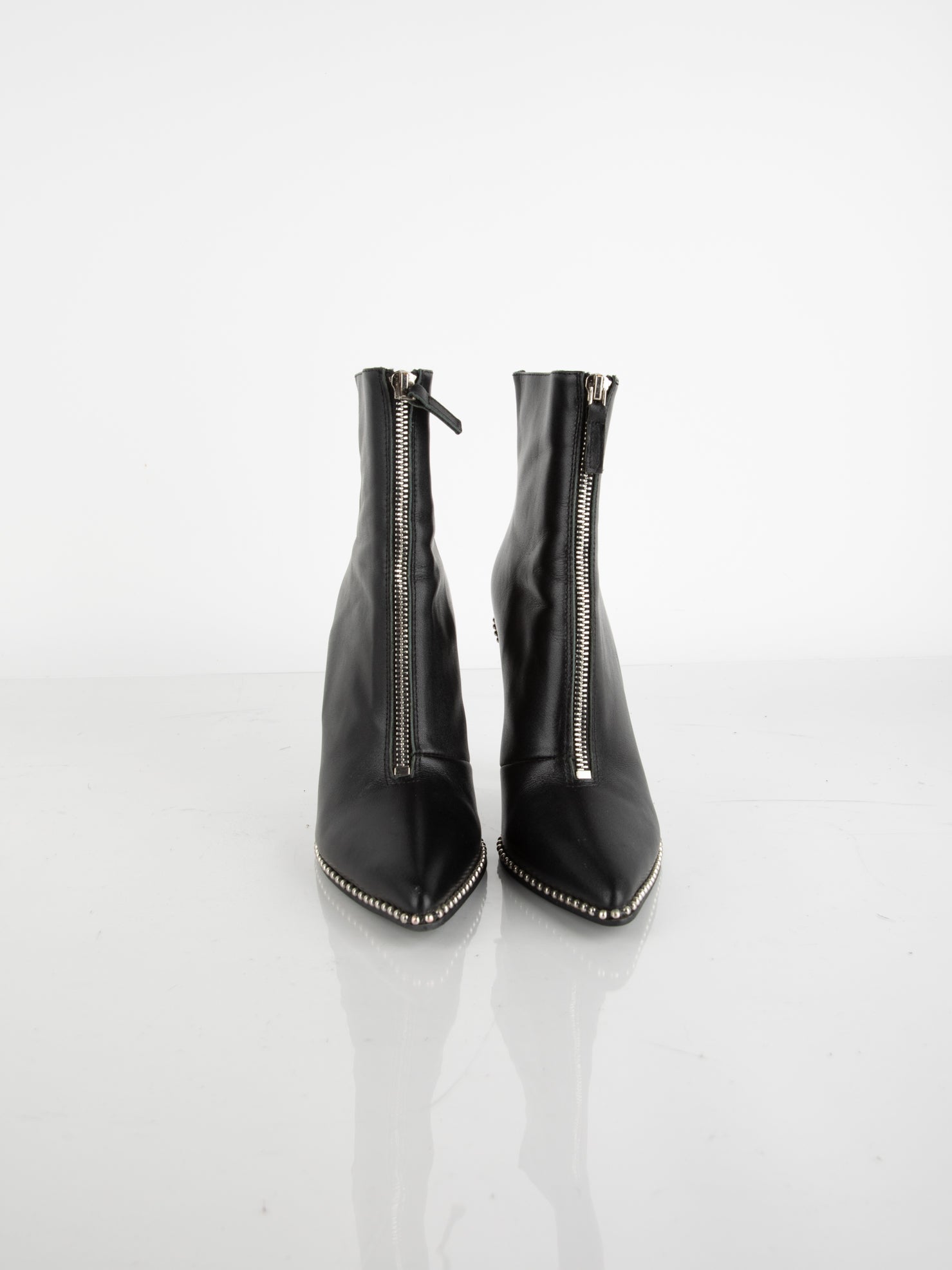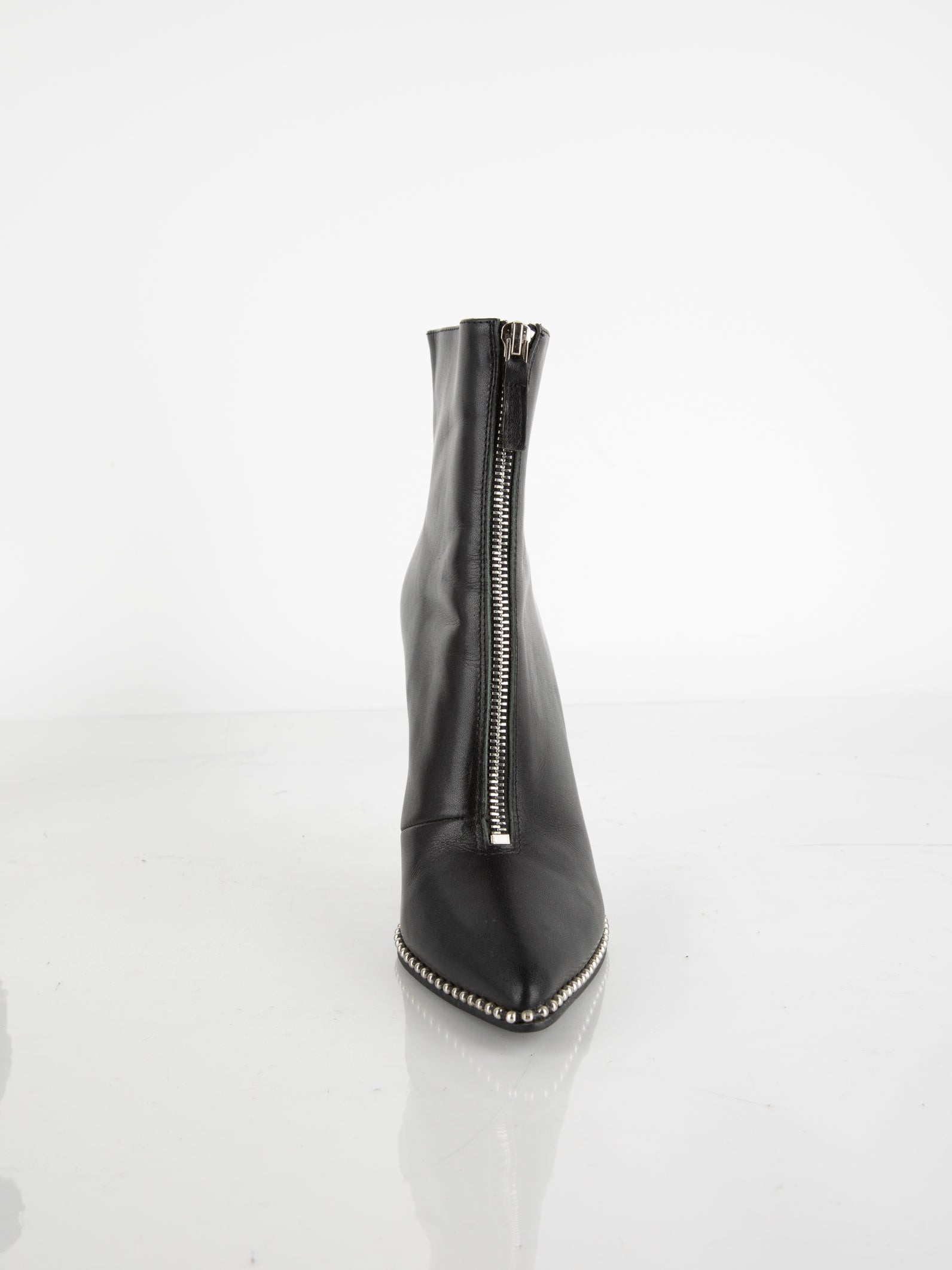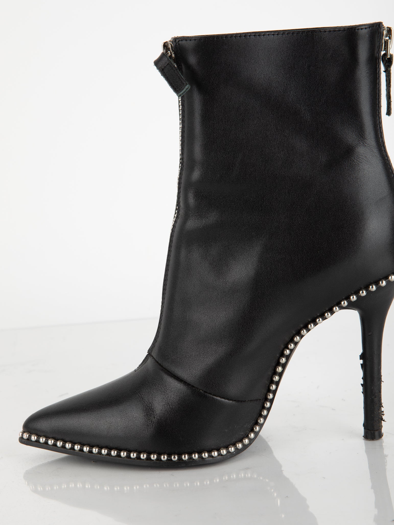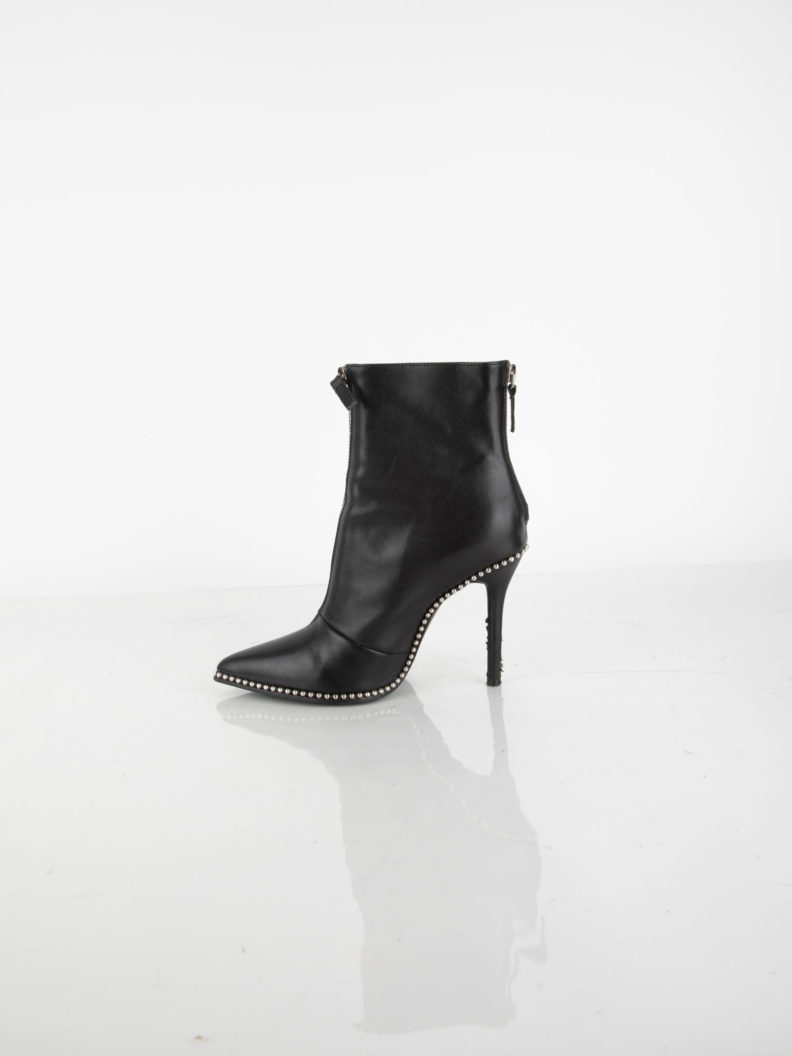 מגפיים שחורות העשויות מעור הנסגרות באמצעות רוכסן בעל ניתים מסביב ועקב דק.