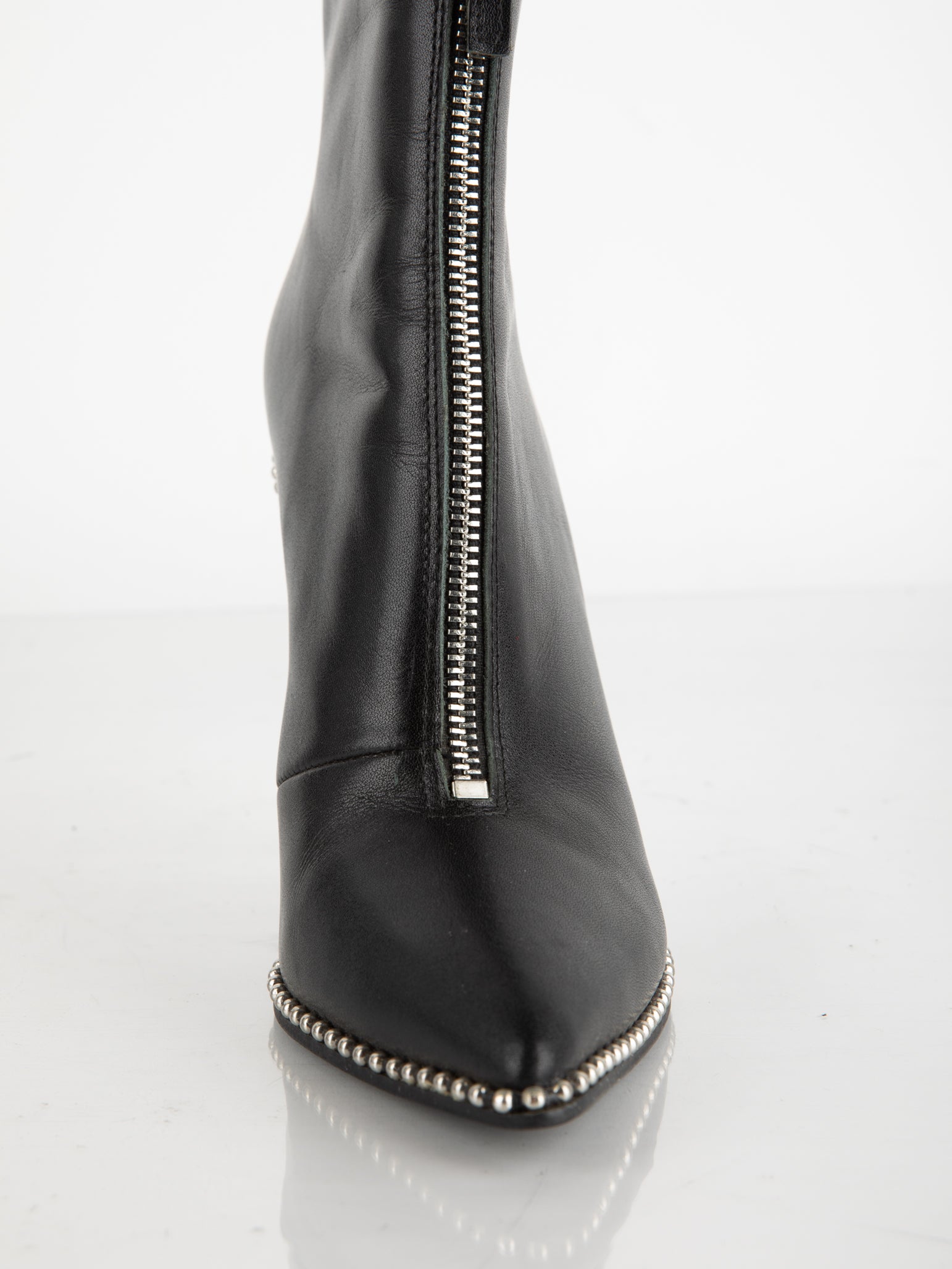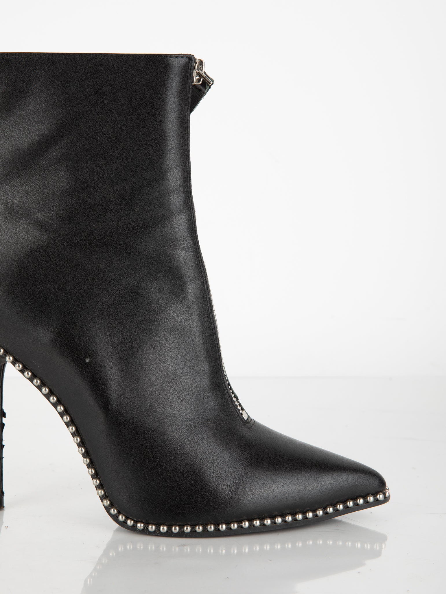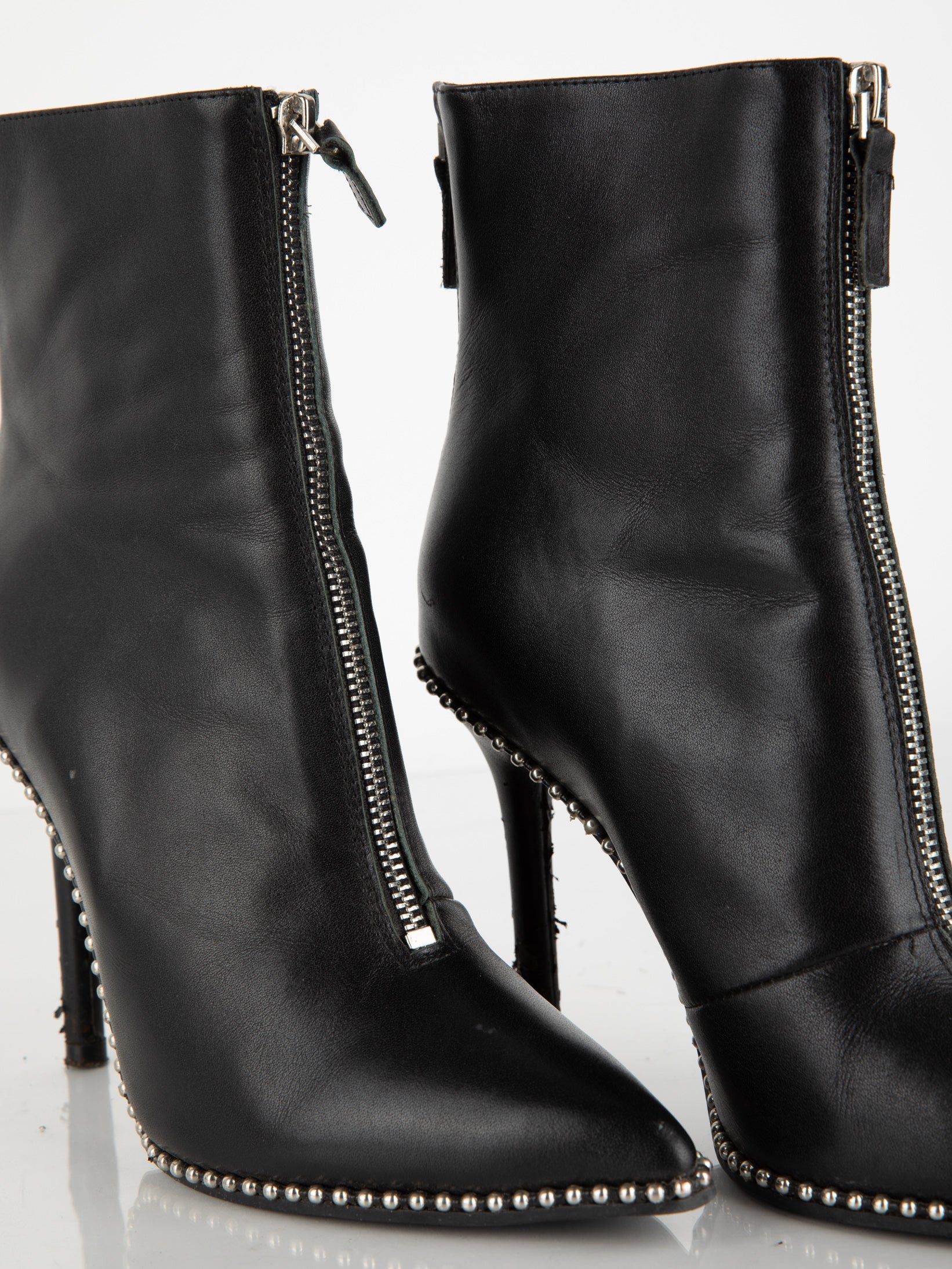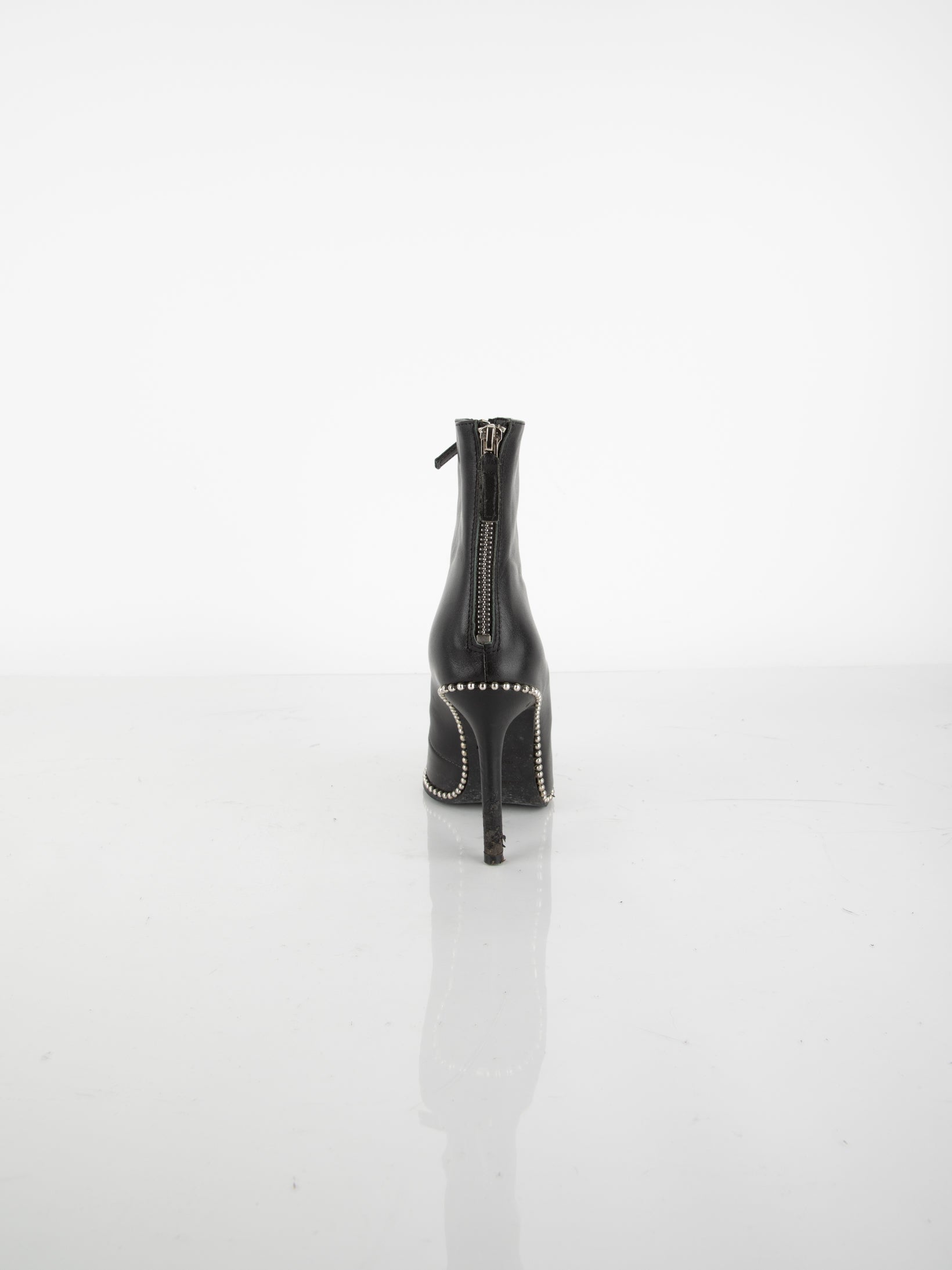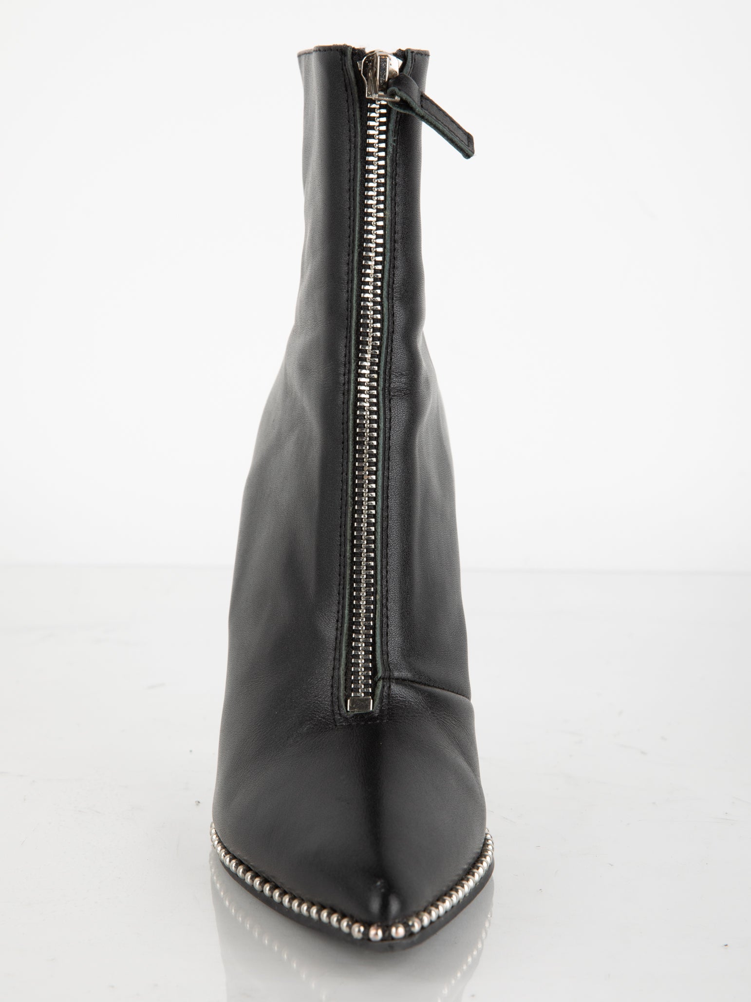 מגפיים שחורות העשויות מעור הנסגרות באמצעות רוכסן בעל ניתים מסביב ועקב דק.