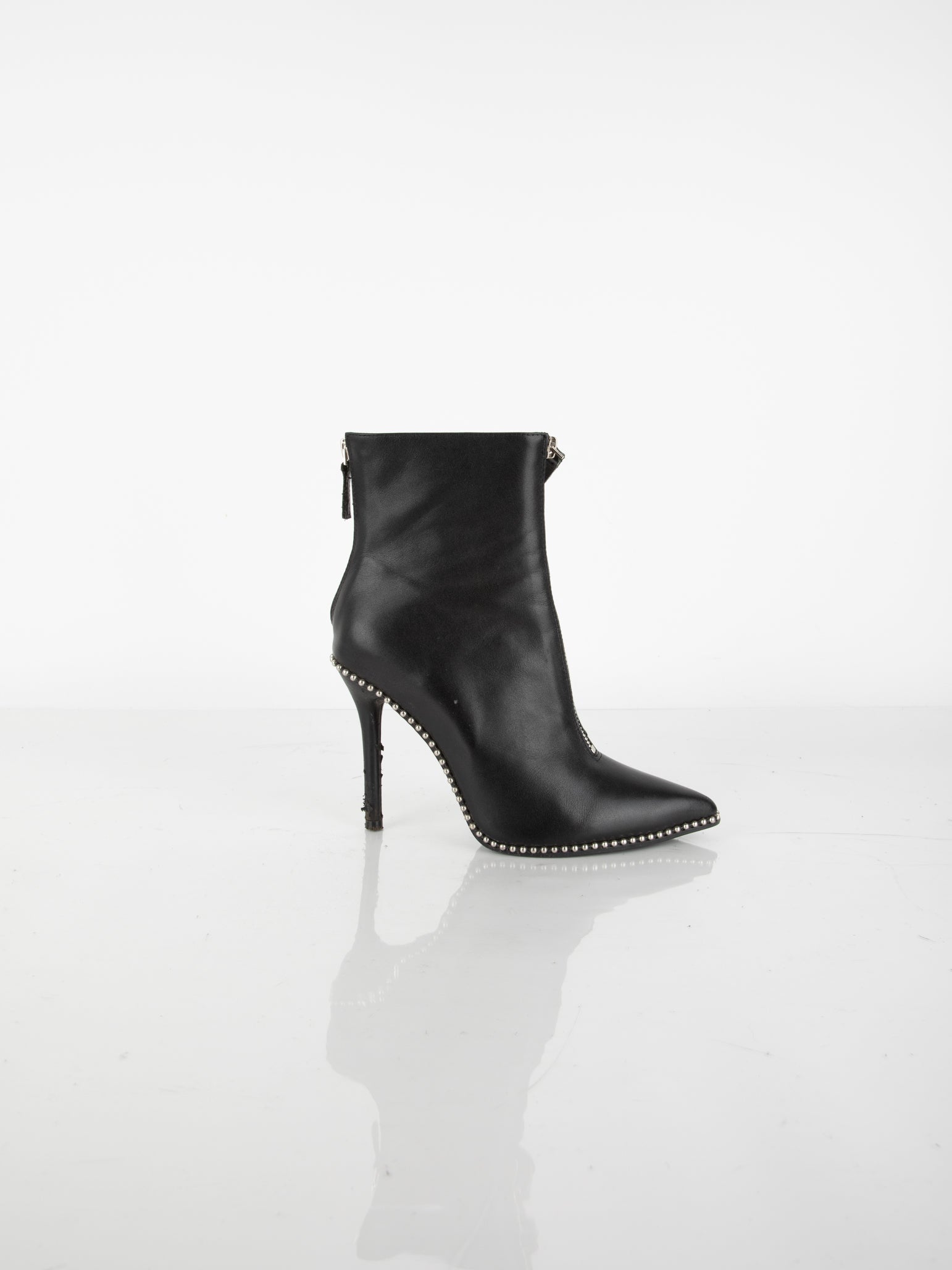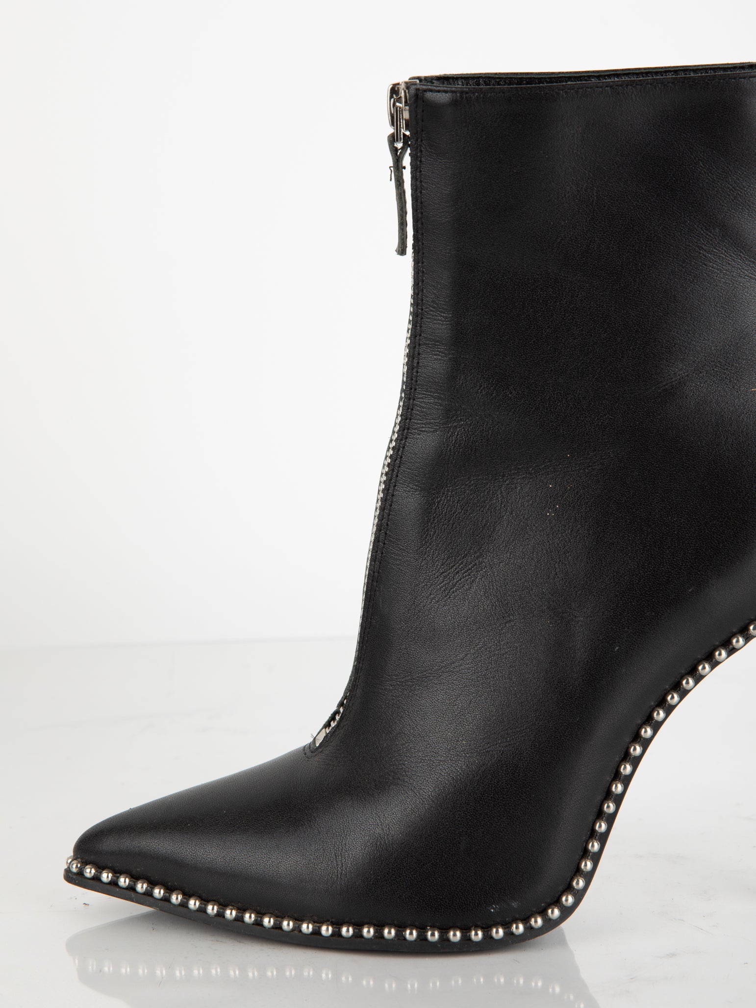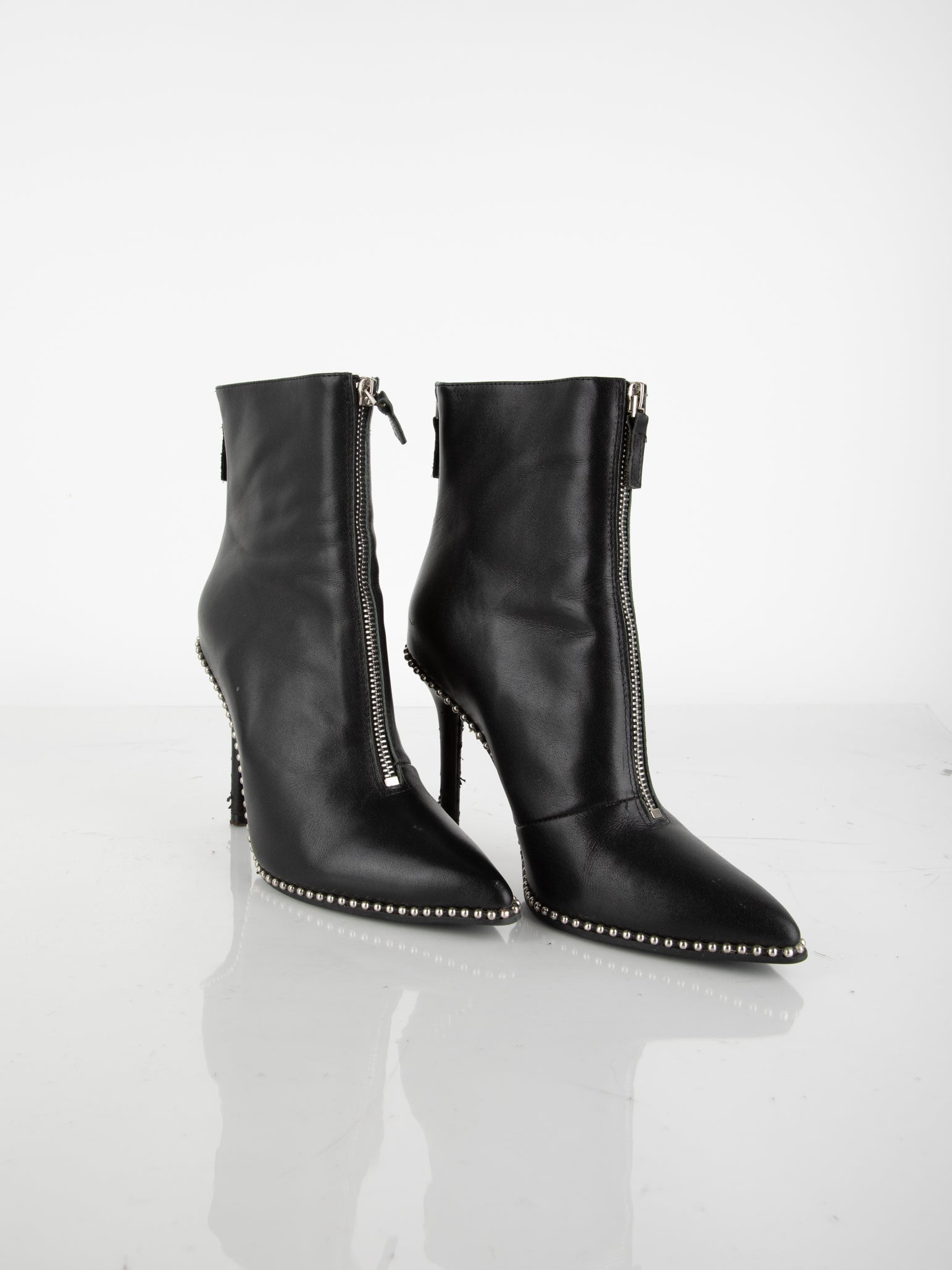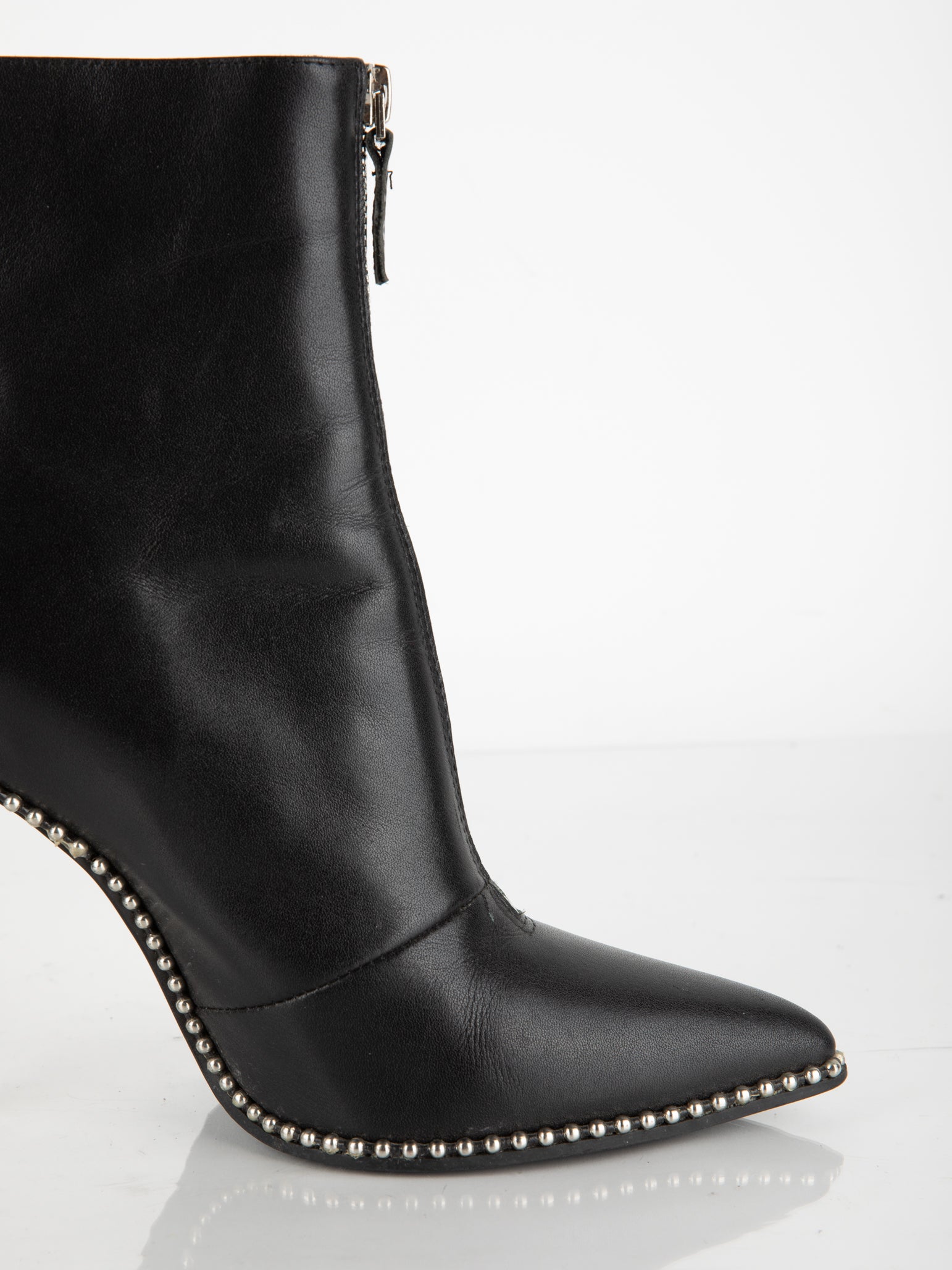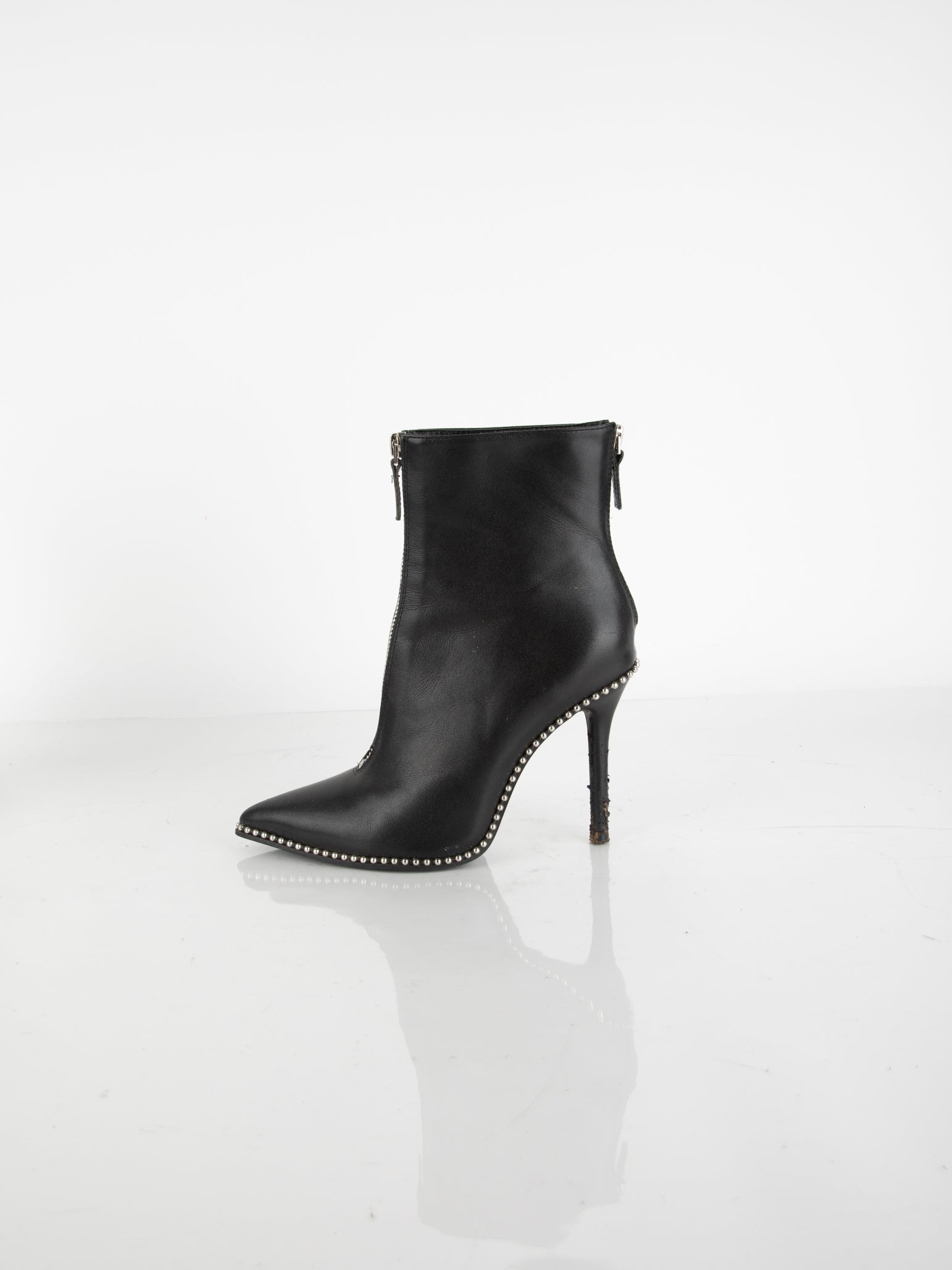 מגפיים שחורות העשויות מעור הנסגרות באמצעות רוכסן בעל ניתים מסביב ועקב דק.