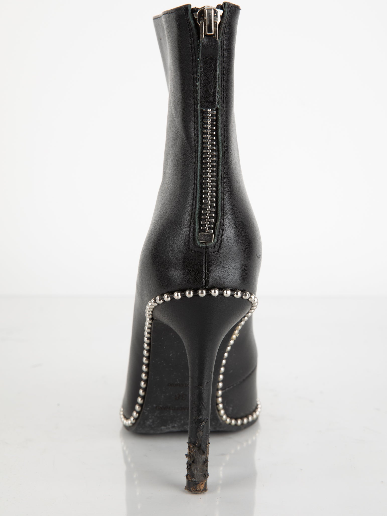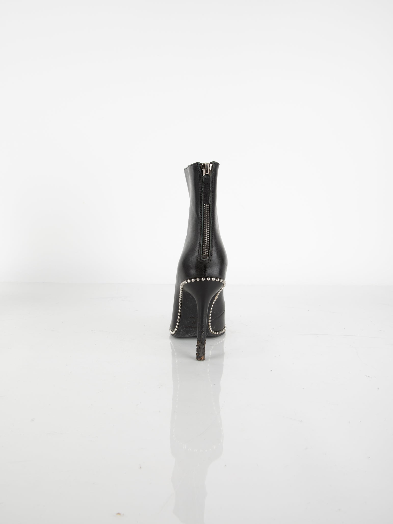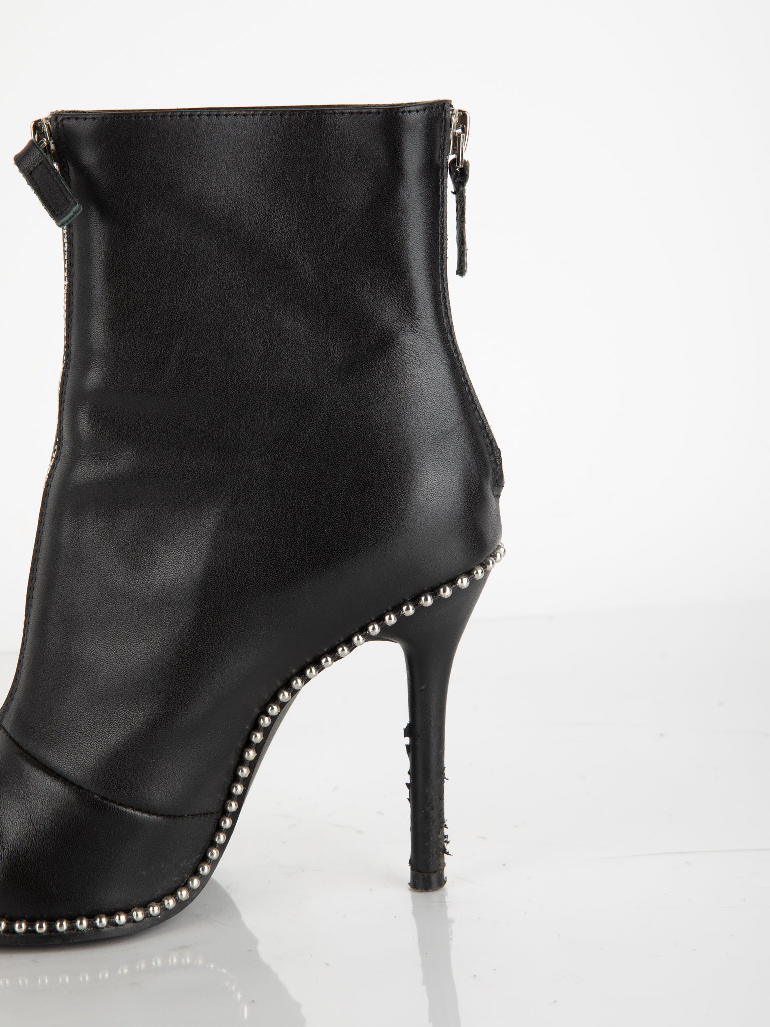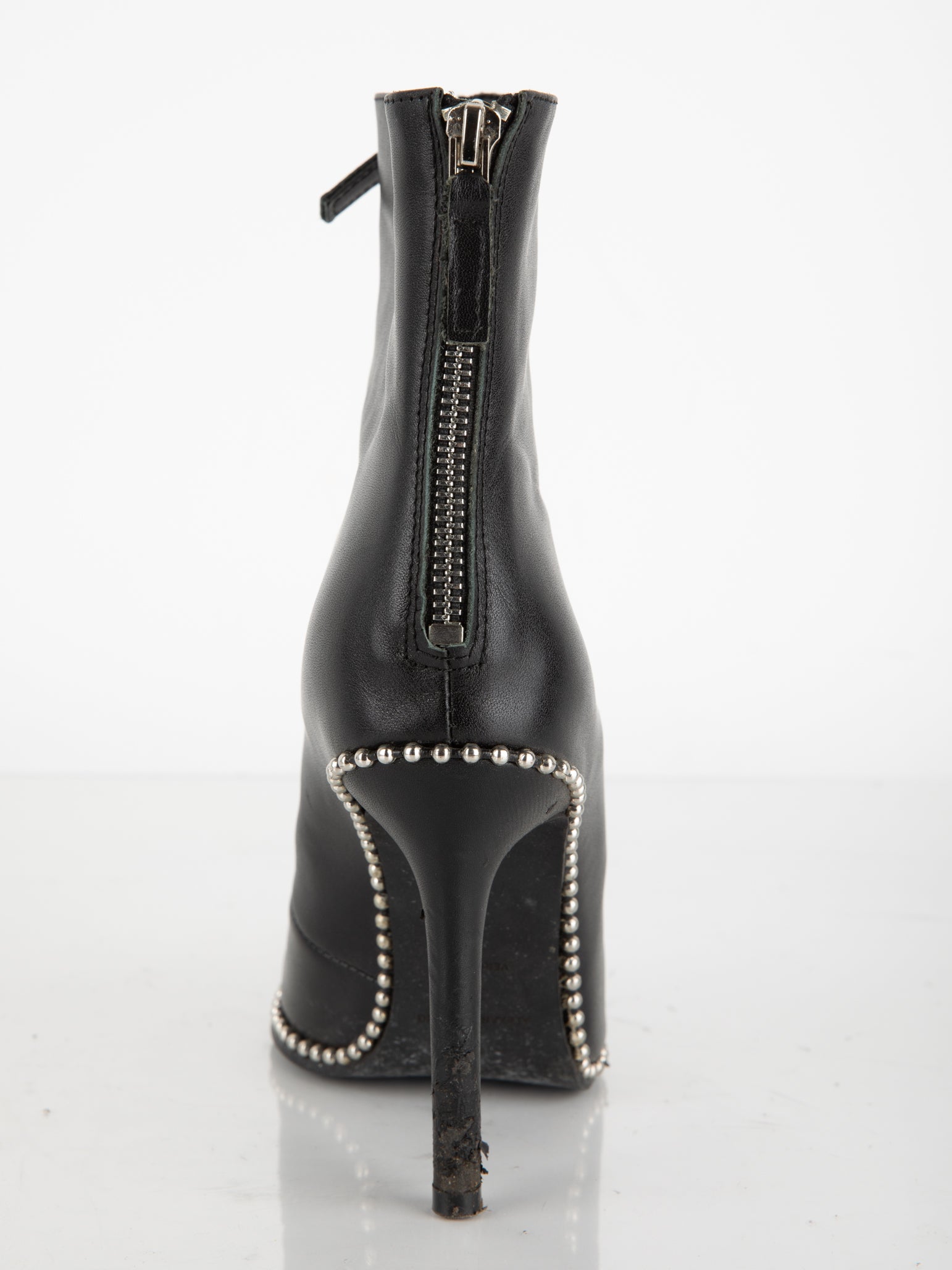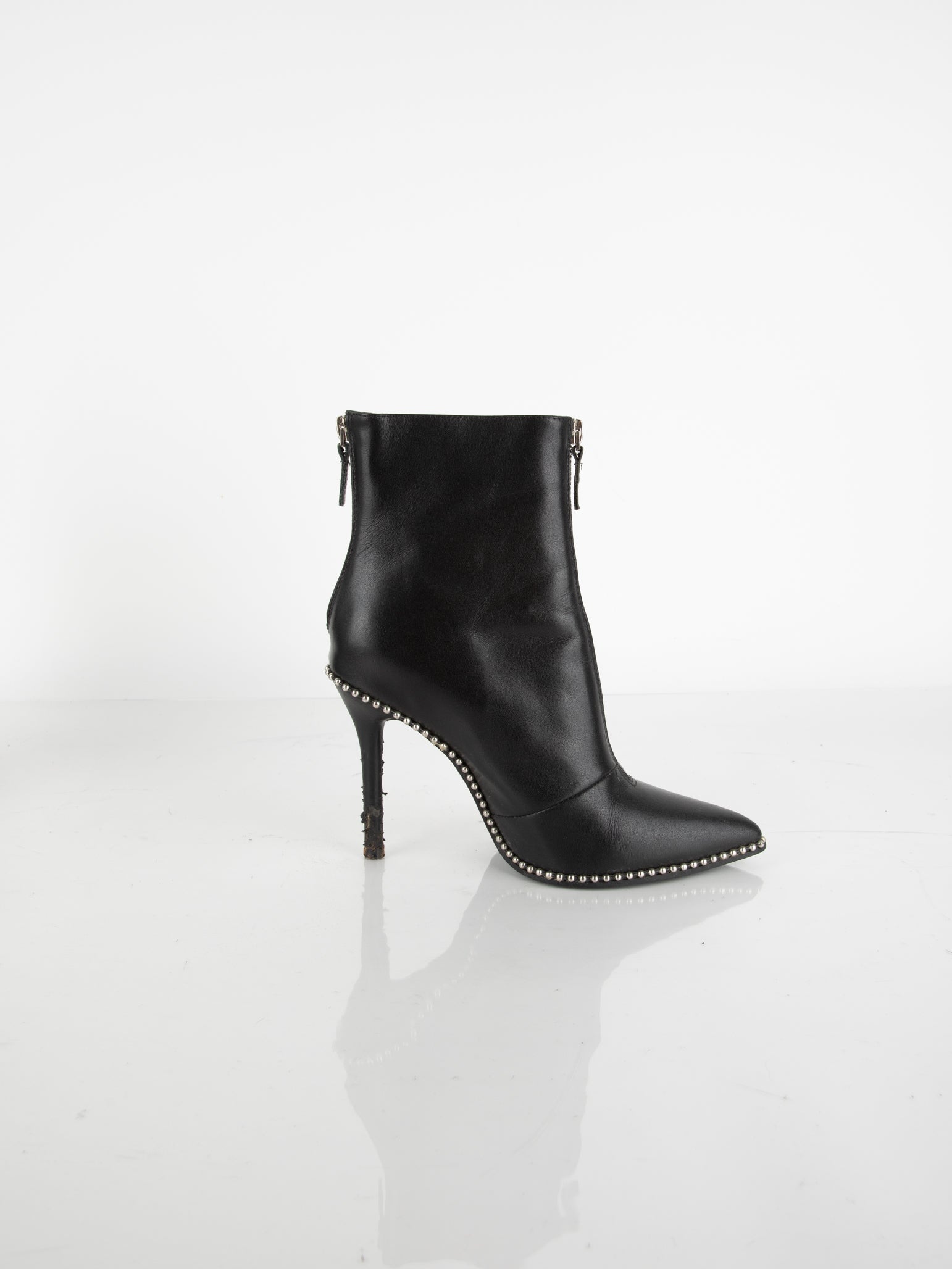 מגפיים שחורות העשויות מעור הנסגרות באמצעות רוכסן בעל ניתים מסביב ועקב דק.