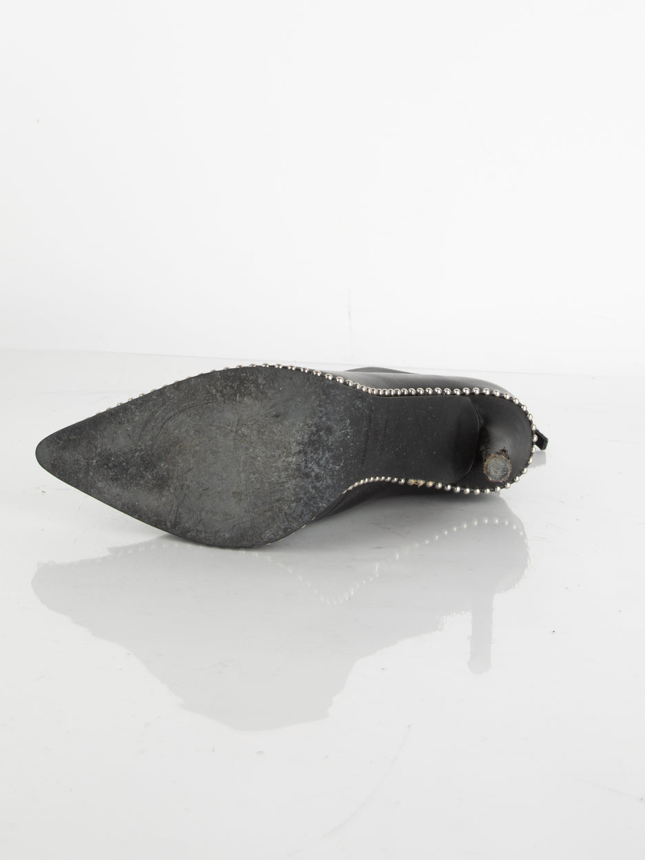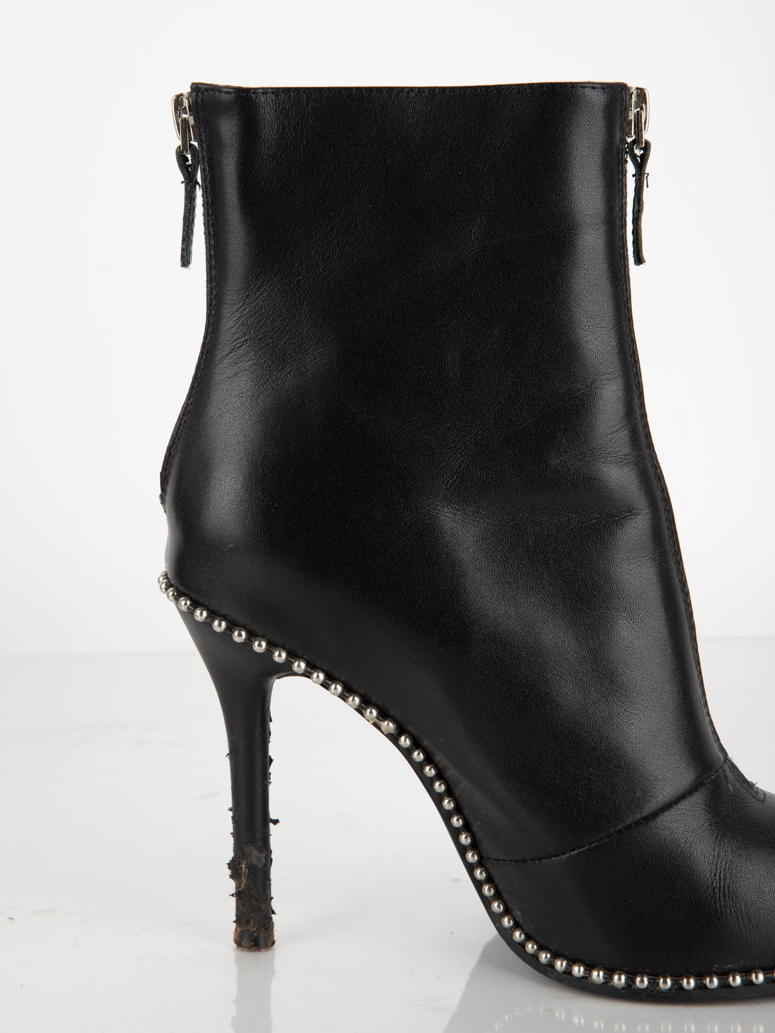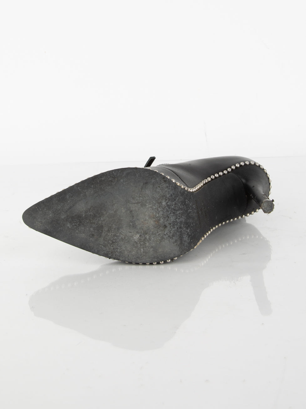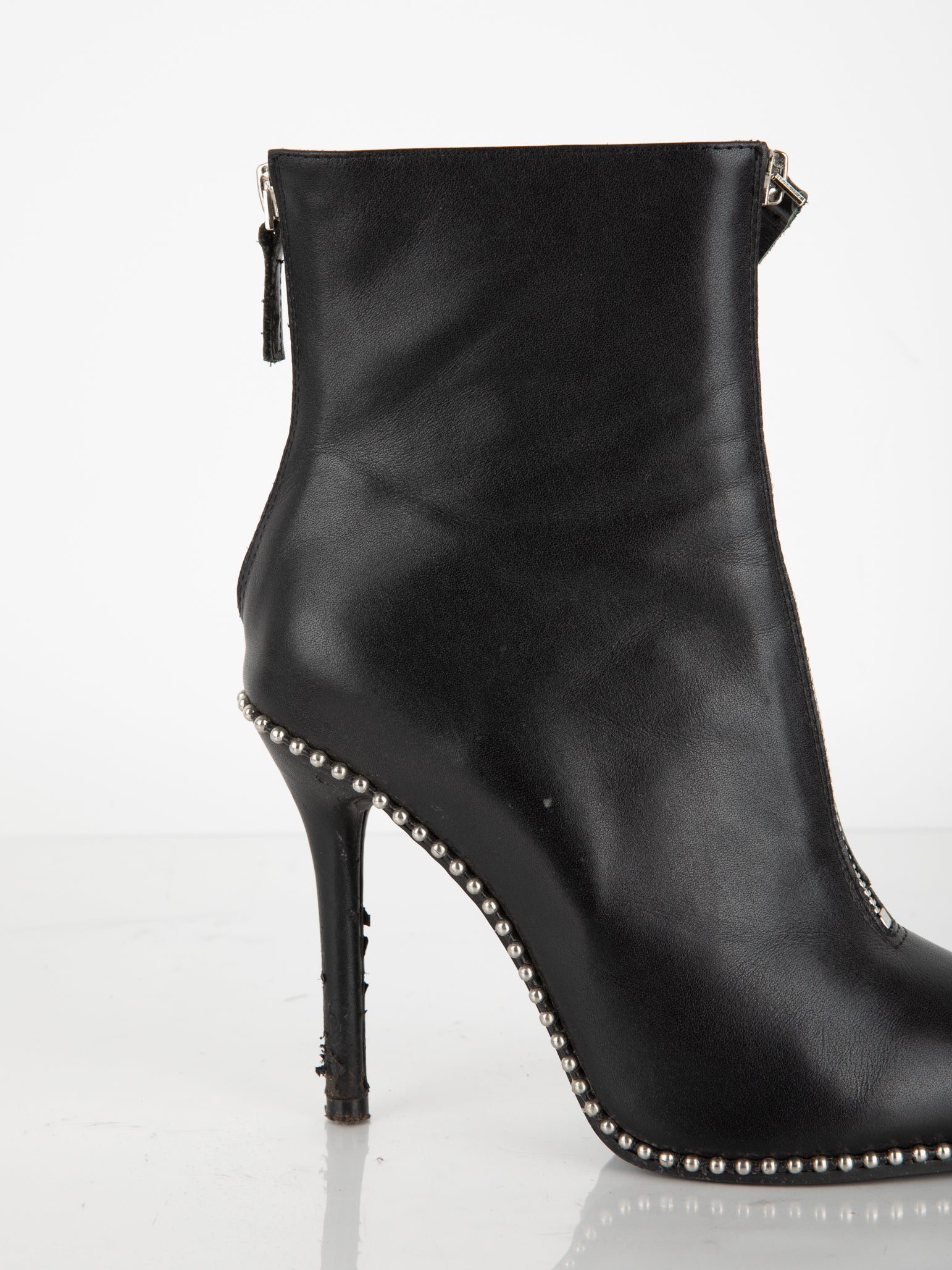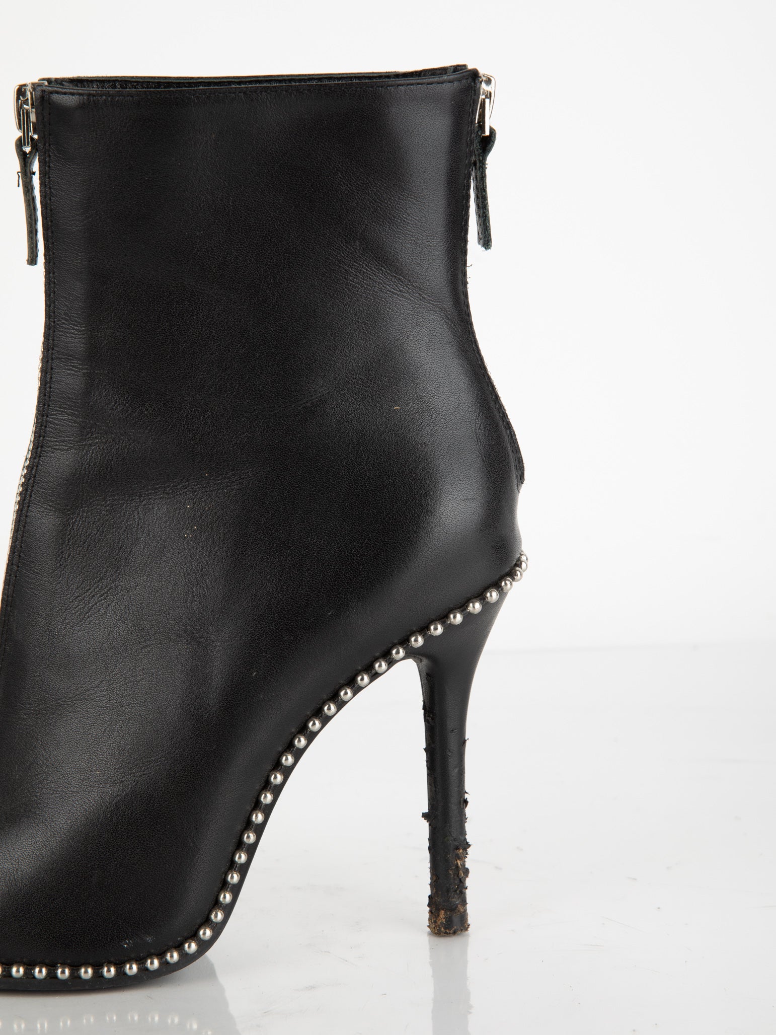 מגפיים שחורות העשויות מעור הנסגרות באמצעות רוכסן בעל ניתים מסביב ועקב דק.