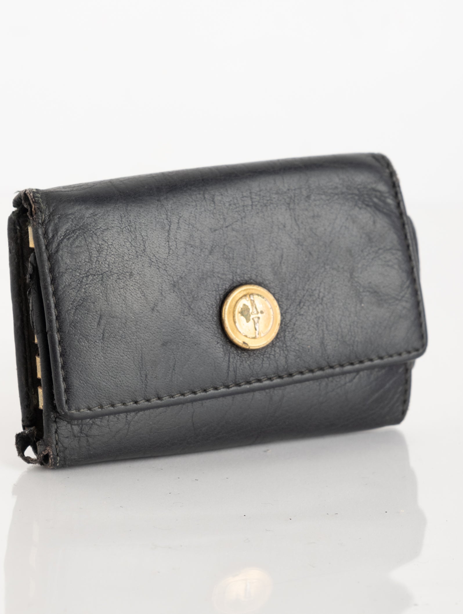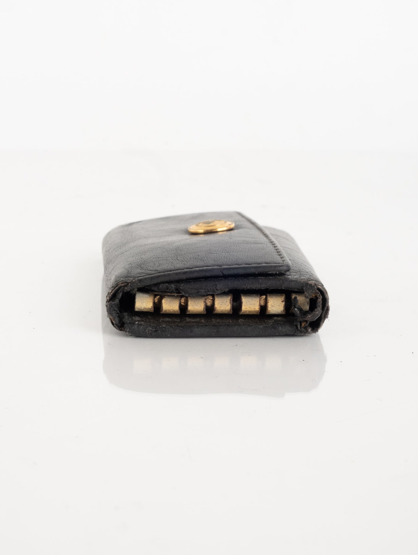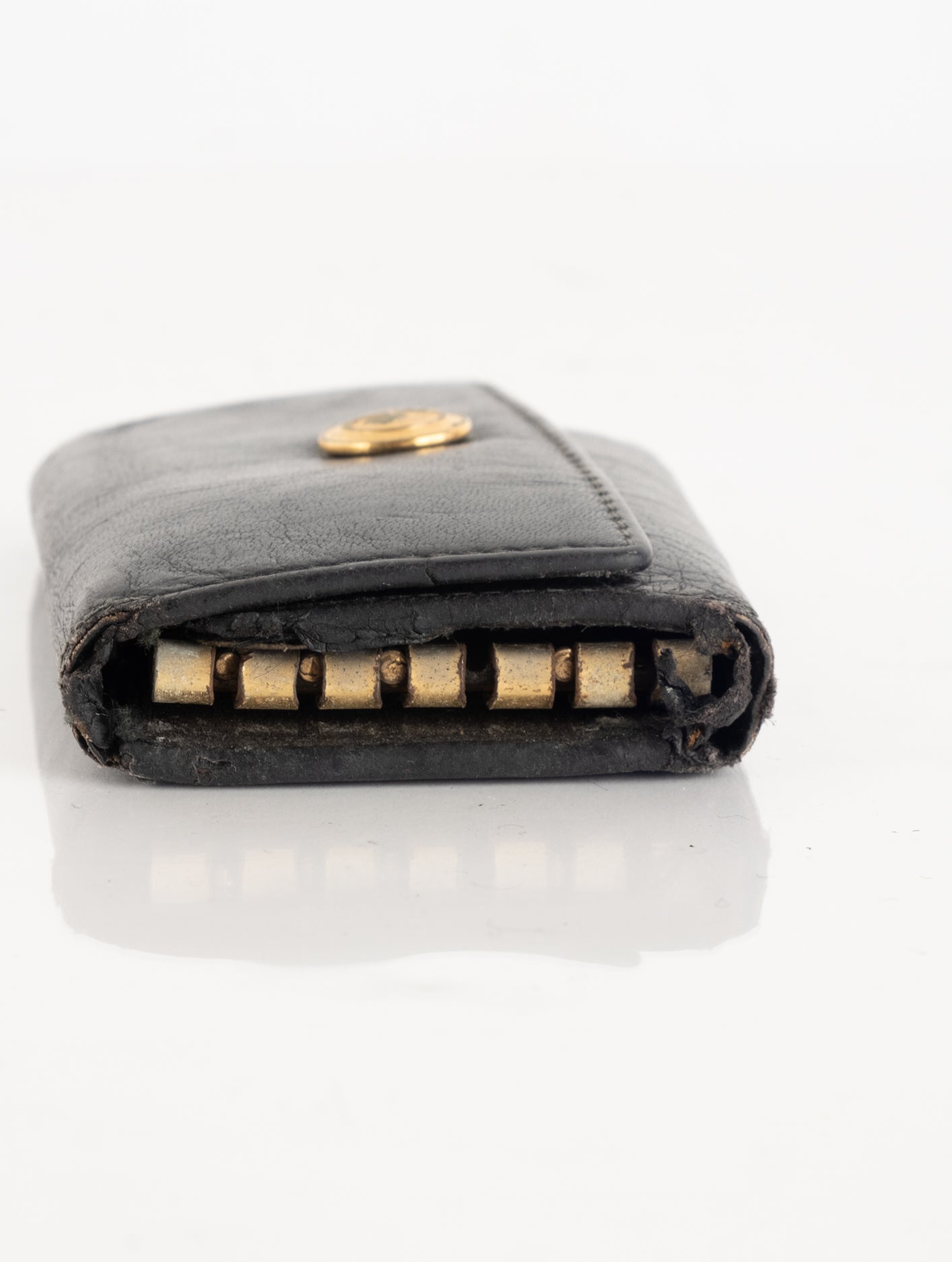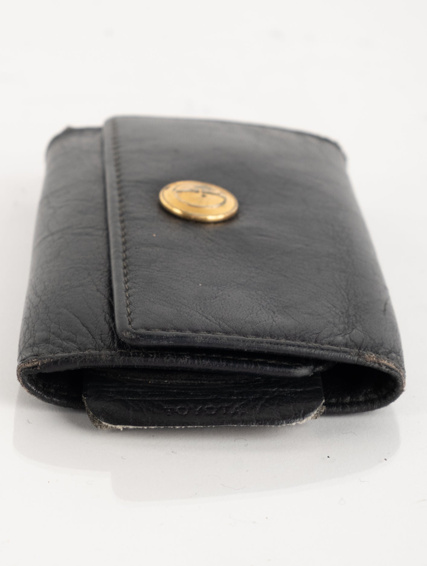 כיסוי למפתחות בצבע שחור העשוי מעור הנסגר באמצעות סוגר תיק-תק מוזהב.