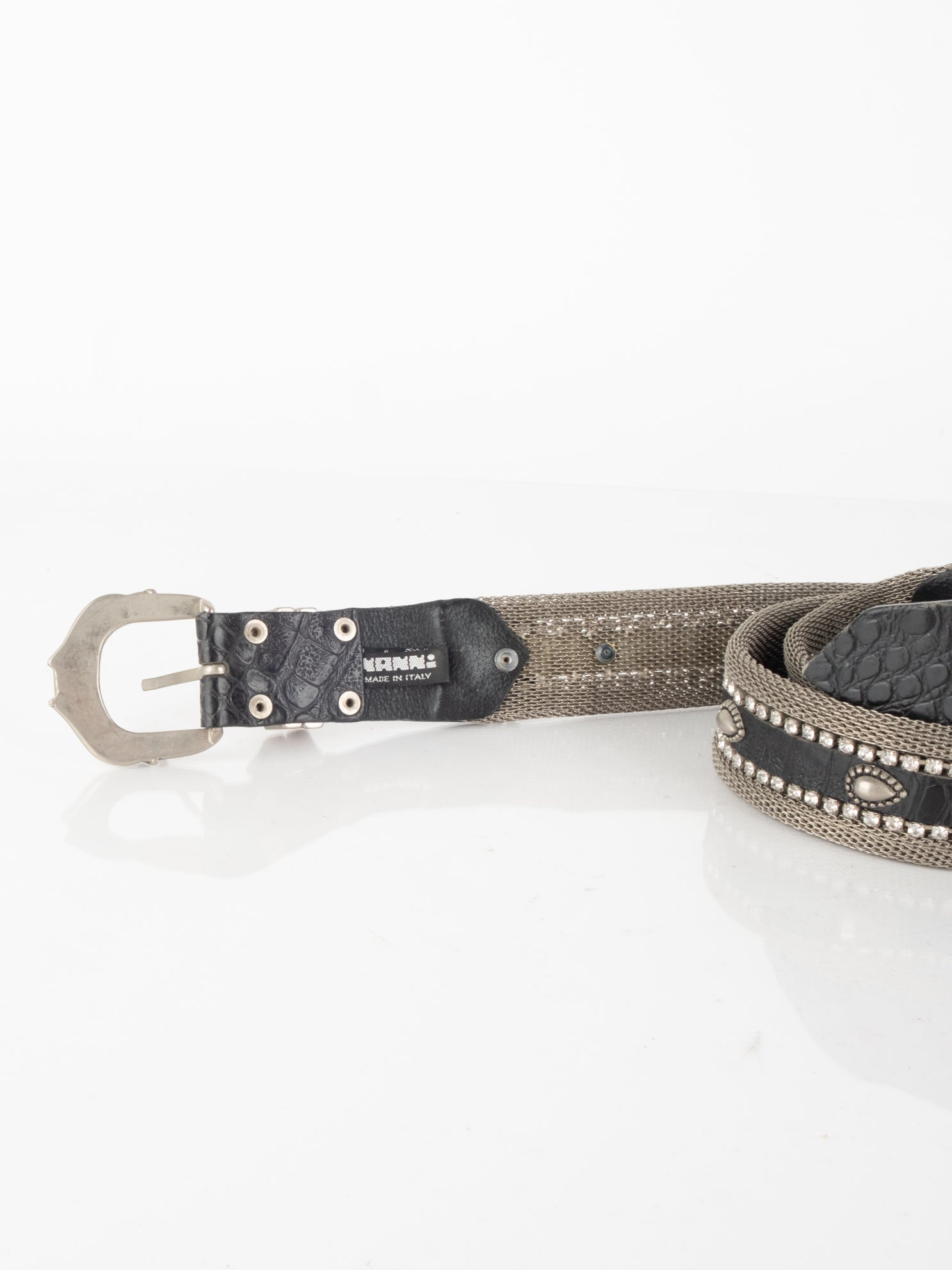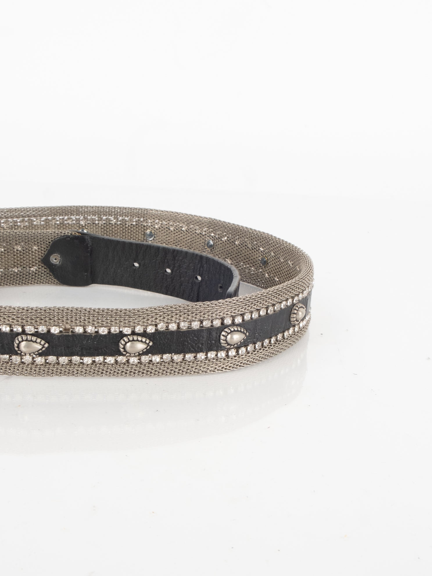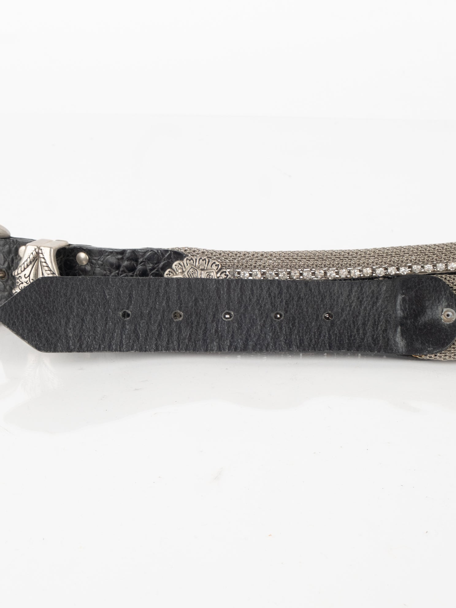 חגורה העשוי ממתכת בשילוב של עור בצבע כסוף עם אבנים.