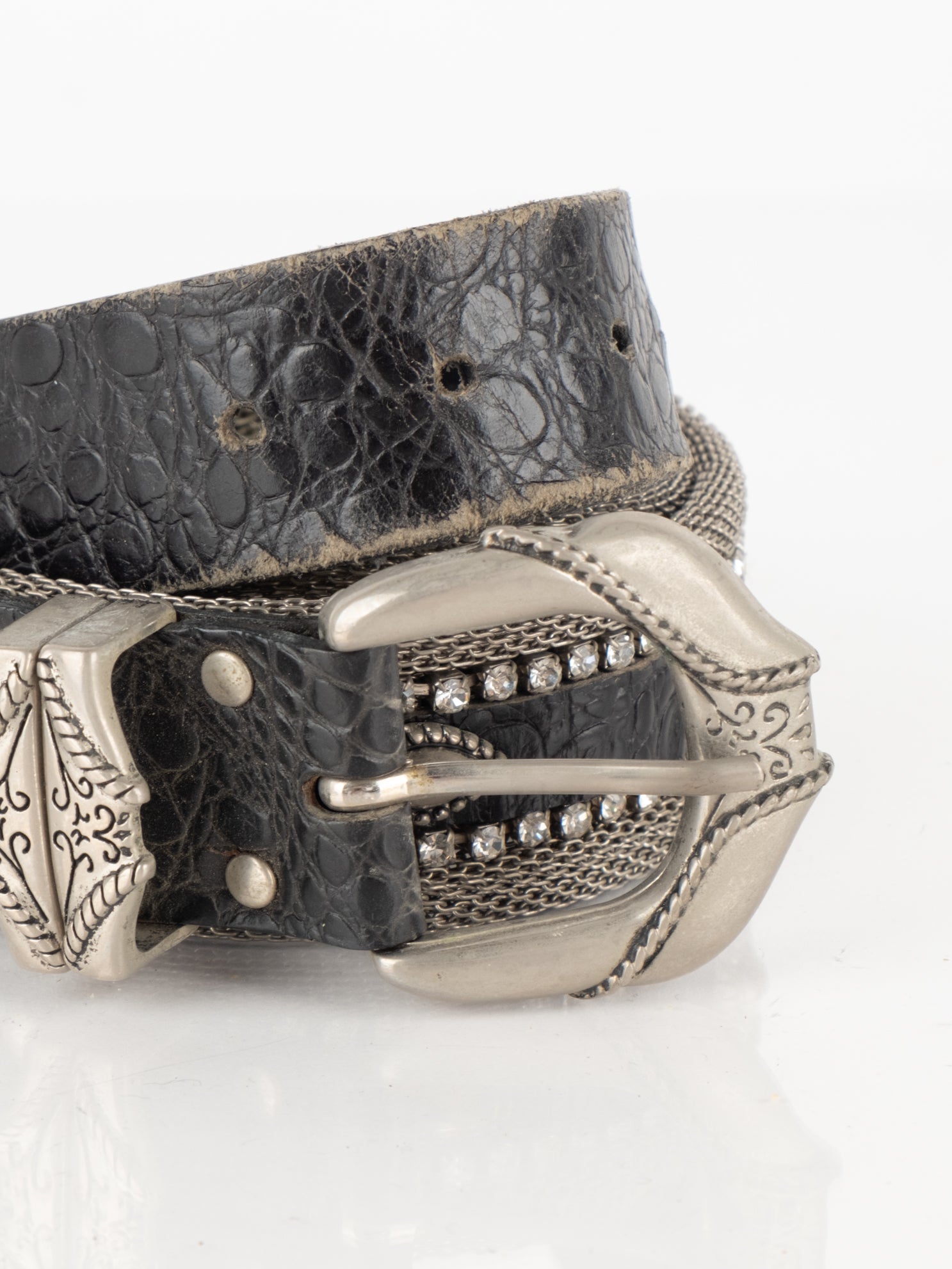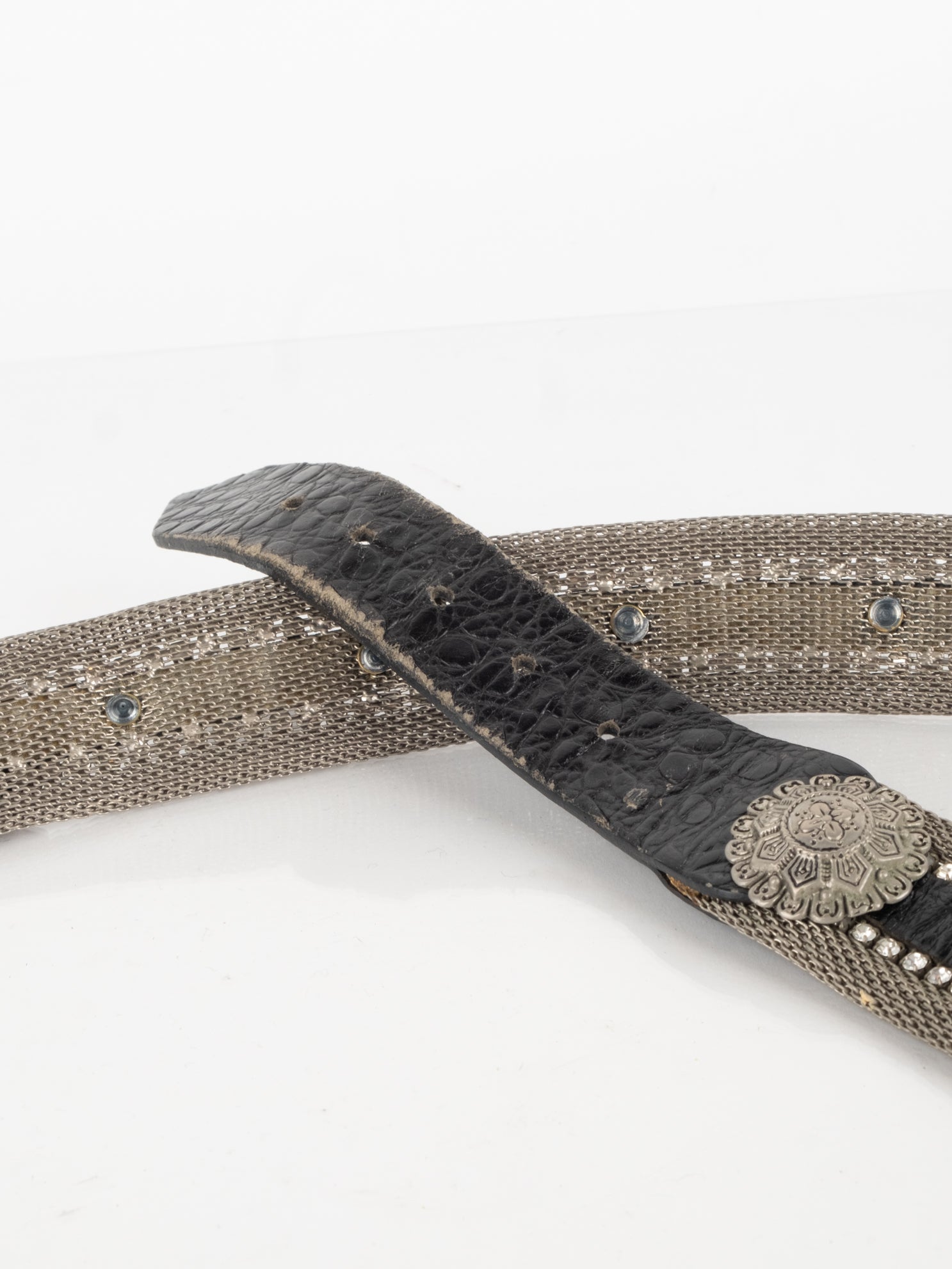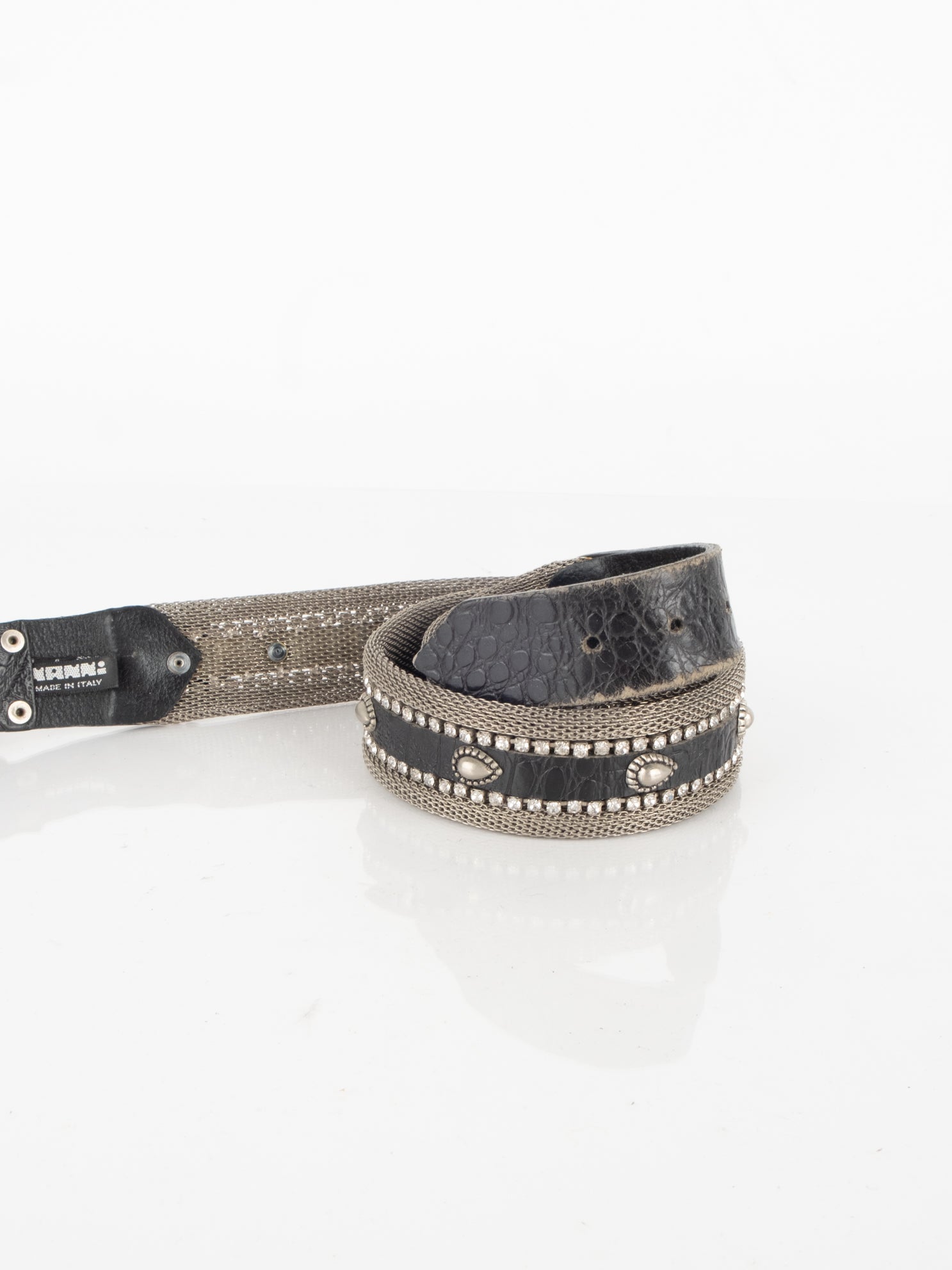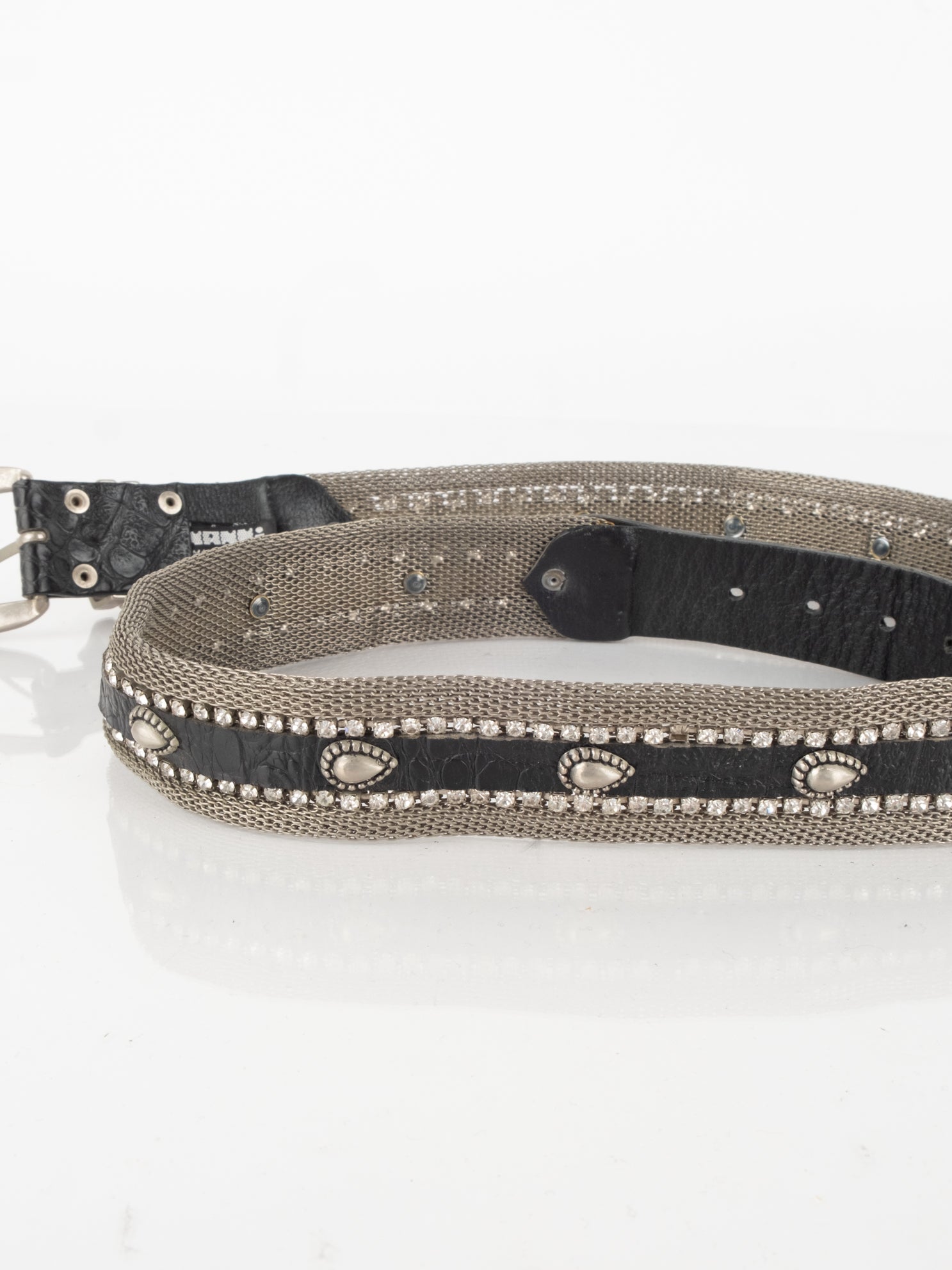 חגורה העשוי ממתכת בשילוב של עור בצבע כסוף עם אבנים.