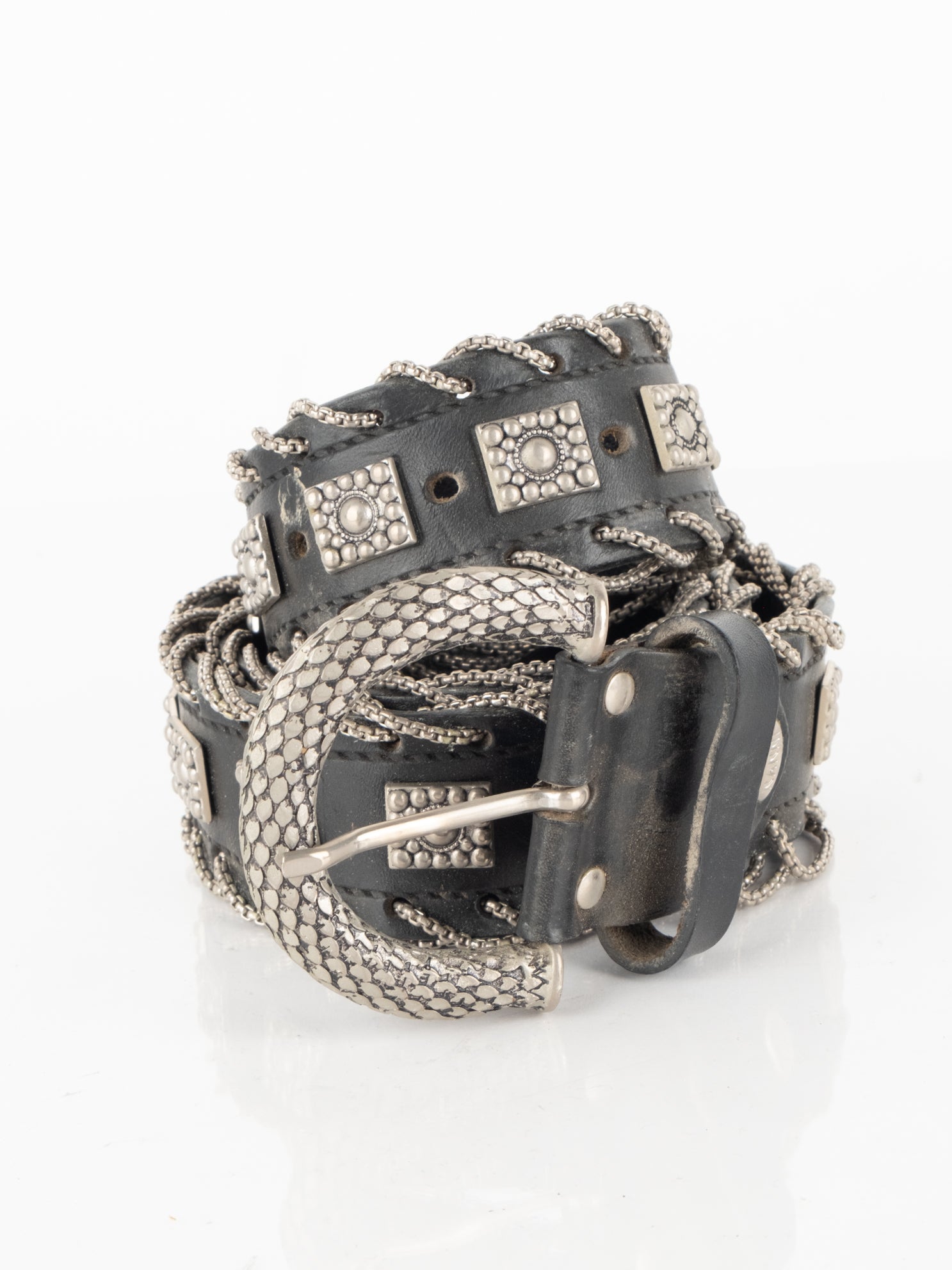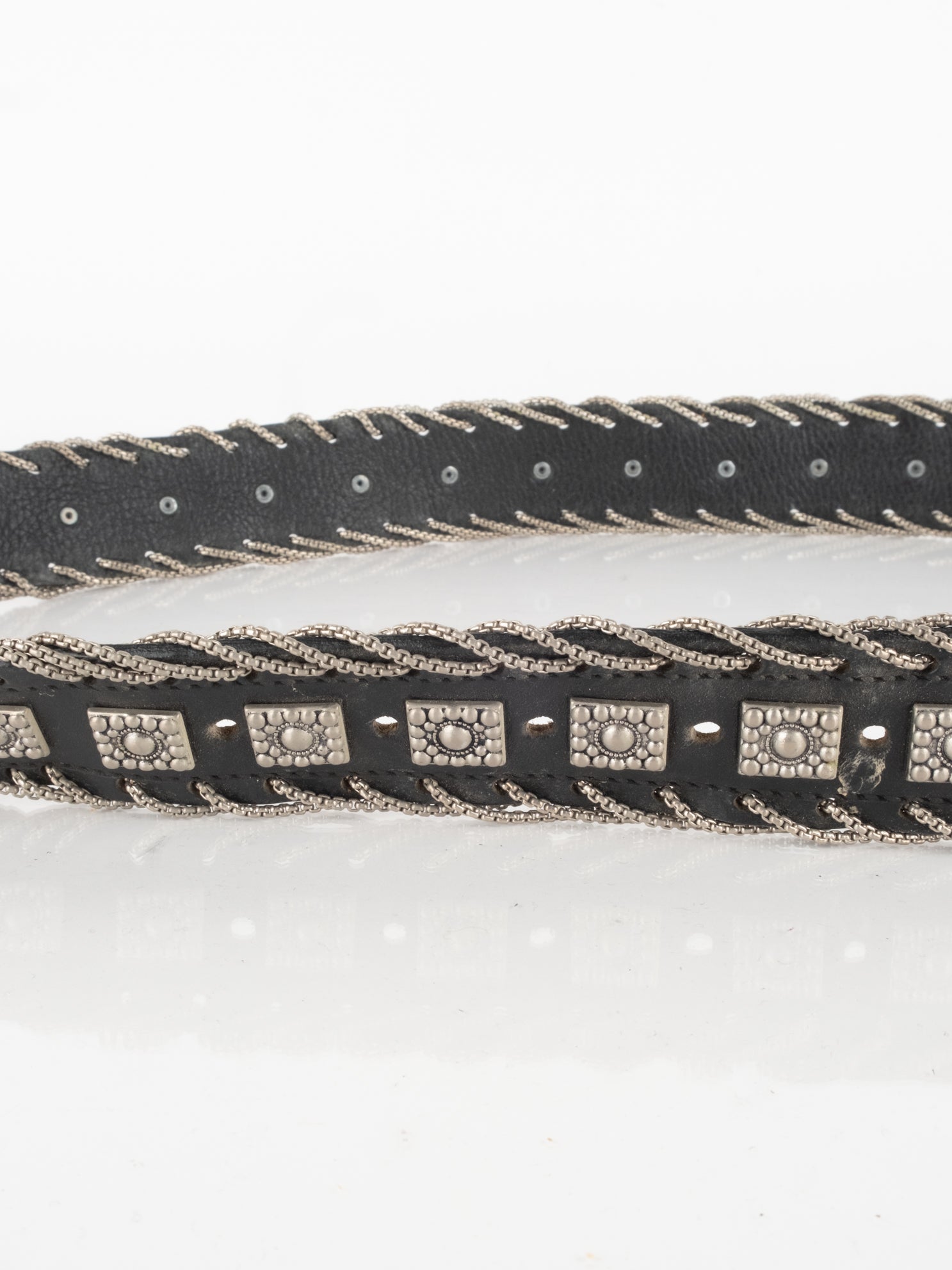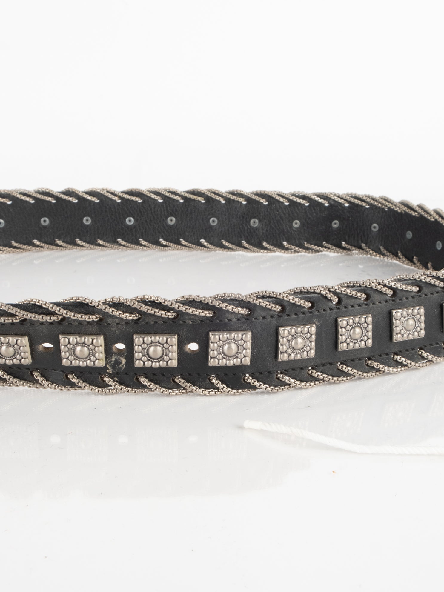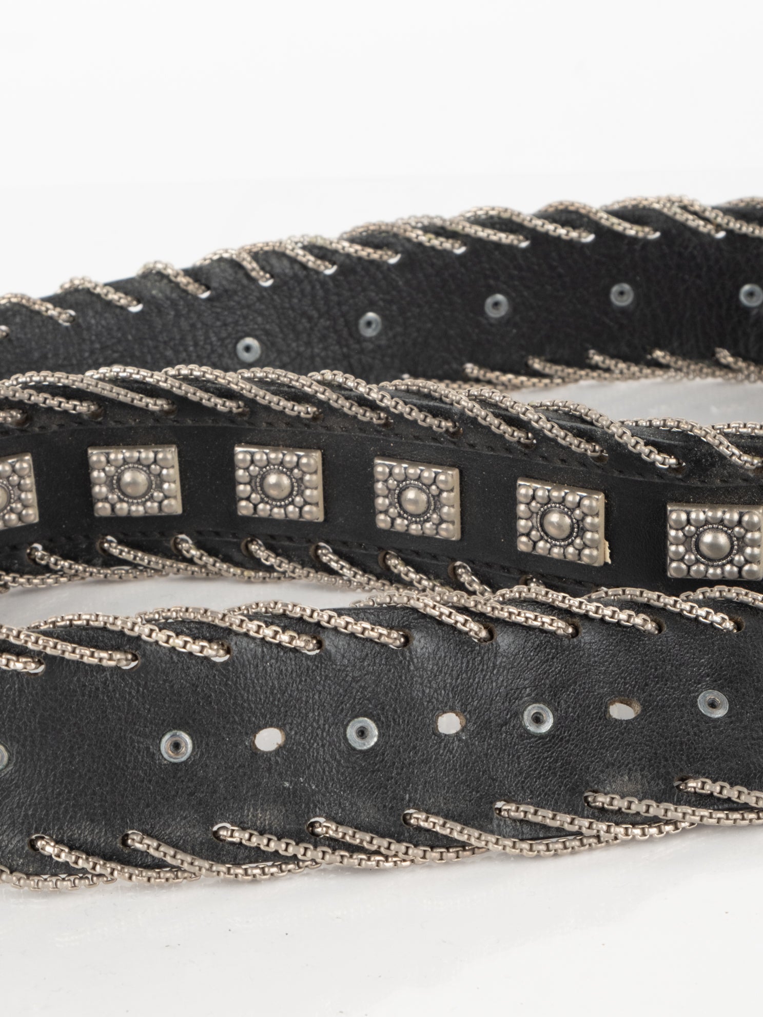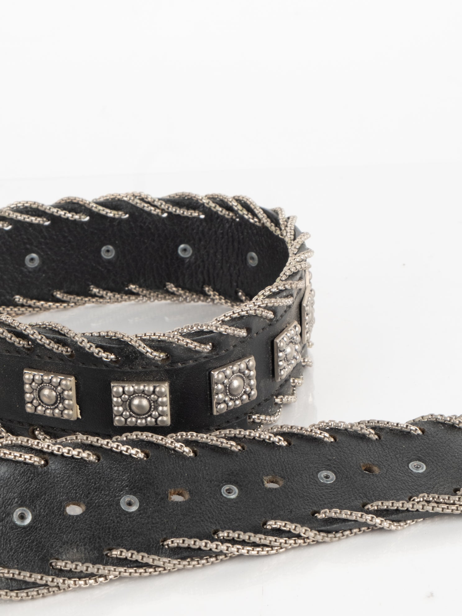 חגורה העשויה מעור בצבע אשחור בשילוב של קישוטים ממתכת.