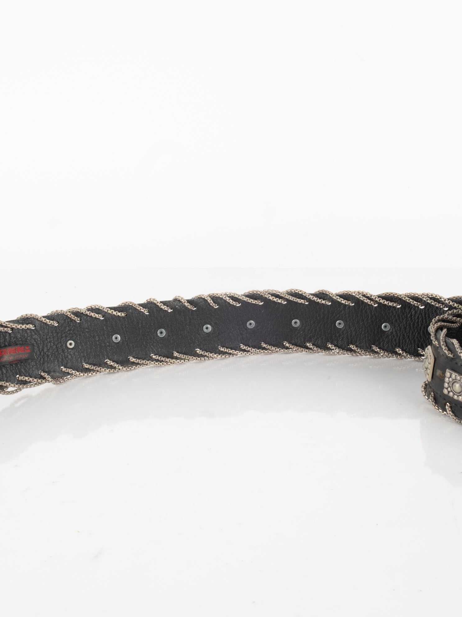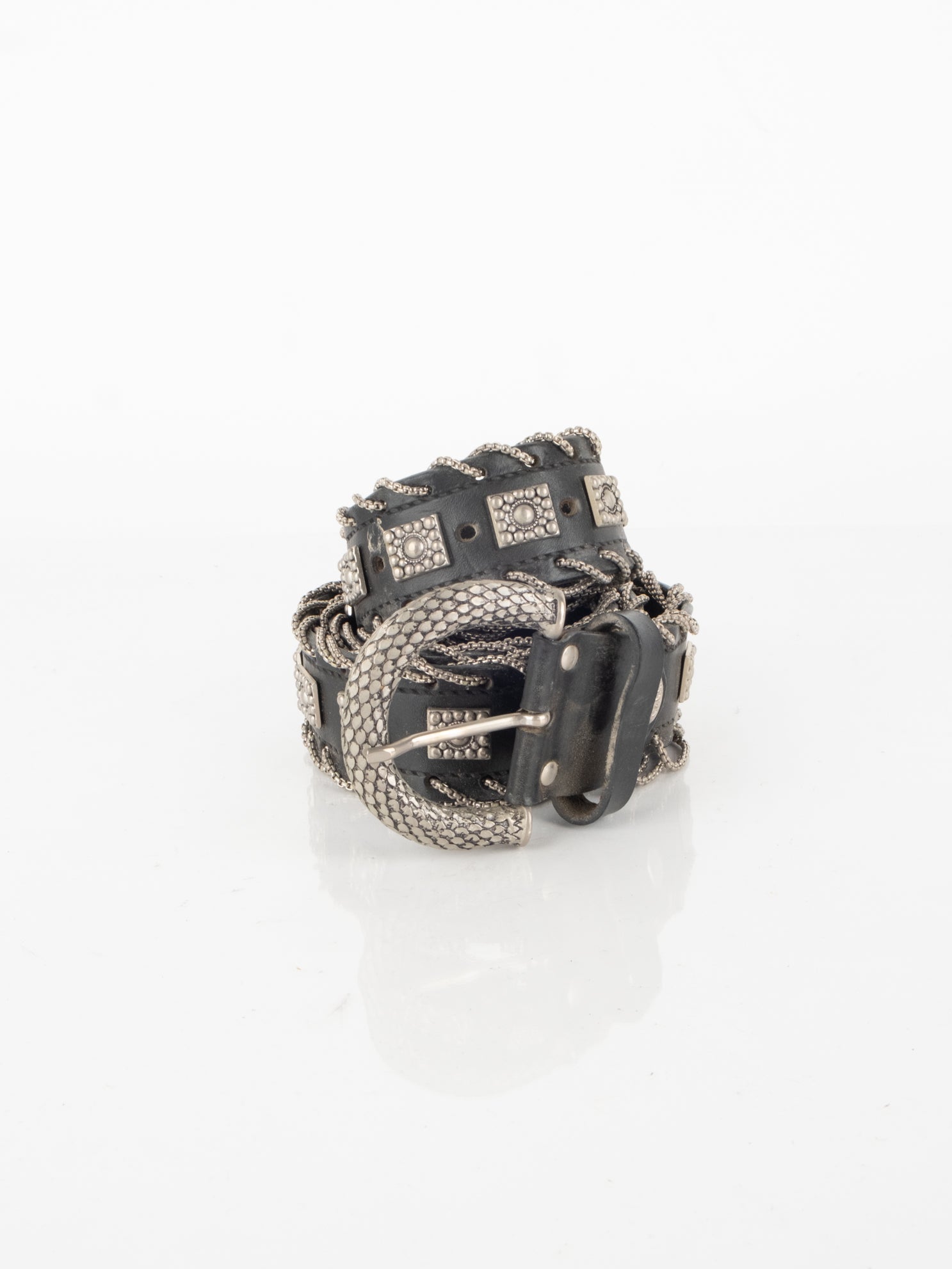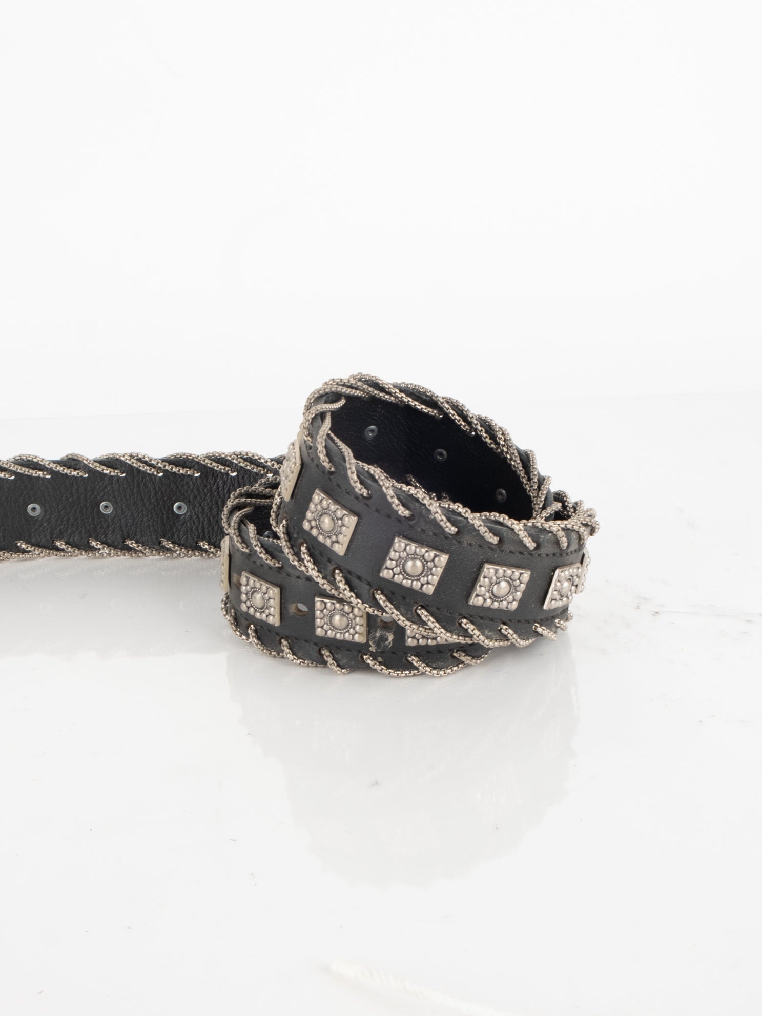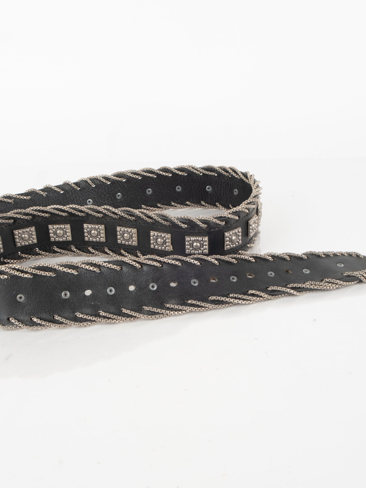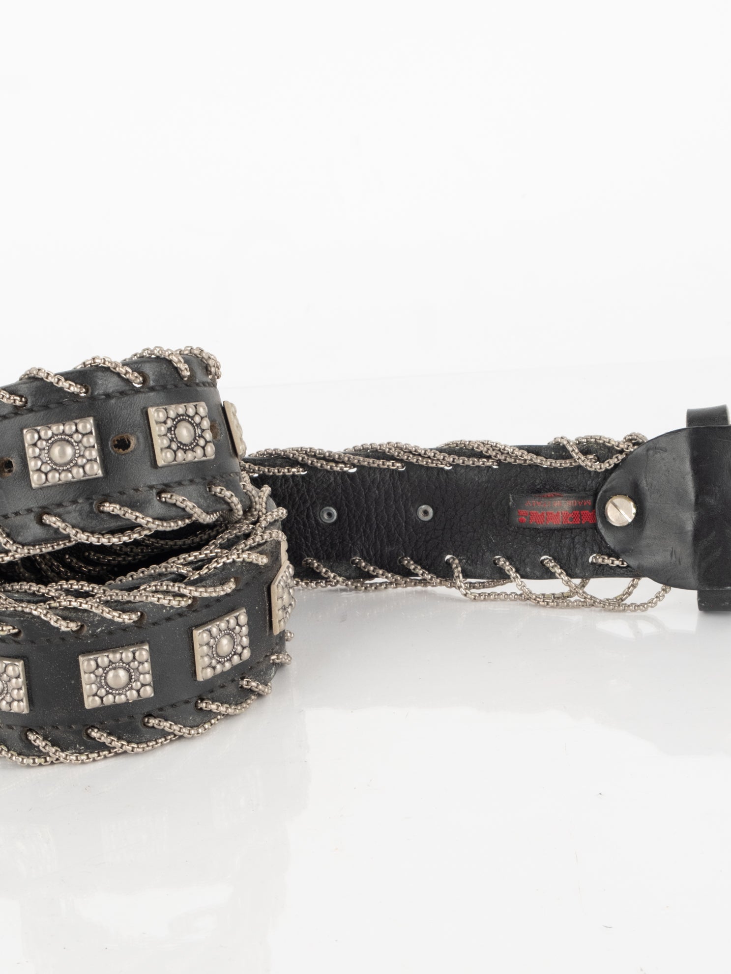 חגורה העשויה מעור בצבע אשחור בשילוב של קישוטים ממתכת.