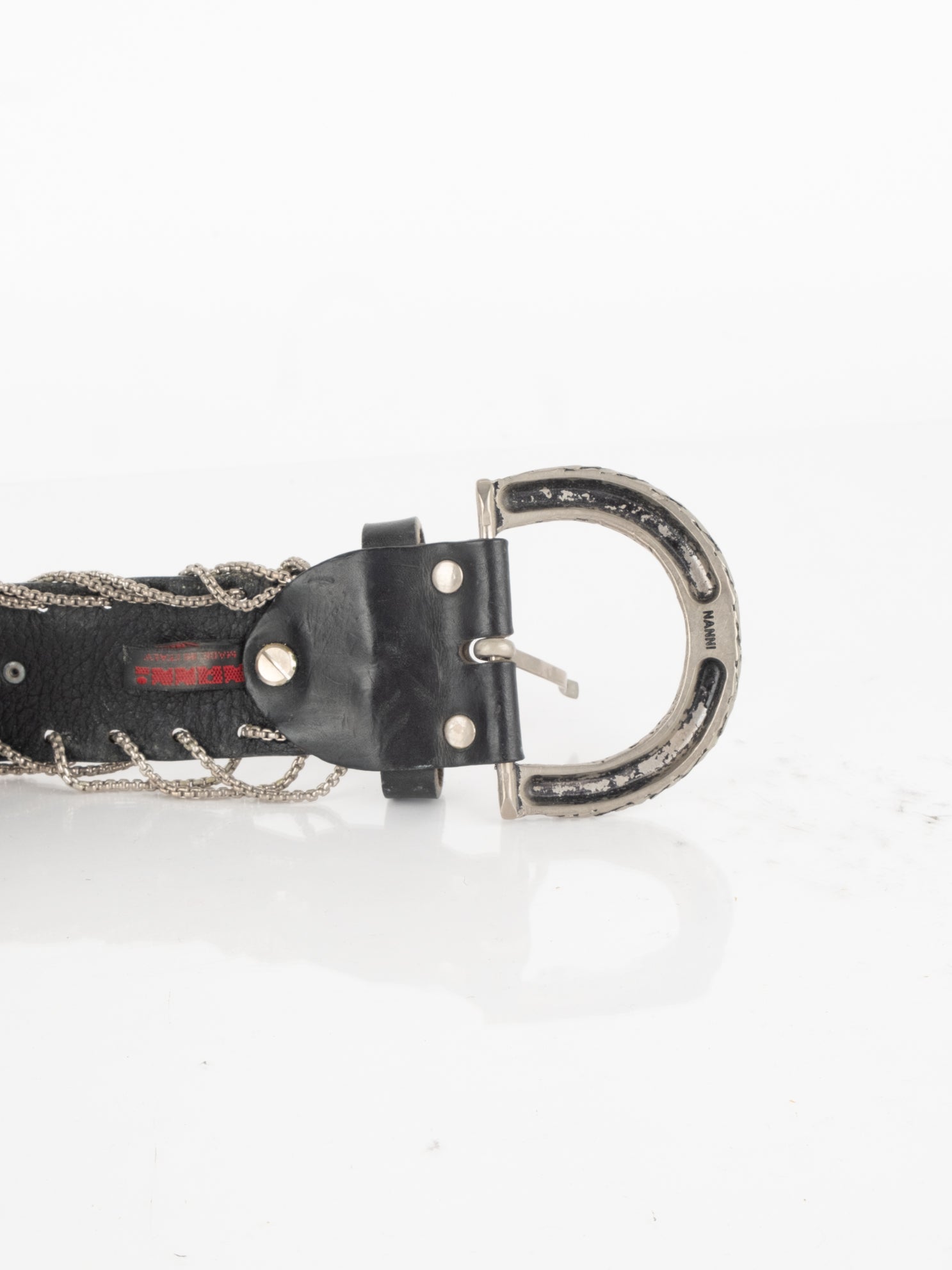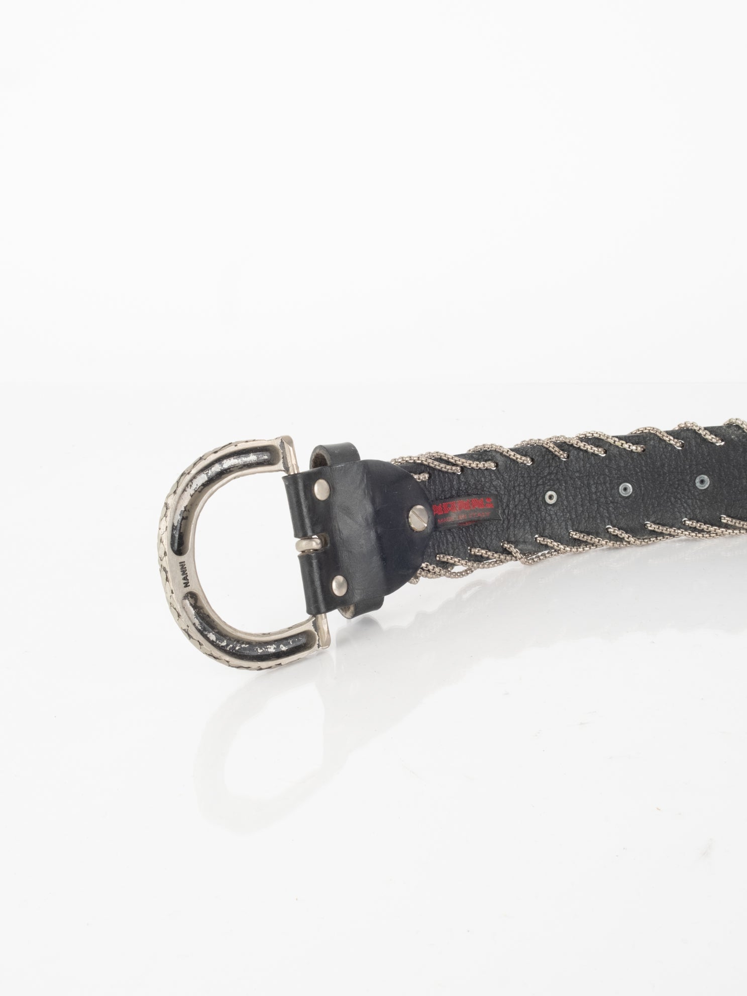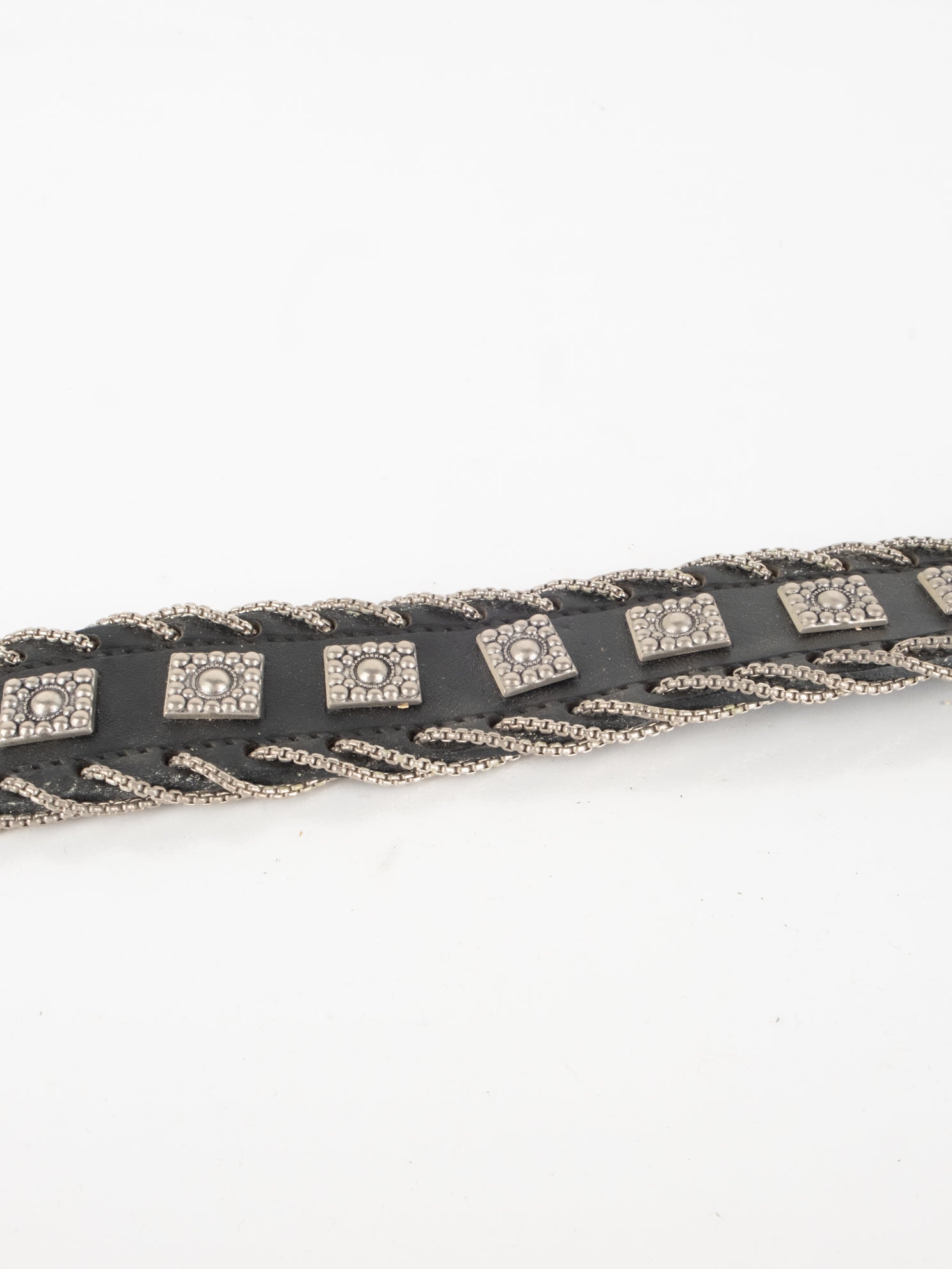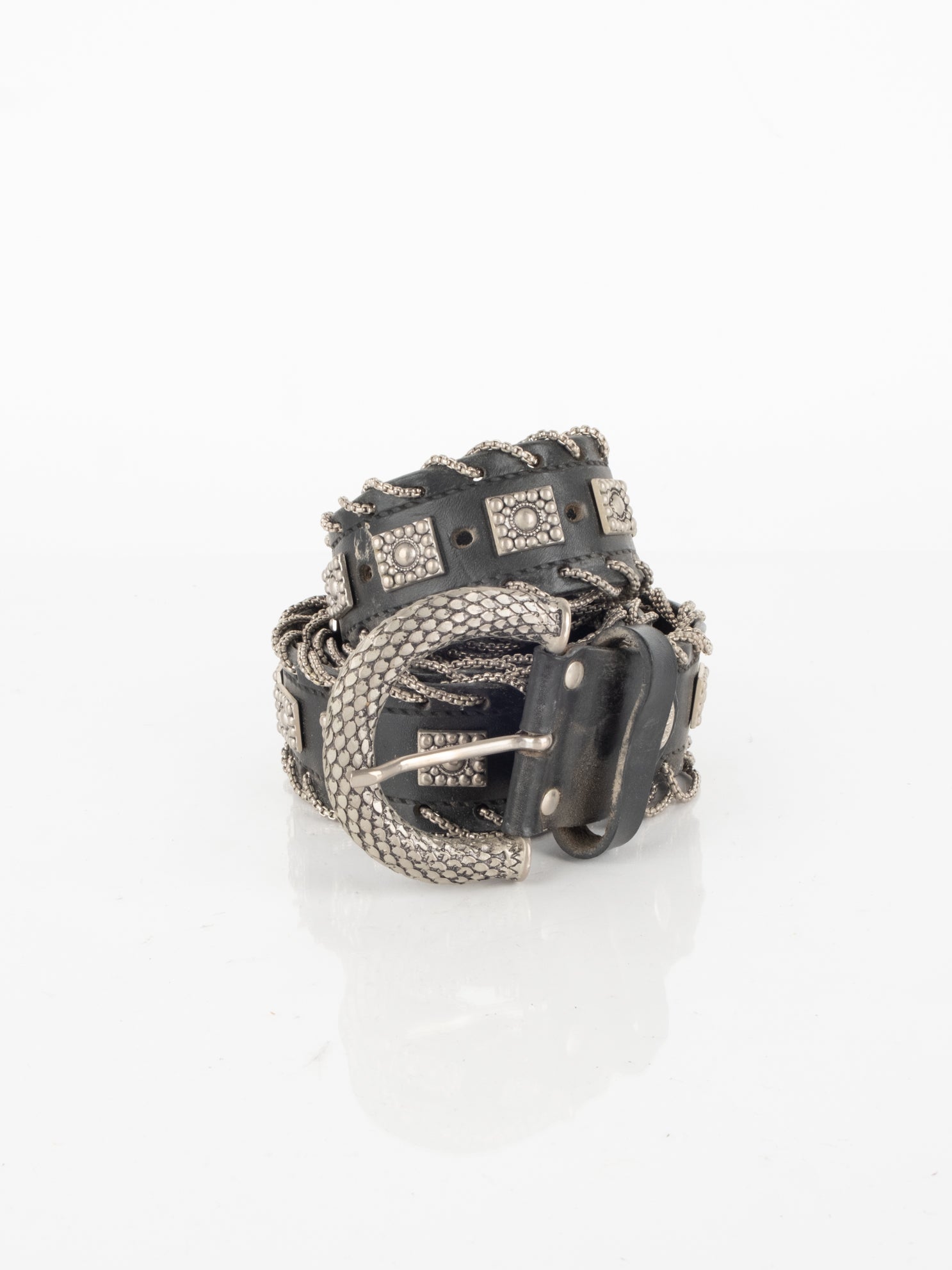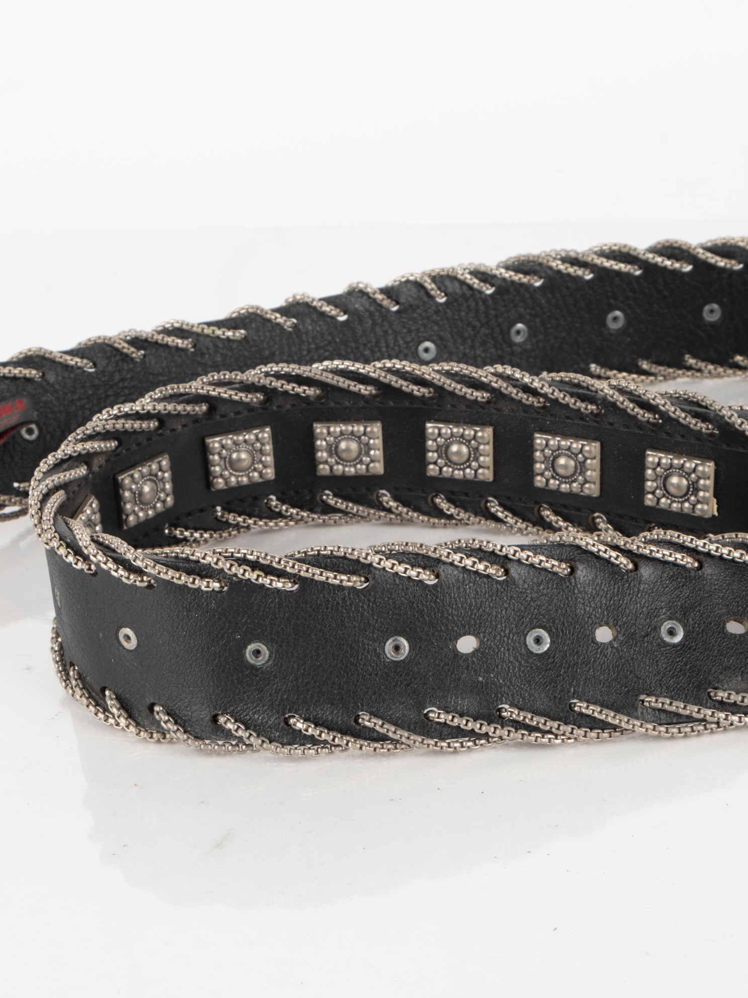 חגורה העשויה מעור בצבע אשחור בשילוב של קישוטים ממתכת.
