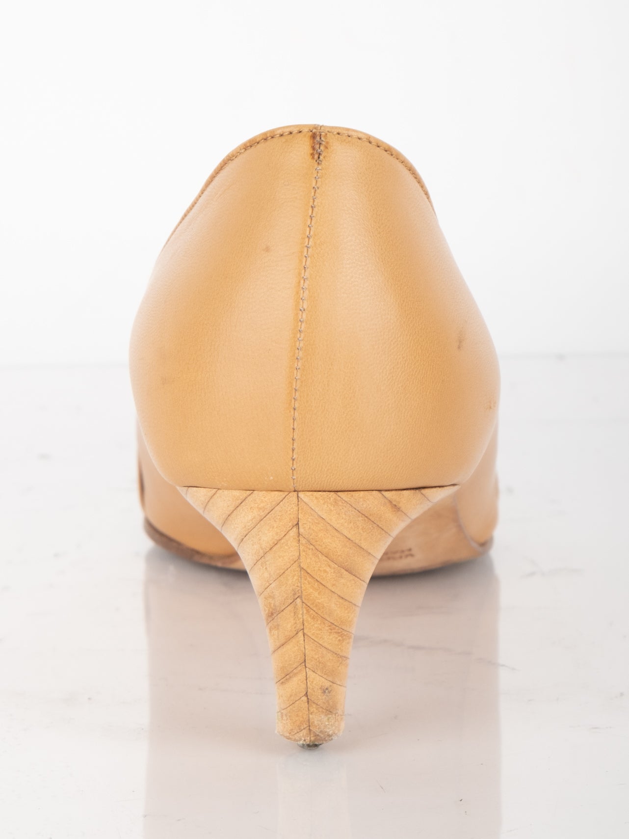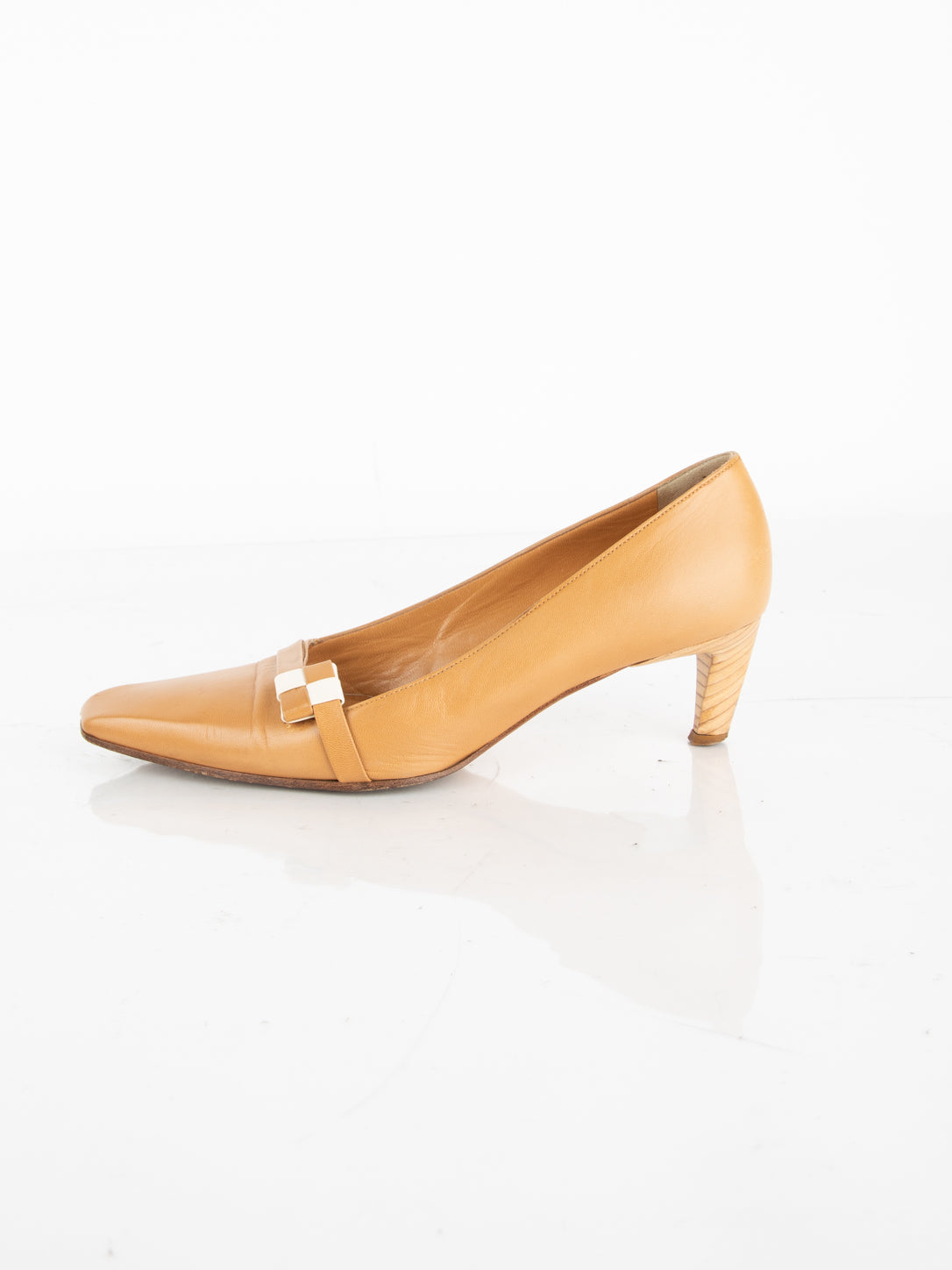 עקבים העשויים מעור בצבע קאמל בעל אף מעט מרובע ועקב קטן.