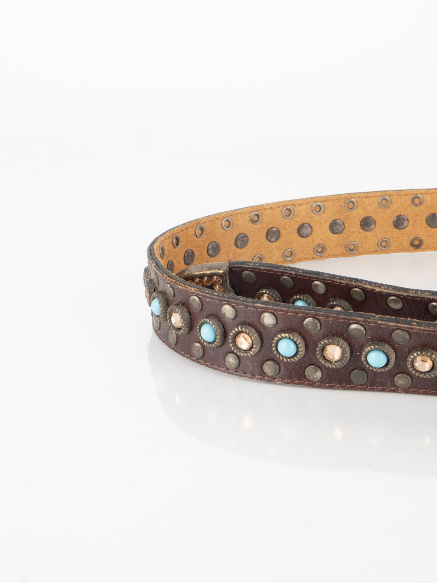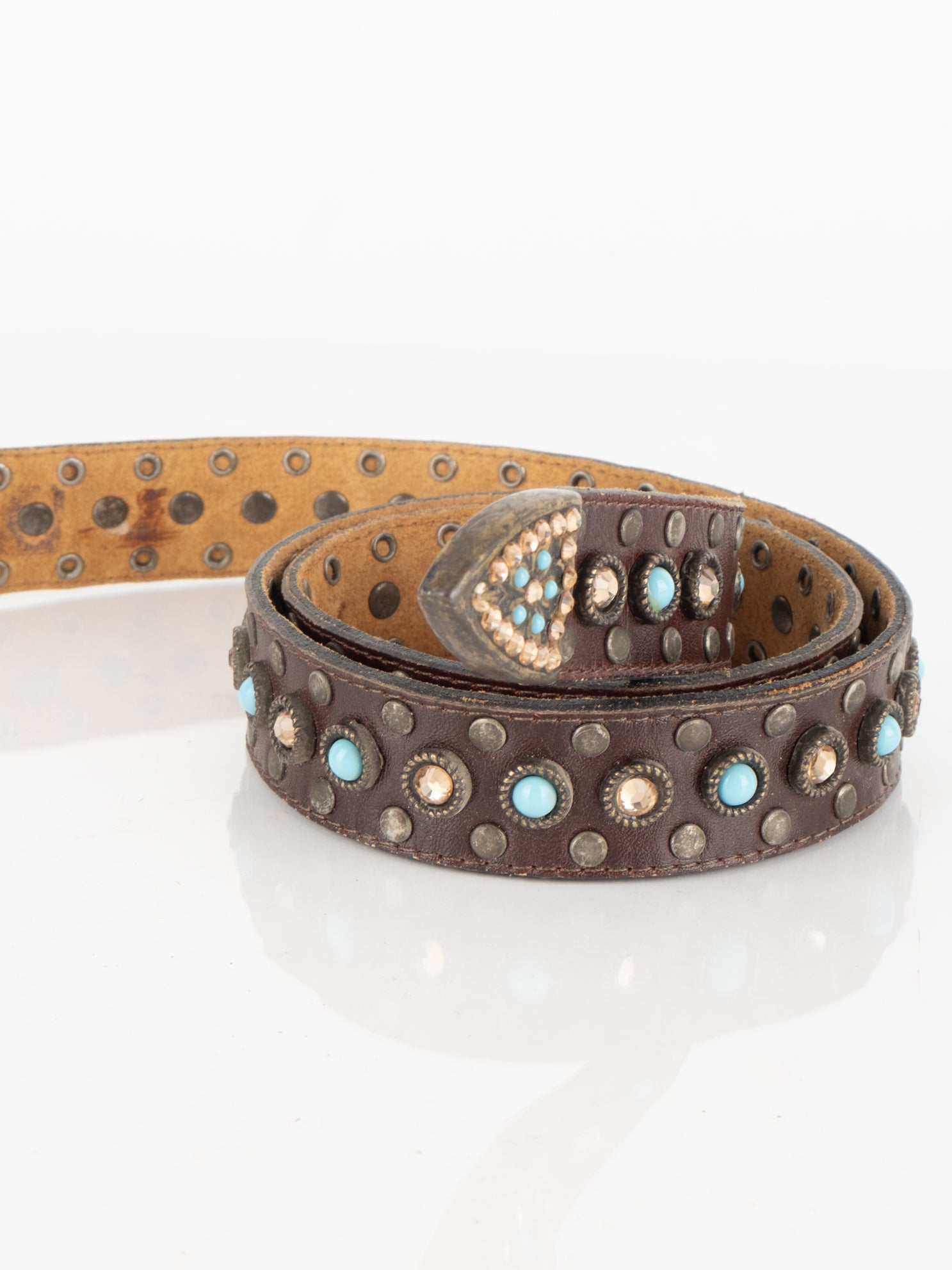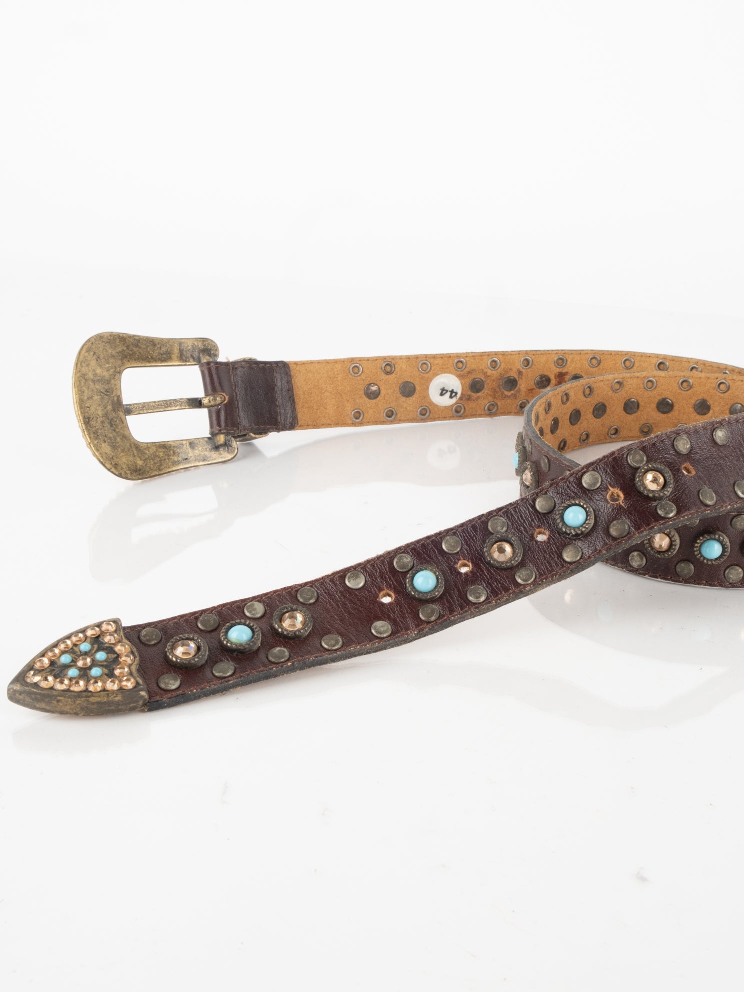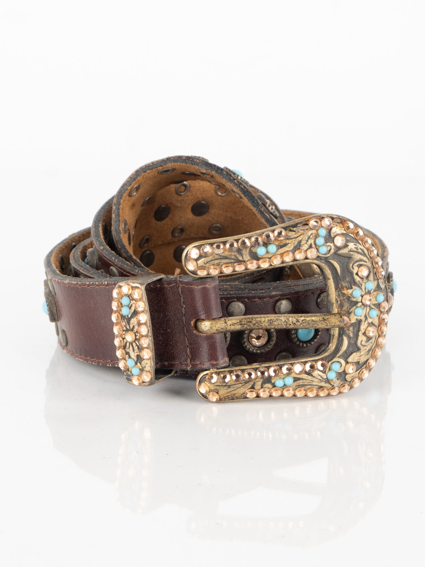 חגורה העשוי מעור בצבע חום בעלת דיטיילים מוזהבים ואבנים.