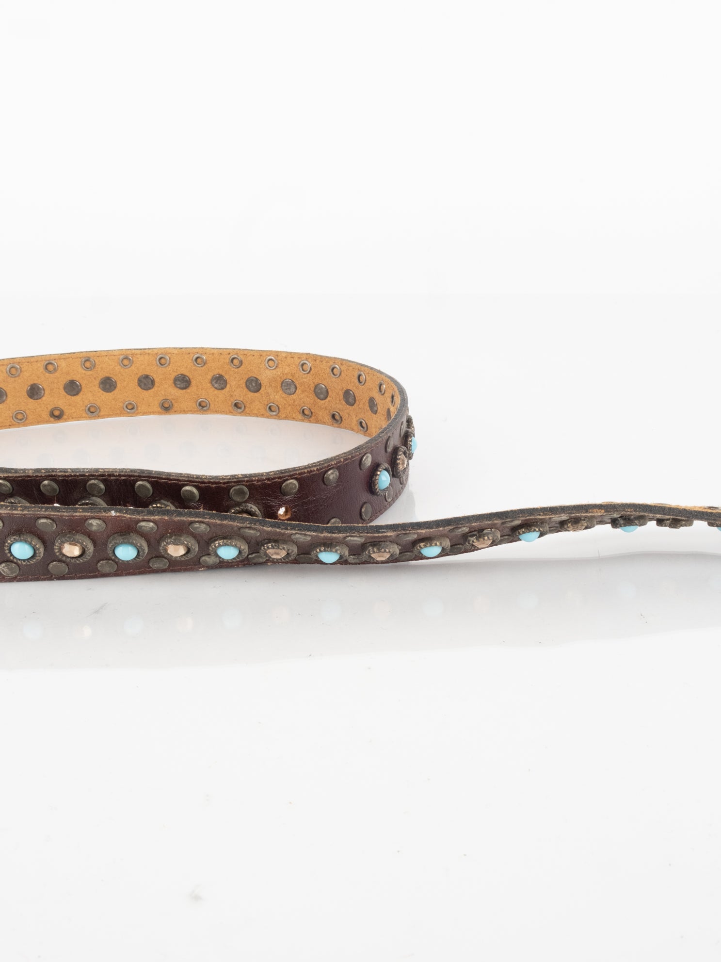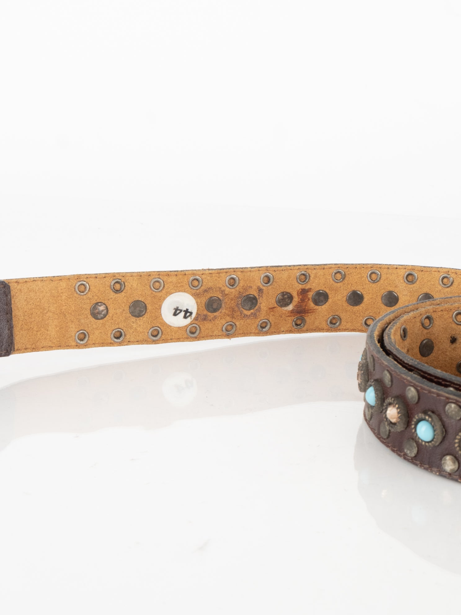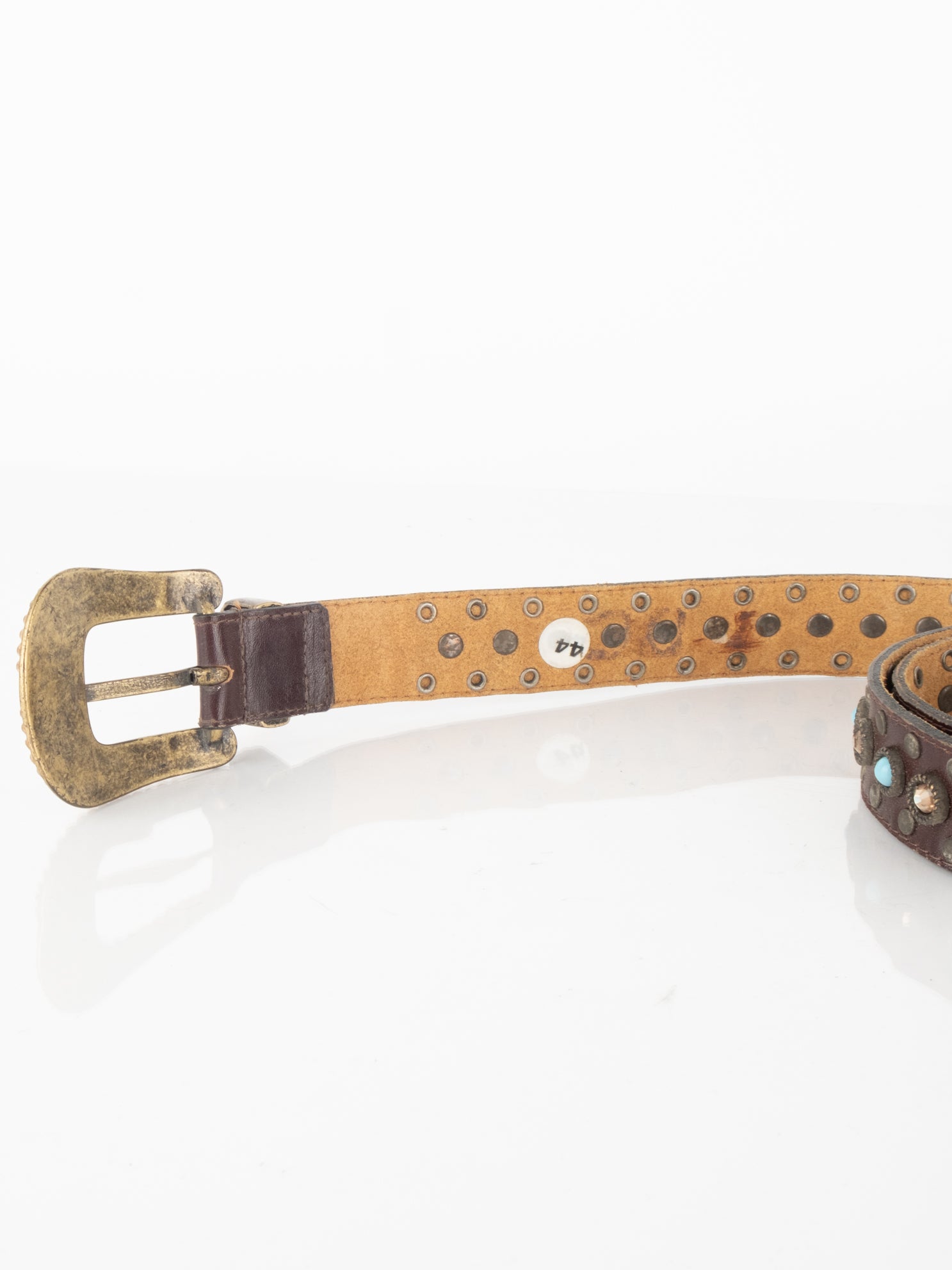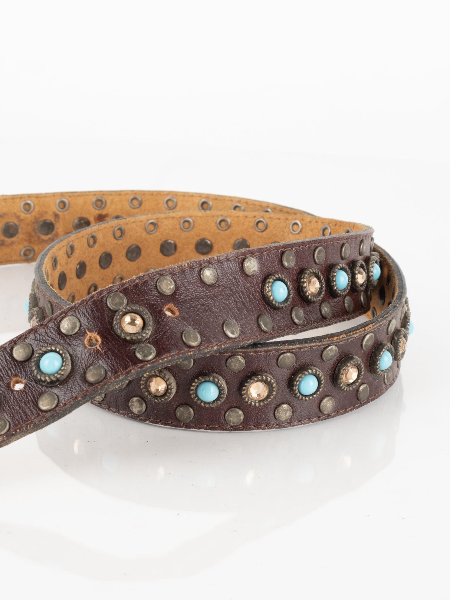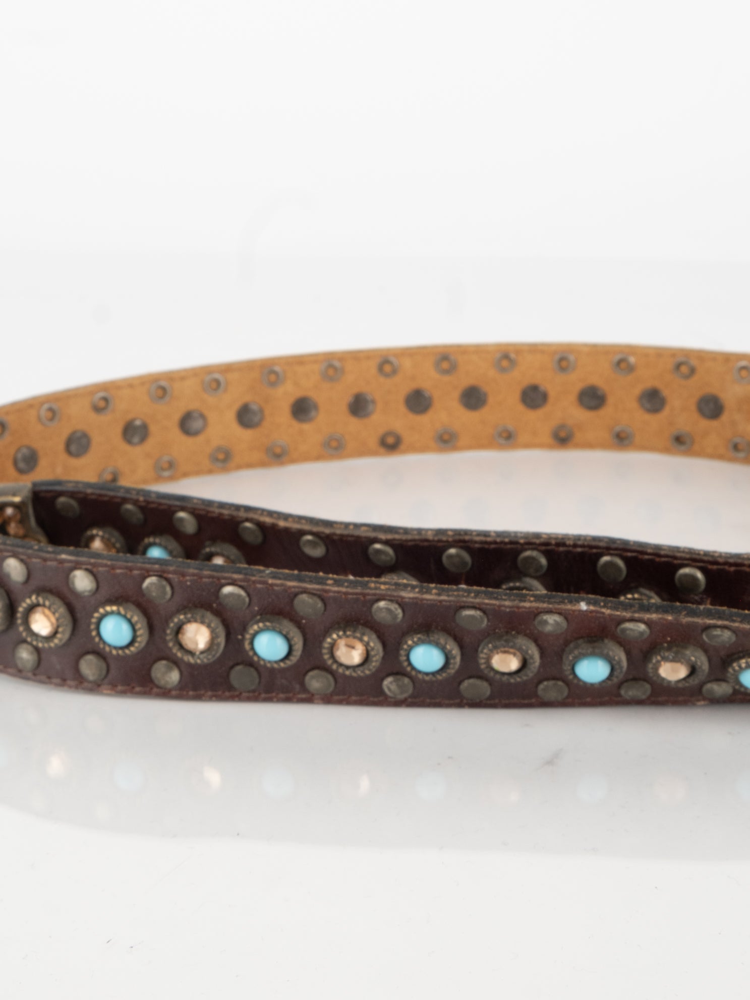 חגורה העשוי מעור בצבע חום בעלת דיטיילים מוזהבים ואבנים.