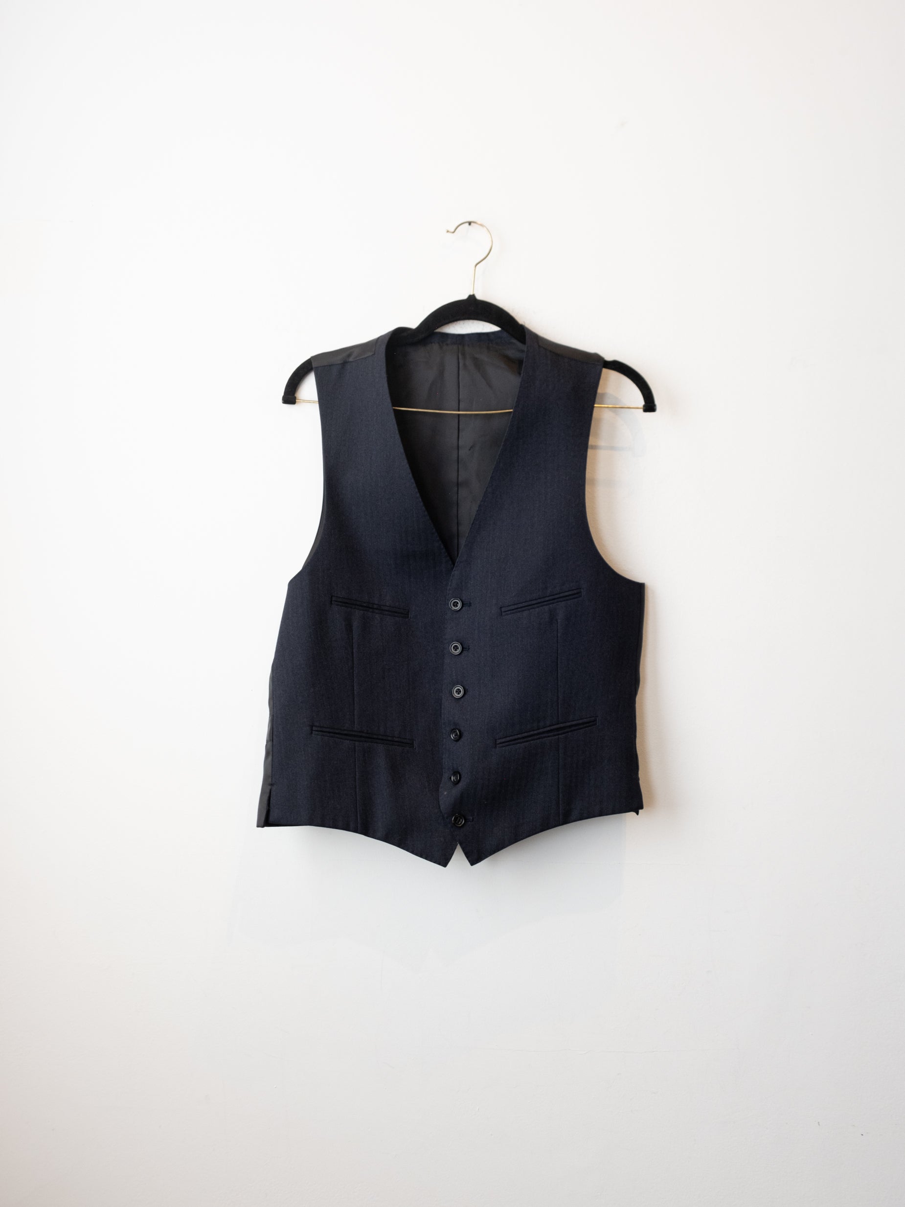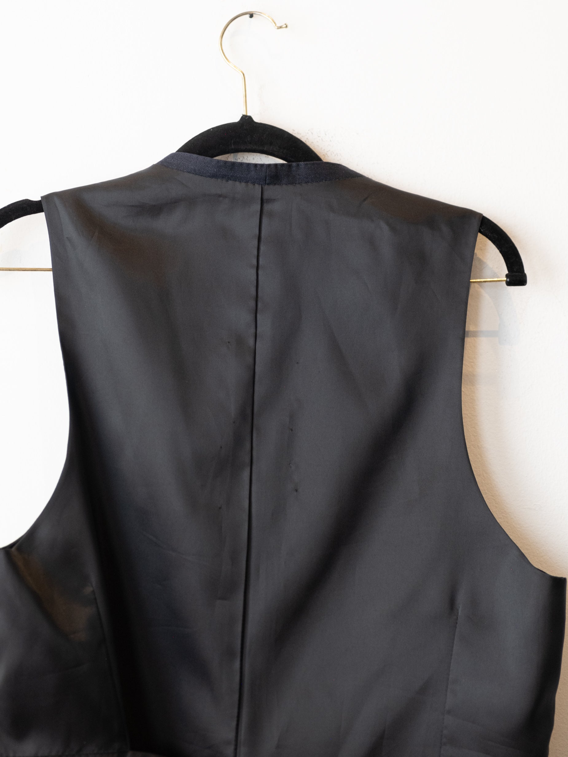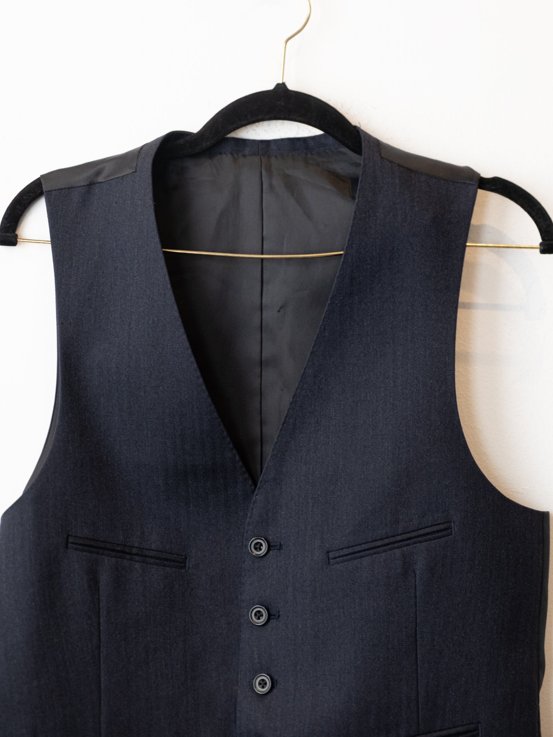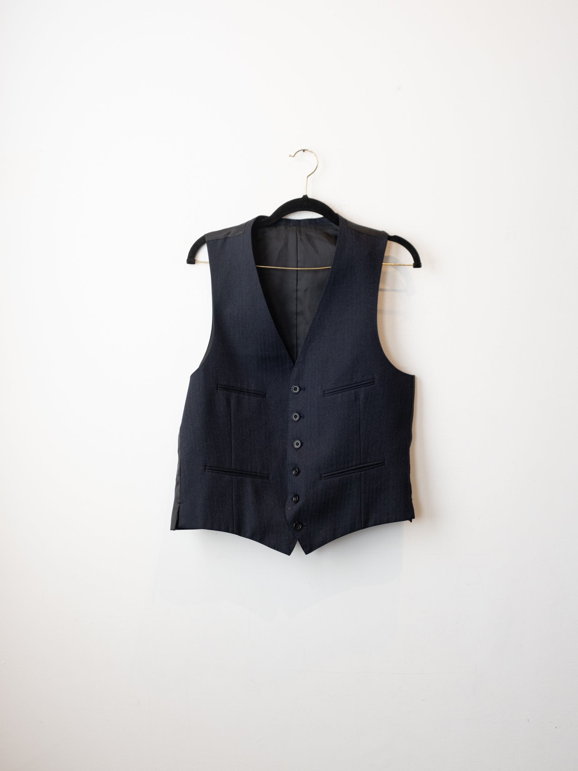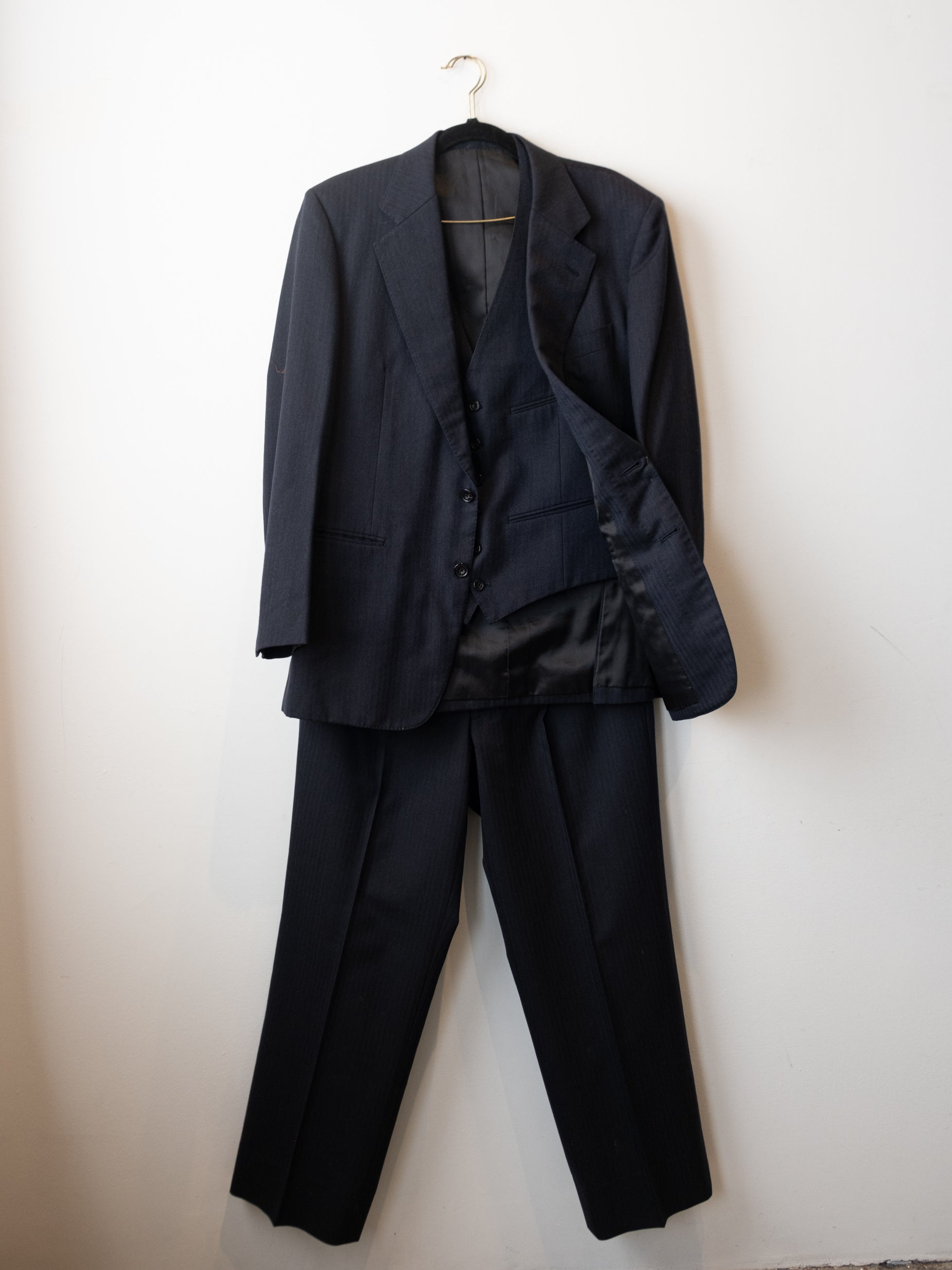חליפה שלושה חלקים של בלייזר מחויט עם כפתיים מרופדות ומכנסיים מחויטים ווסט בצבע אפור.