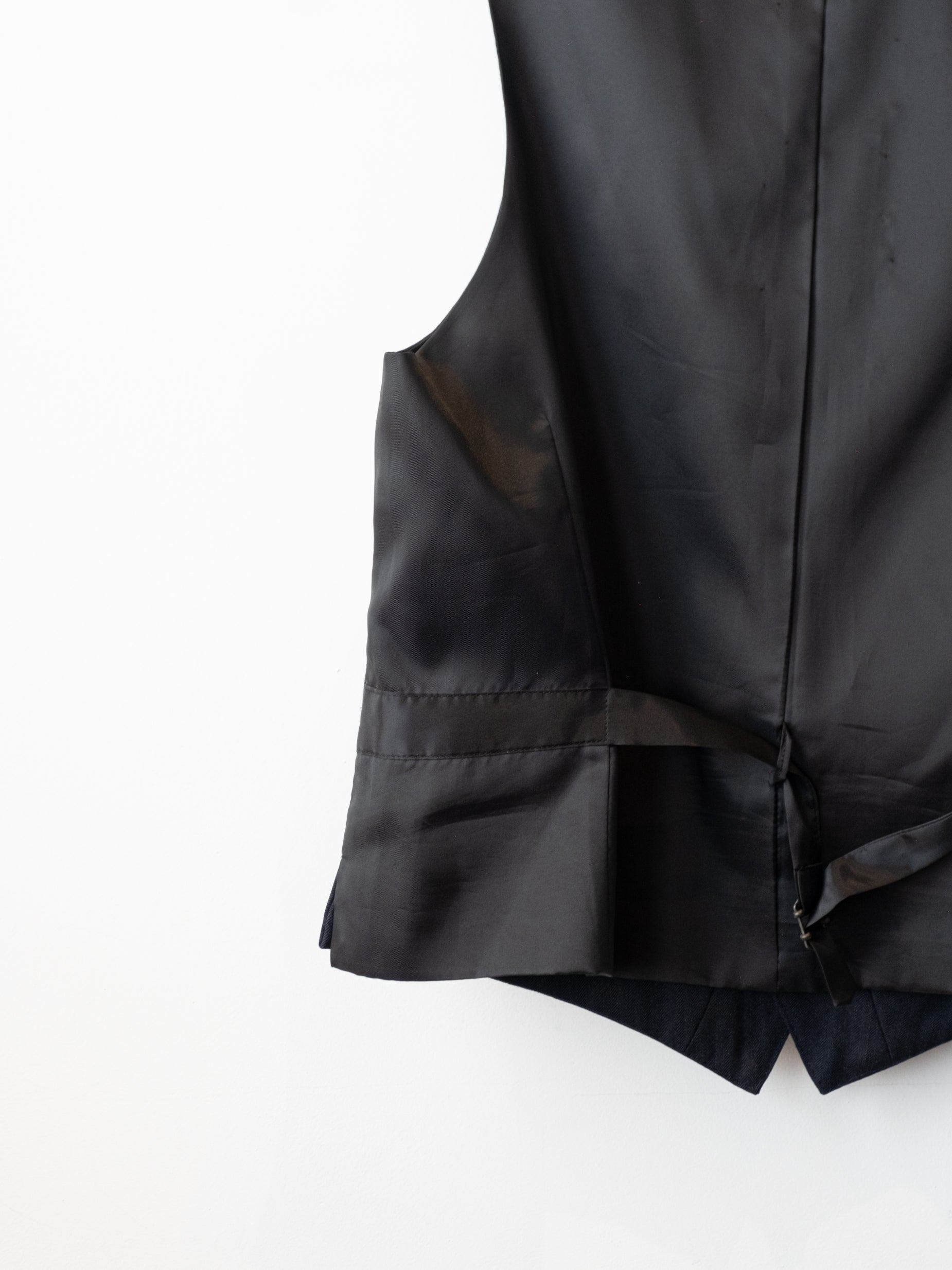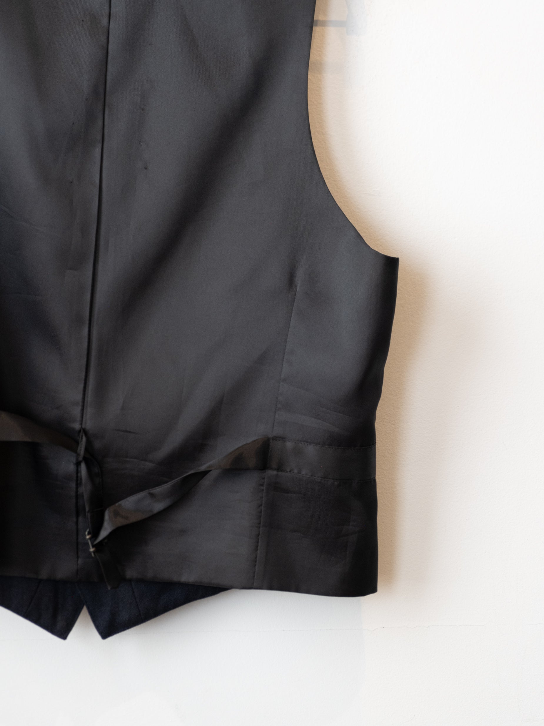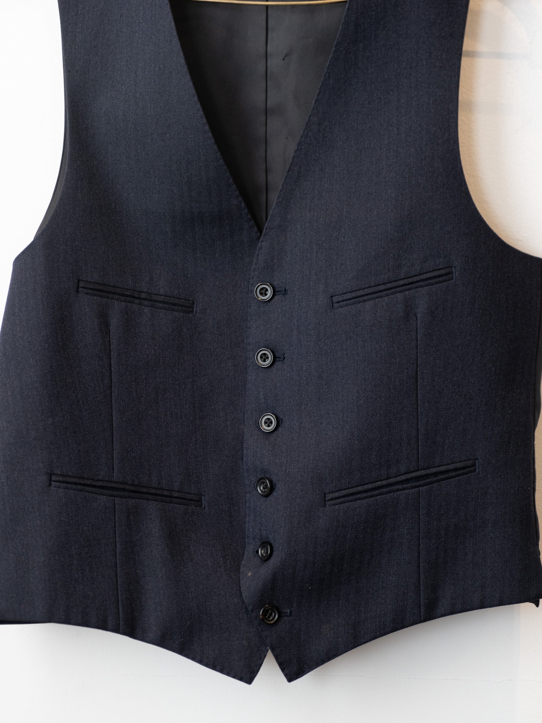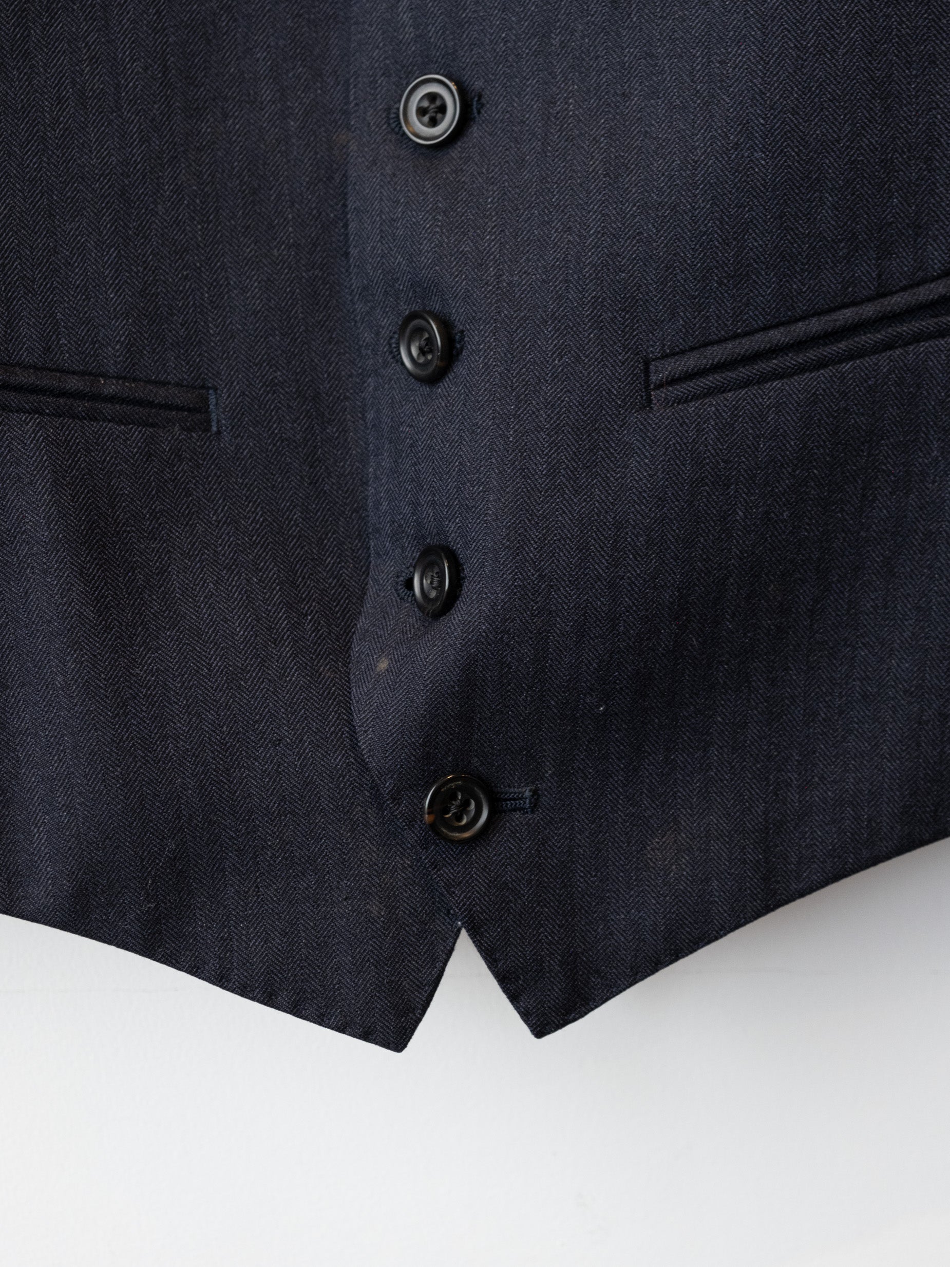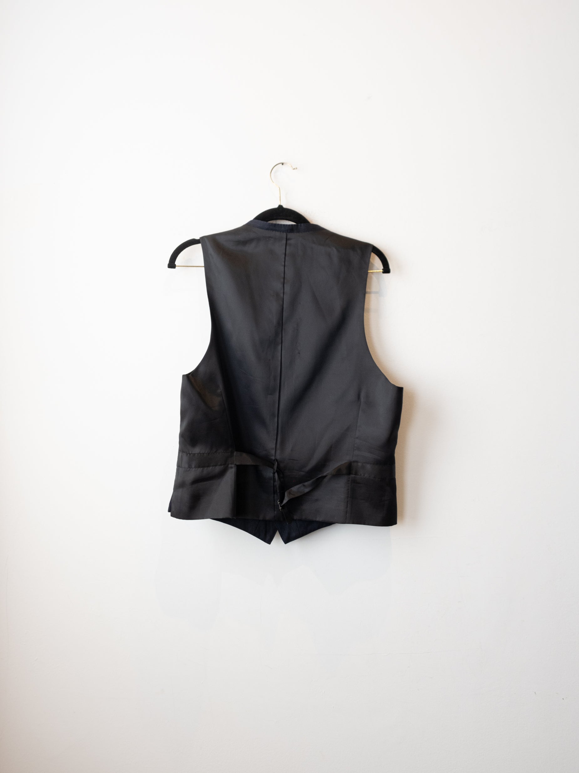 חליפה שלושה חלקים של בלייזר מחויט עם כפתיים מרופדות ומכנסיים מחויטים ווסט בצבע אפור.