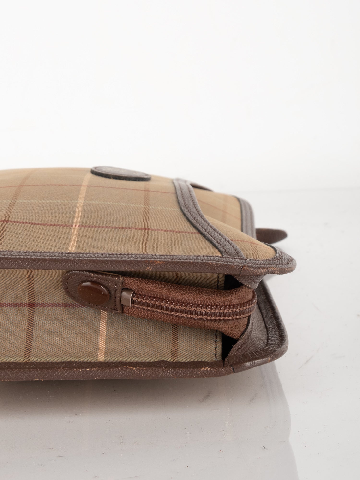 התיק עשוי קנבס קשיח בדוגמת משבצות קלאסית, בשילוב מסגרת עור חומה מסביב לכל התיק.