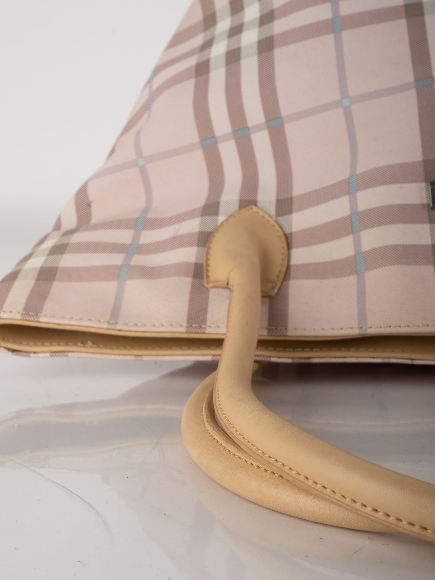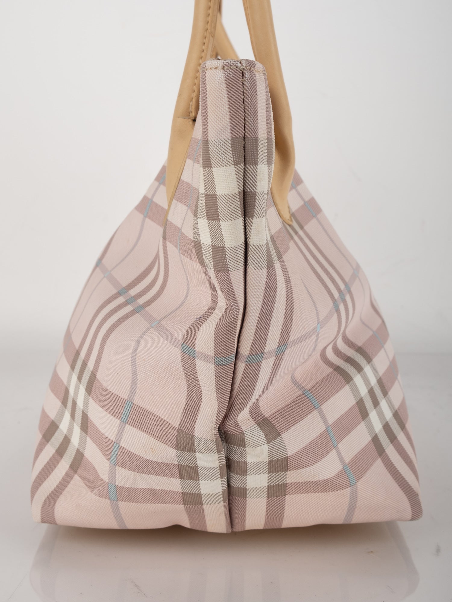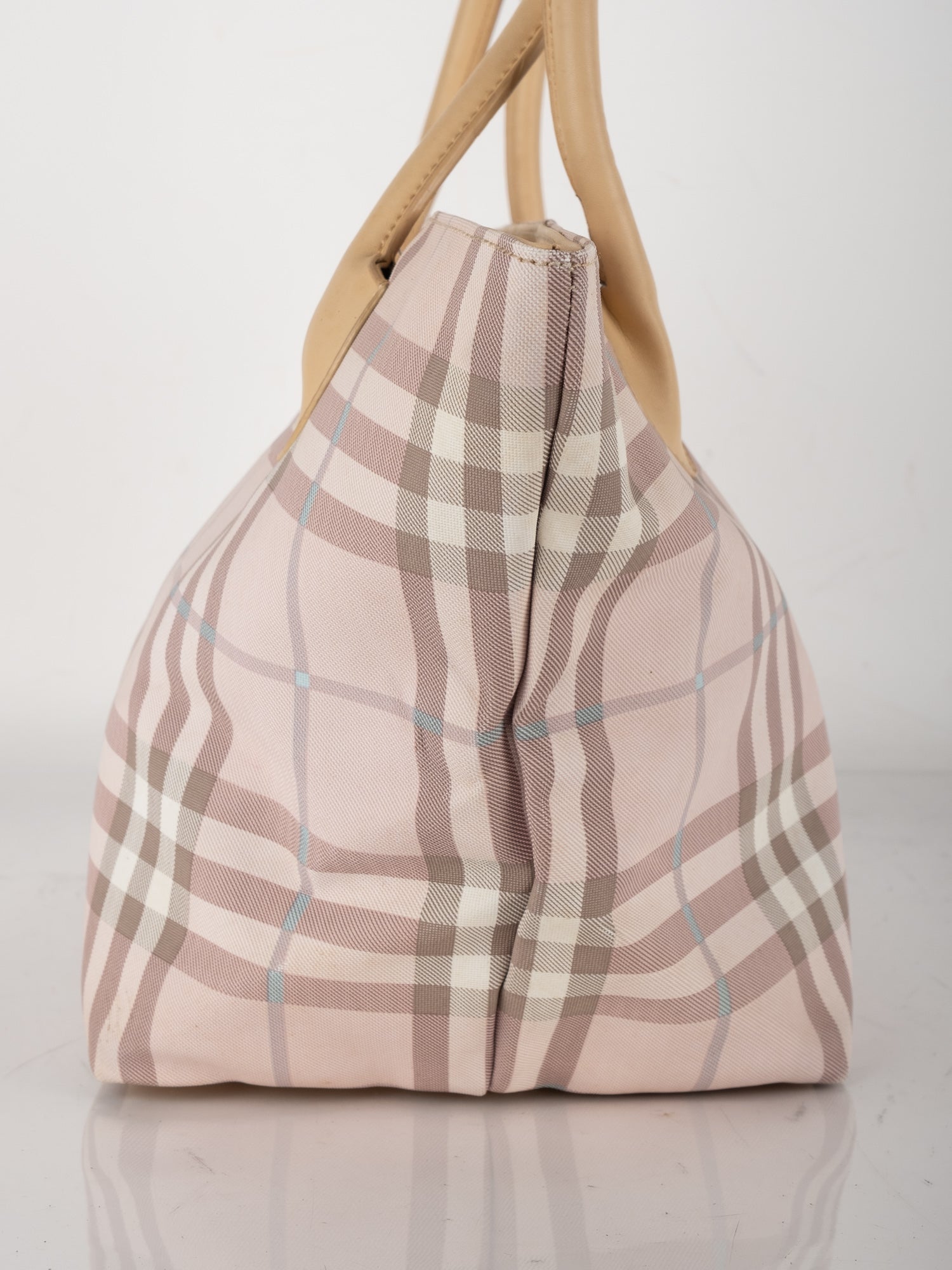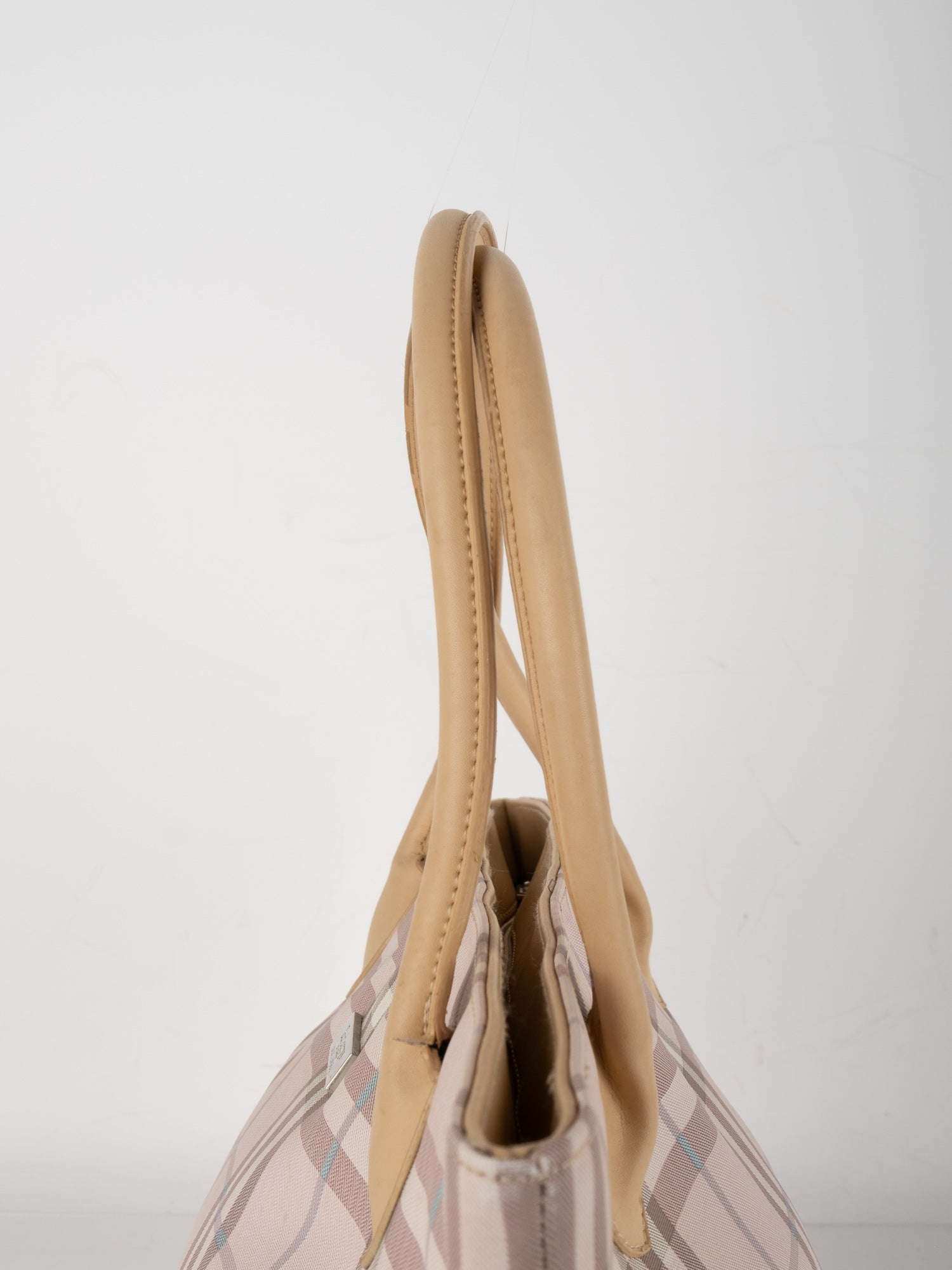 התיק עשוי קנבס בדוגמת Check בגווני ורוד ובז׳, עם ידיות נשיאה עליונות בגוון בז׳. מבנה רחב, תא מרכזי נוח ורוחב שמאפשר שימוש יומיומי קל ומאורגן.